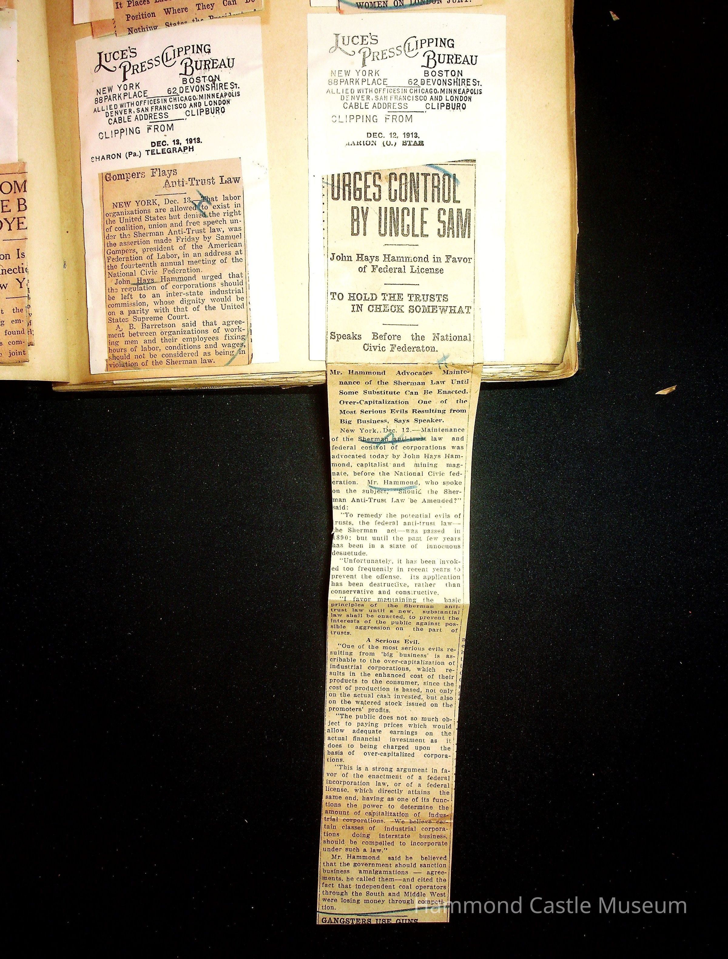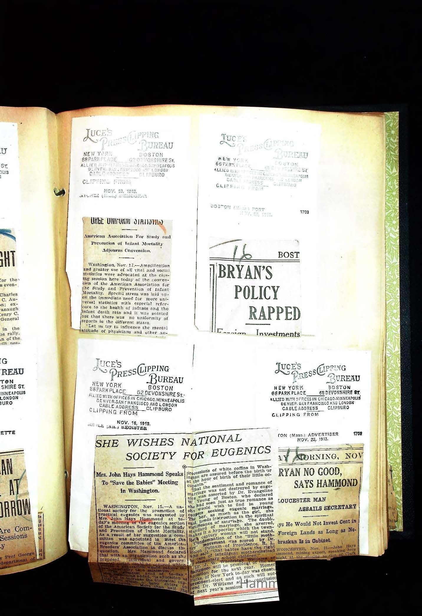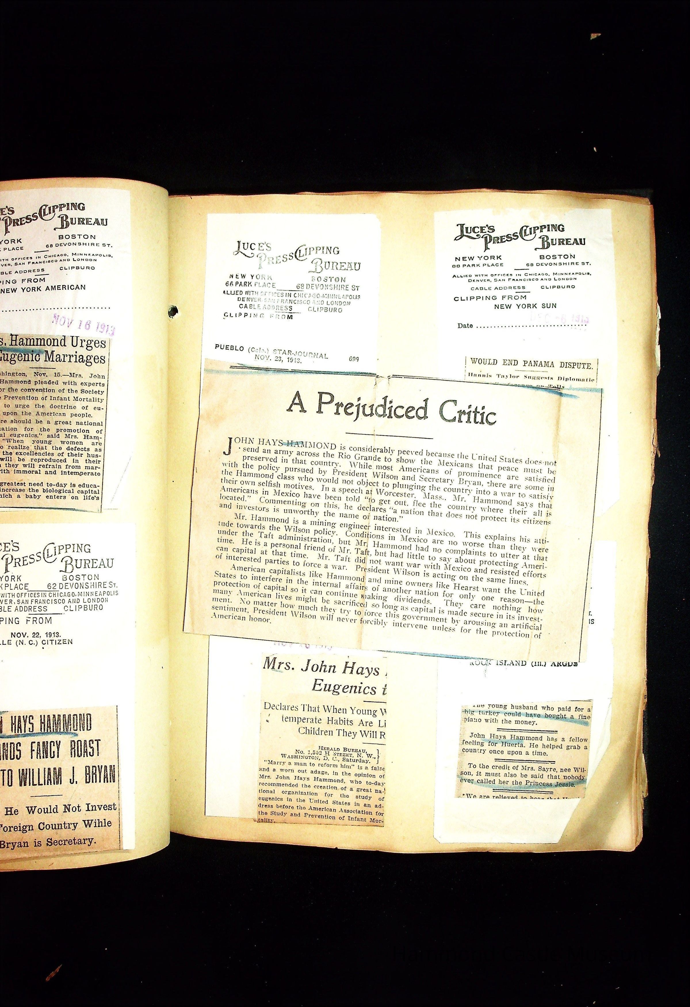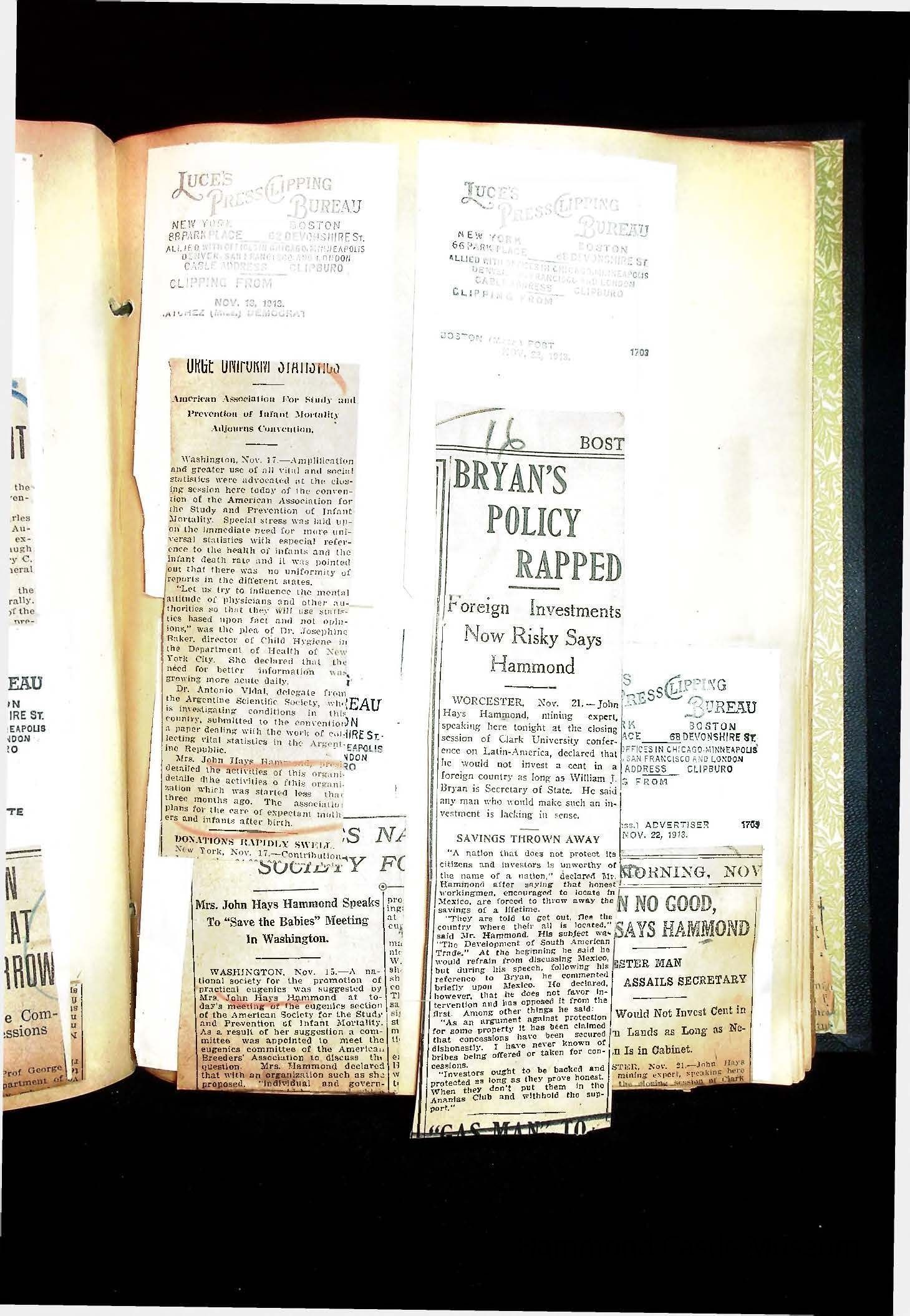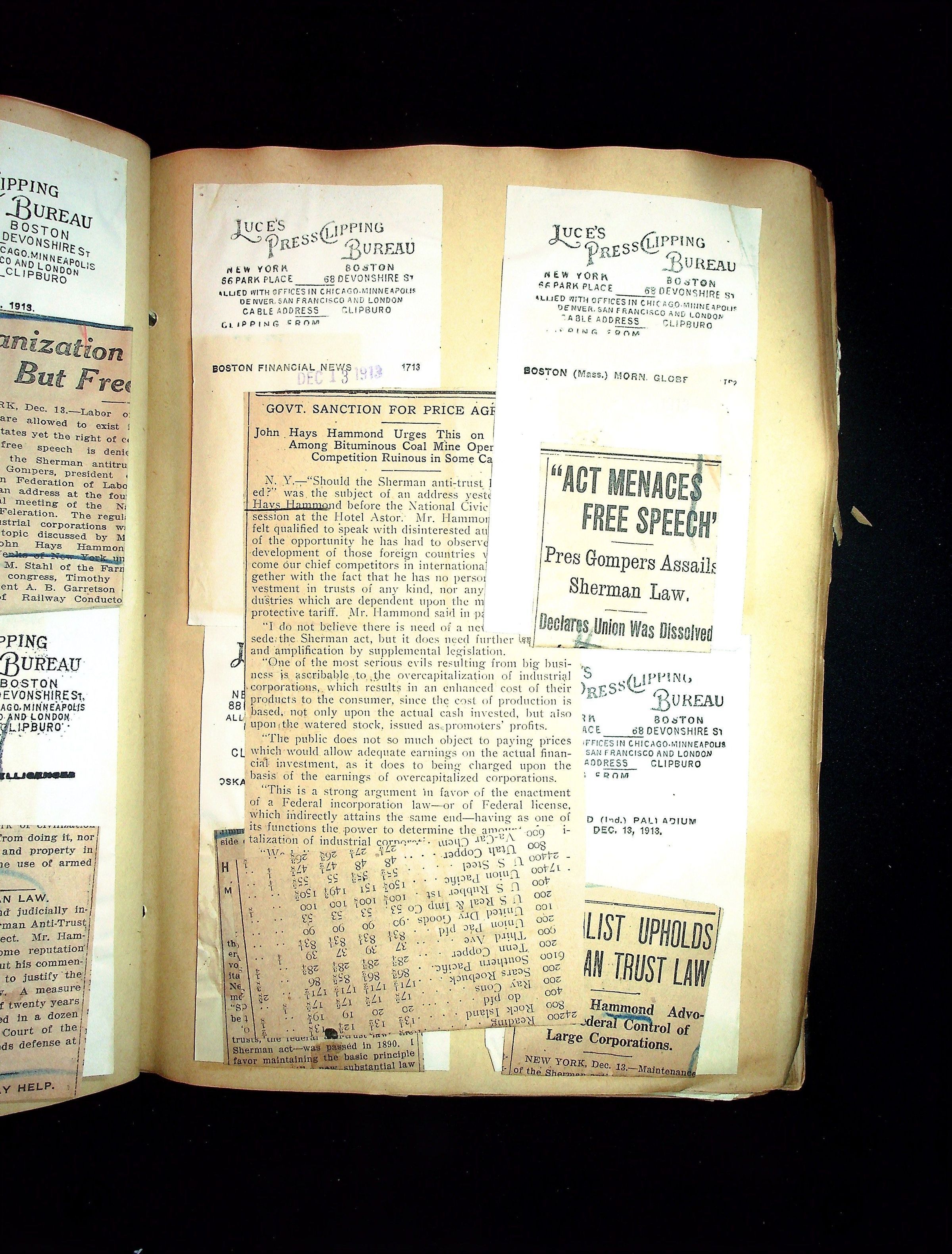 1913 scrapbook of newspaper articles about John Hays Hammond (Sr) and Mrs. Hammond covering governmental policies, Sherman Act, Eugenics & politics.