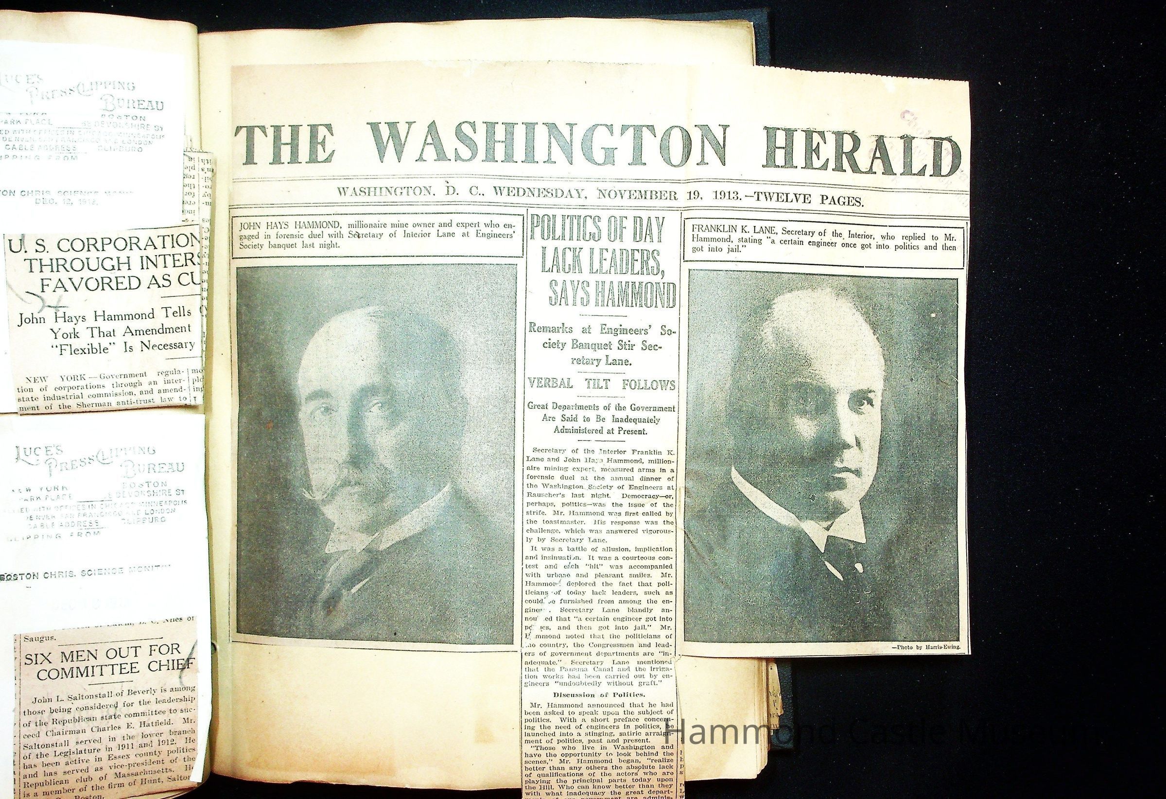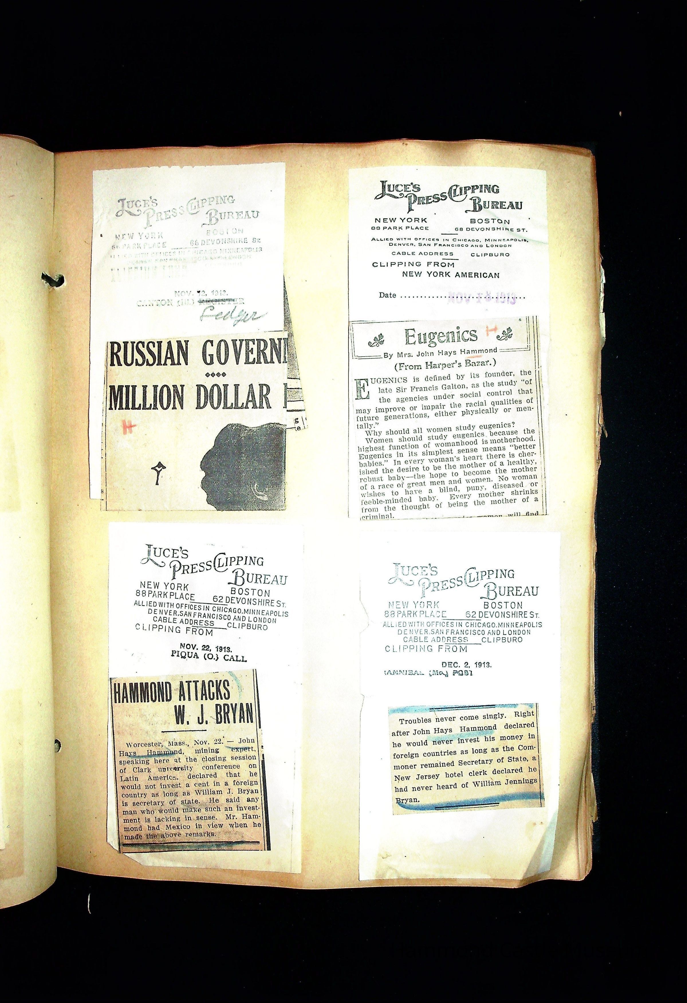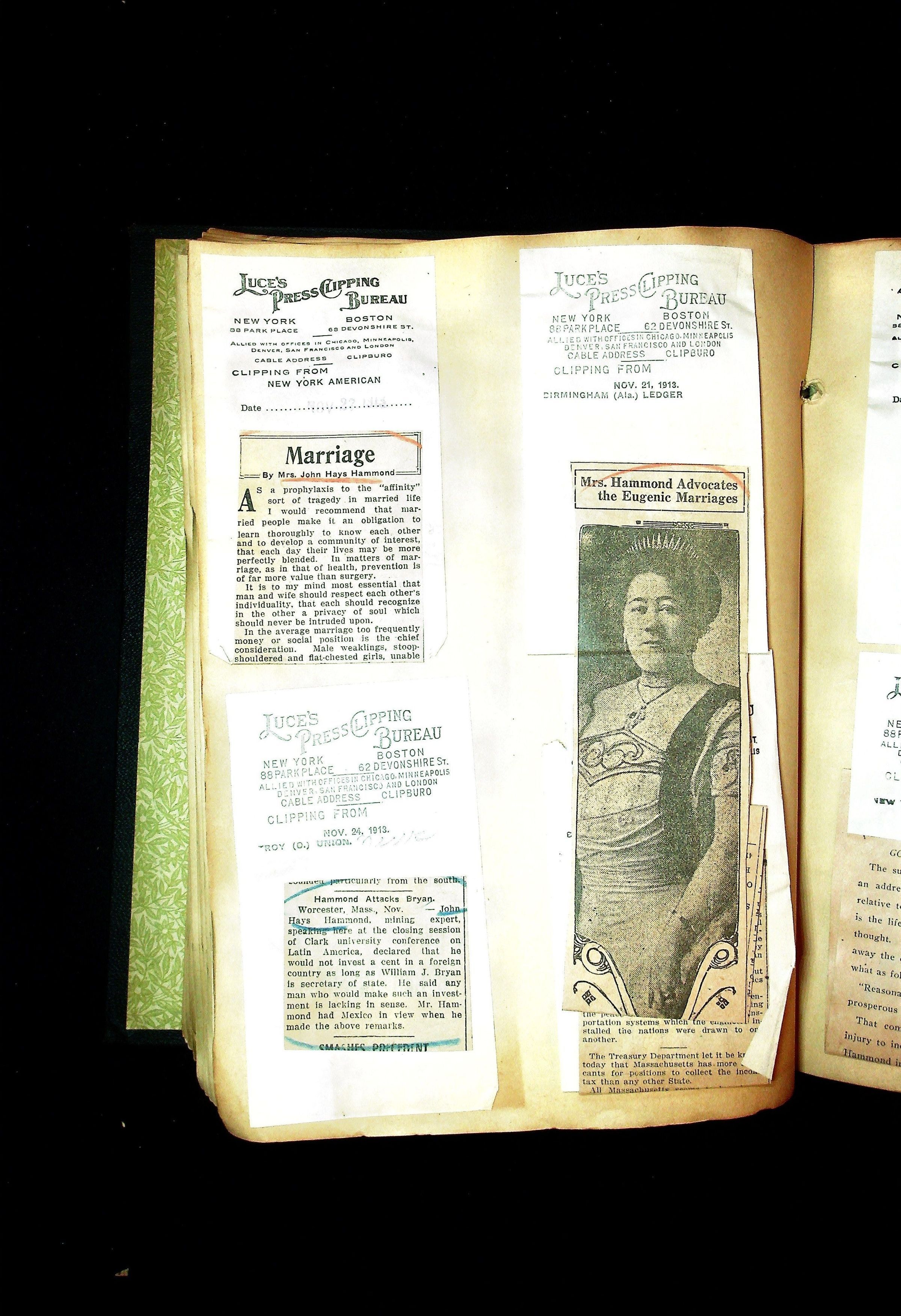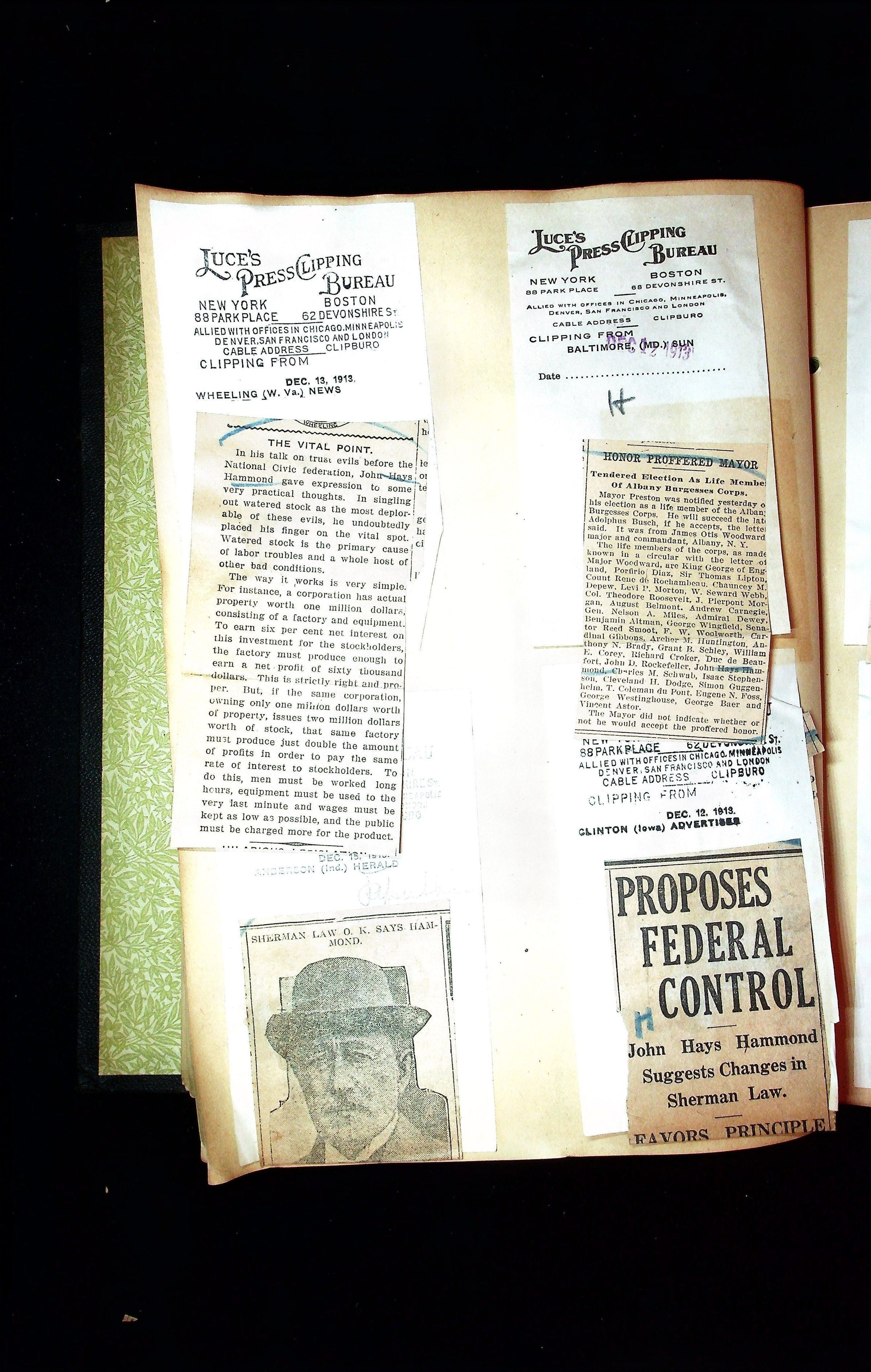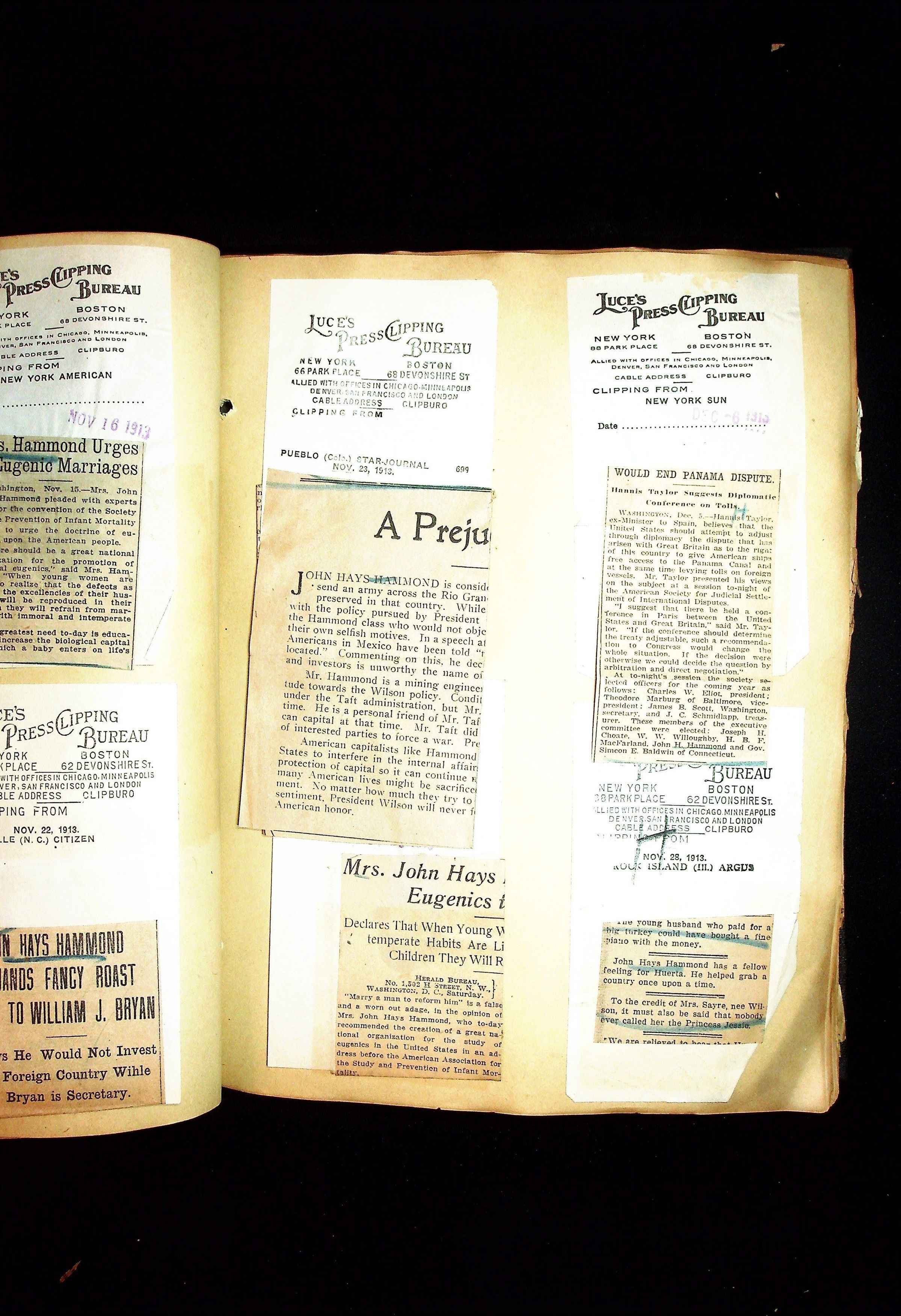 1913 scrapbook of newspaper articles about John Hays Hammond (Sr) and Mrs. Hammond covering governmental policies, Sherman Act, Eugenics & politics.