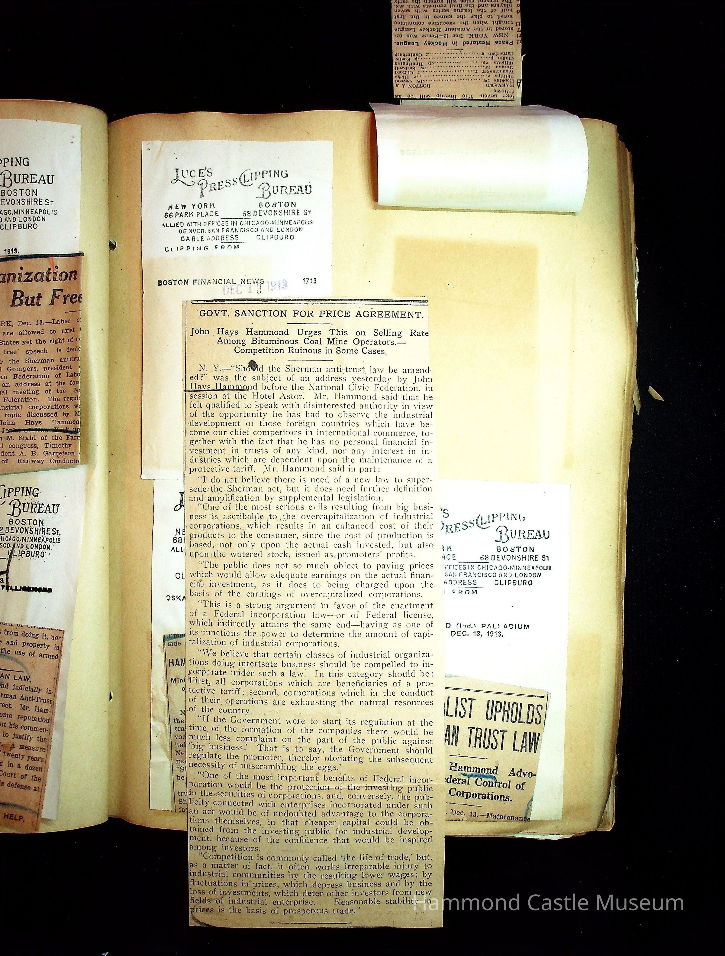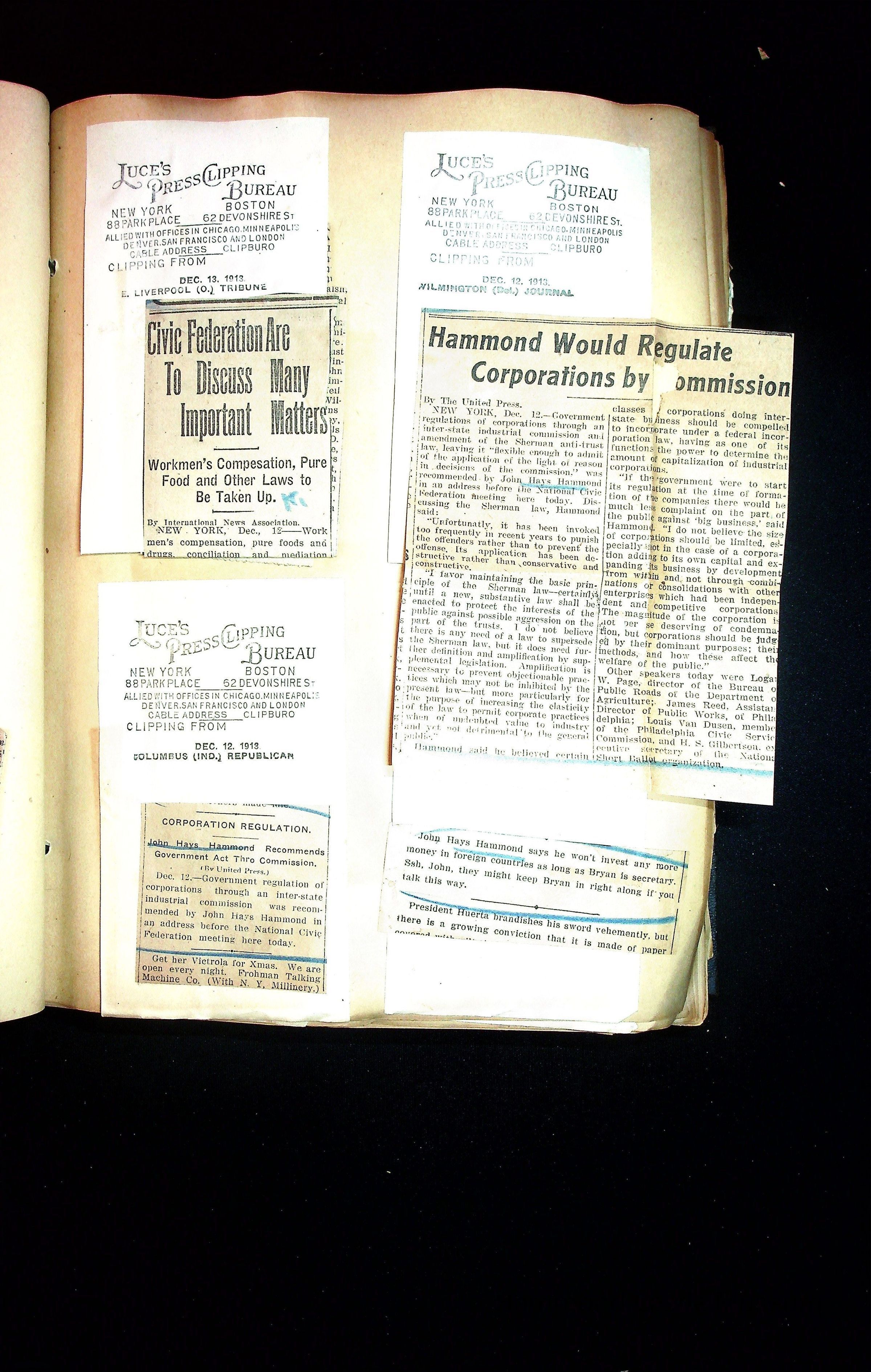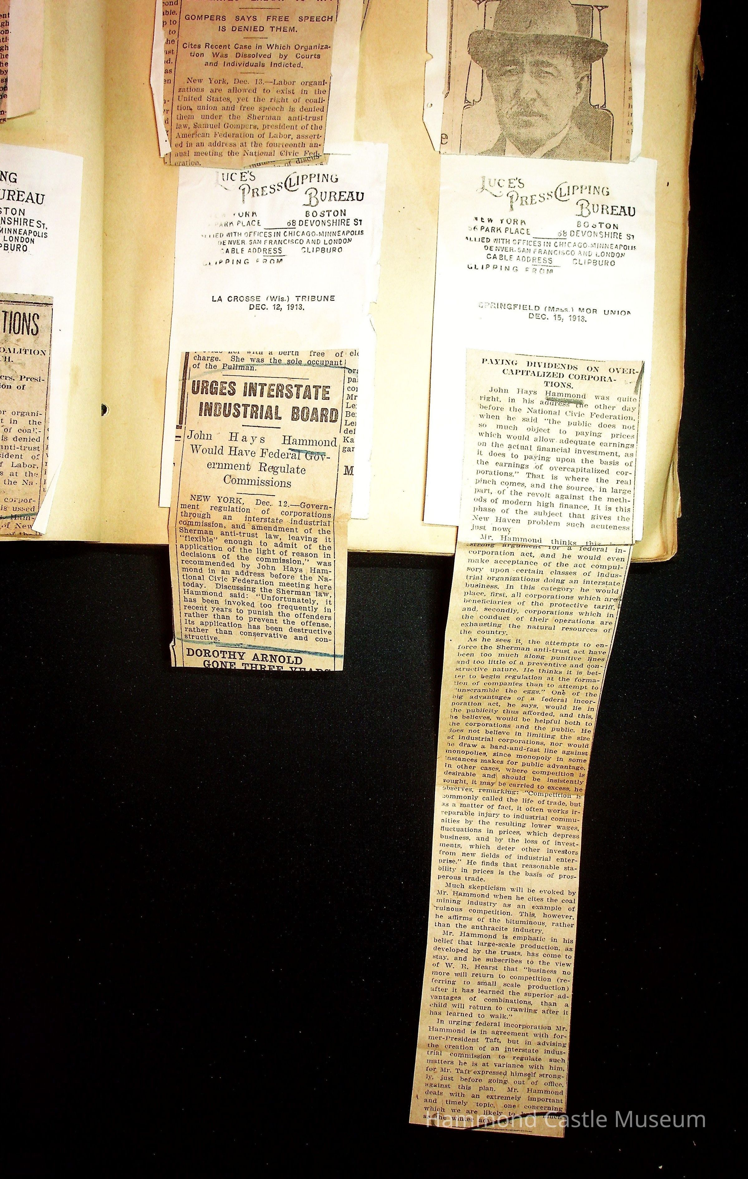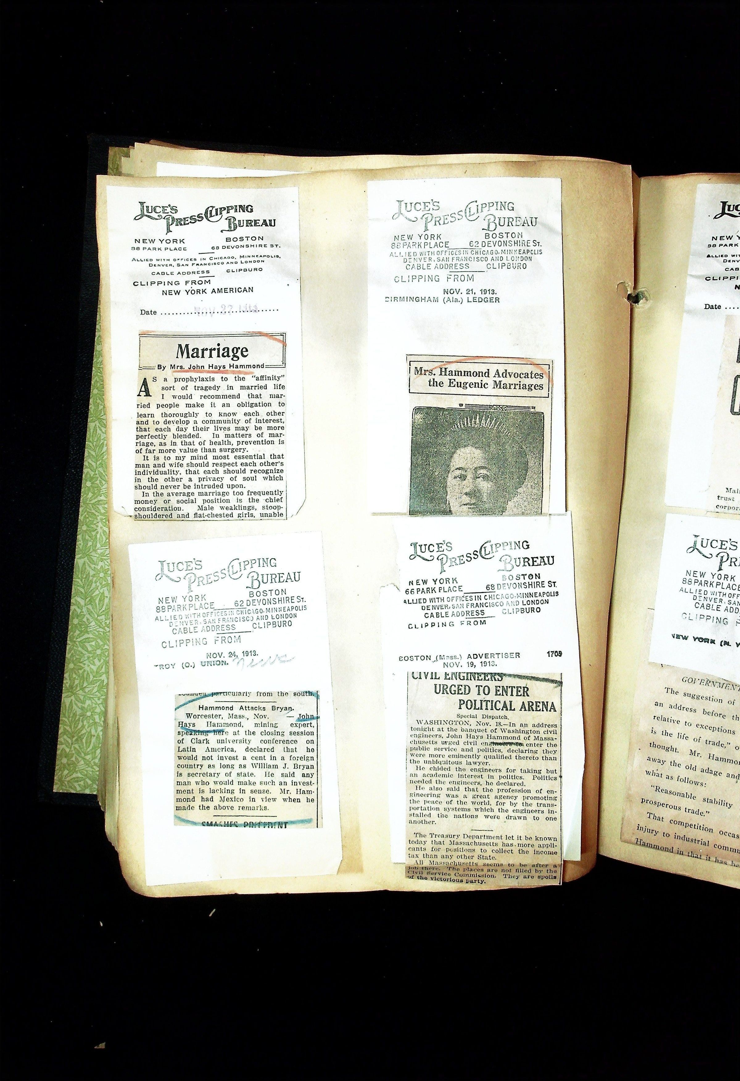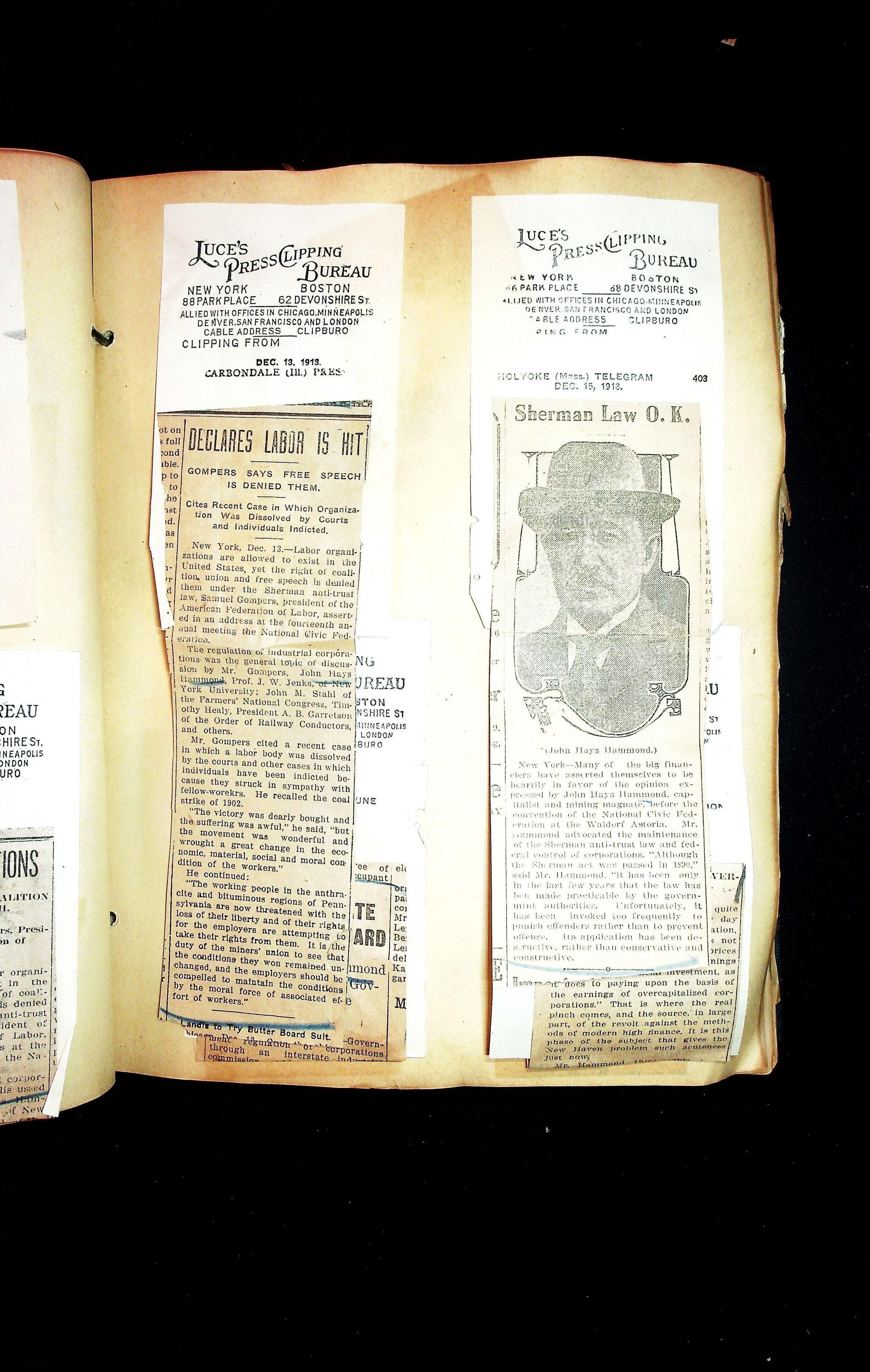 1913 scrapbook of newspaper articles about John Hays Hammond (Sr) and Mrs. Hammond covering governmental policies, Sherman Act, Eugenics & politics.