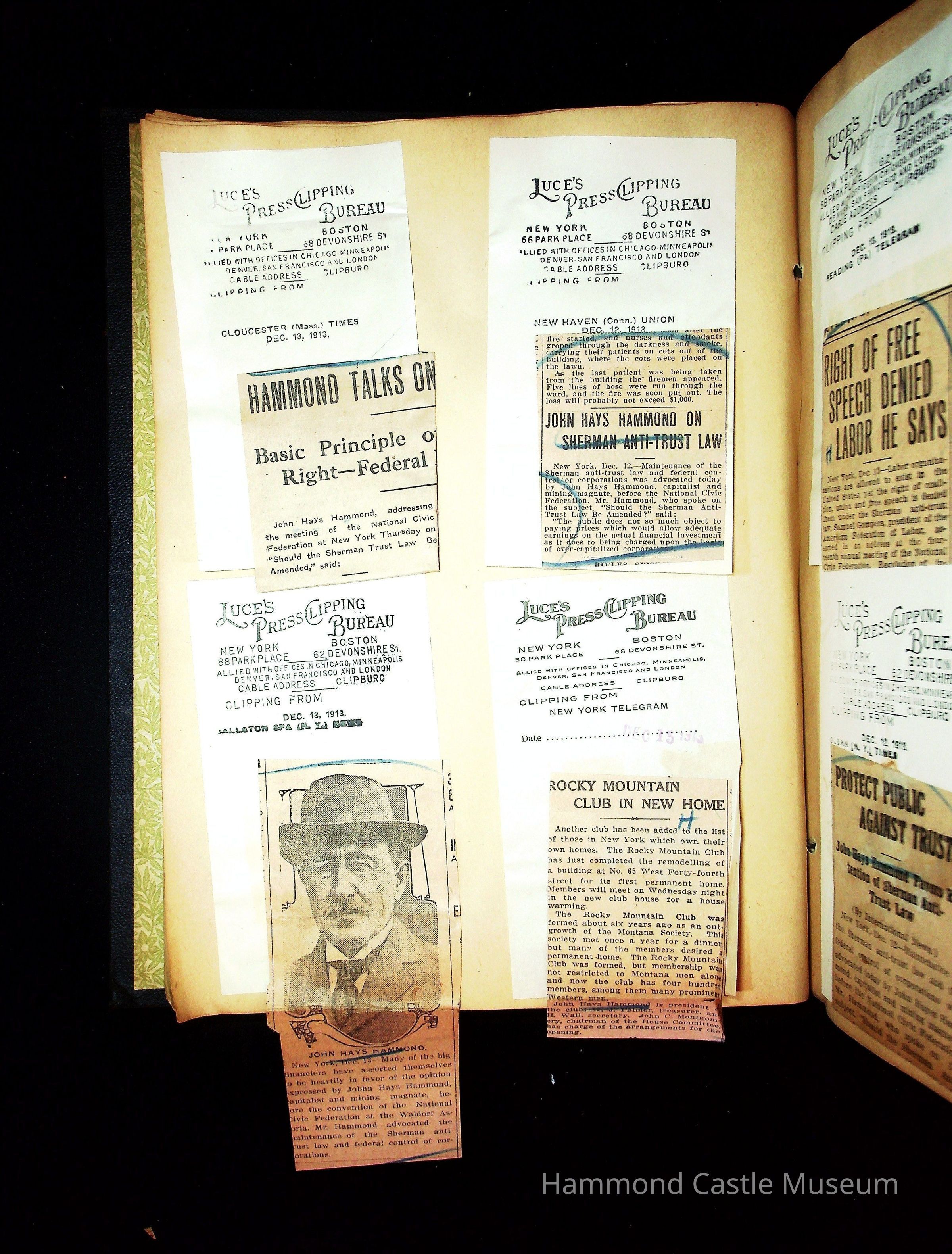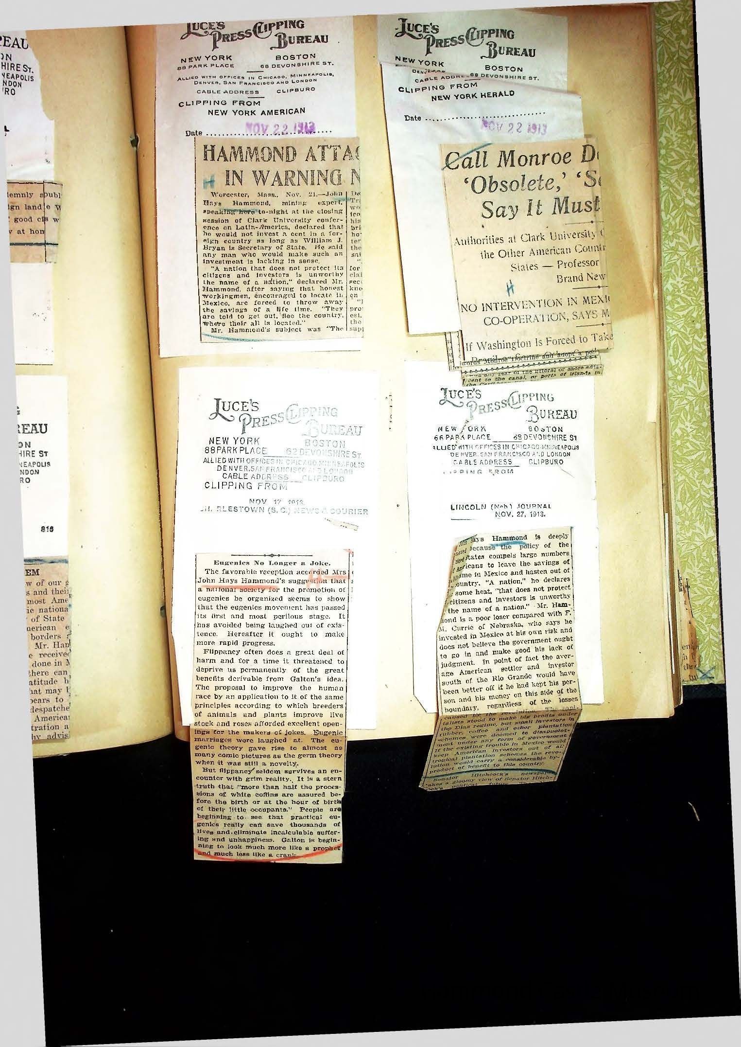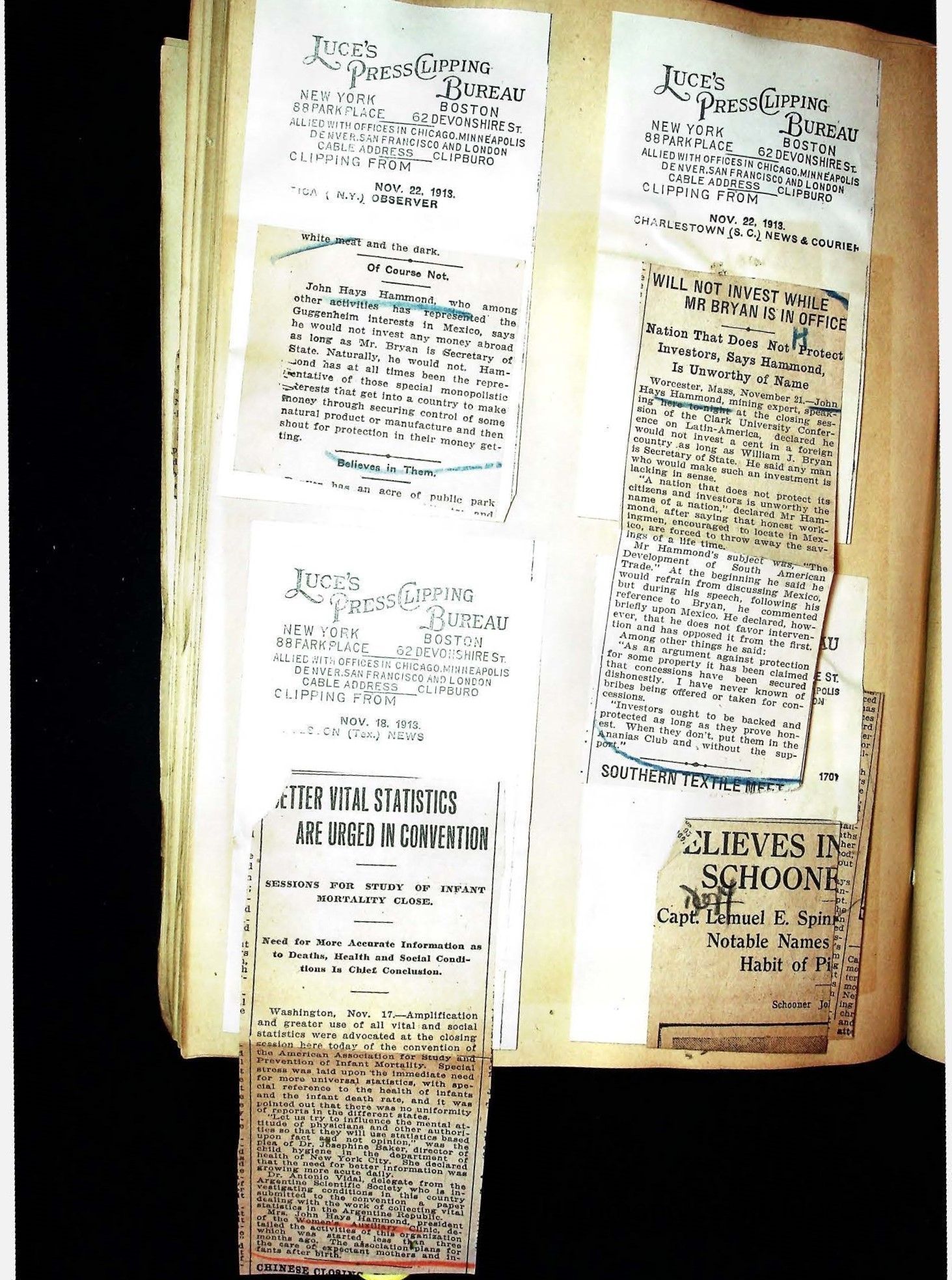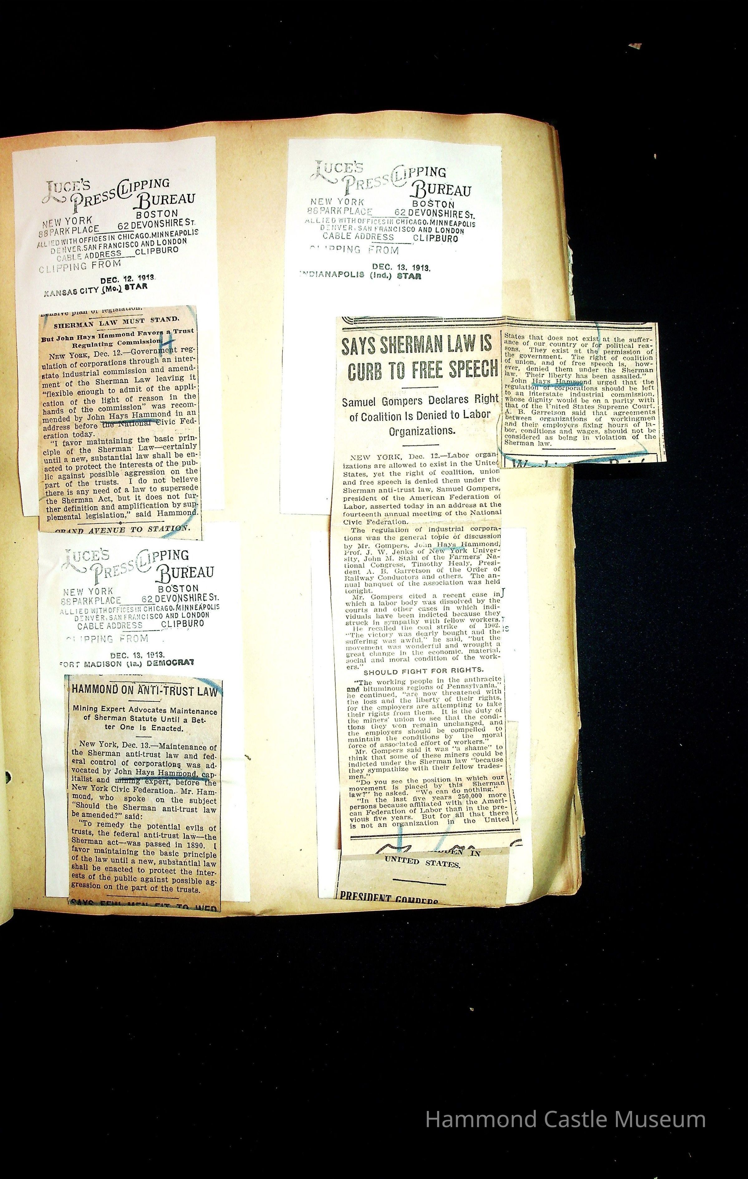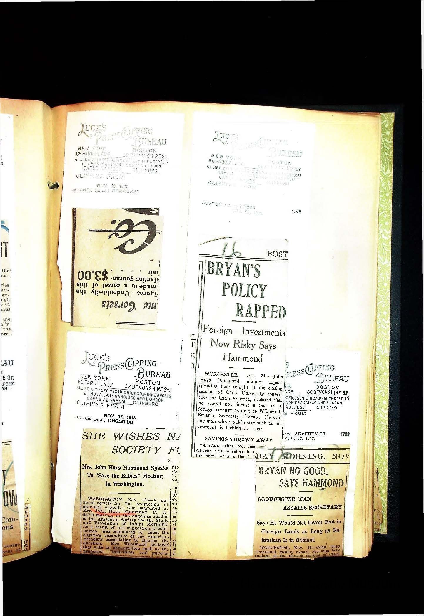 1913 scrapbook of newspaper articles about John Hays Hammond (Sr) and Mrs. Hammond covering governmental policies, Sherman Act, Eugenics & politics.