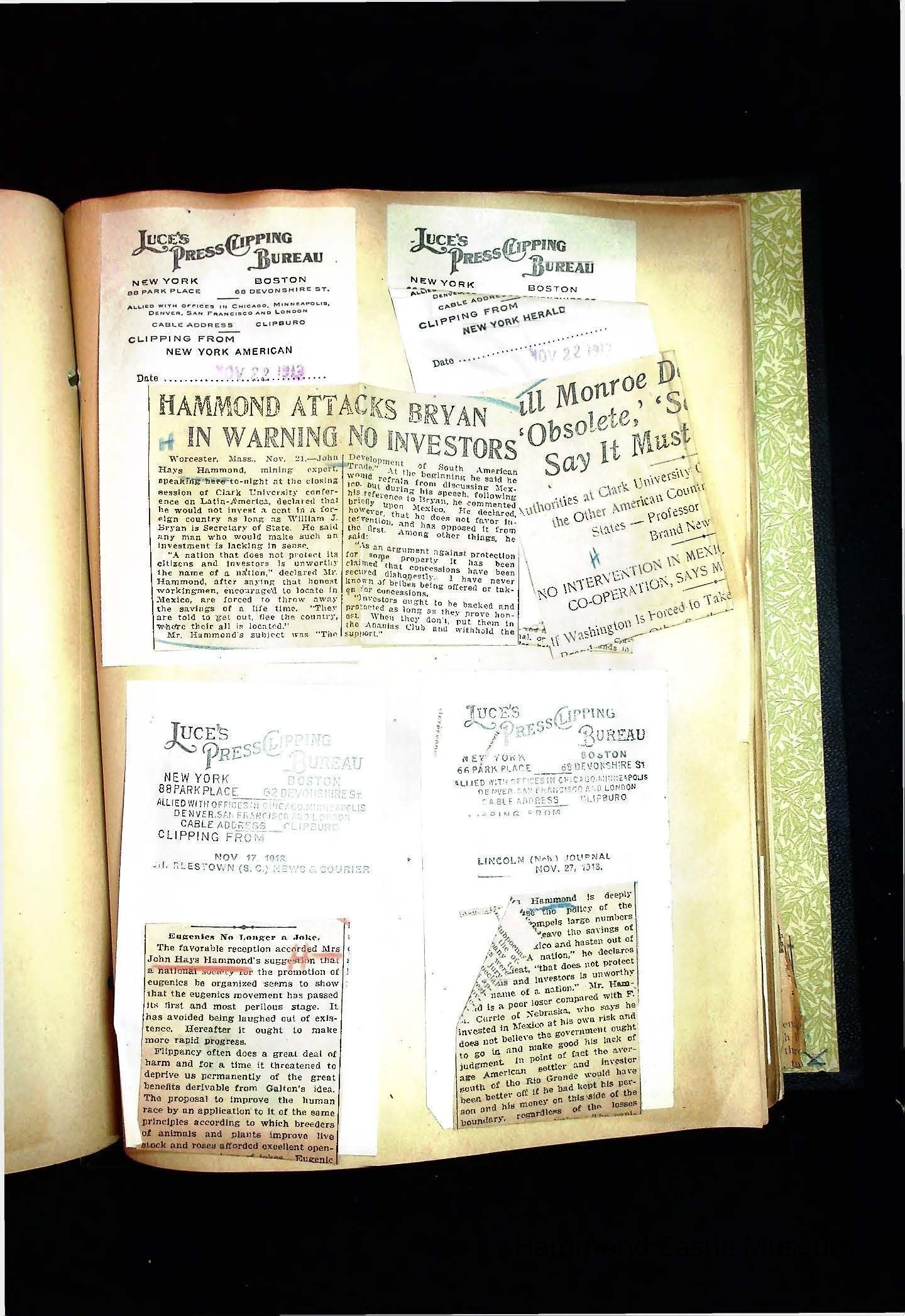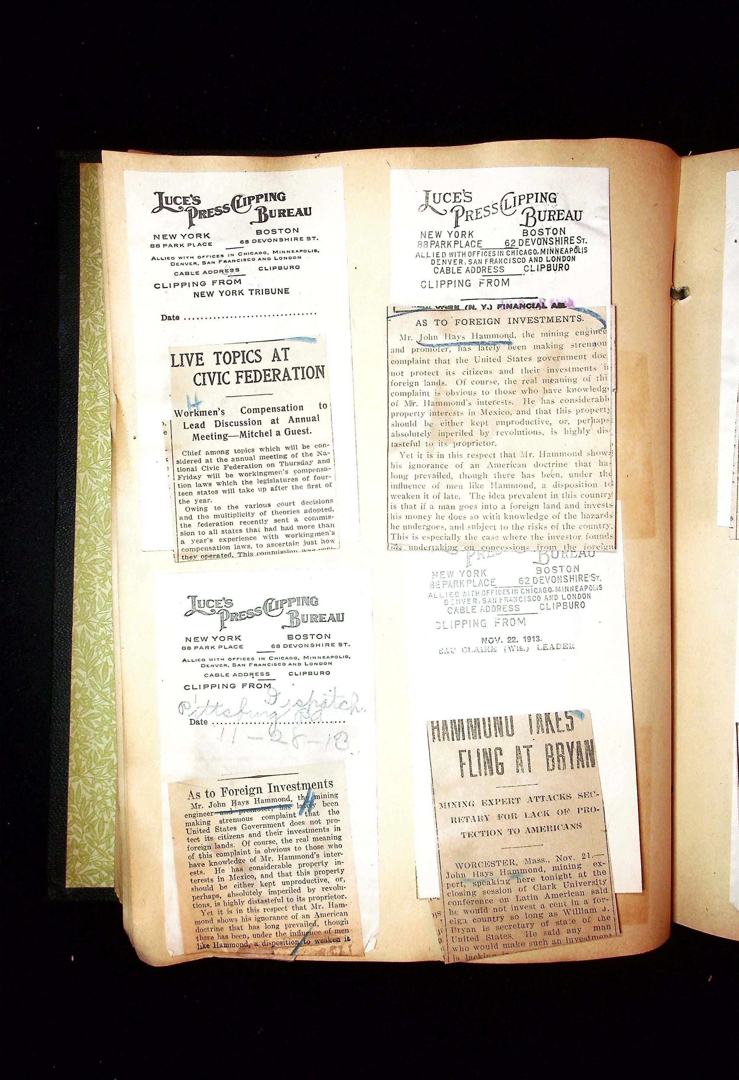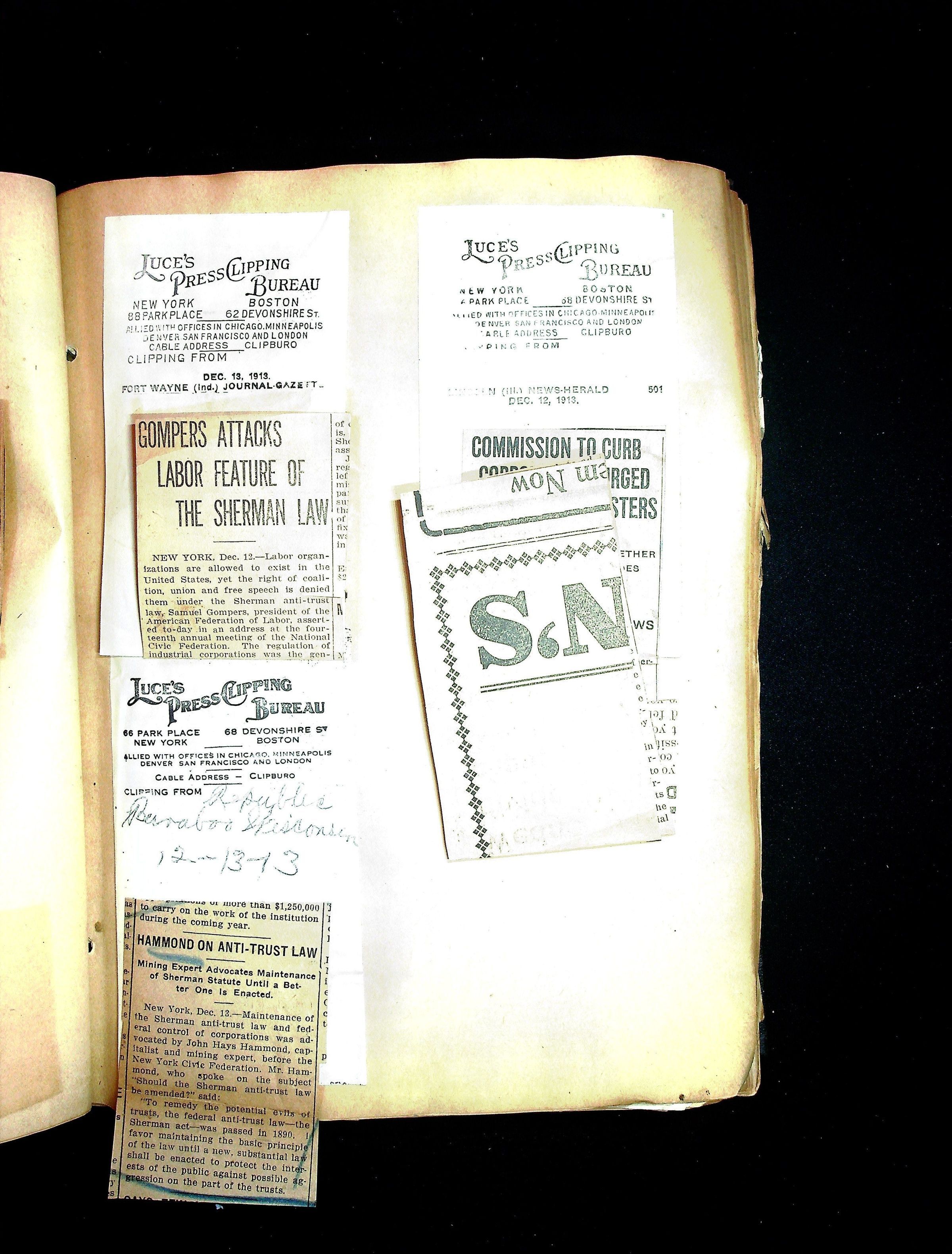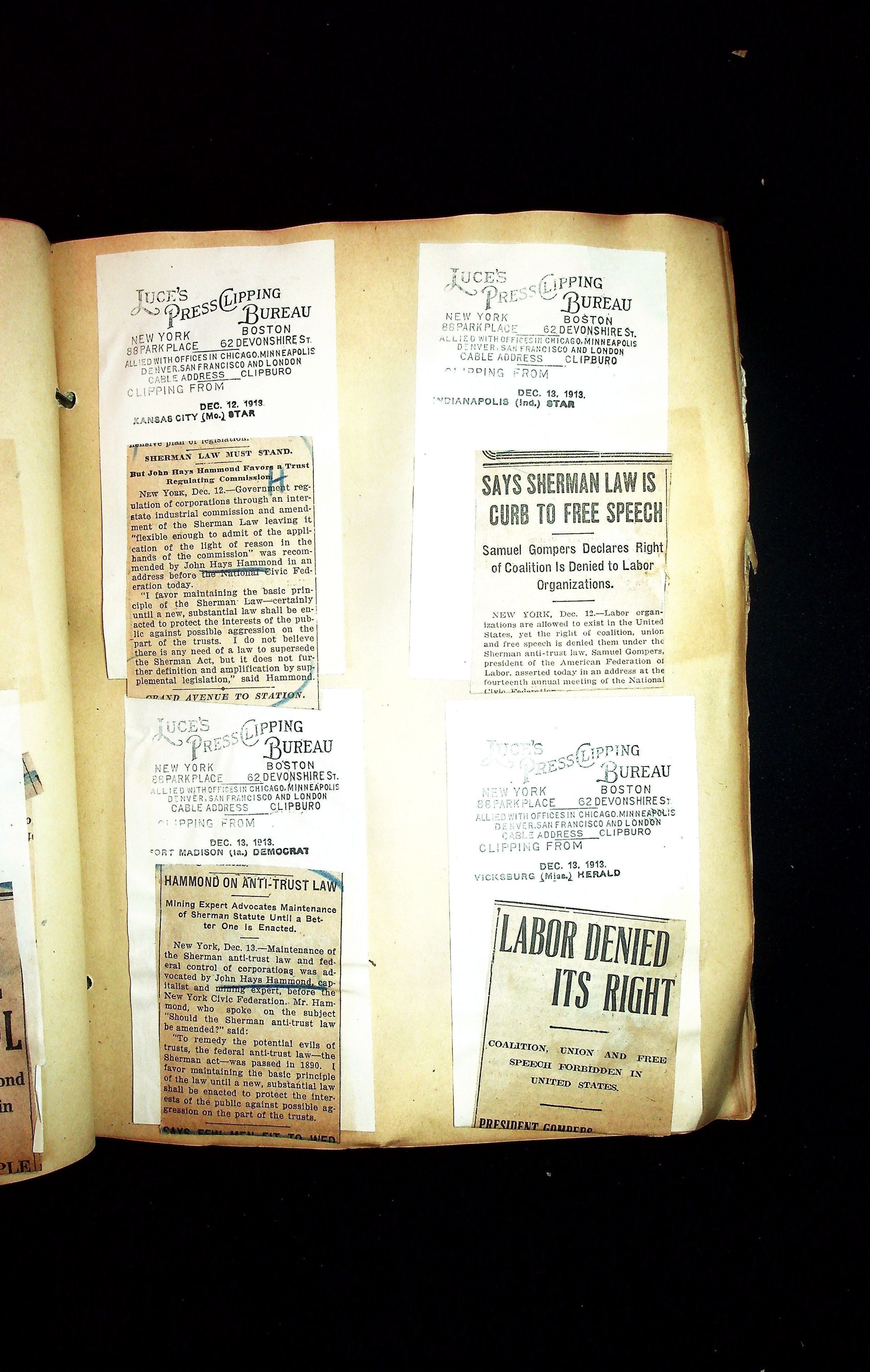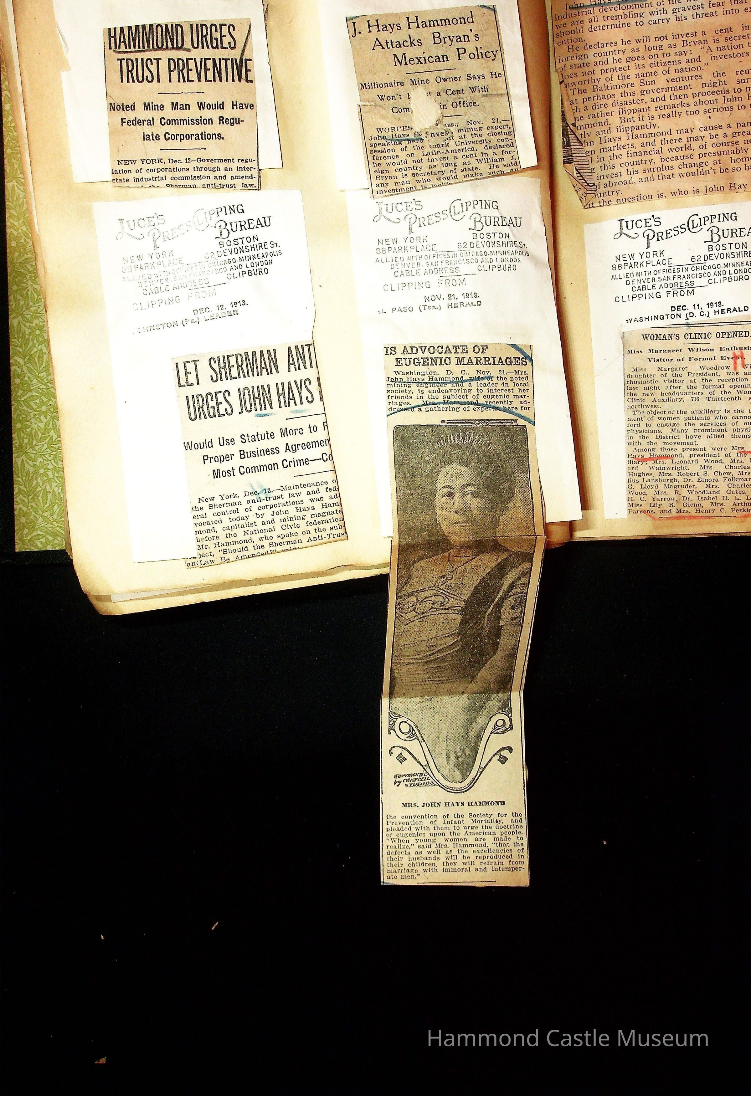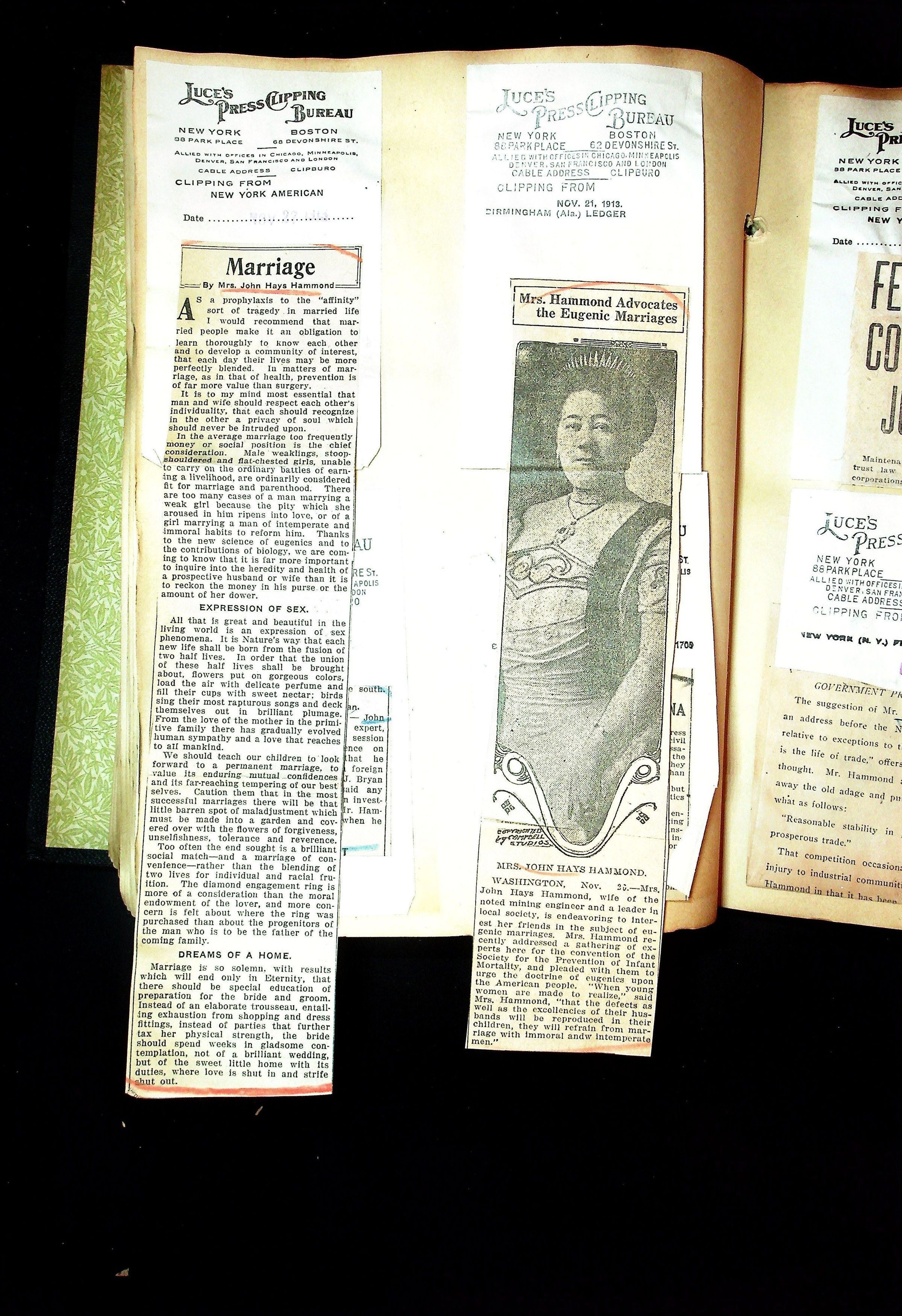 1913 scrapbook of newspaper articles about John Hays Hammond (Sr) and Mrs. Hammond covering governmental policies, Sherman Act, Eugenics & politics.