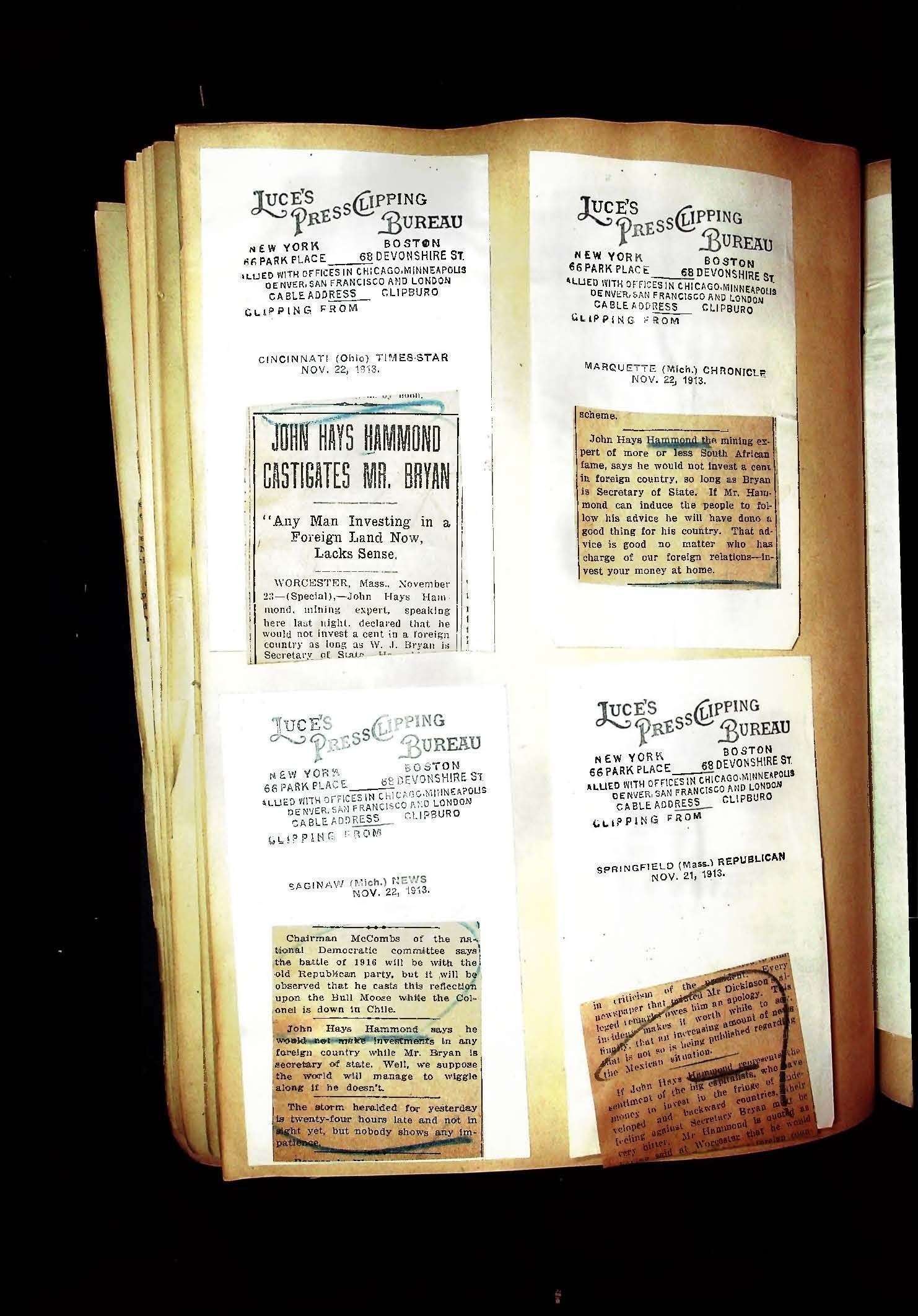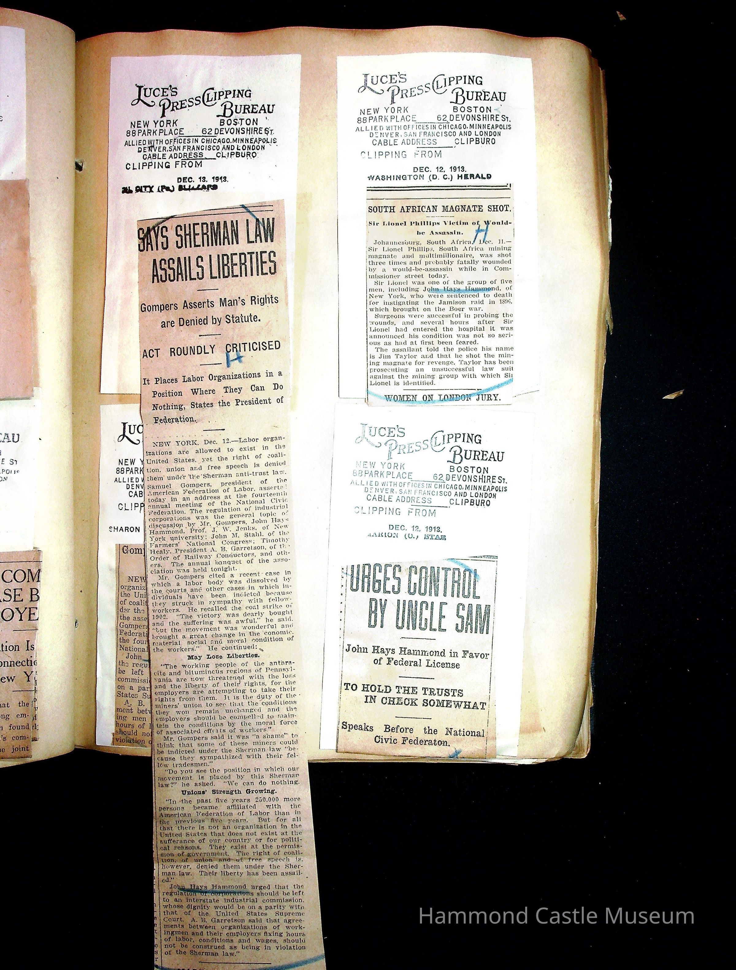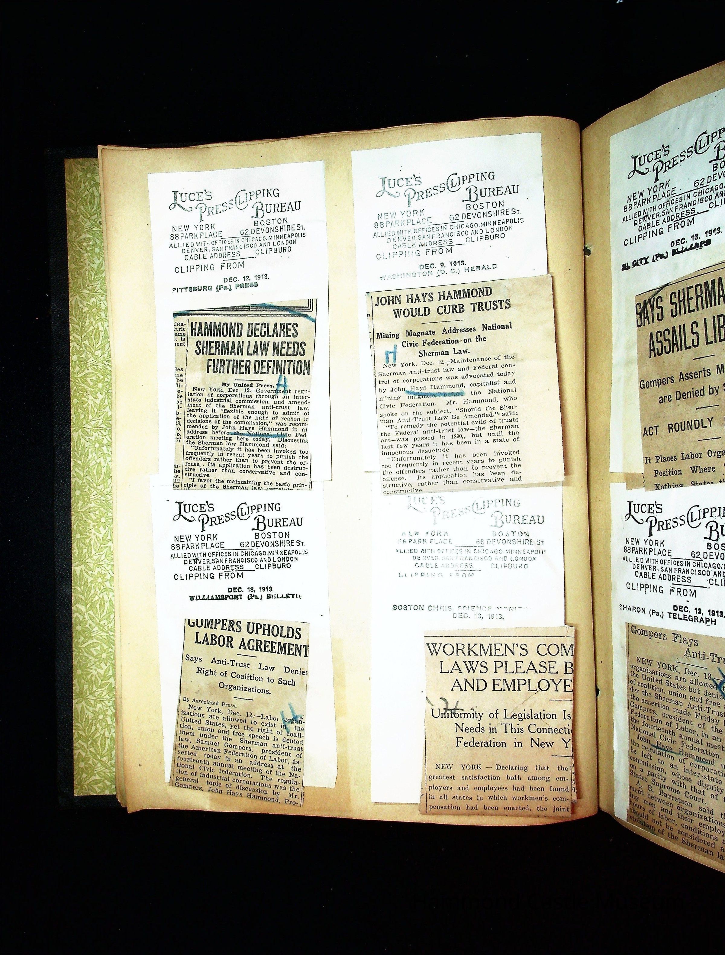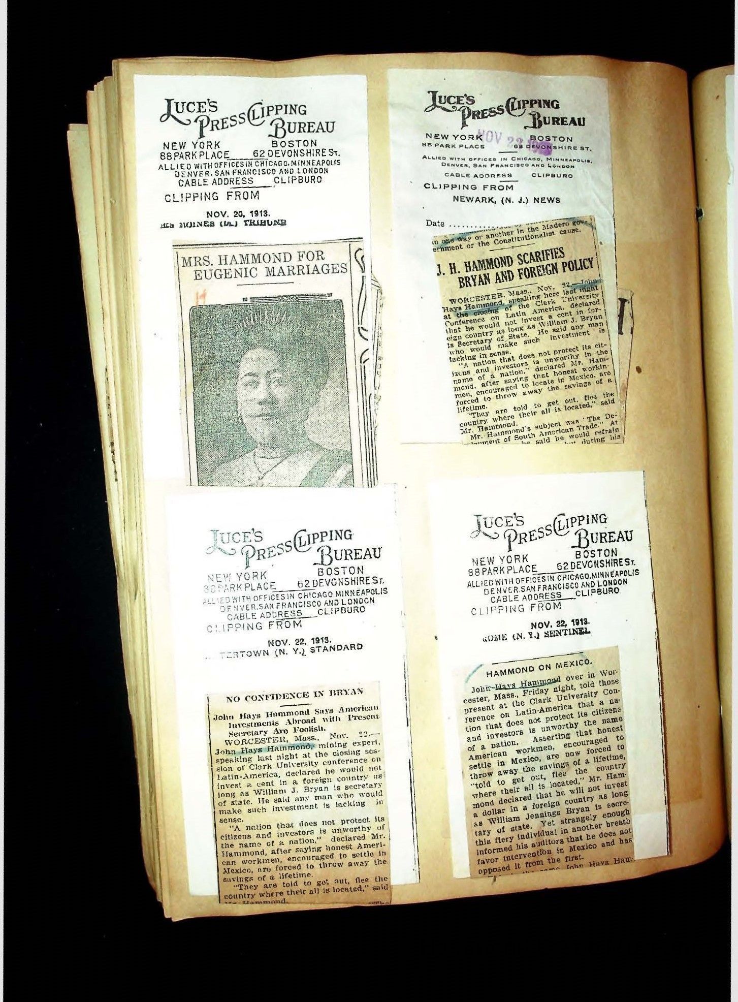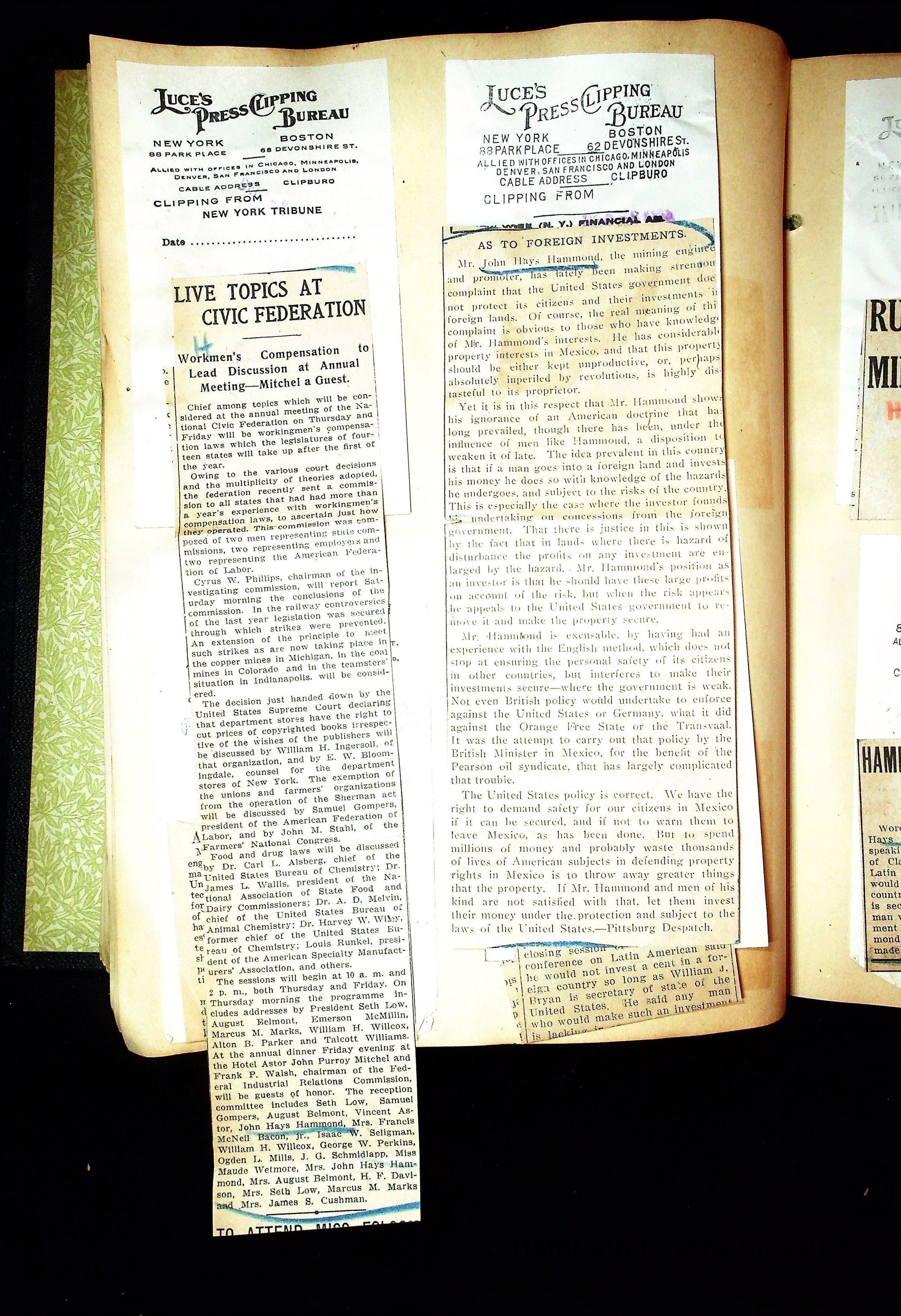 1913 scrapbook of newspaper articles about John Hays Hammond (Sr) and Mrs. Hammond covering governmental policies, Sherman Act, Eugenics & politics.