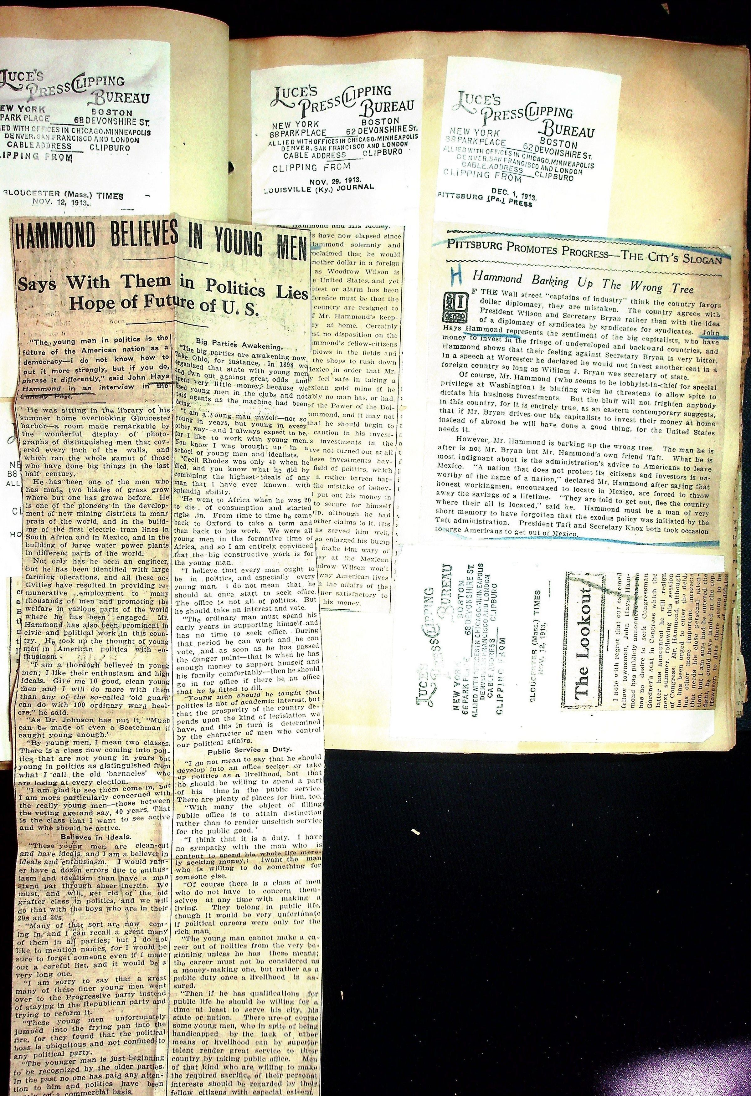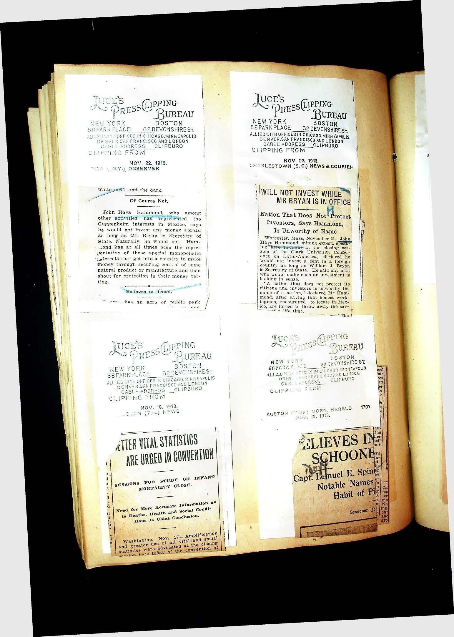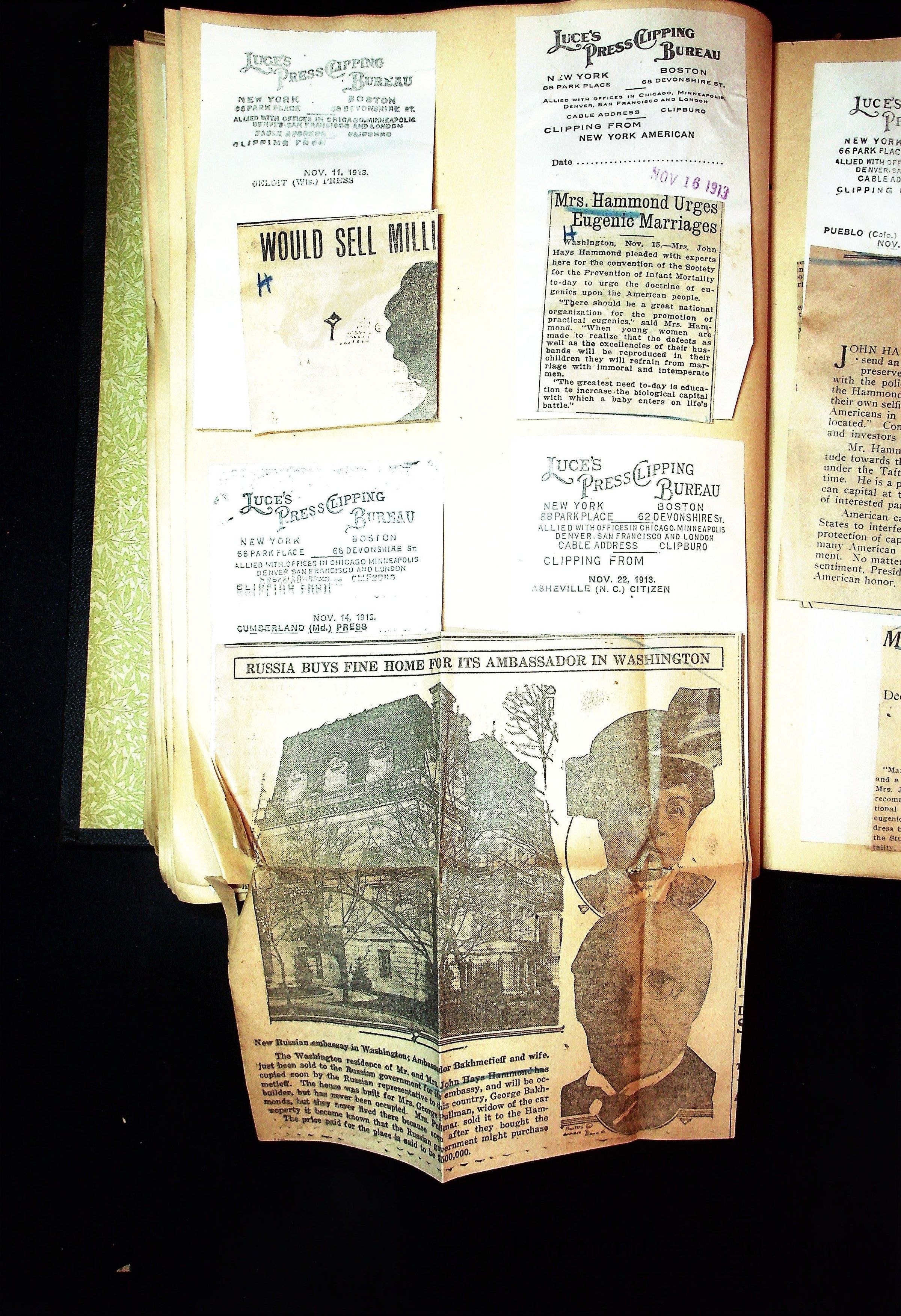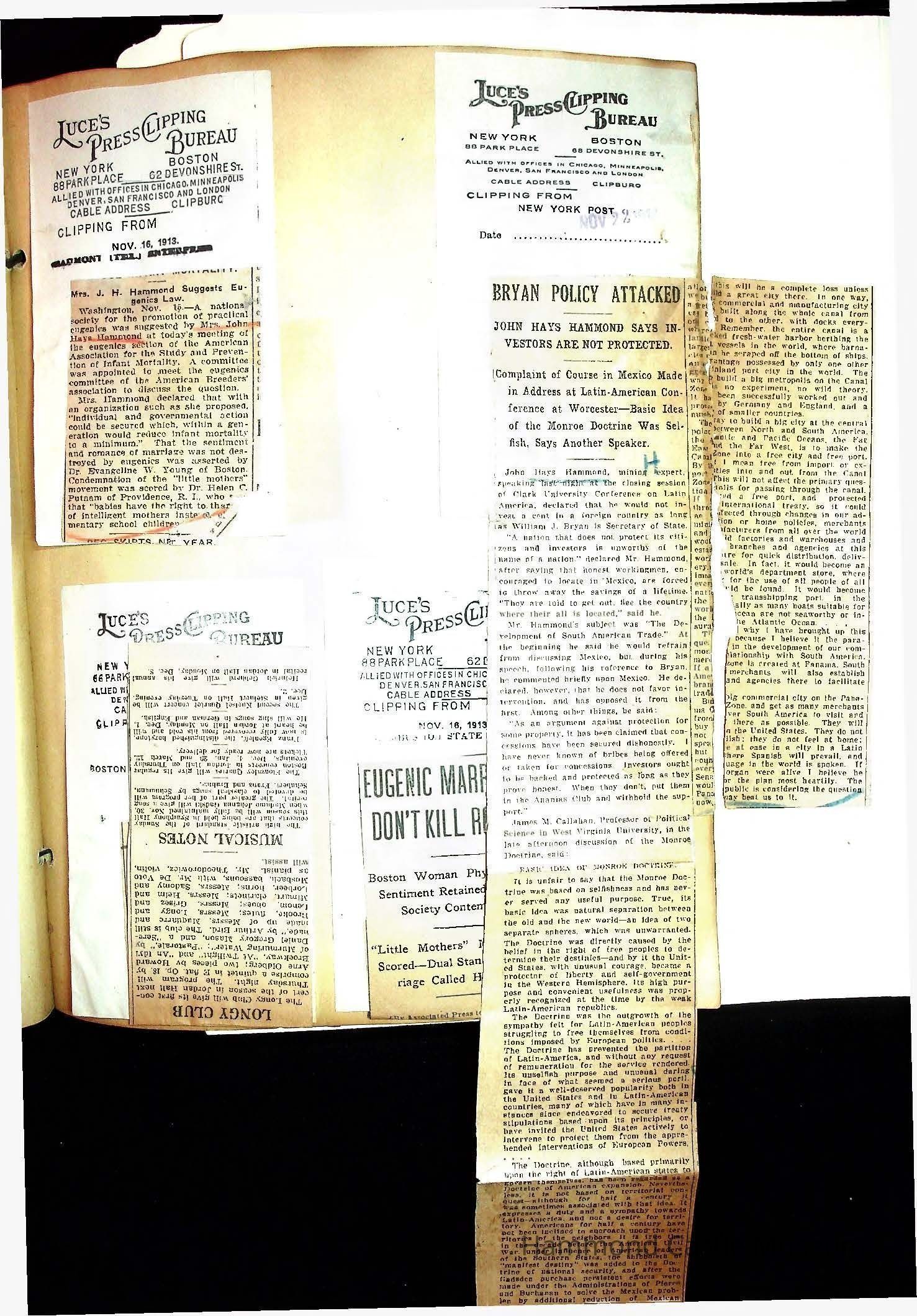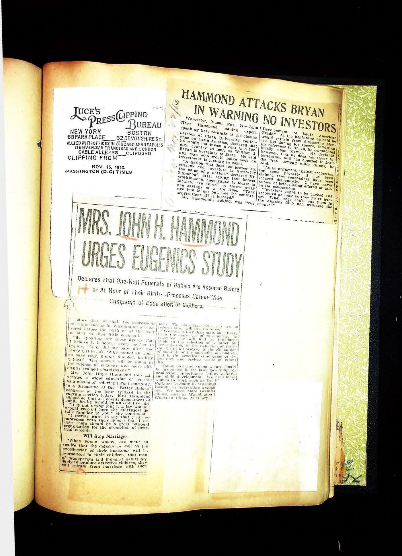 1913 scrapbook of newspaper articles about John Hays Hammond (Sr) and Mrs. Hammond covering governmental policies, Sherman Act, Eugenics & politics.
