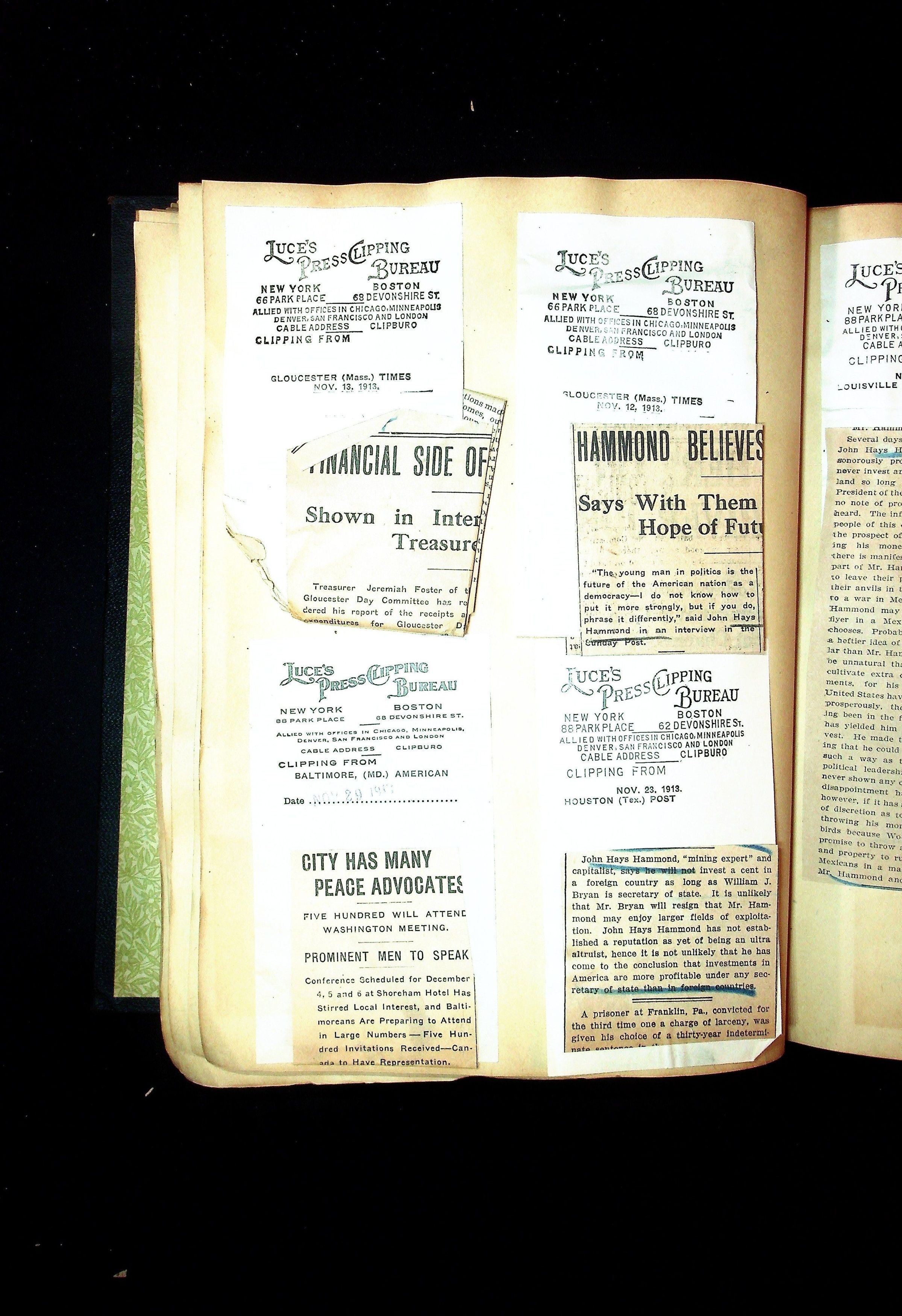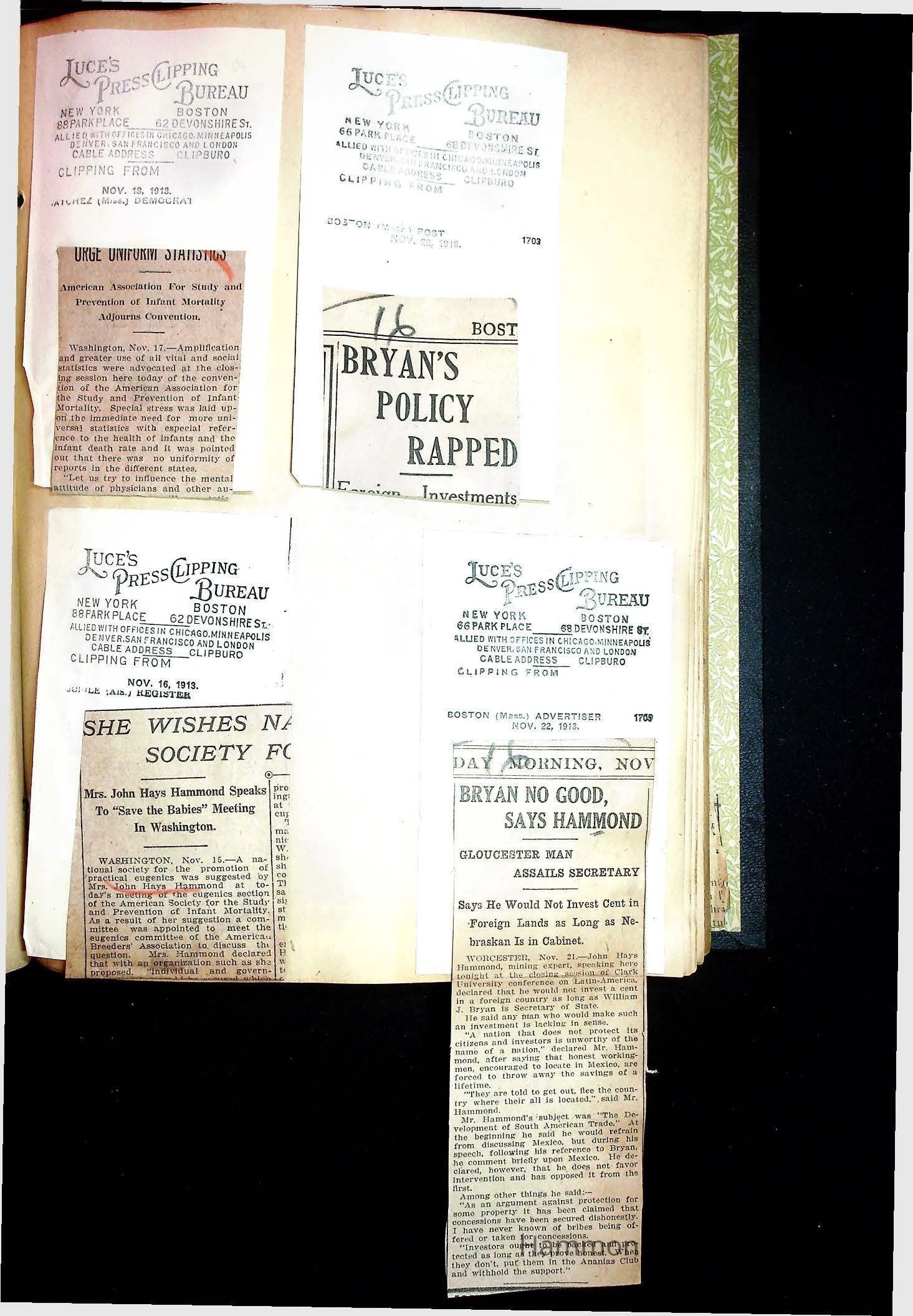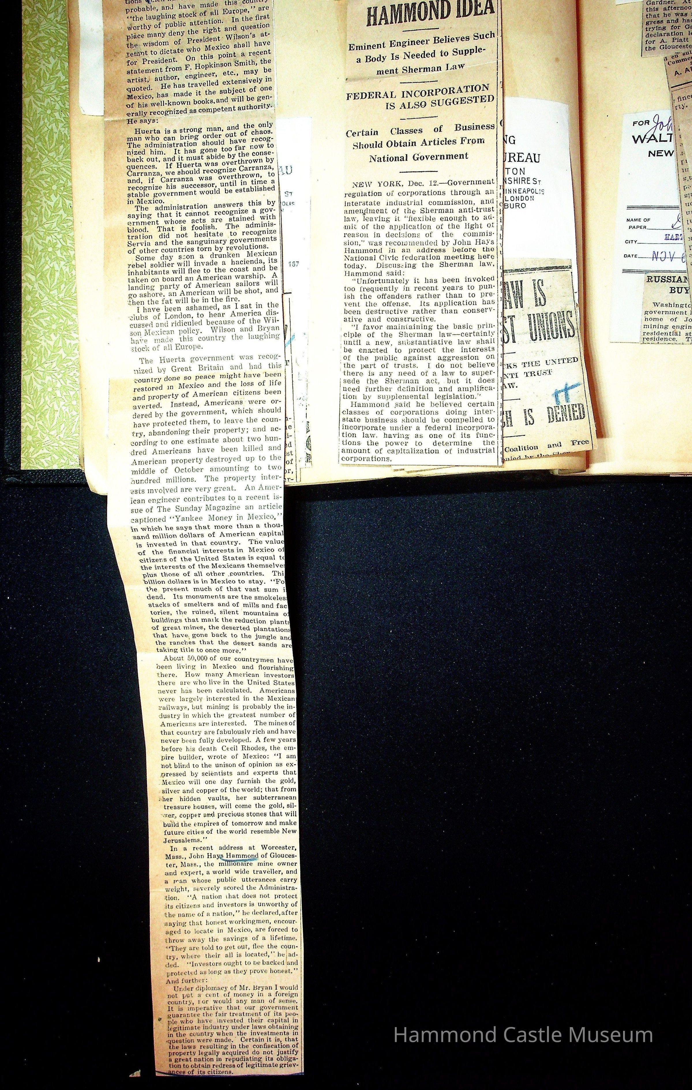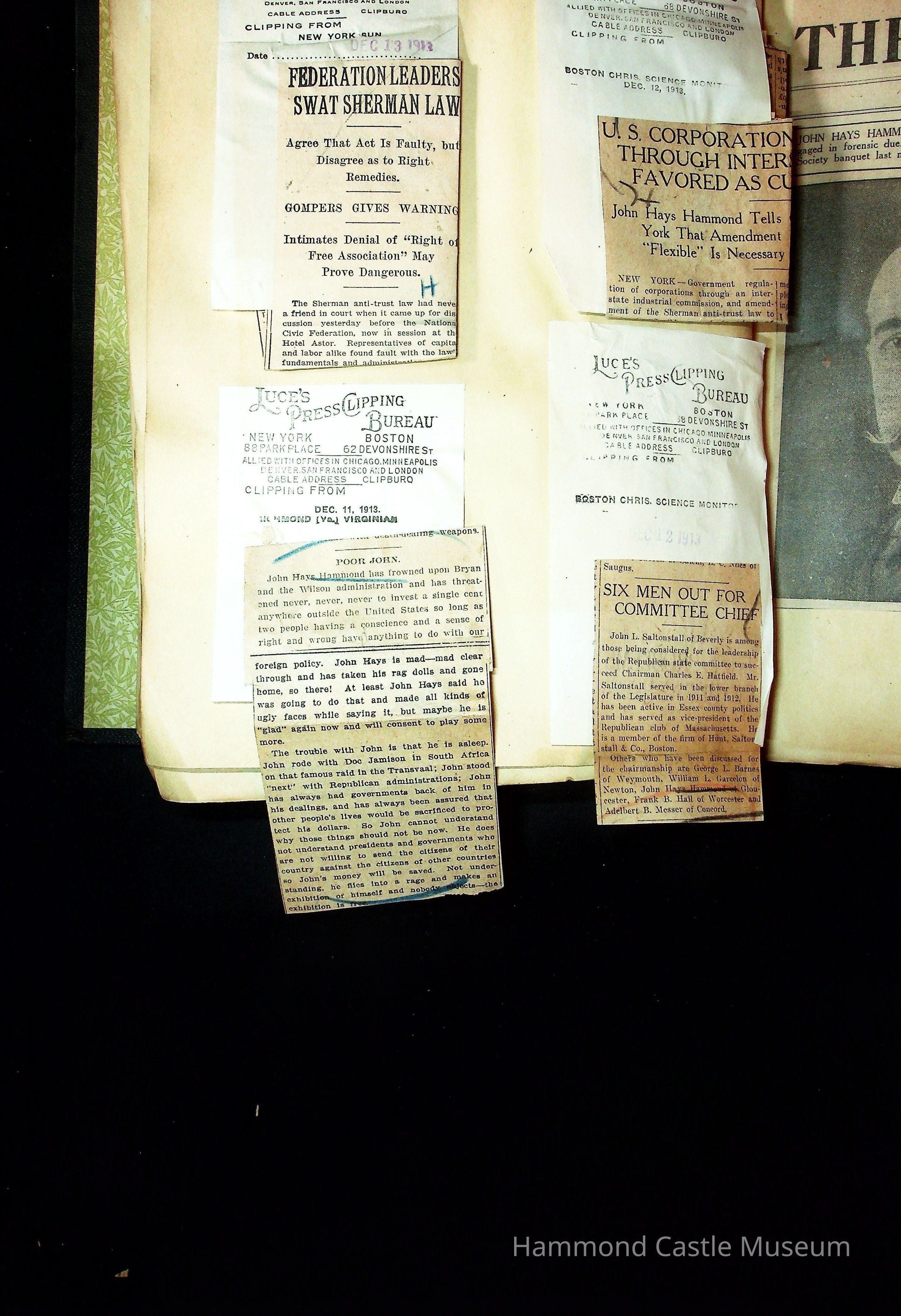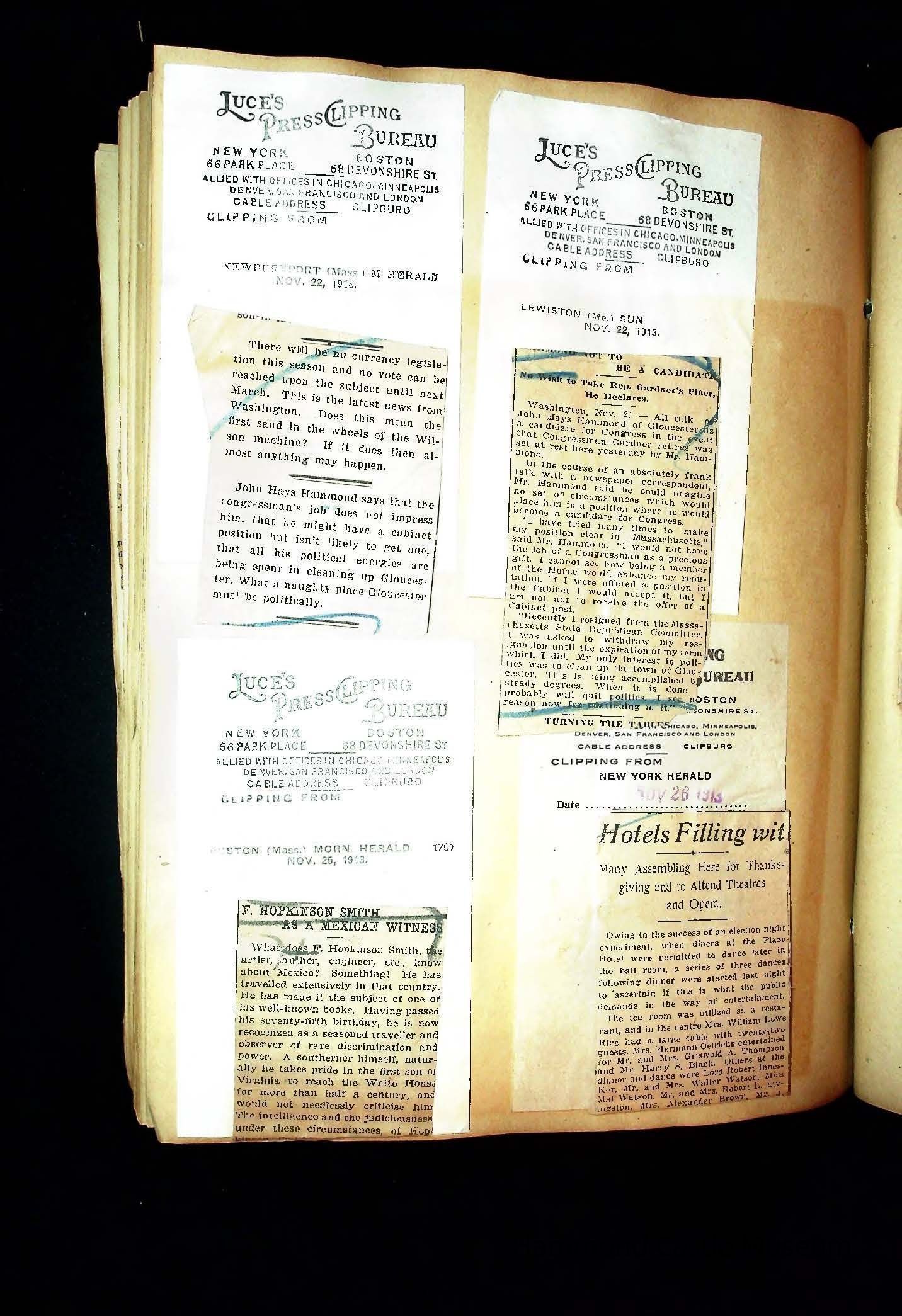 1913 scrapbook of newspaper articles about John Hays Hammond (Sr) and Mrs. Hammond covering governmental policies, Sherman Act, Eugenics & politics.