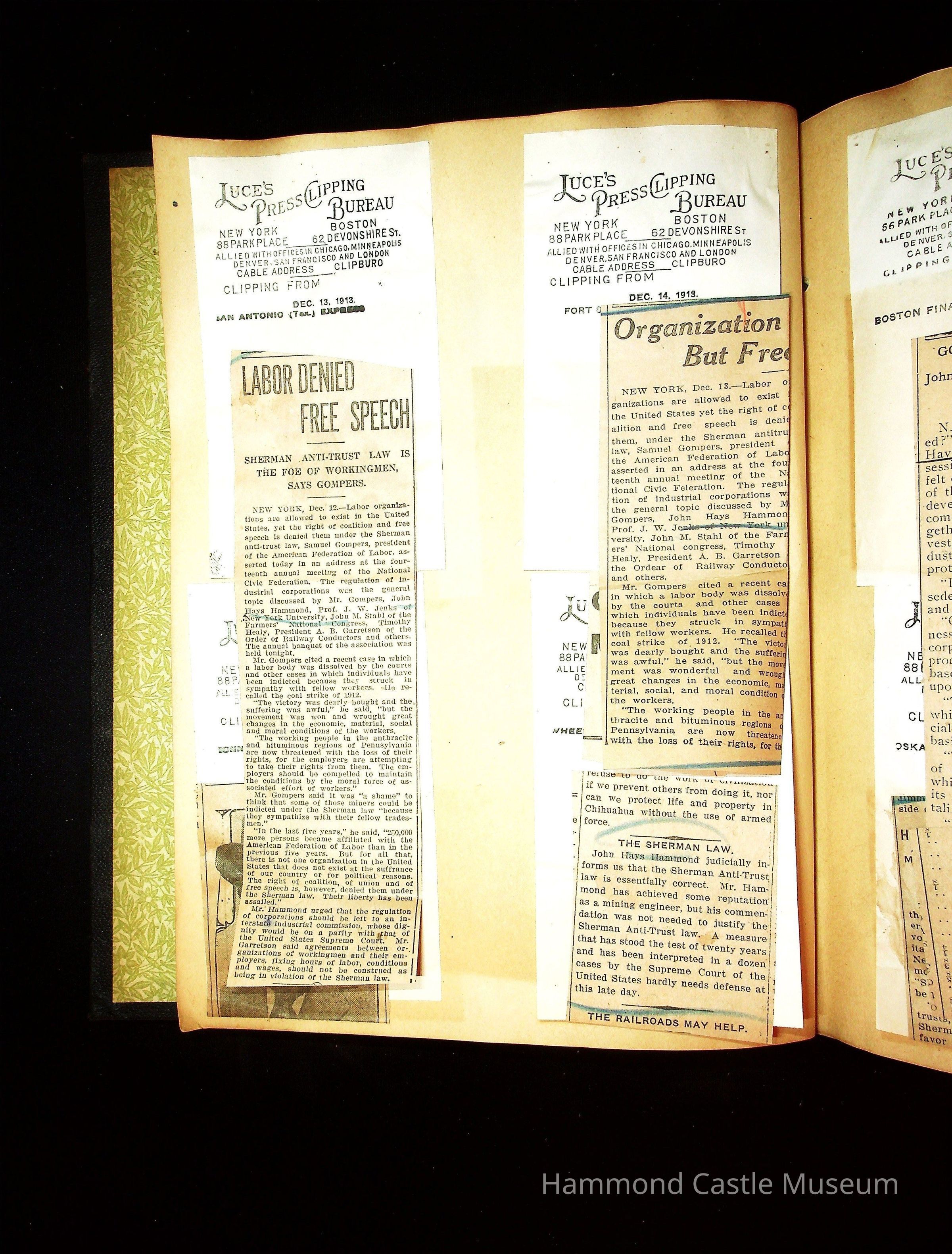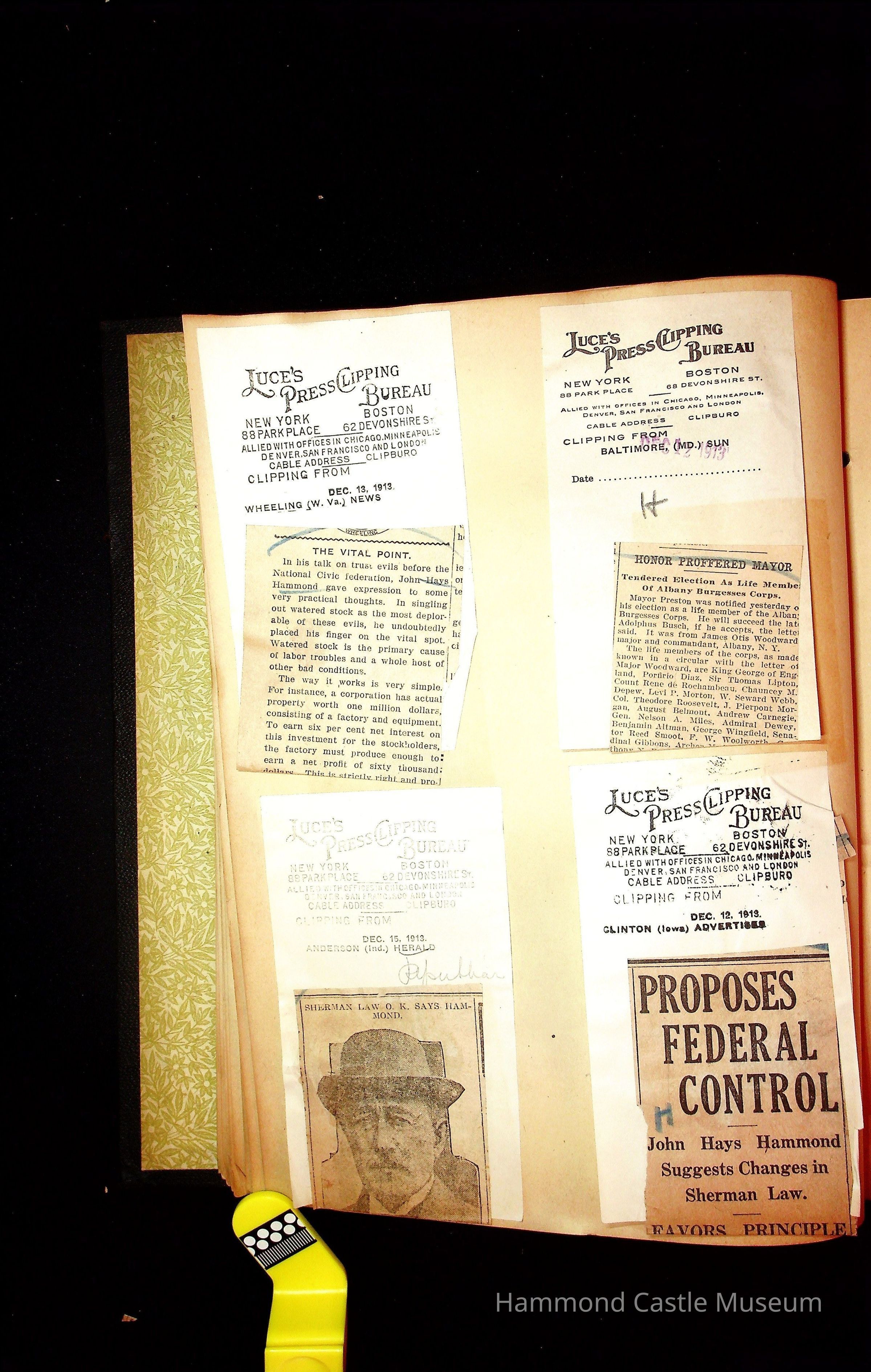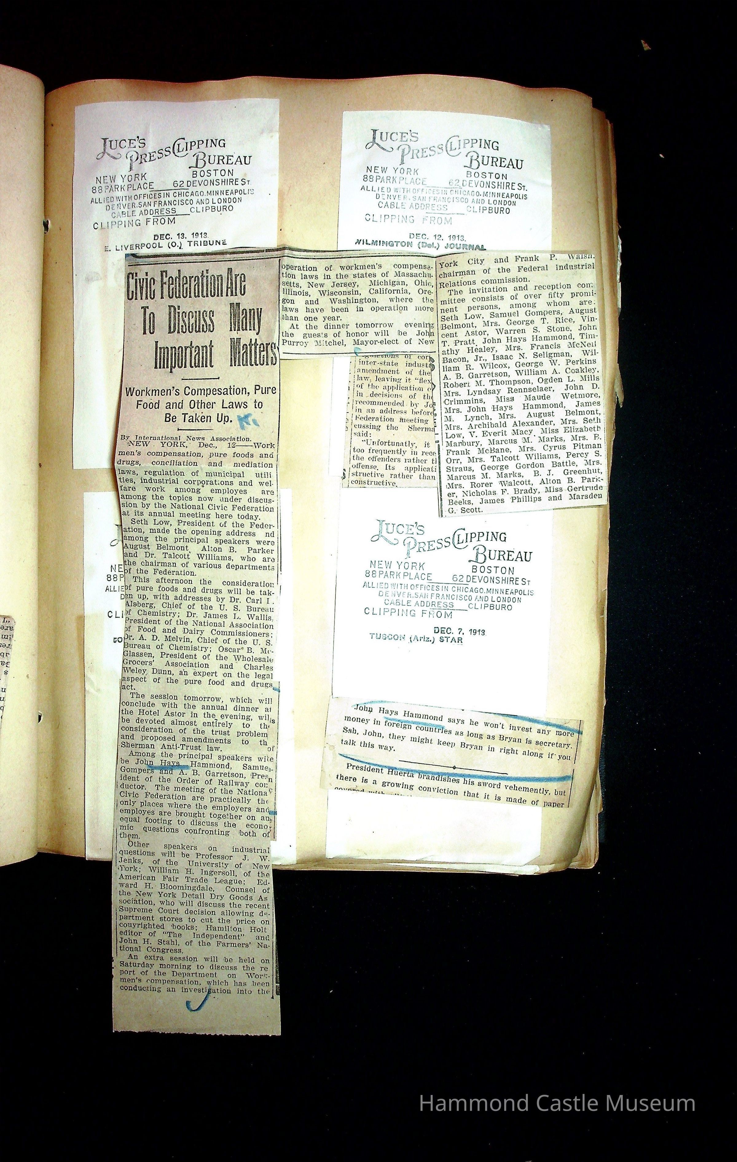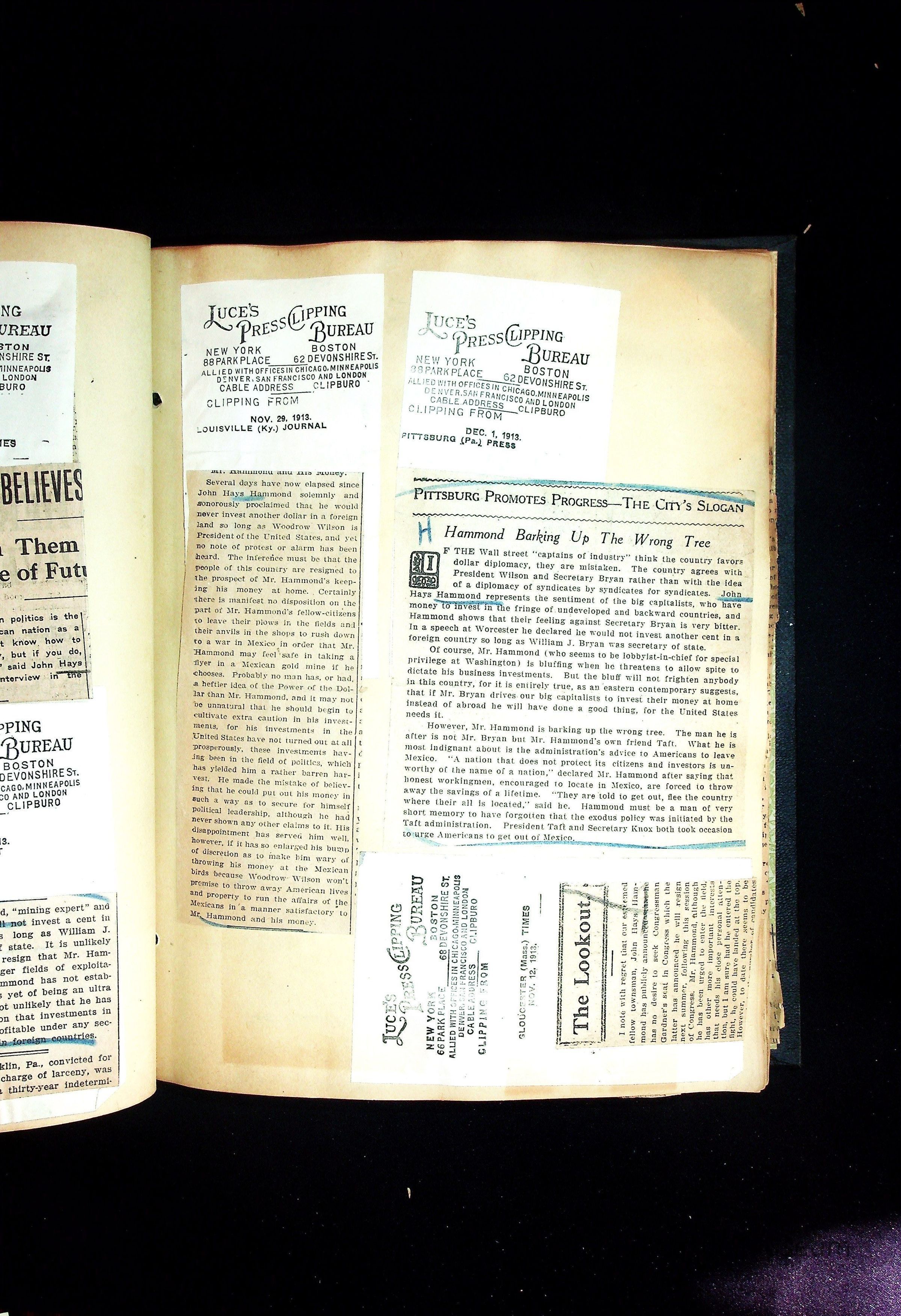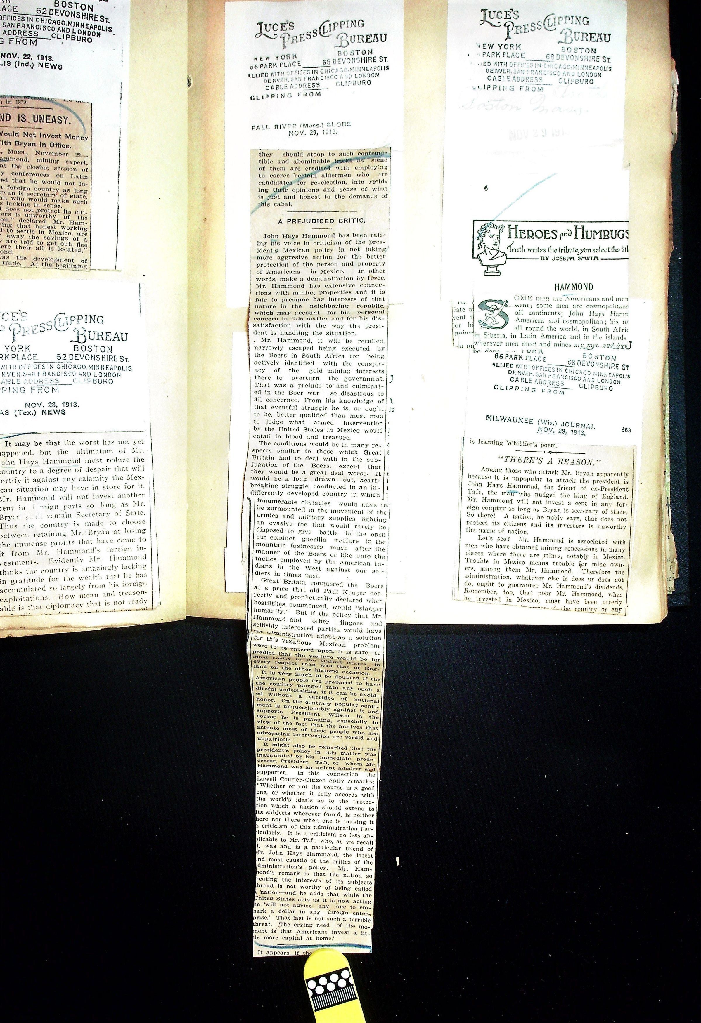 1913 scrapbook of newspaper articles about John Hays Hammond (Sr) and Mrs. Hammond covering governmental policies, Sherman Act, Eugenics & politics.