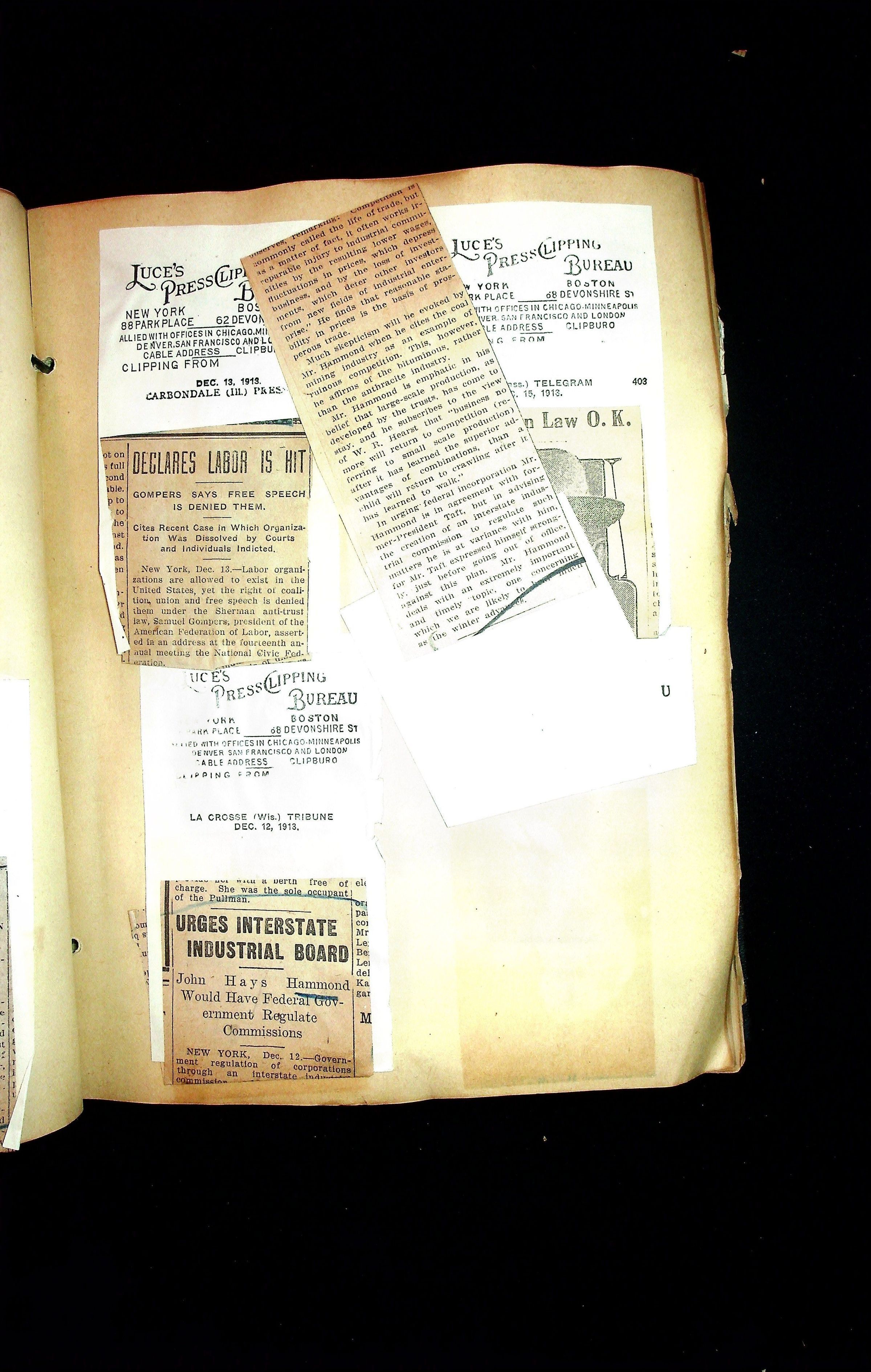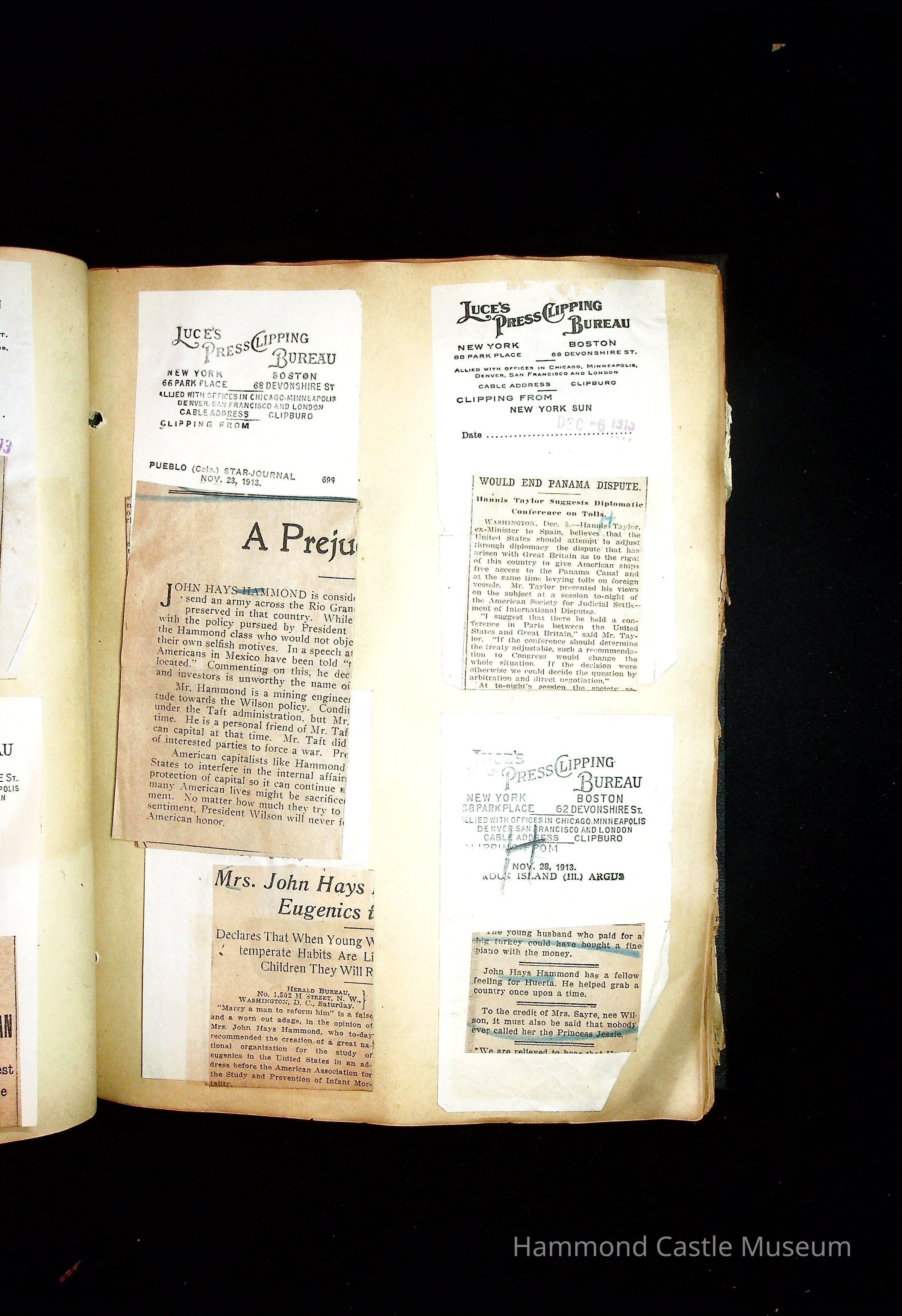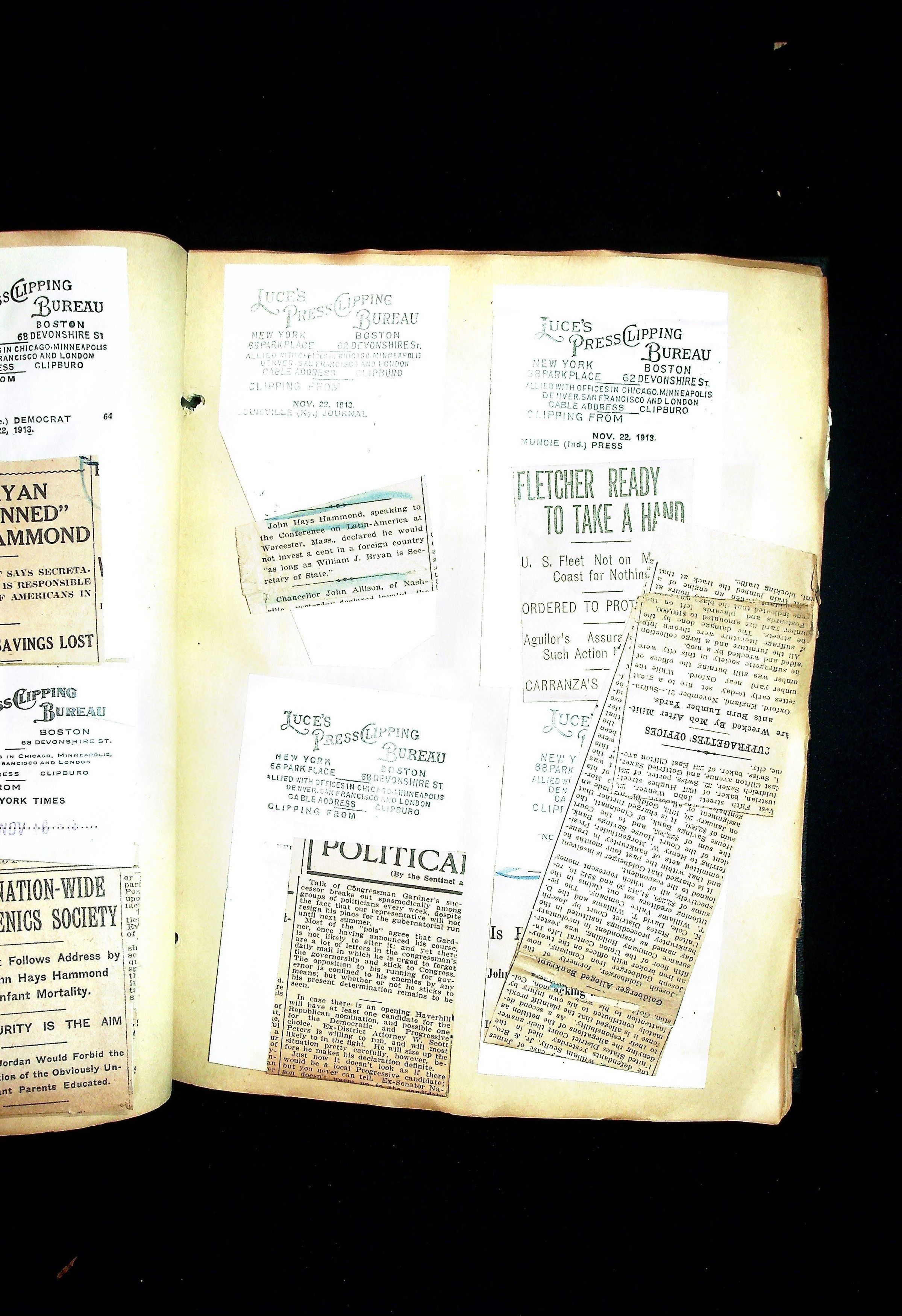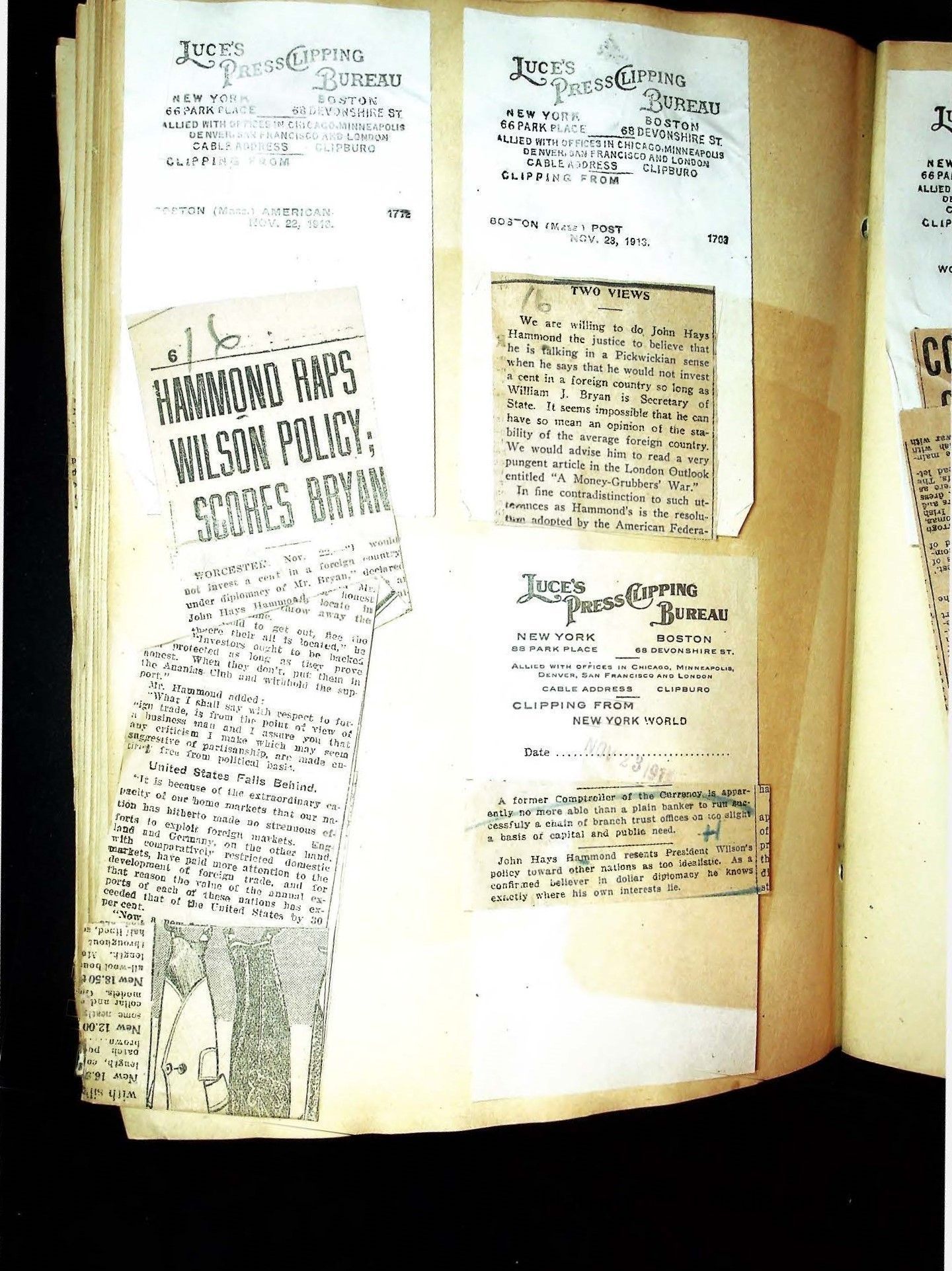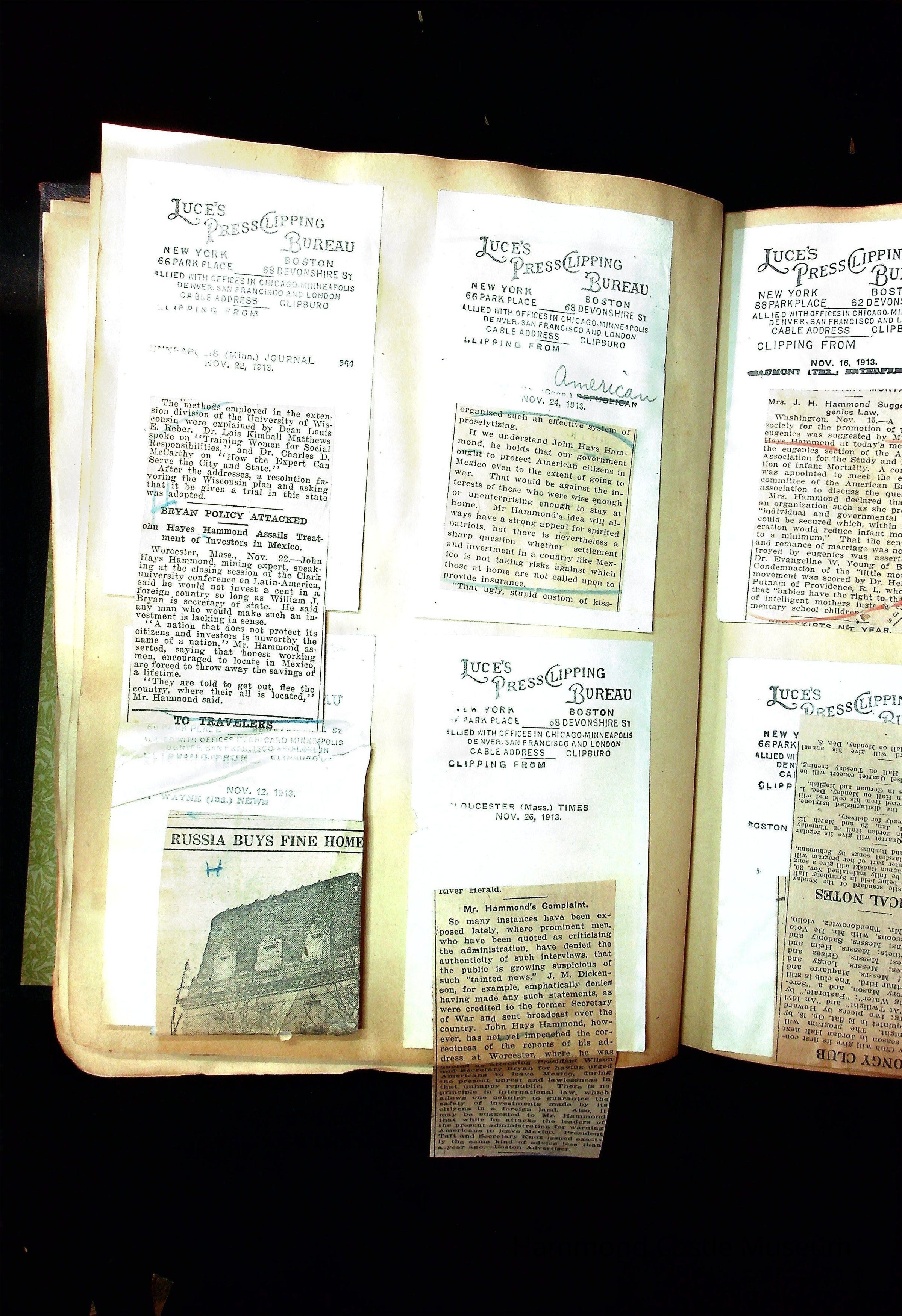 1913 scrapbook of newspaper articles about John Hays Hammond (Sr) and Mrs. Hammond covering governmental policies, Sherman Act, Eugenics & politics.