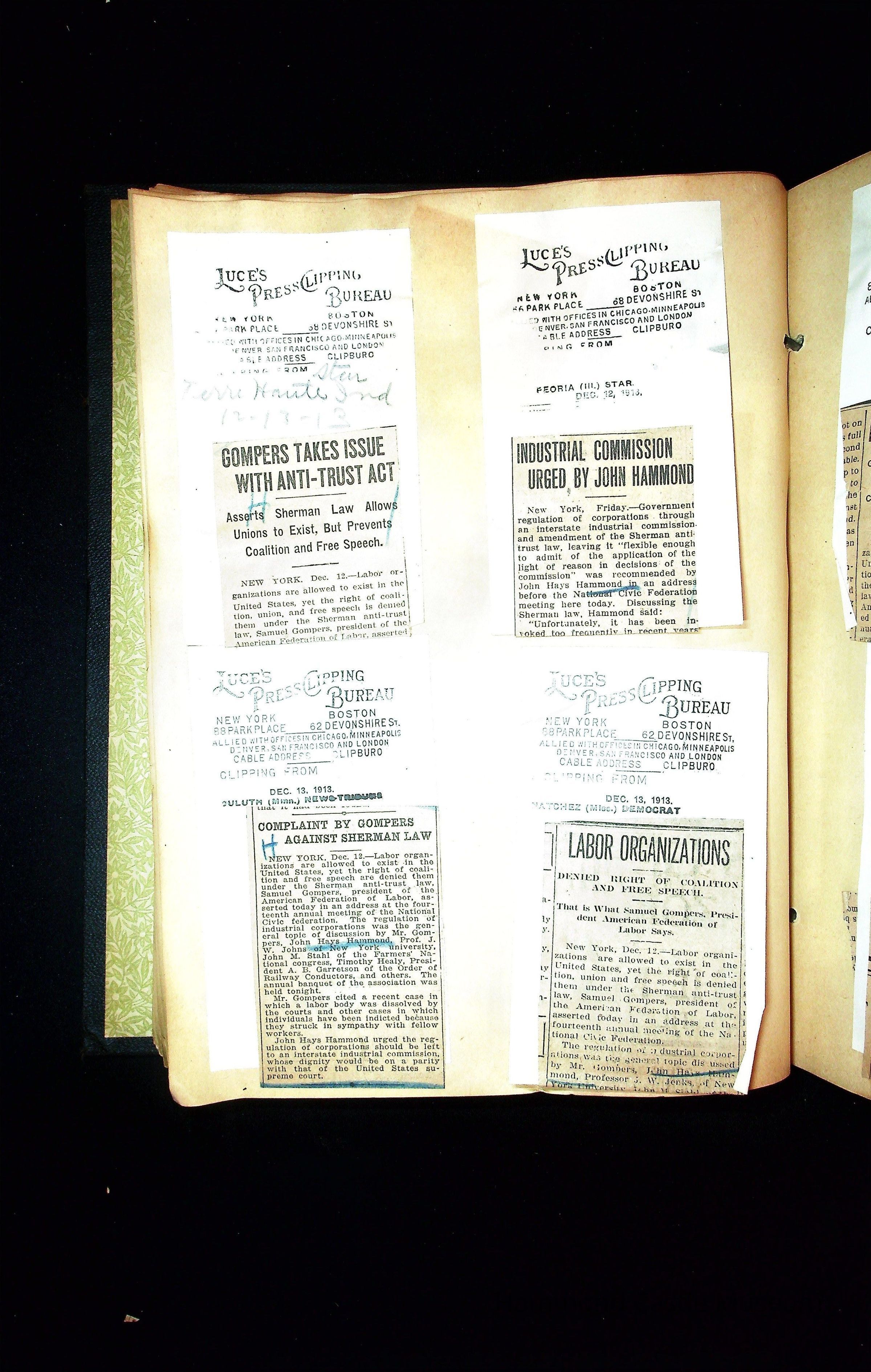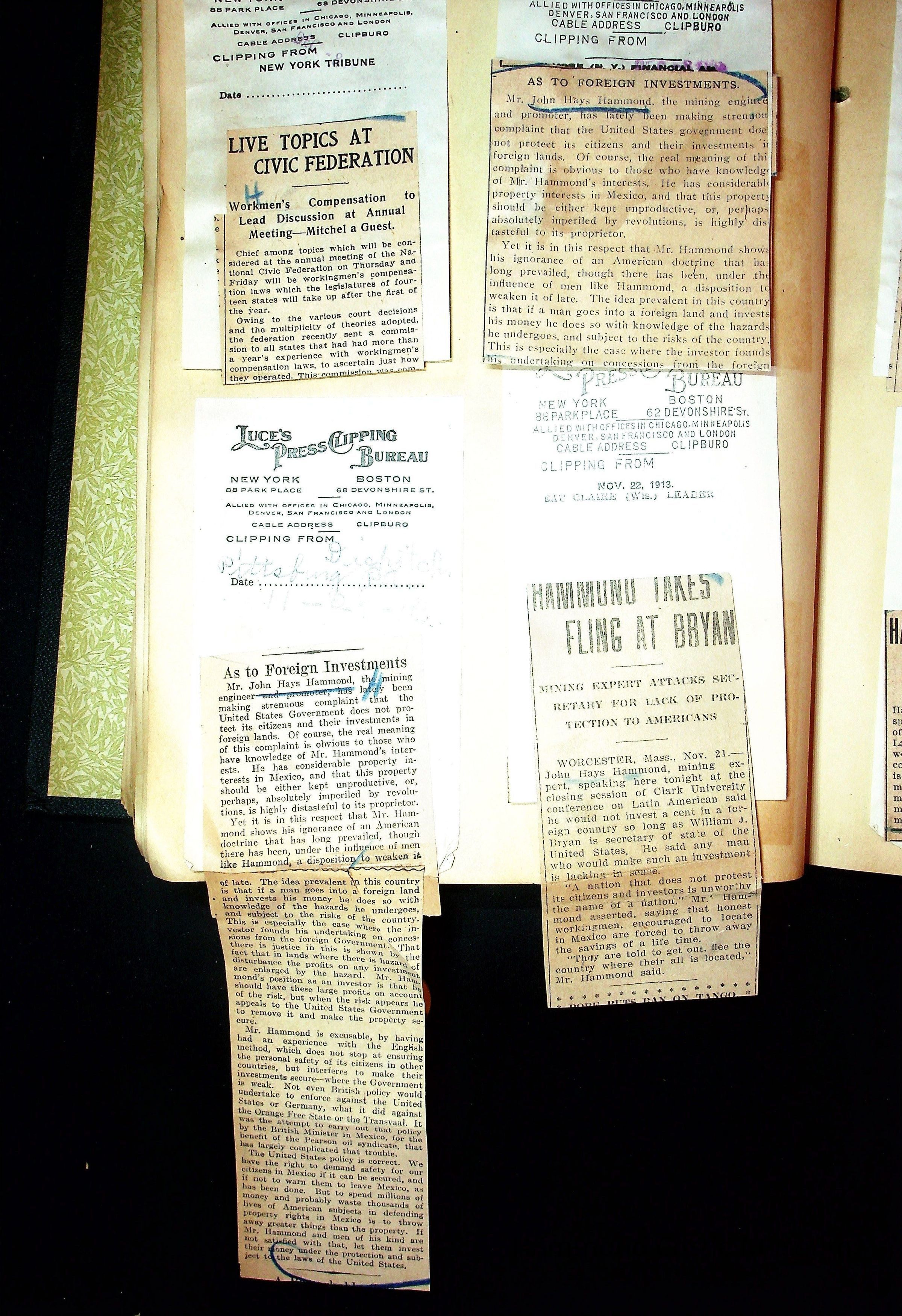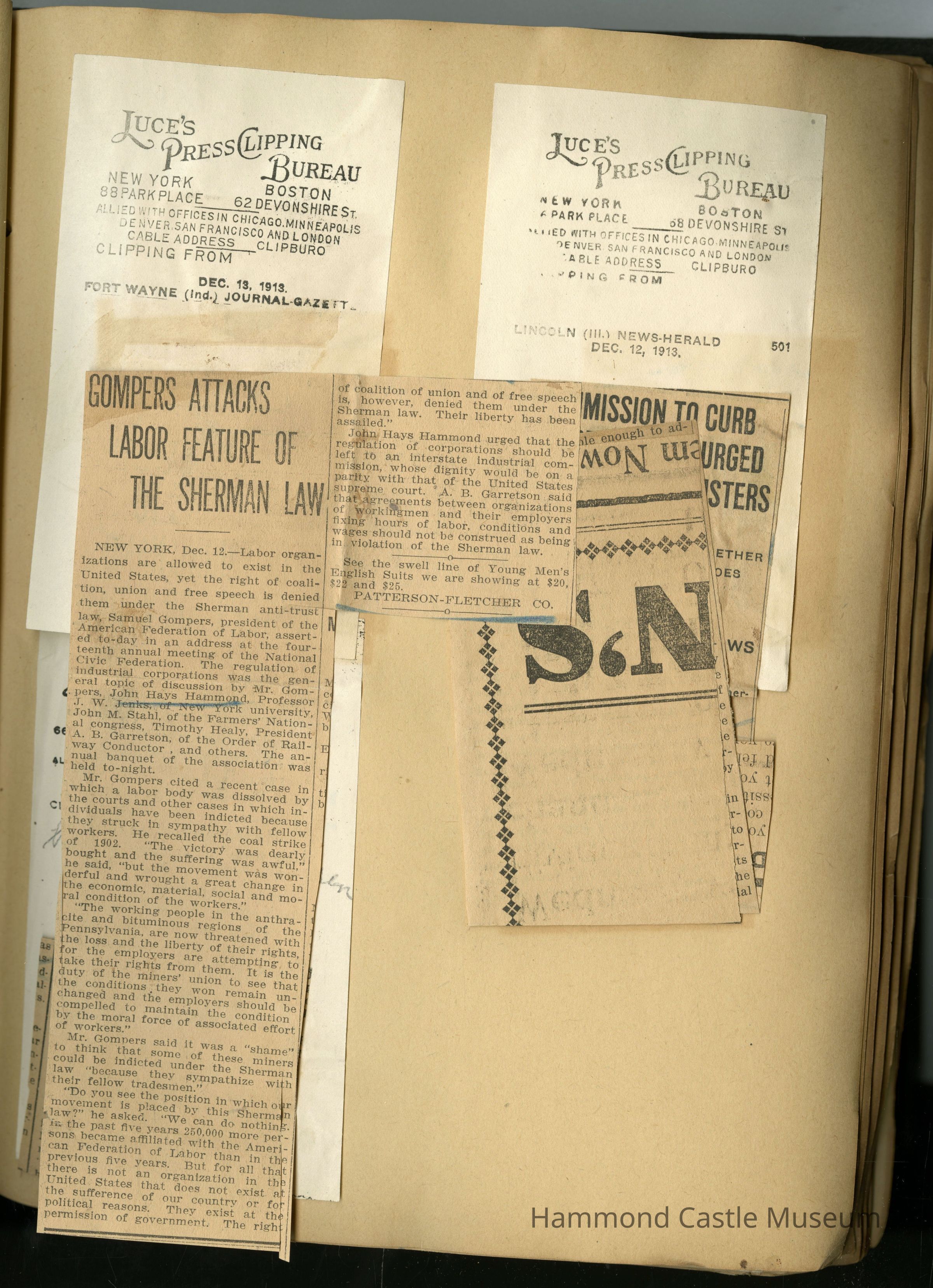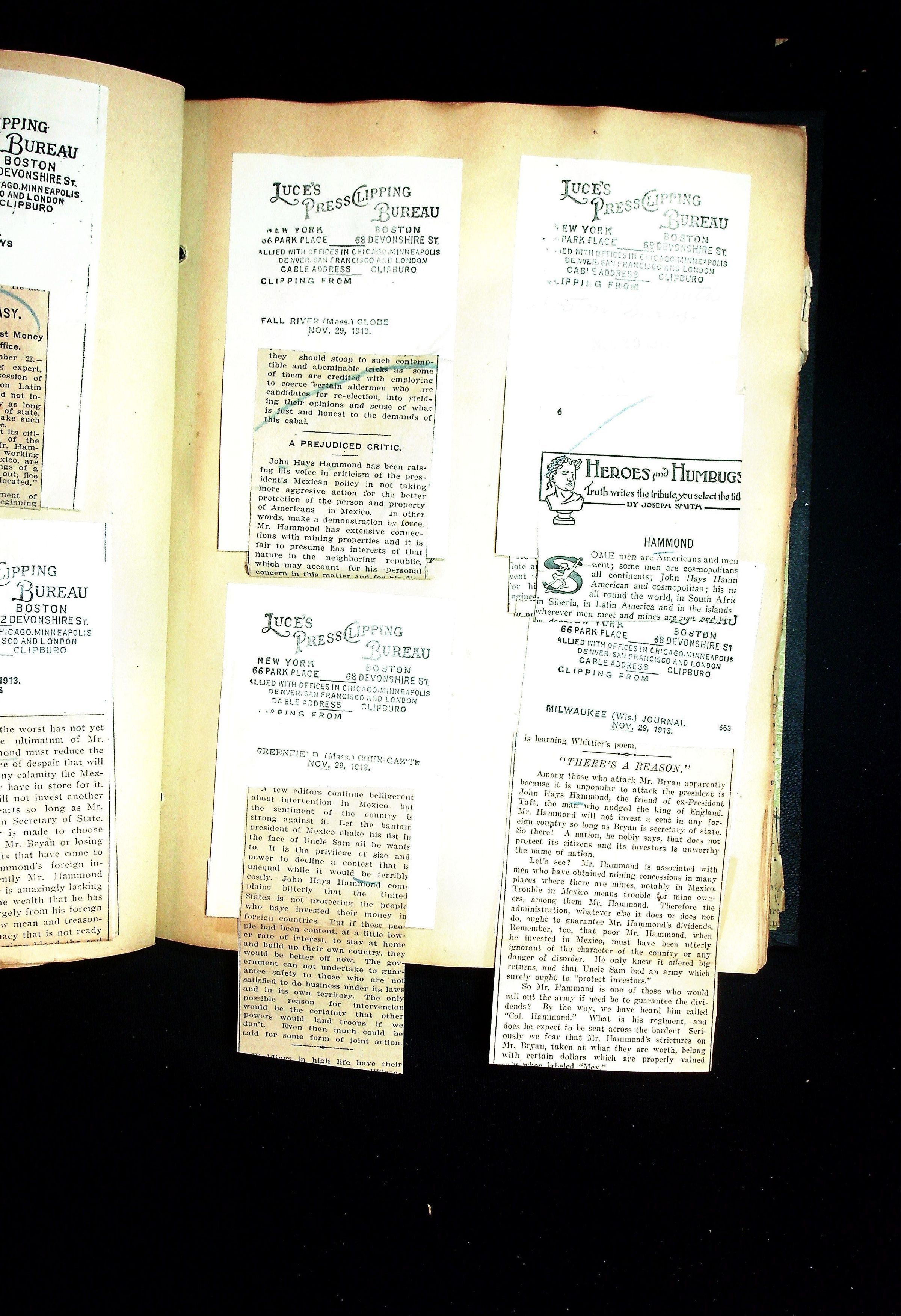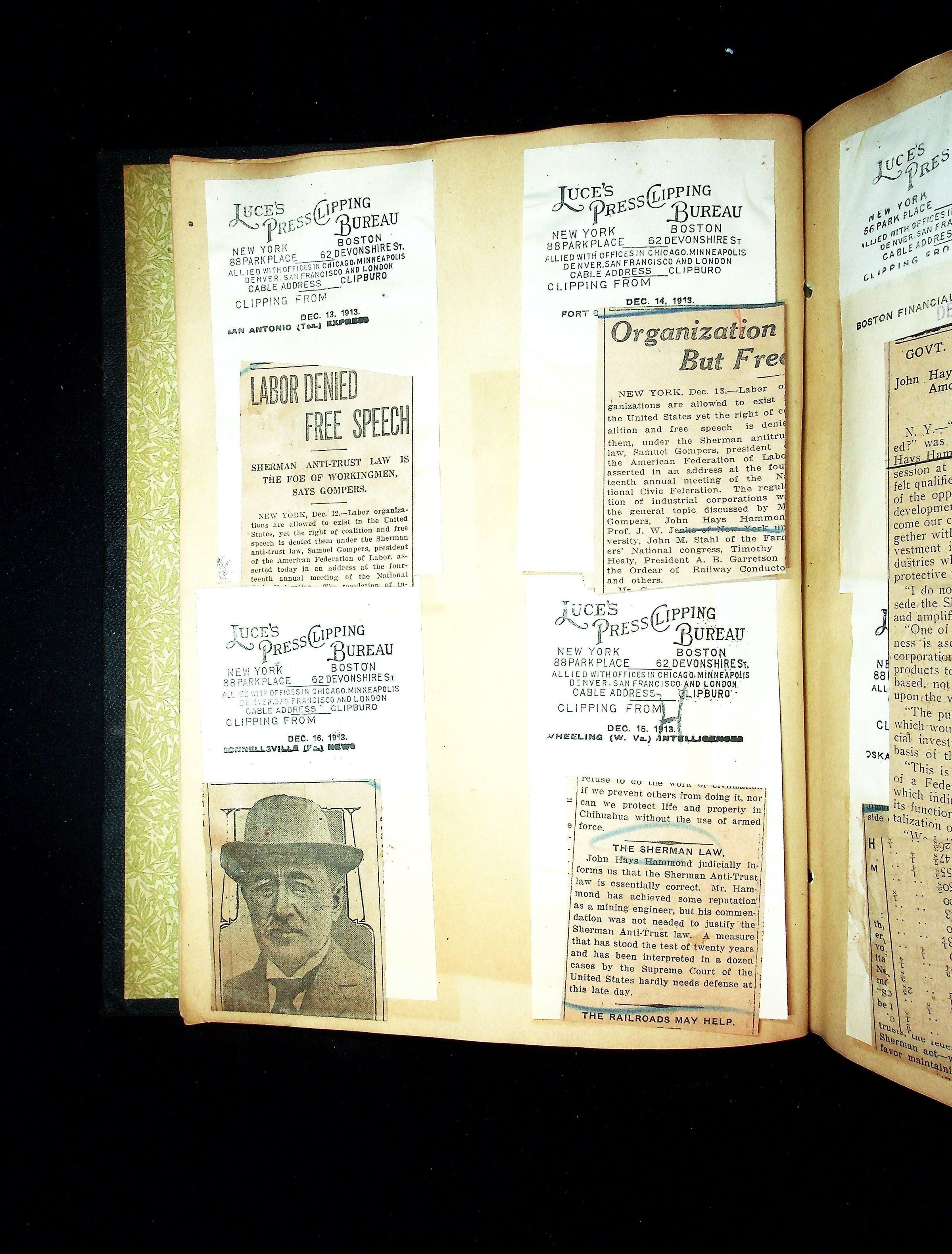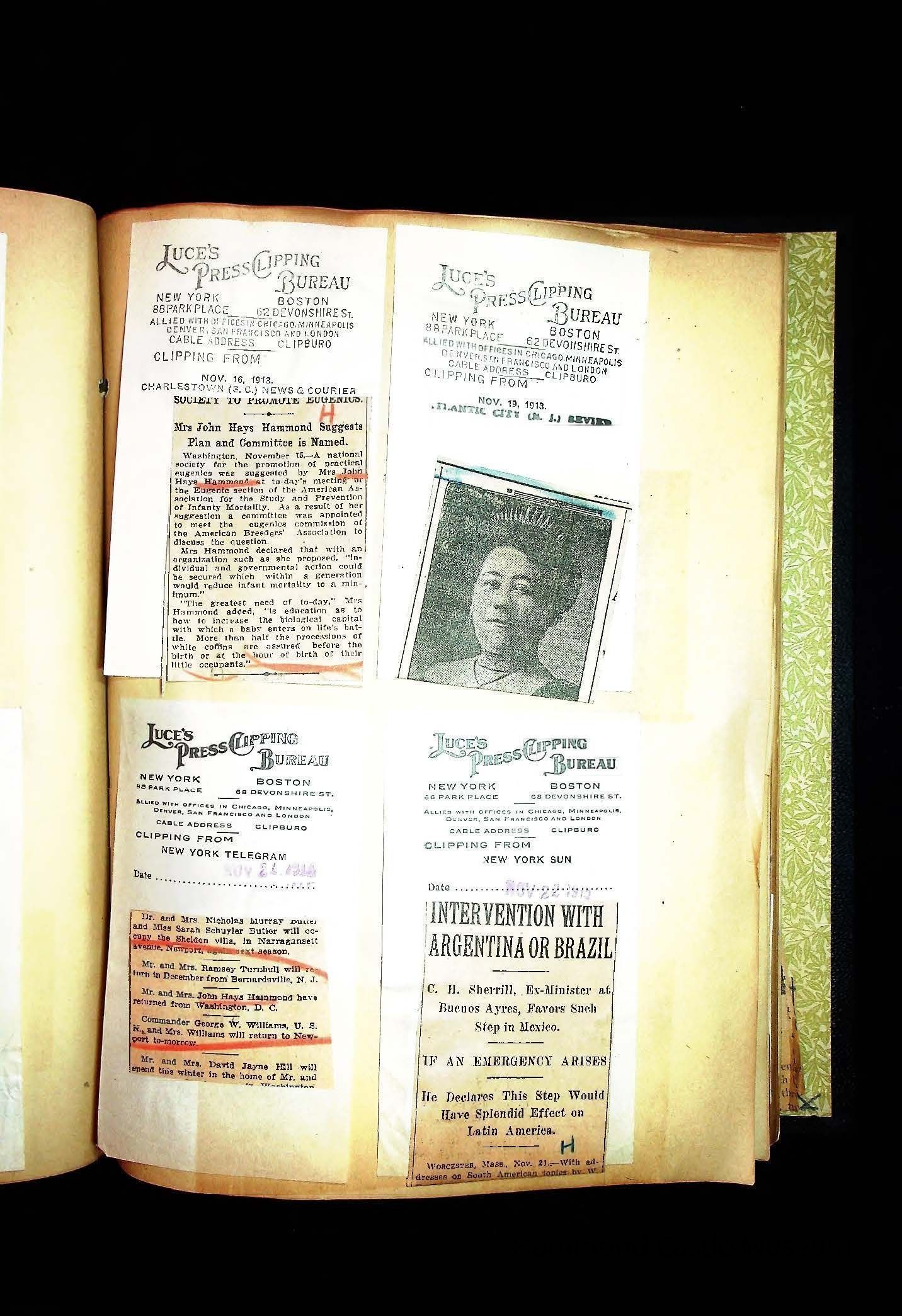 1913 scrapbook of newspaper articles about John Hays Hammond (Sr) and Mrs. Hammond covering governmental policies, Sherman Act, Eugenics & politics.