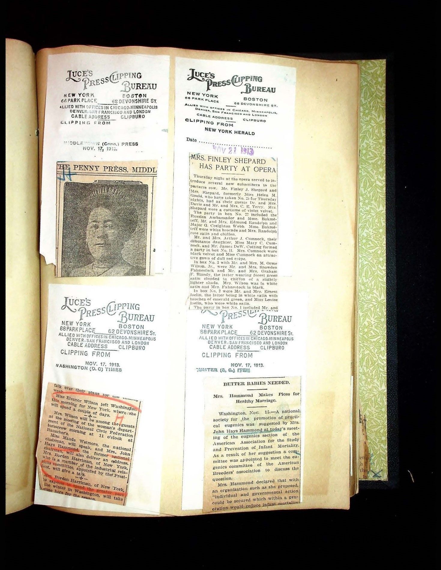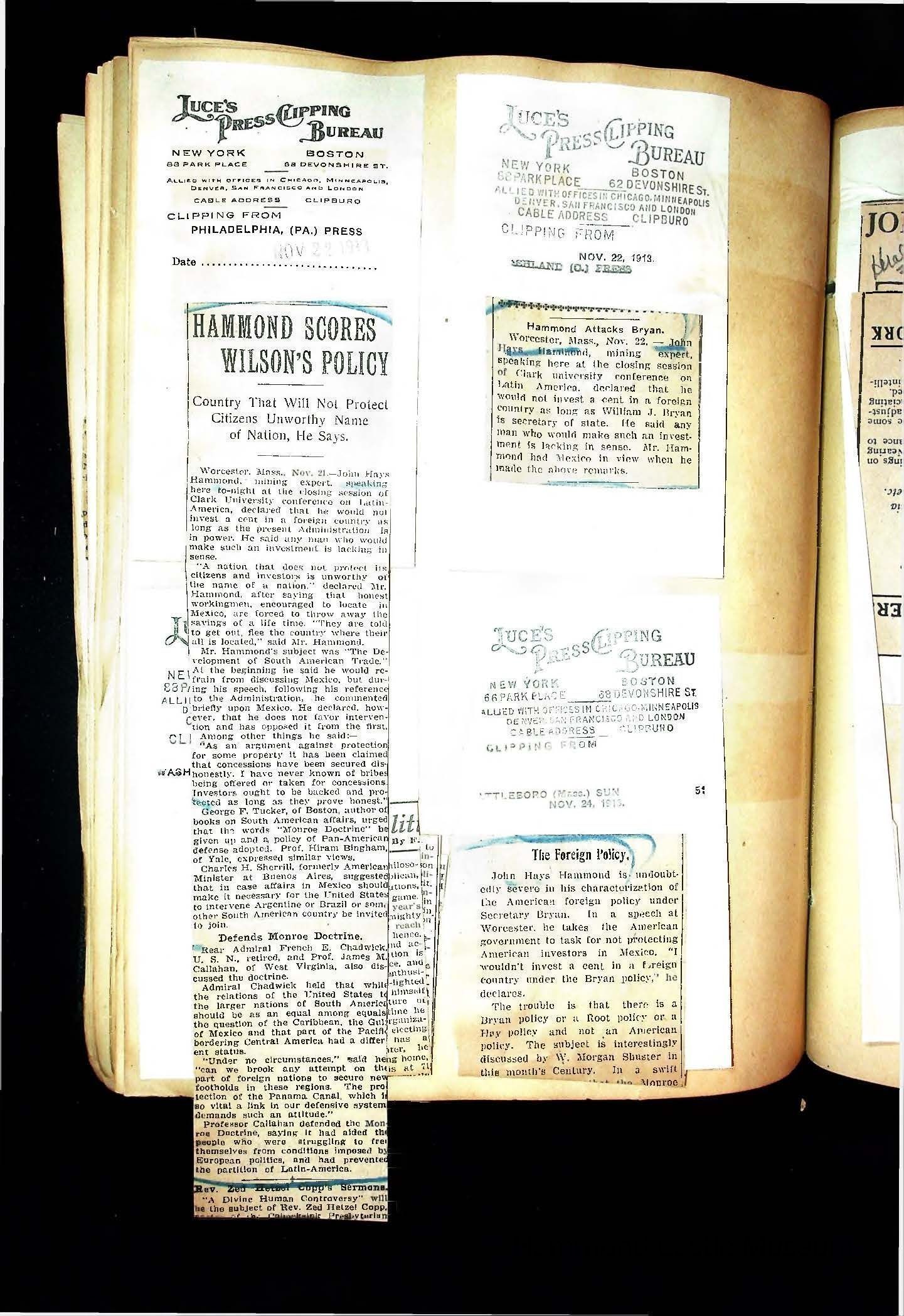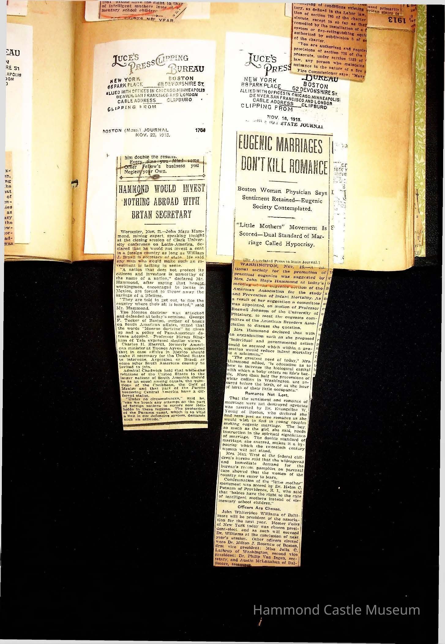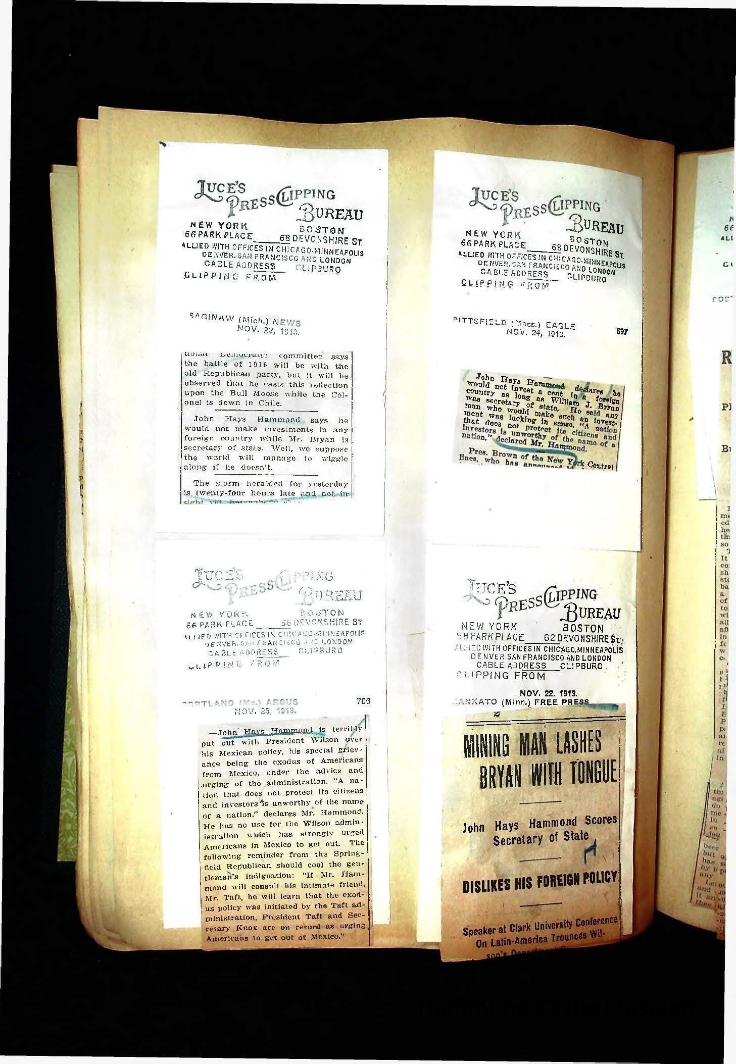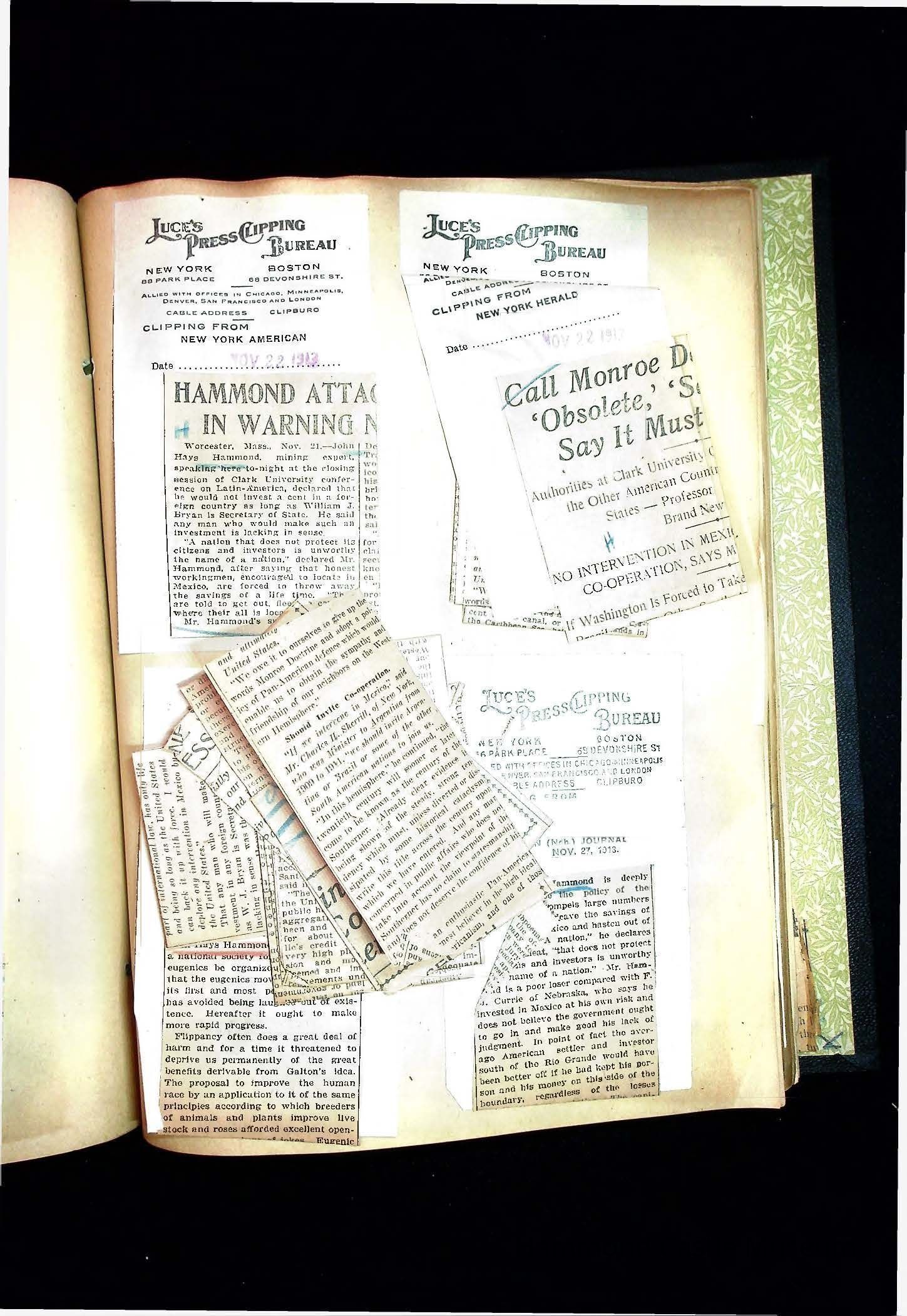 1913 scrapbook of newspaper articles about John Hays Hammond (Sr) and Mrs. Hammond covering governmental policies, Sherman Act, Eugenics & politics.