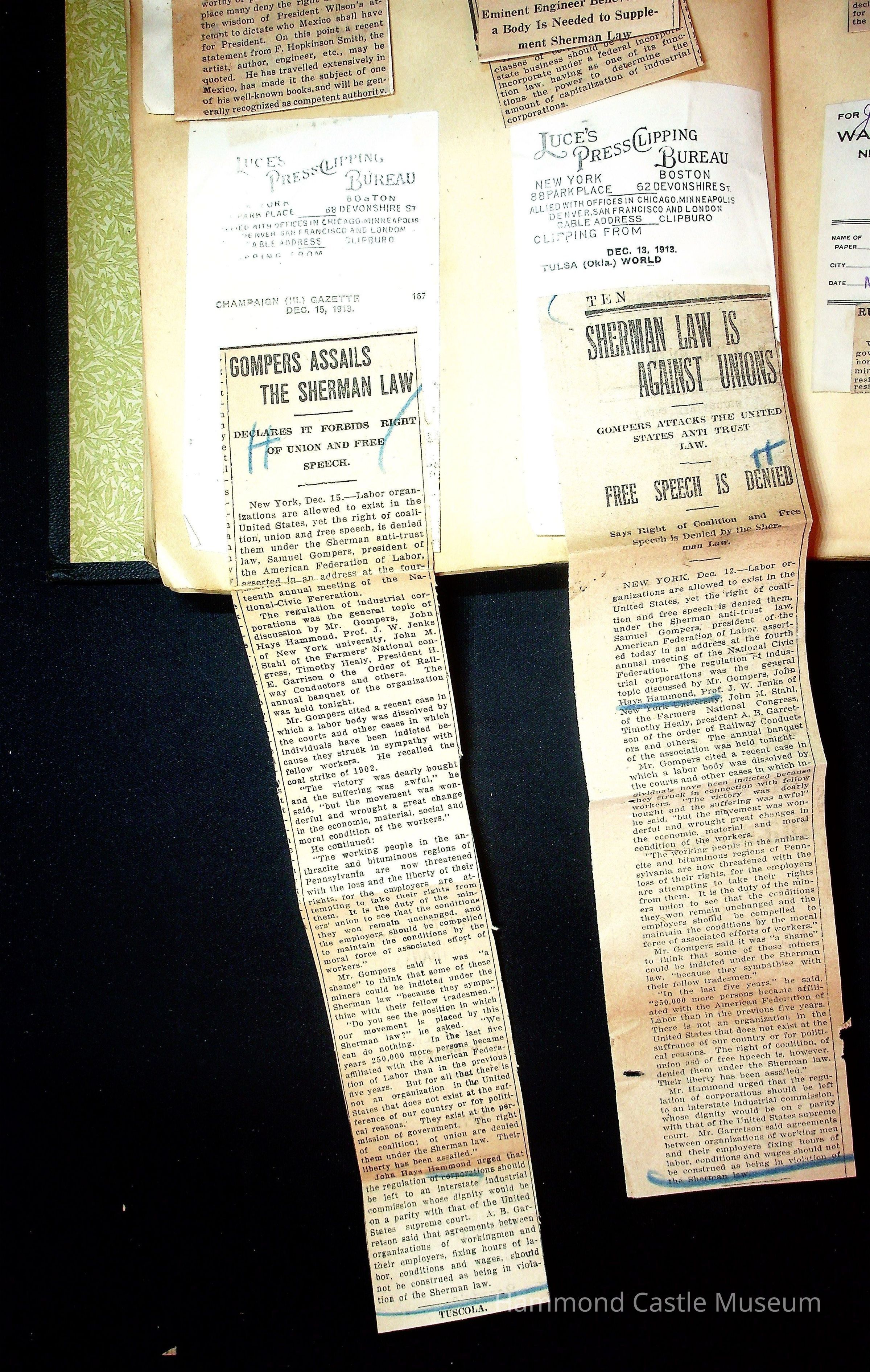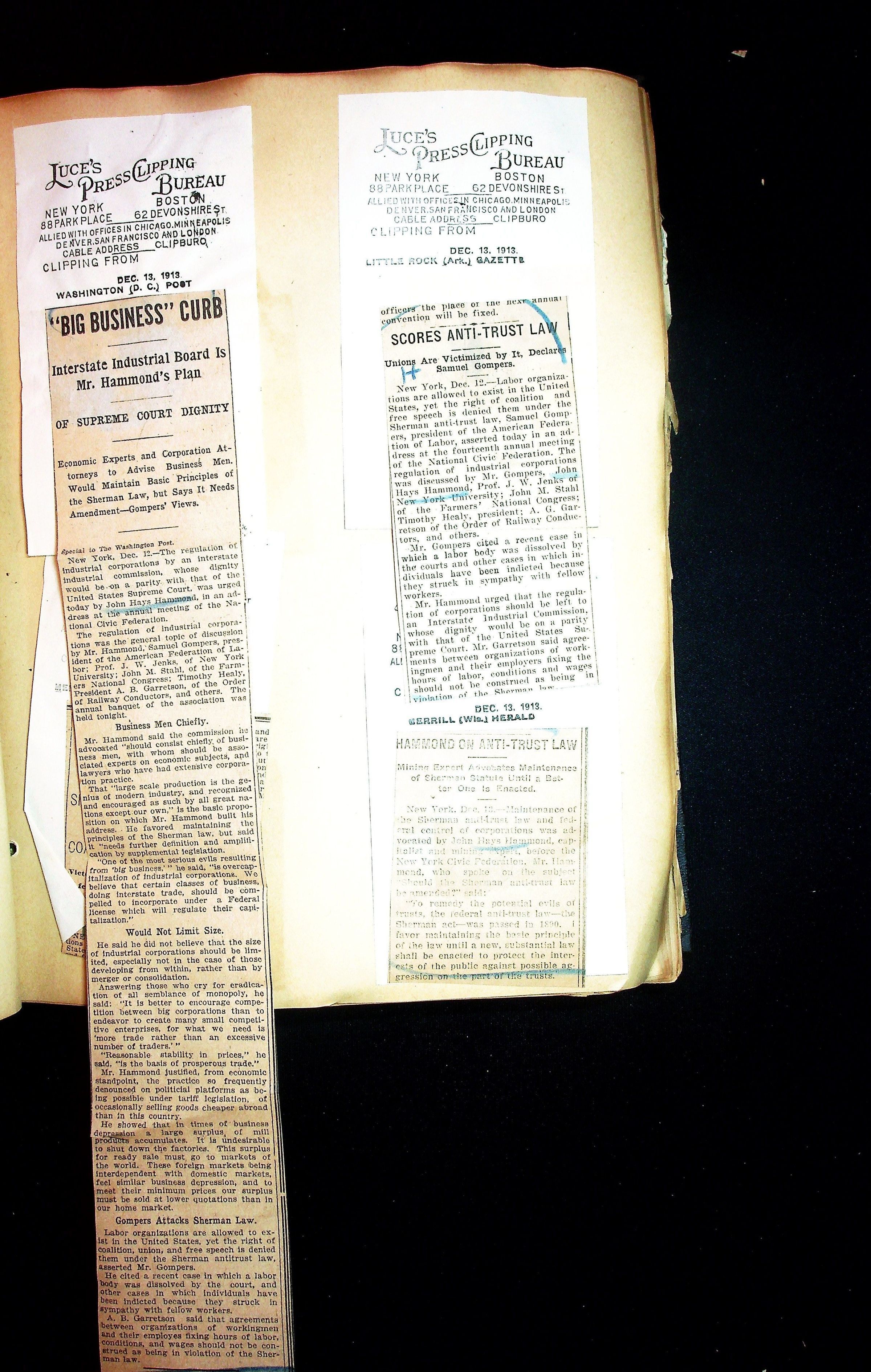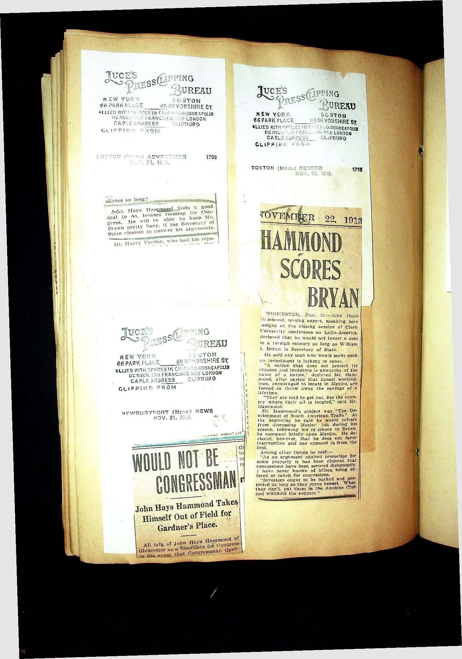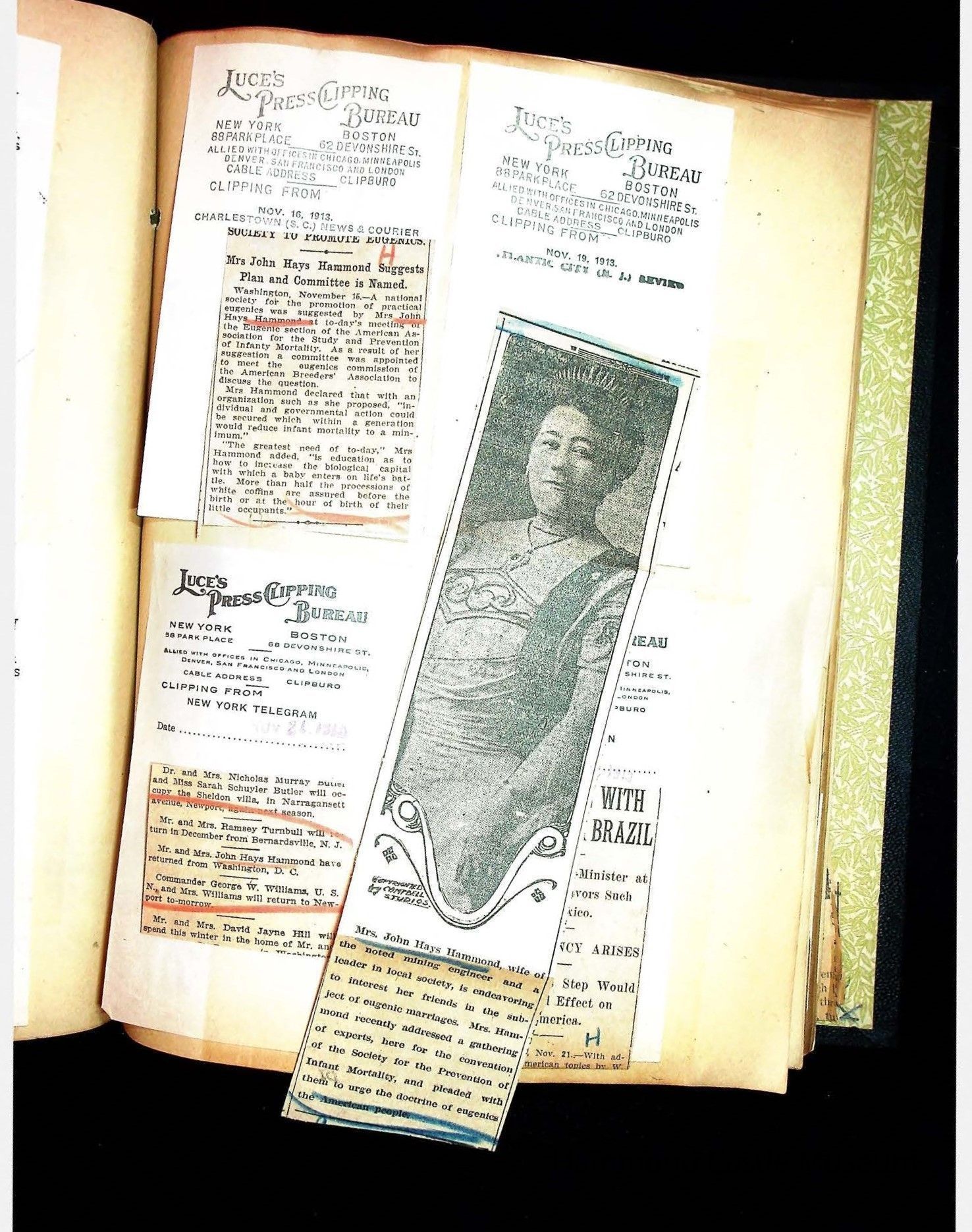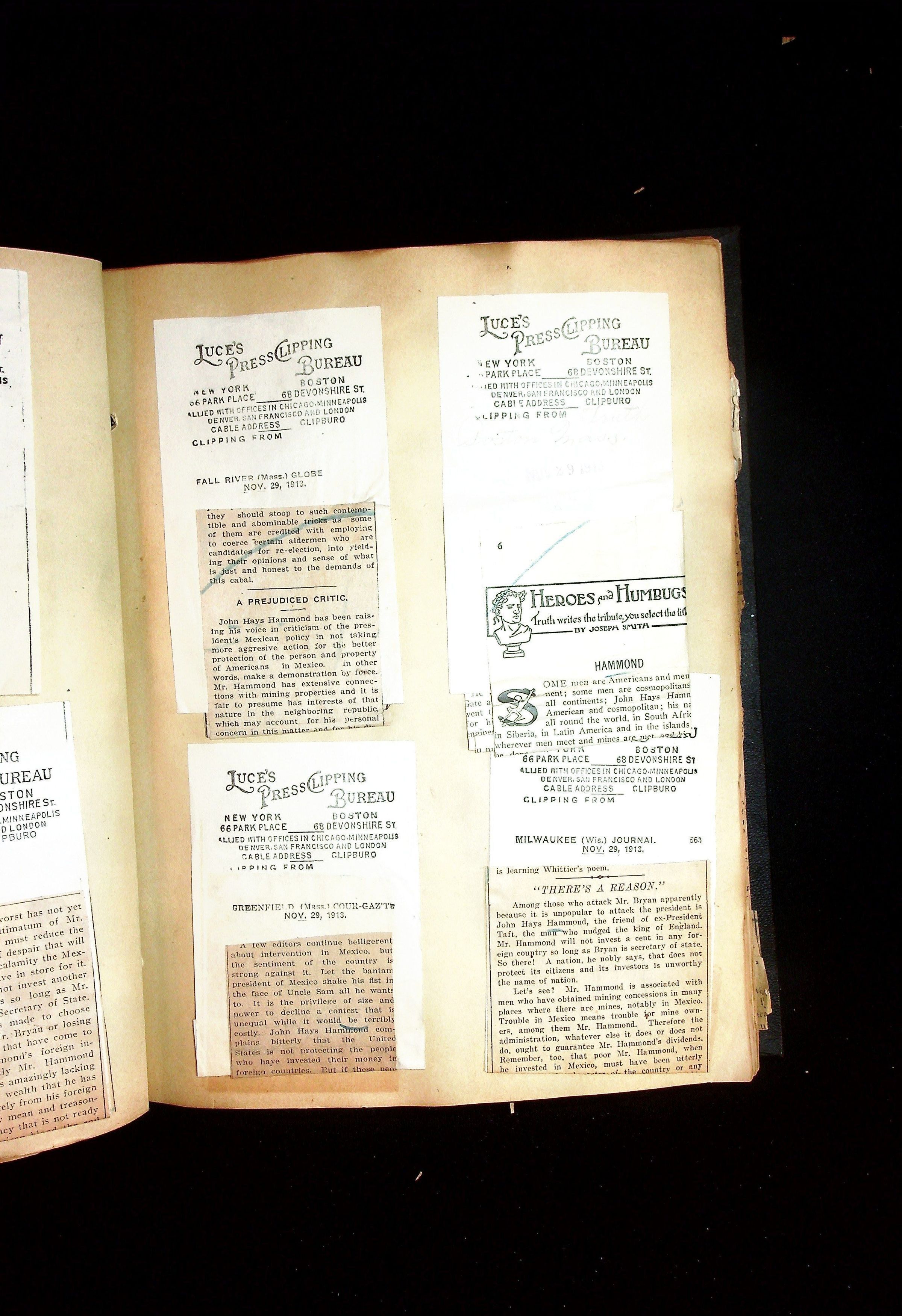 1913 scrapbook of newspaper articles about John Hays Hammond (Sr) and Mrs. Hammond covering governmental policies, Sherman Act, Eugenics & politics.
