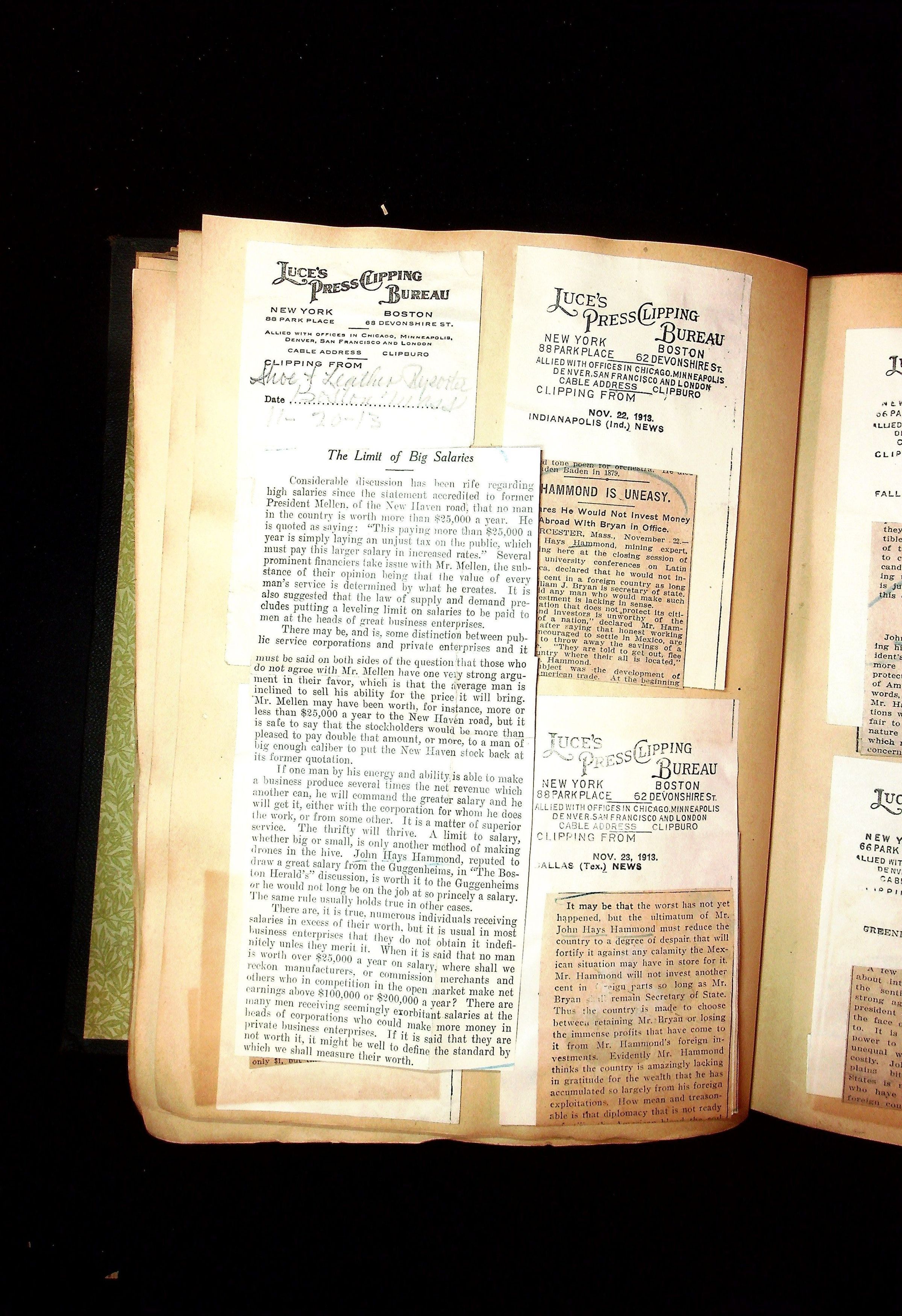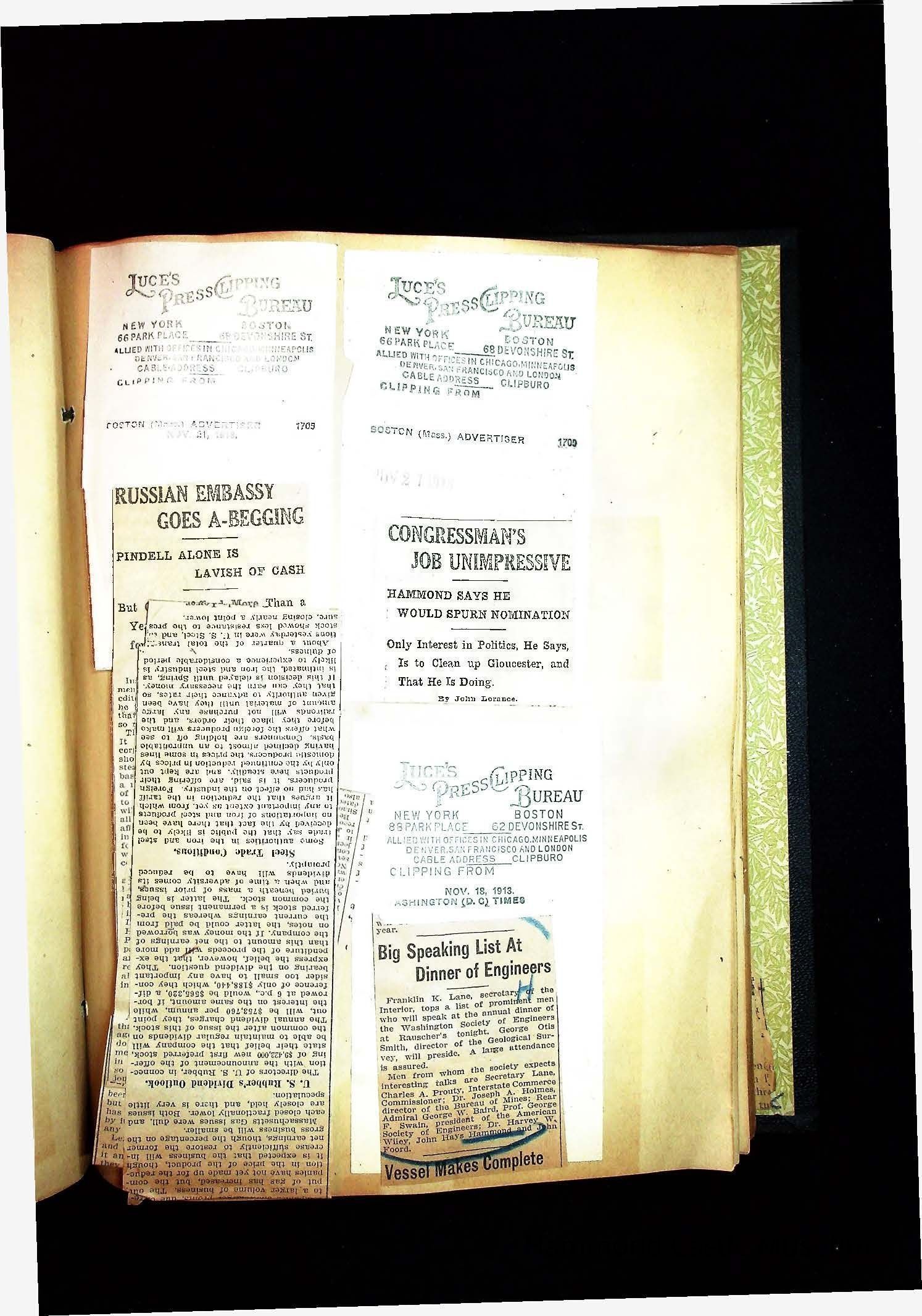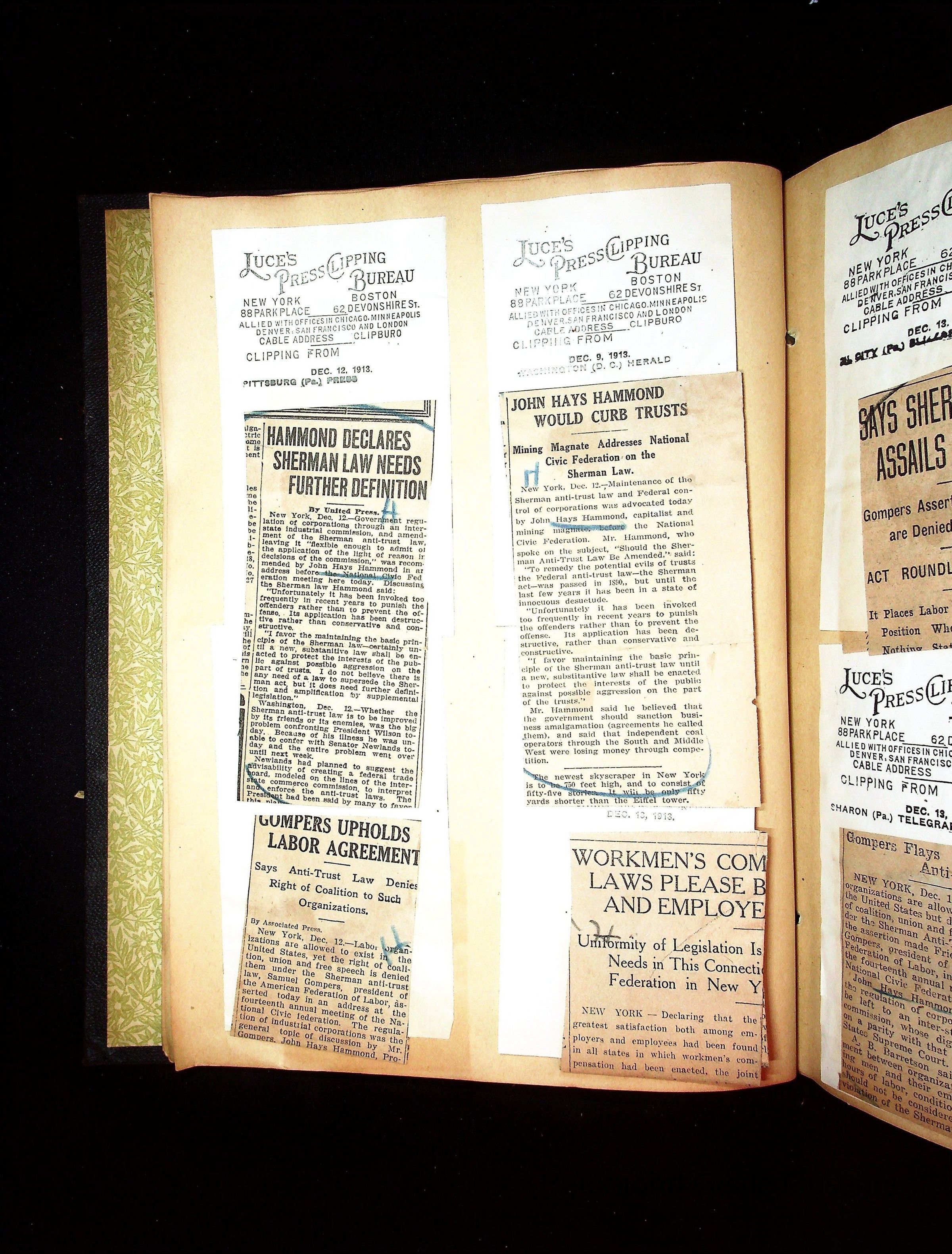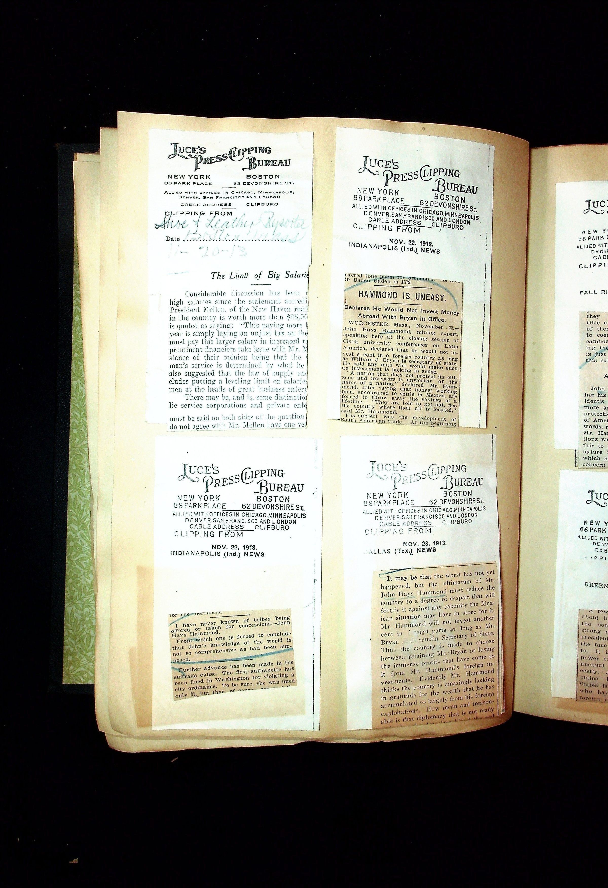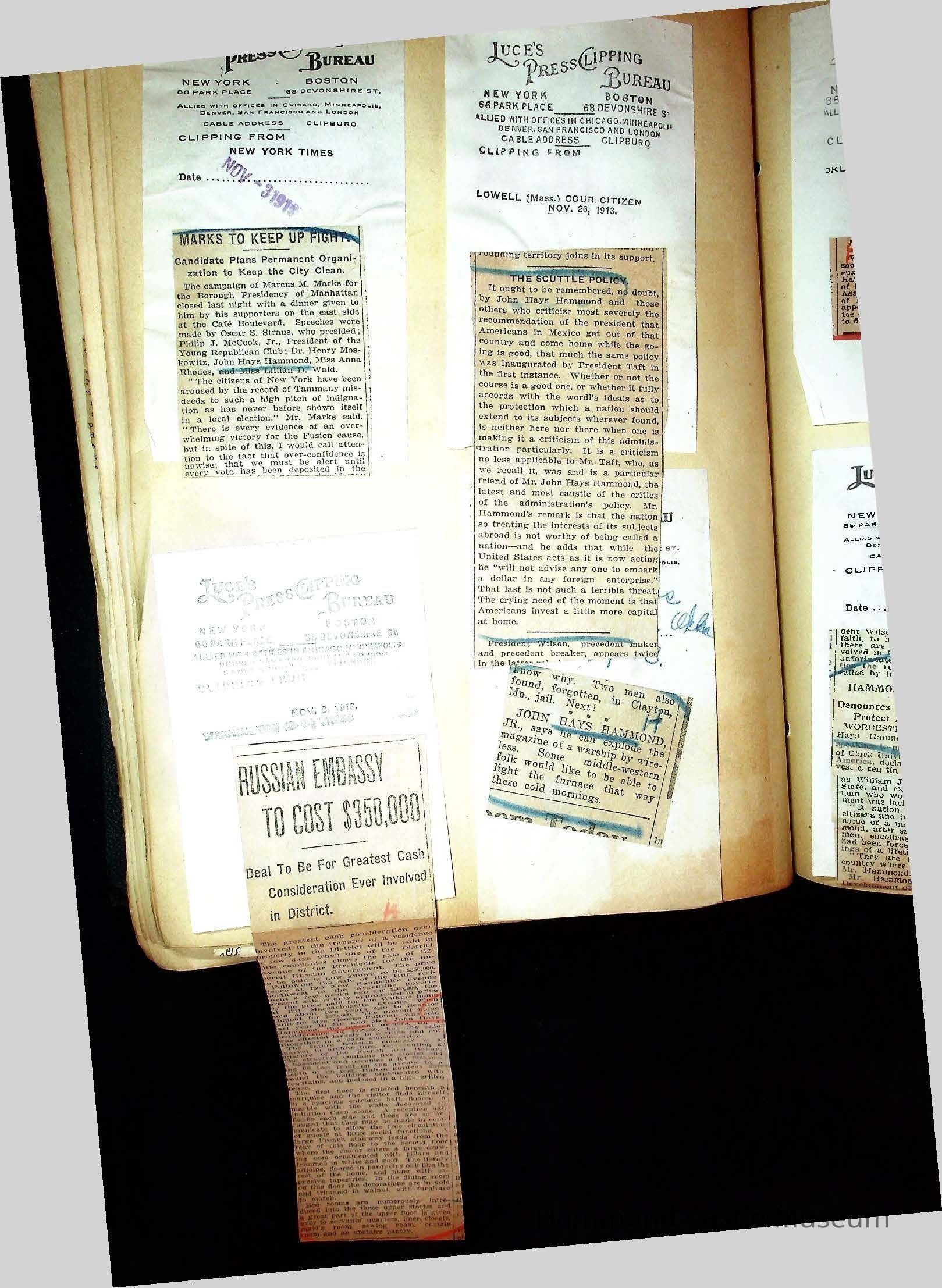 1913 scrapbook of newspaper articles about John Hays Hammond (Sr) and Mrs. Hammond covering governmental policies, Sherman Act, Eugenics & politics.