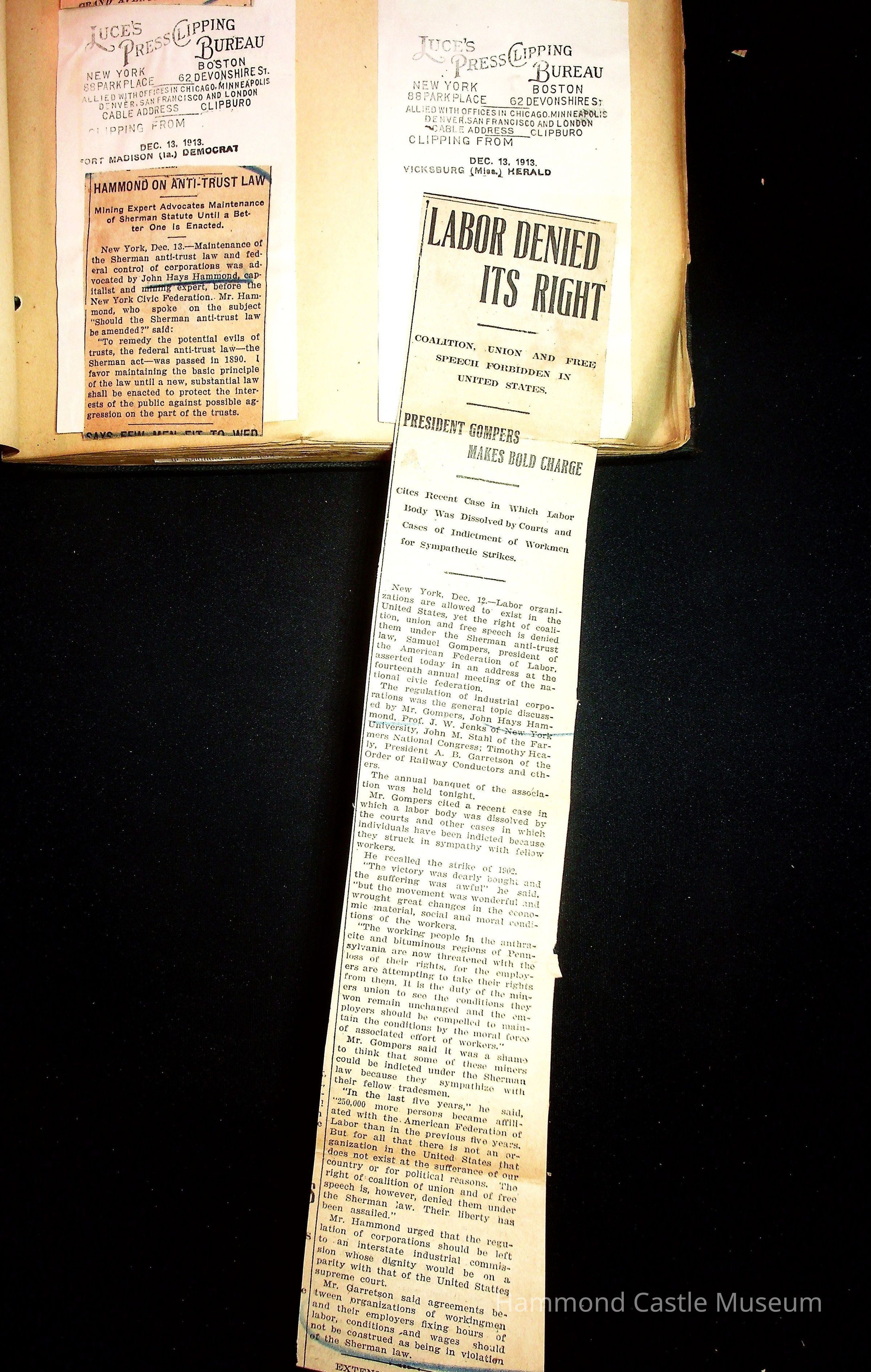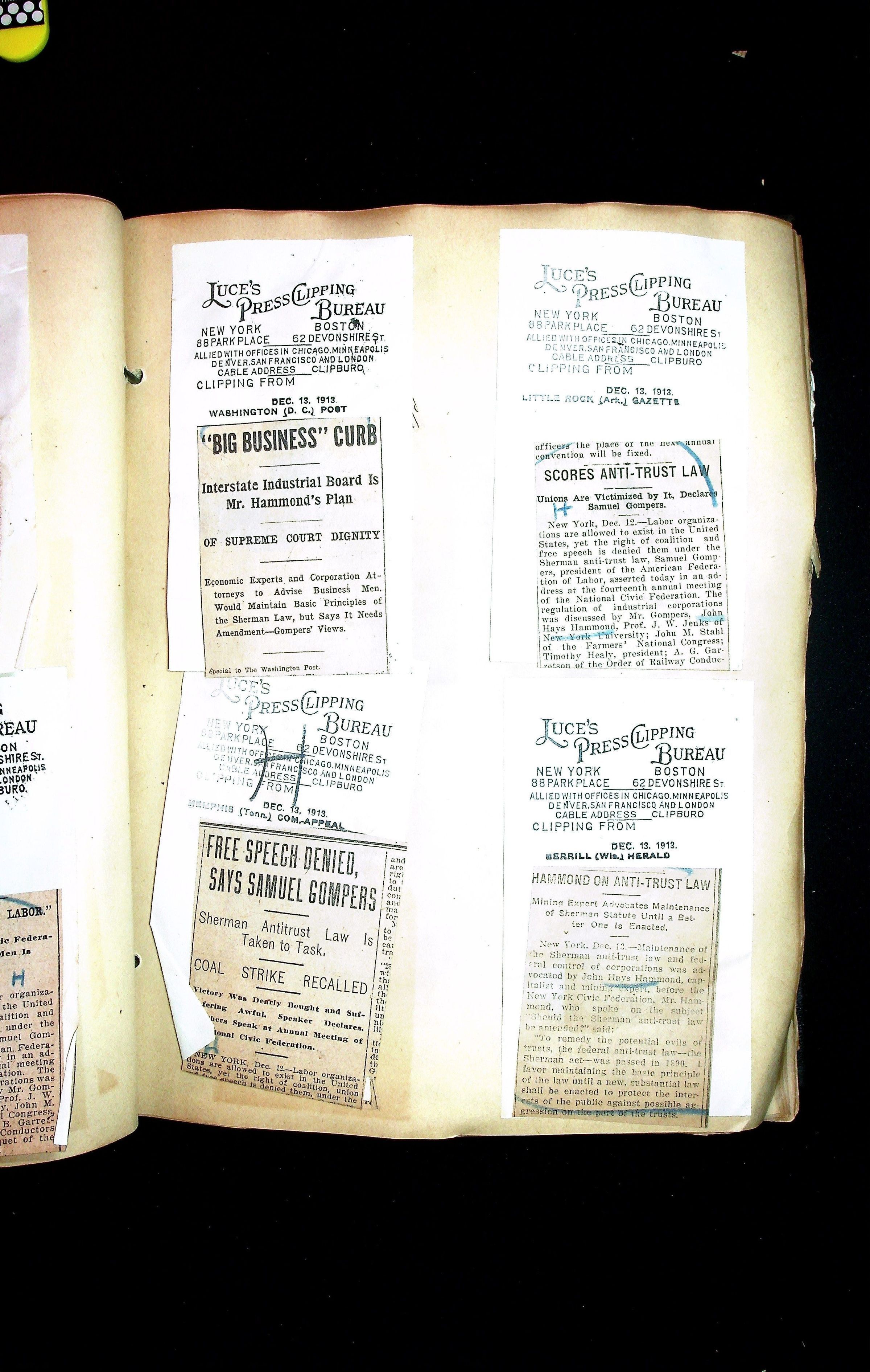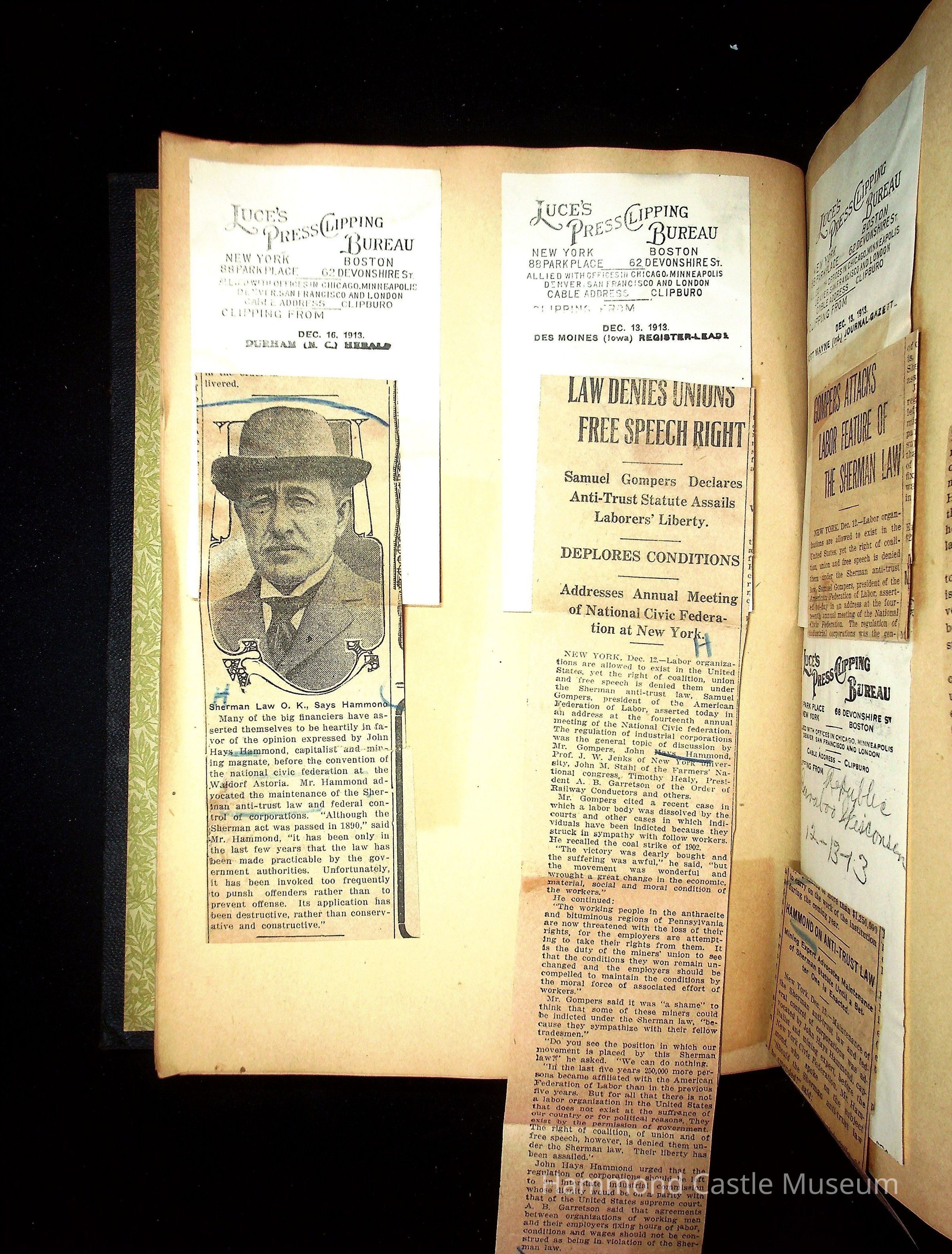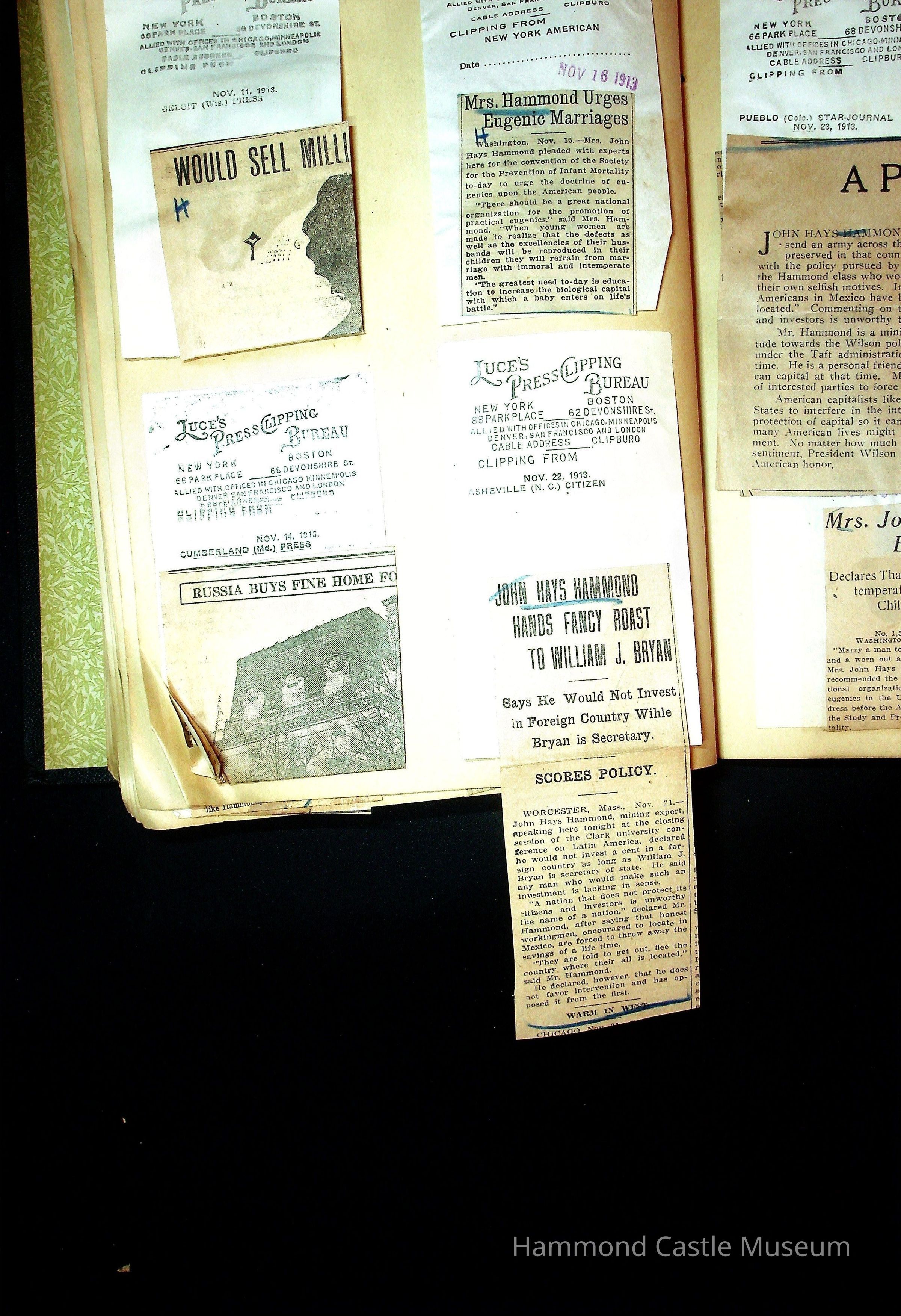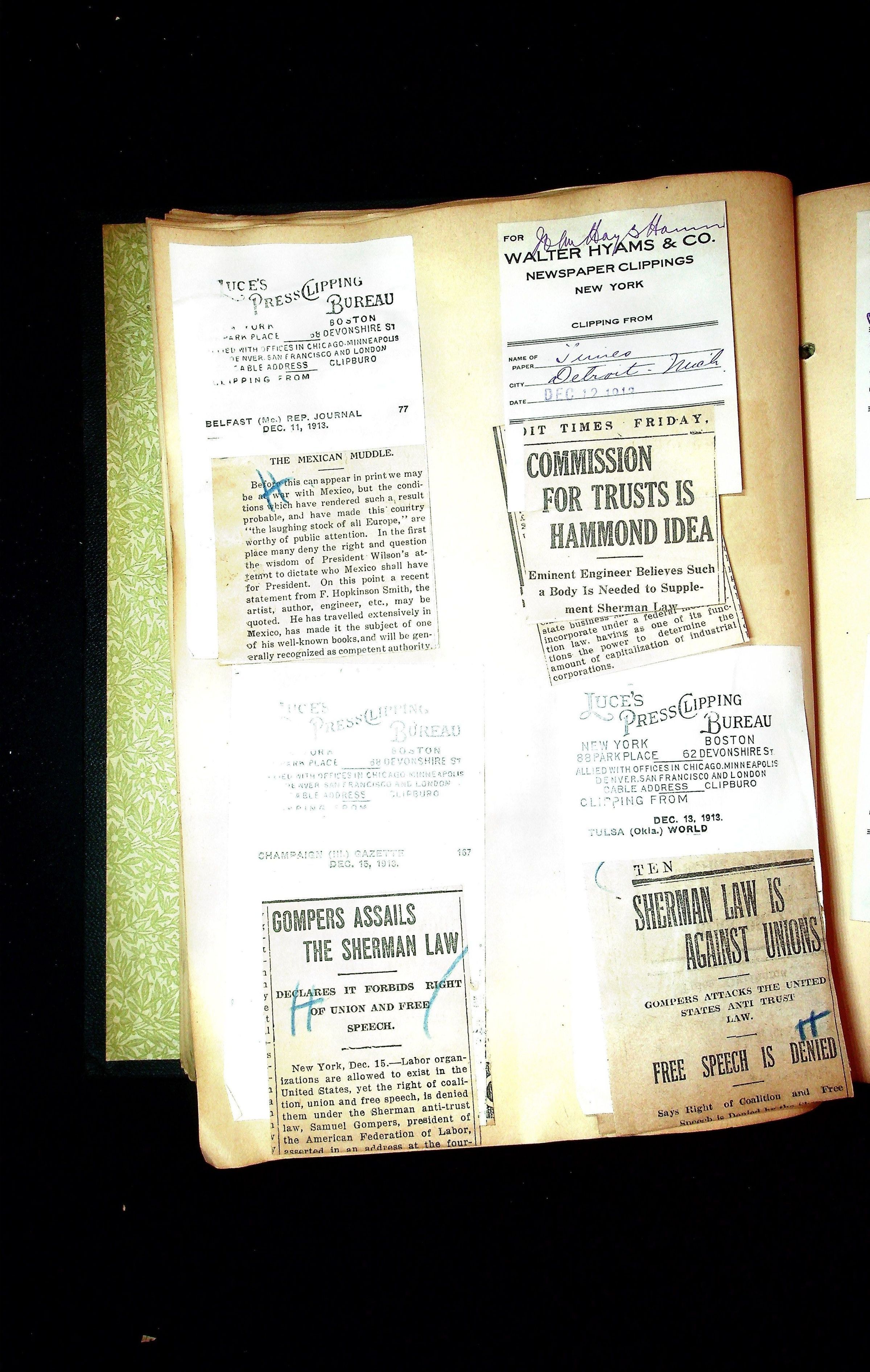 1913 scrapbook of newspaper articles about John Hays Hammond (Sr) and Mrs. Hammond covering governmental policies, Sherman Act, Eugenics & politics.