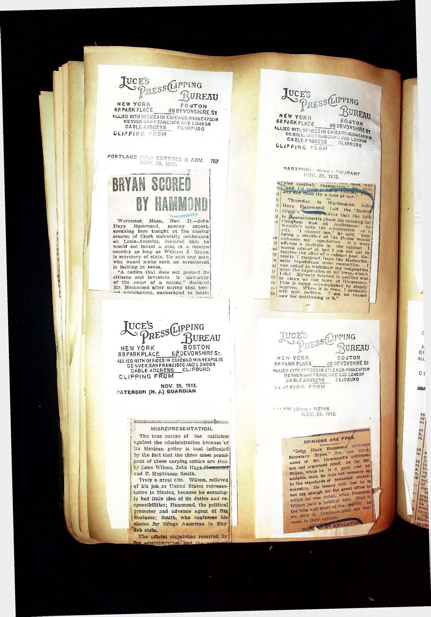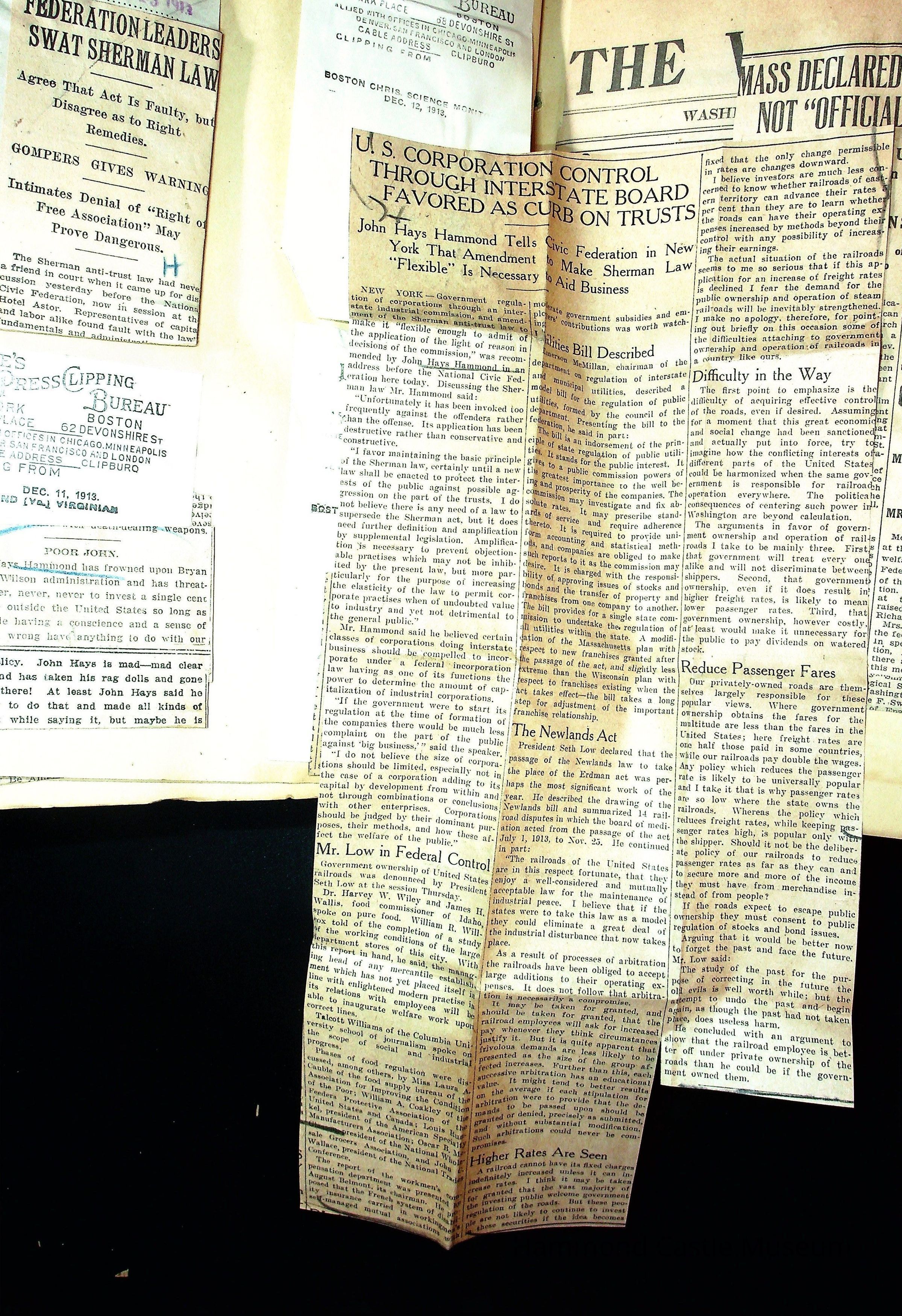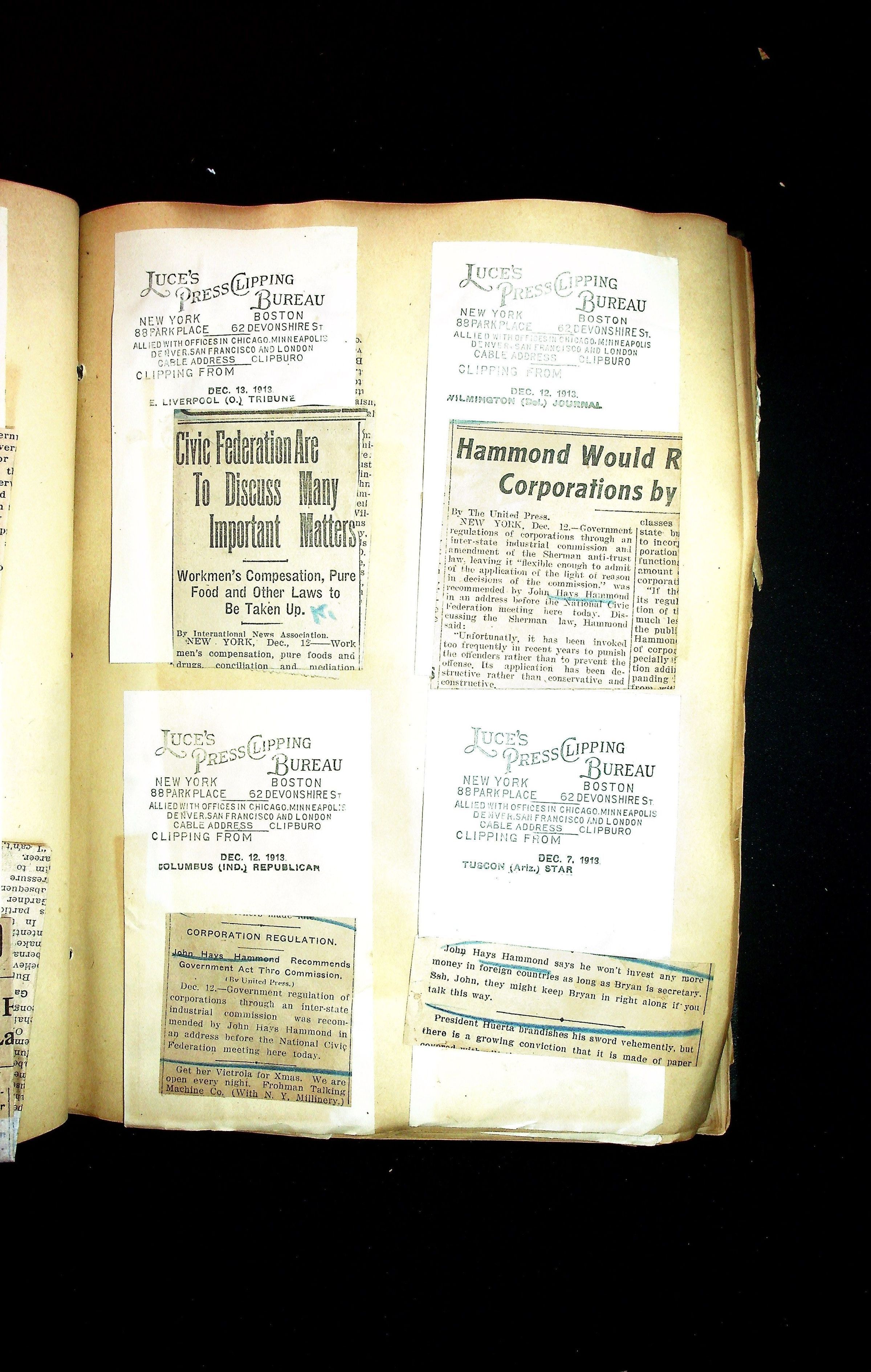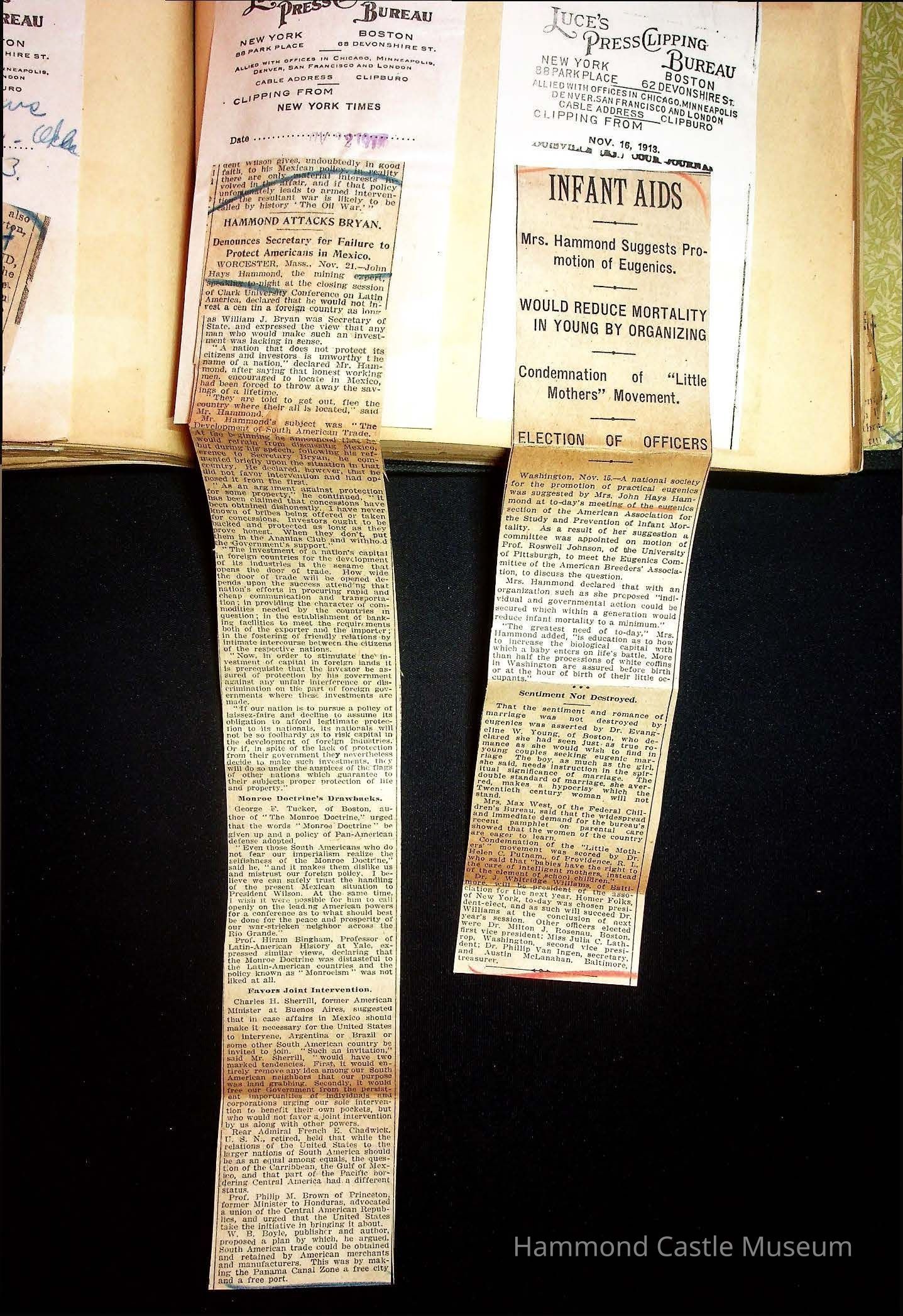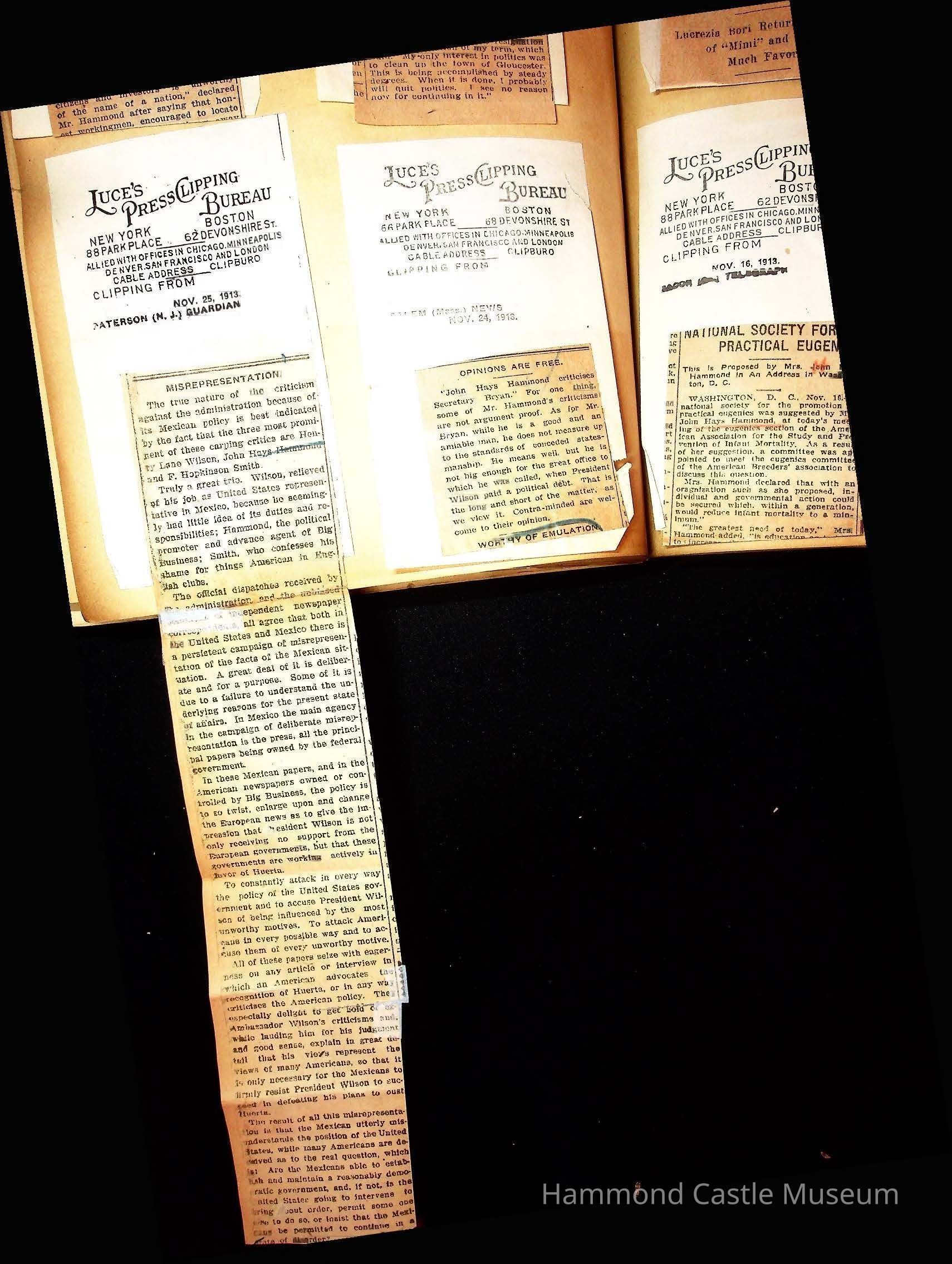 1913 scrapbook of newspaper articles about John Hays Hammond (Sr) and Mrs. Hammond covering governmental policies, Sherman Act, Eugenics & politics.