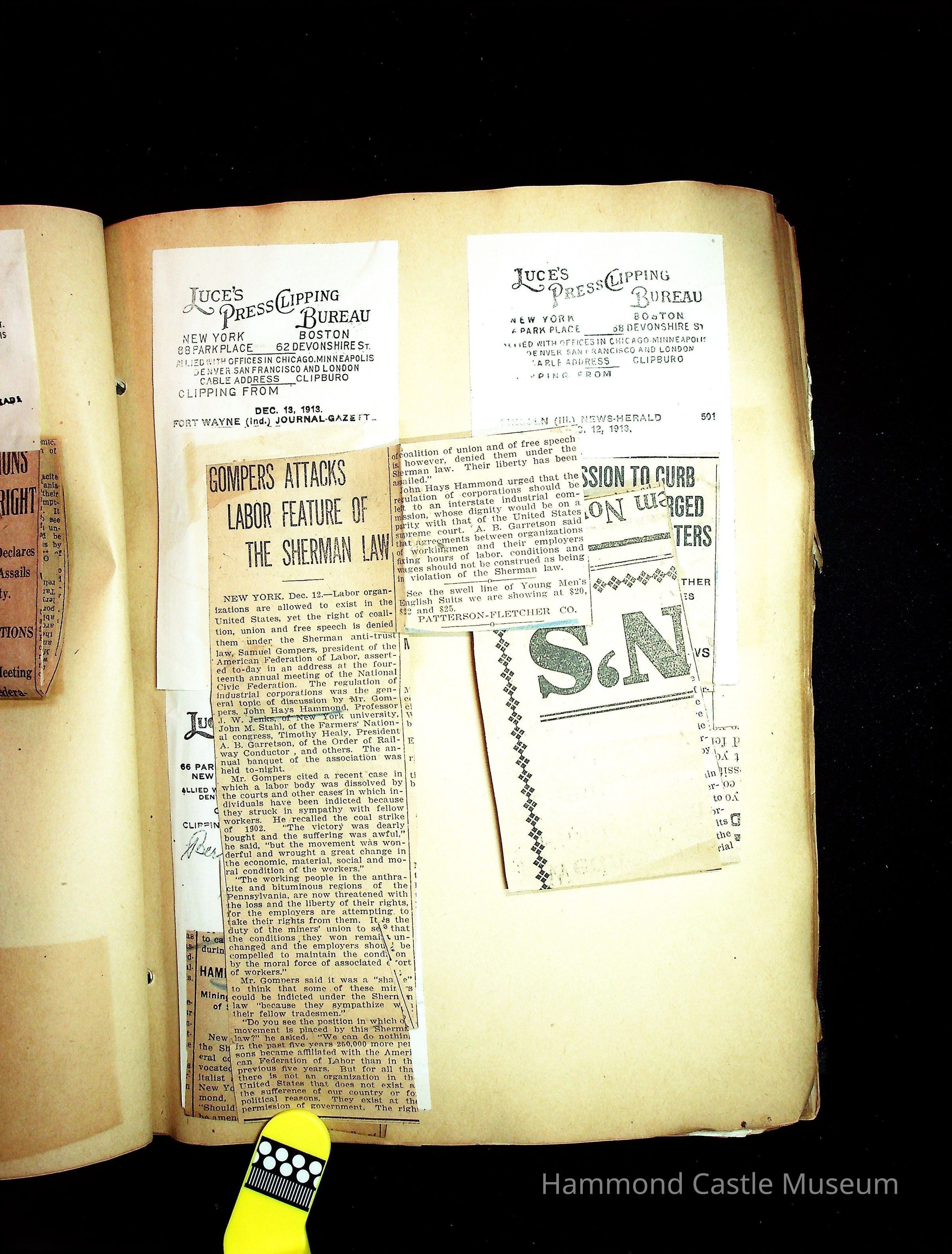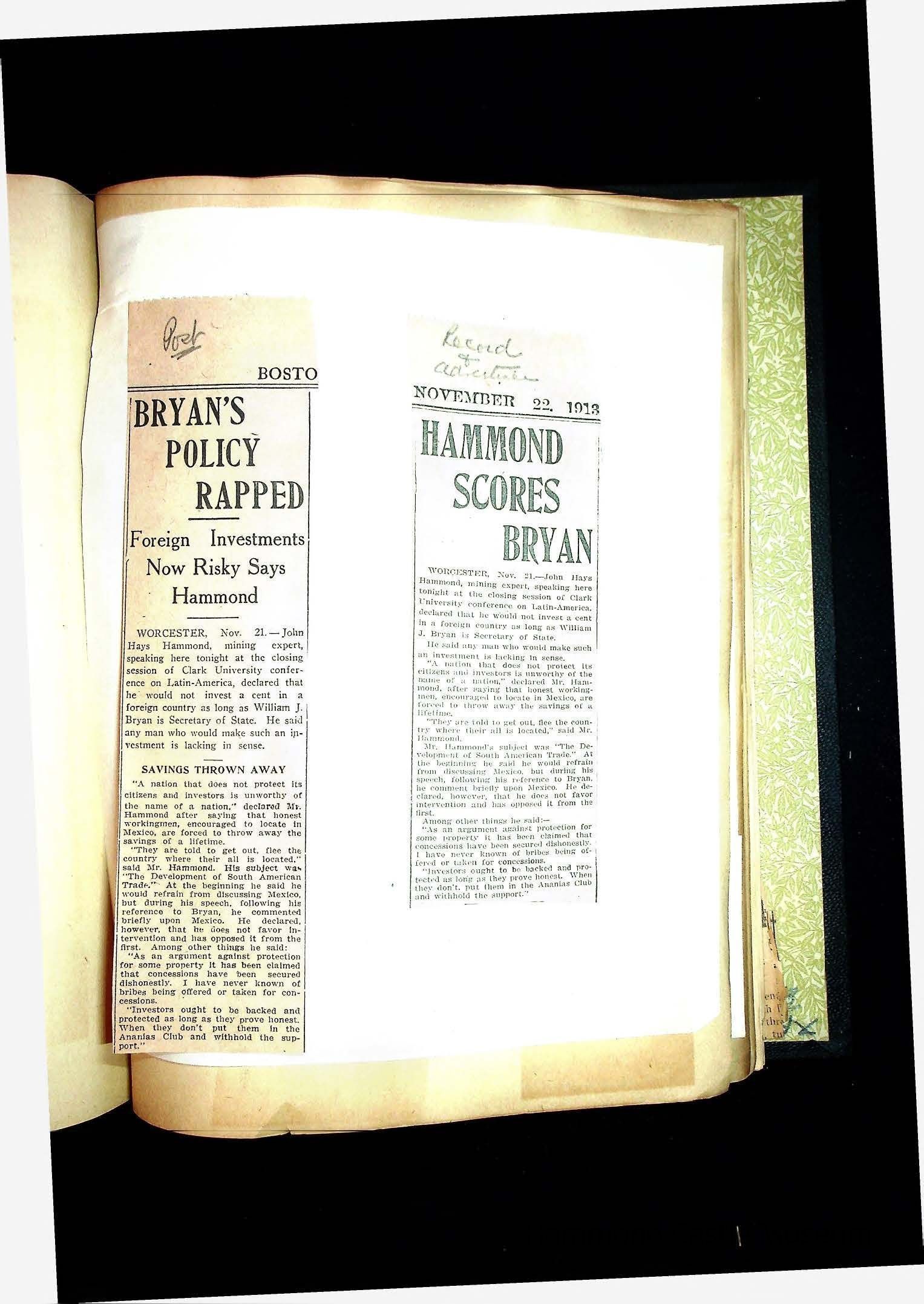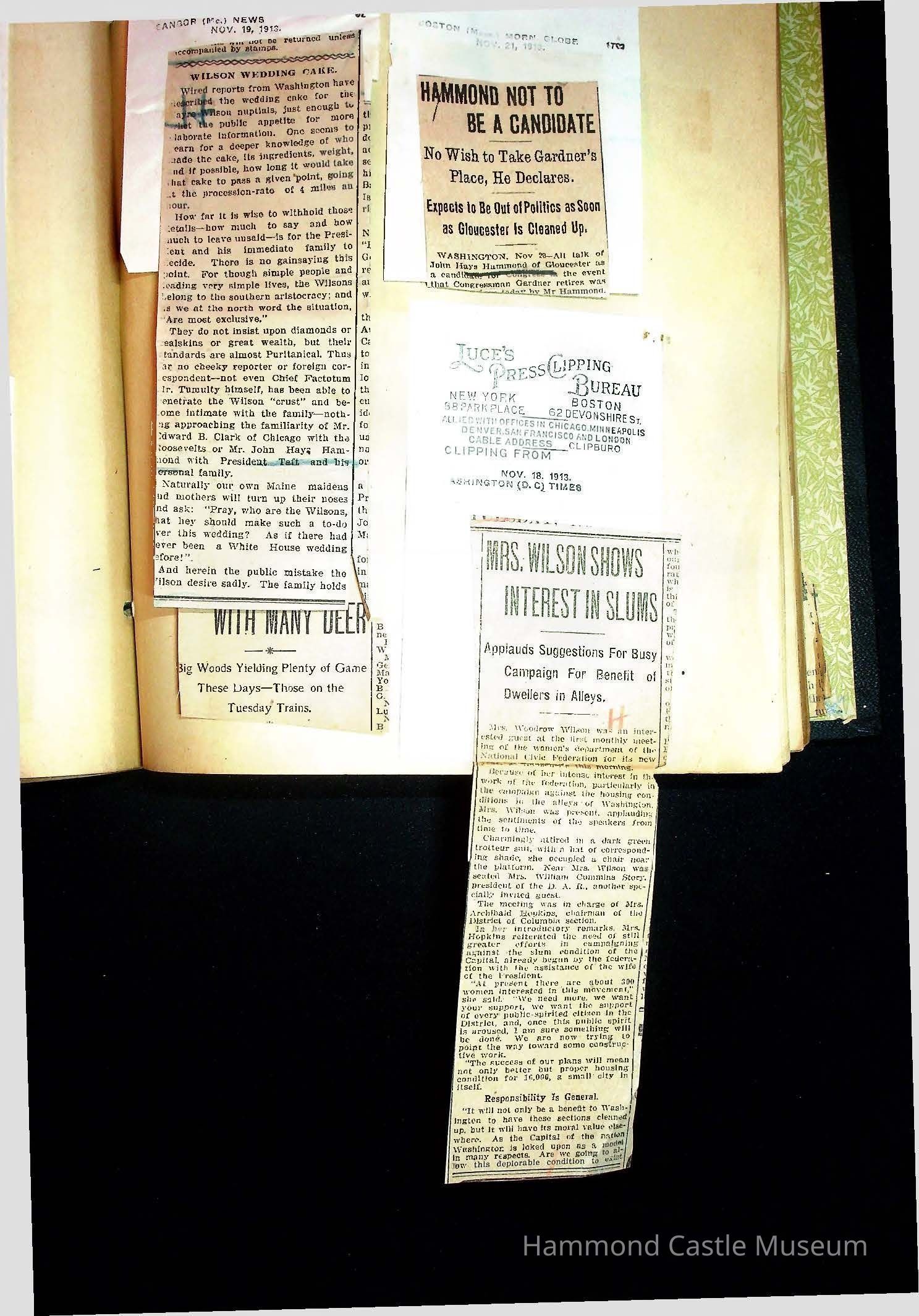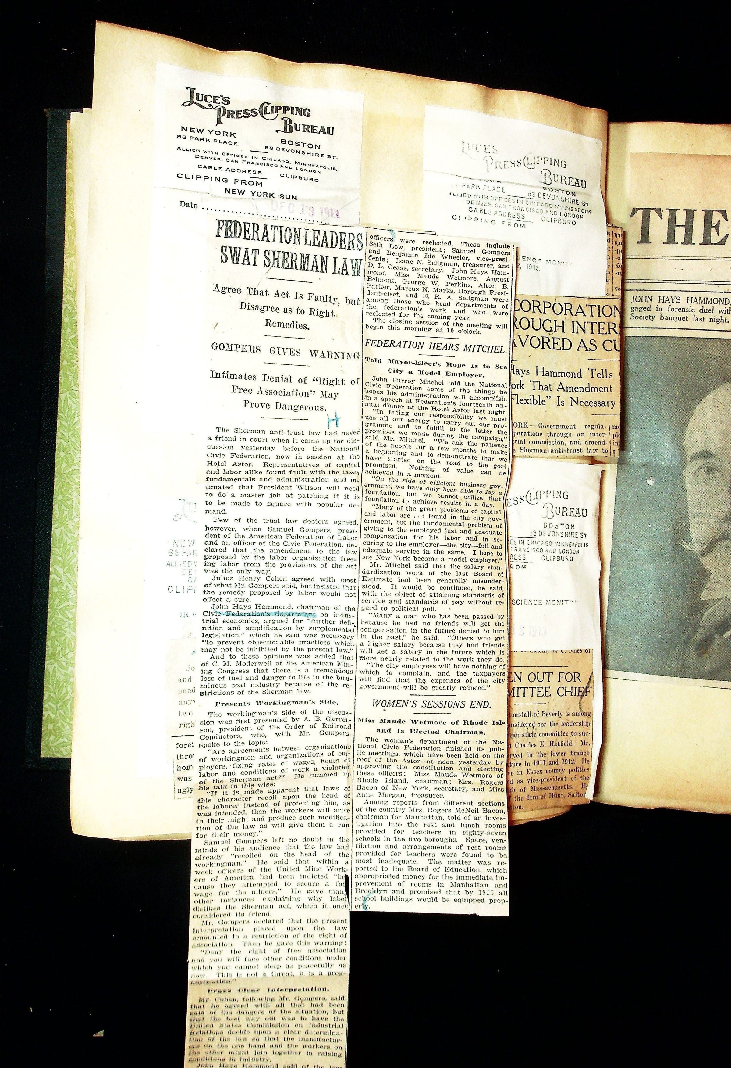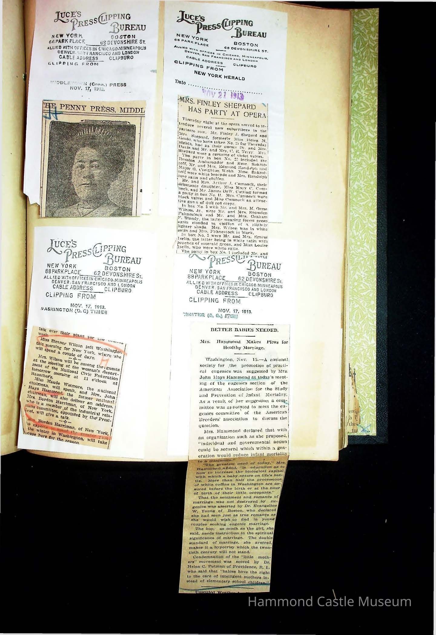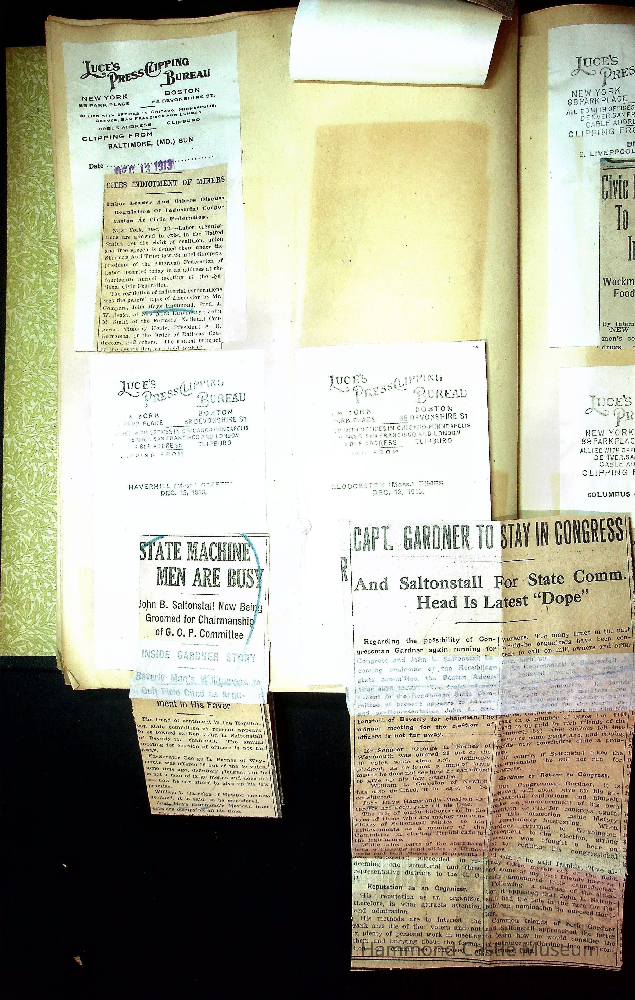 1913 scrapbook of newspaper articles about John Hays Hammond (Sr) and Mrs. Hammond covering governmental policies, Sherman Act, Eugenics & politics.