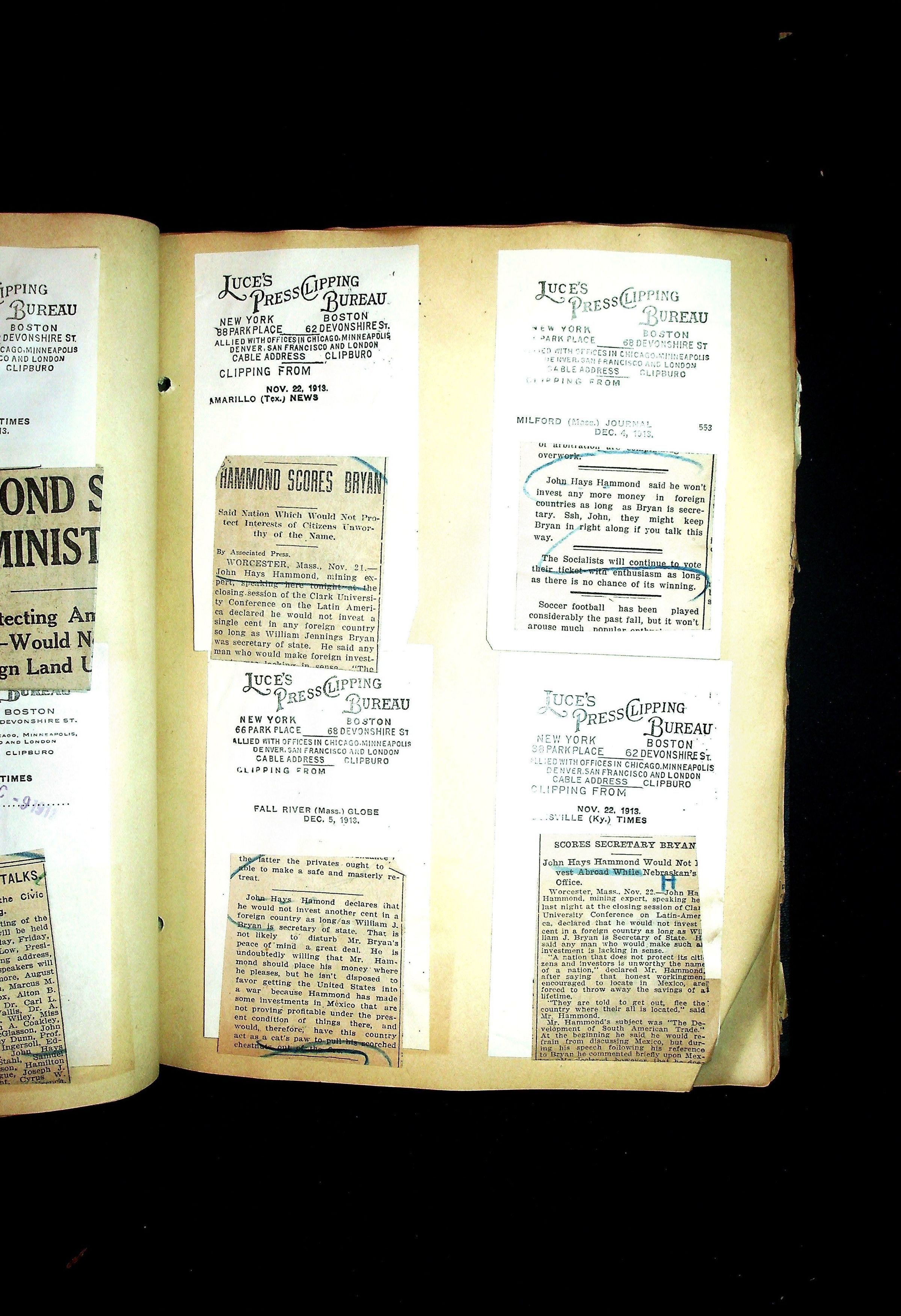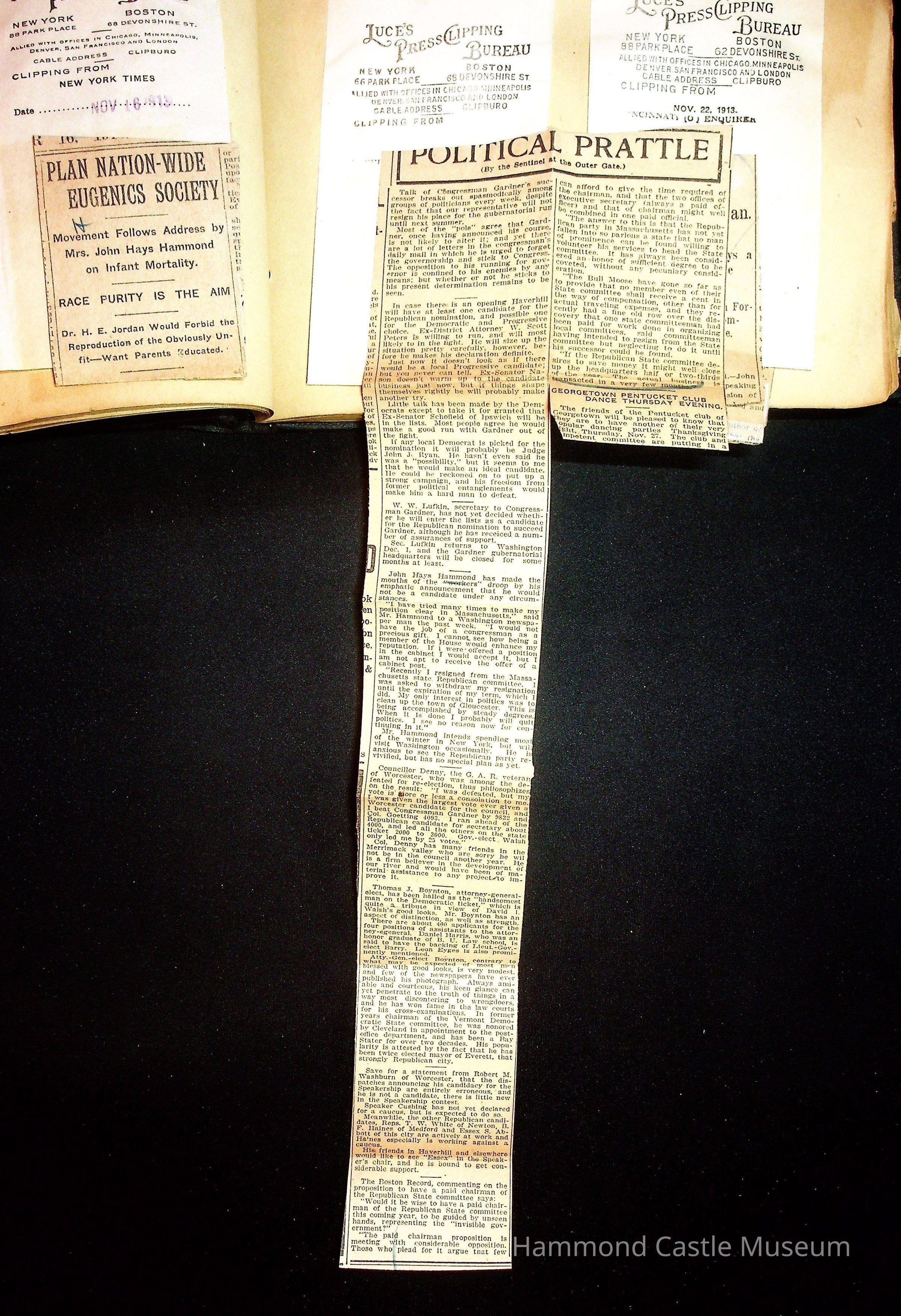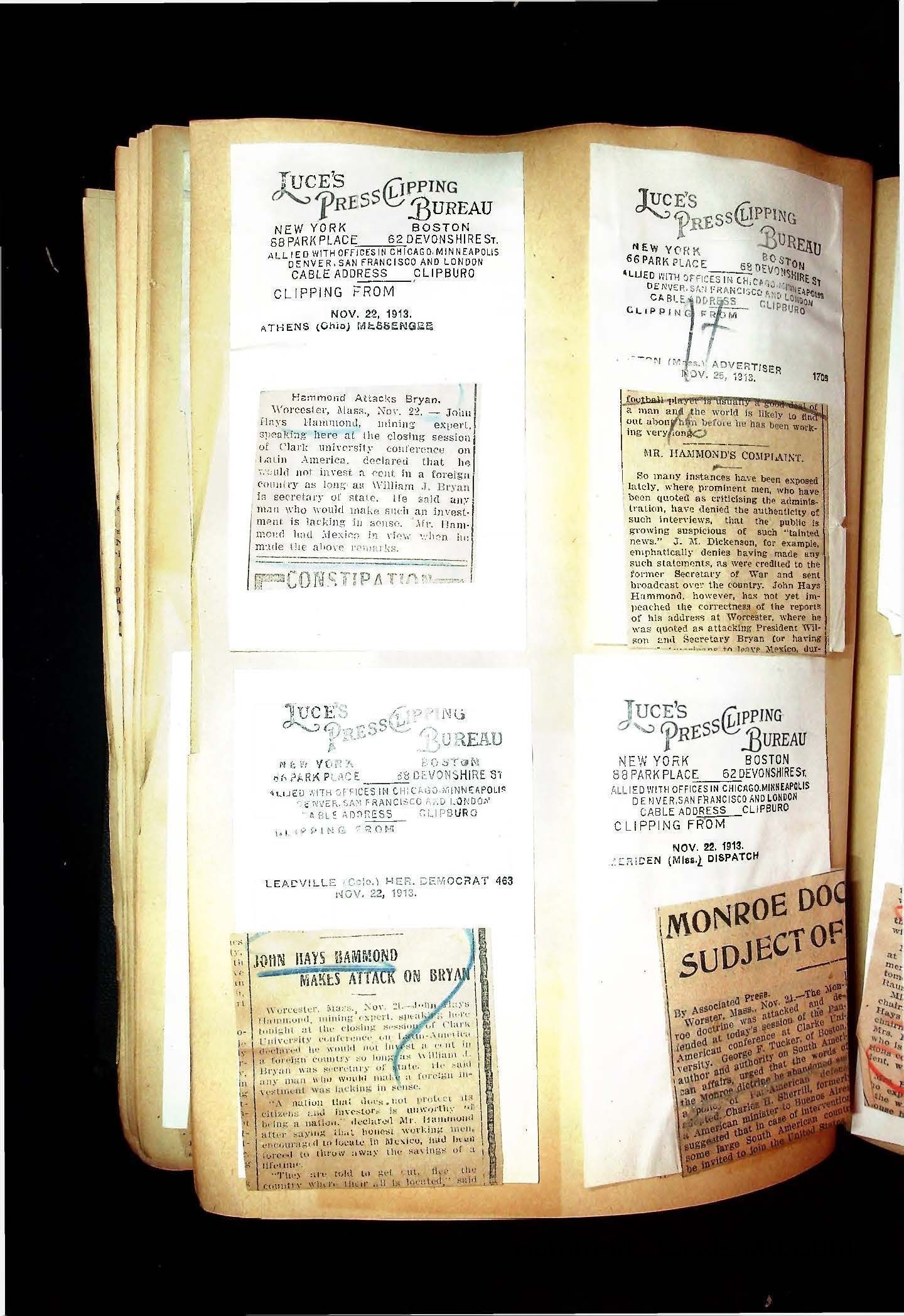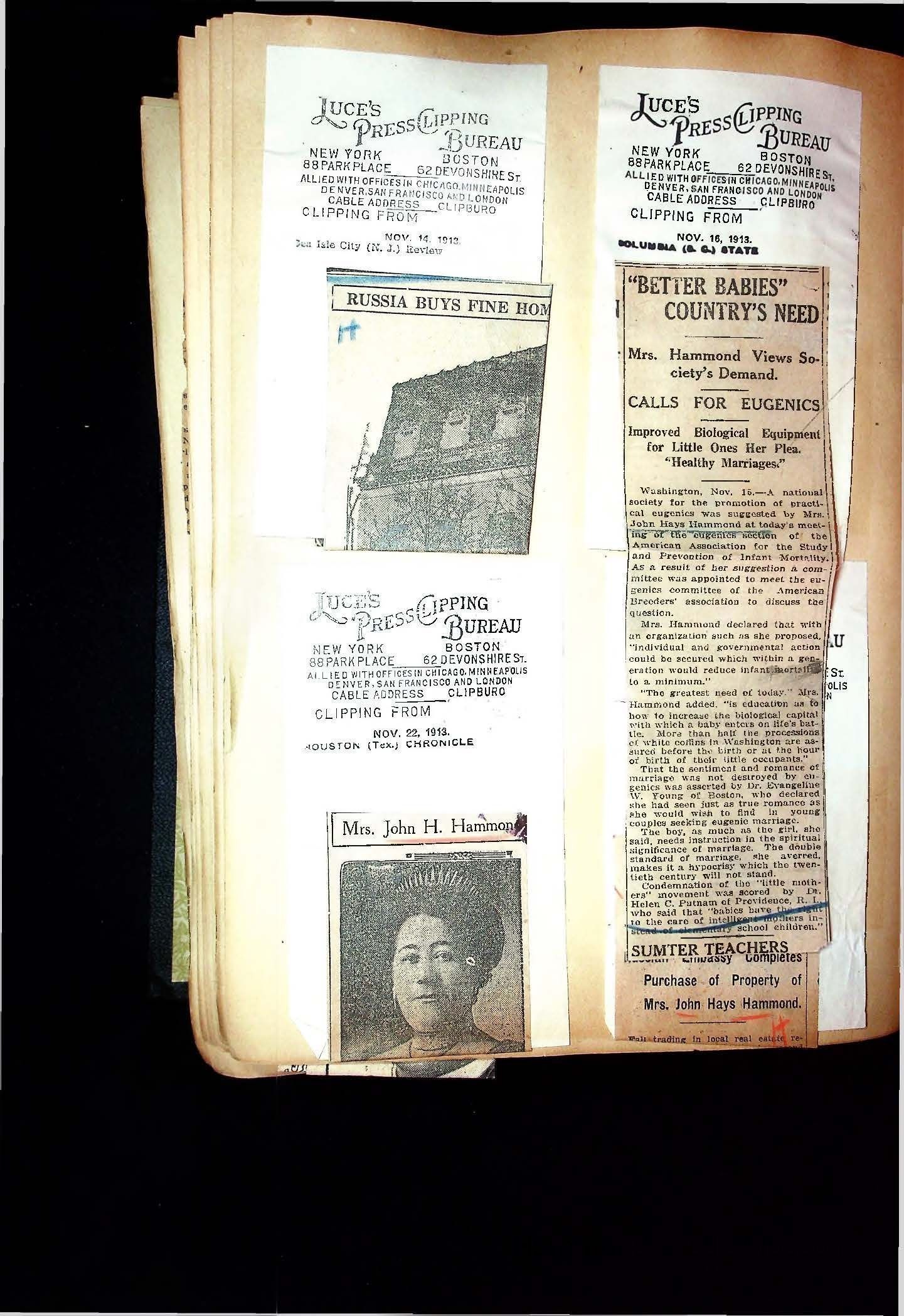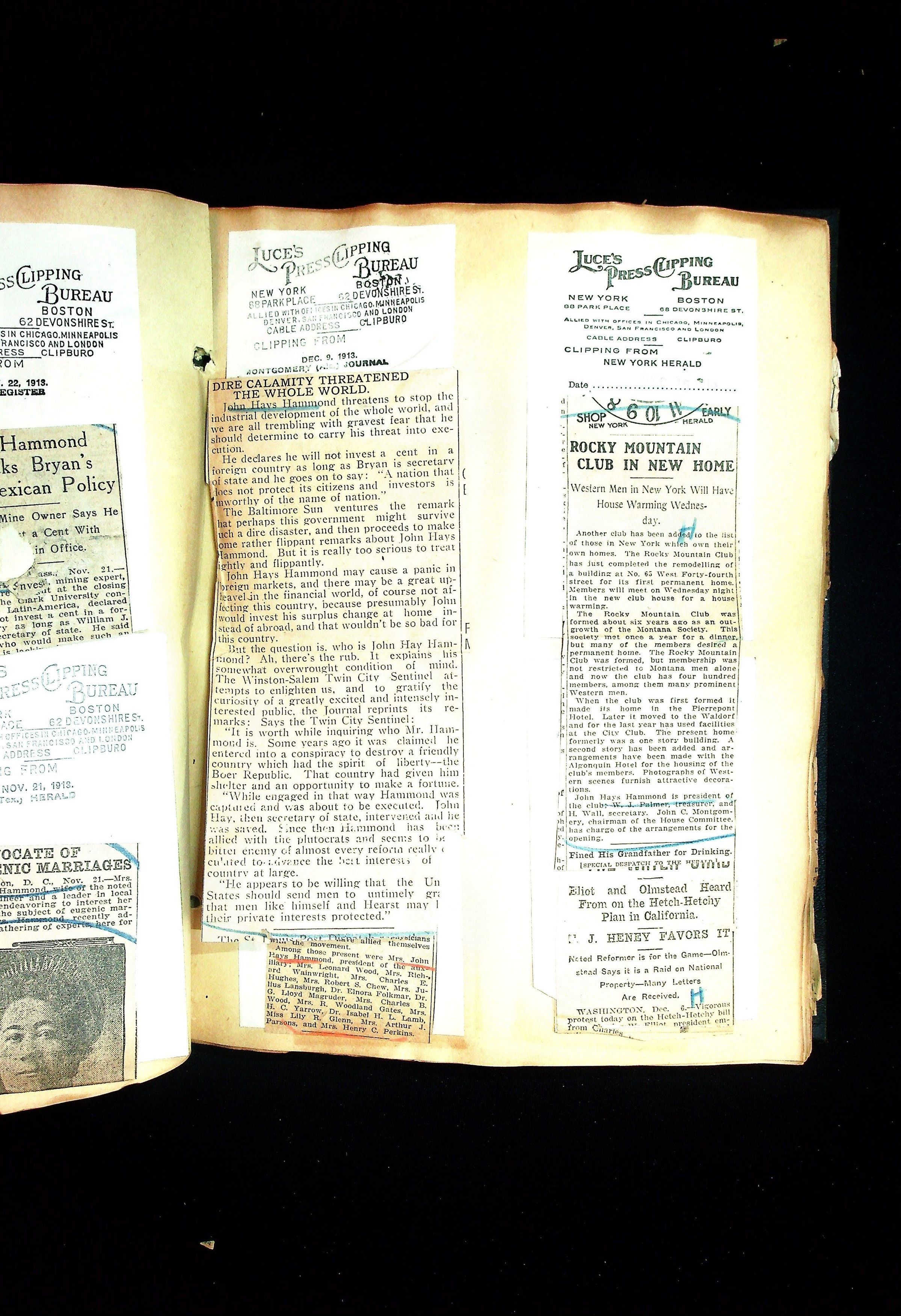 1913 scrapbook of newspaper articles about John Hays Hammond (Sr) and Mrs. Hammond covering governmental policies, Sherman Act, Eugenics & politics.