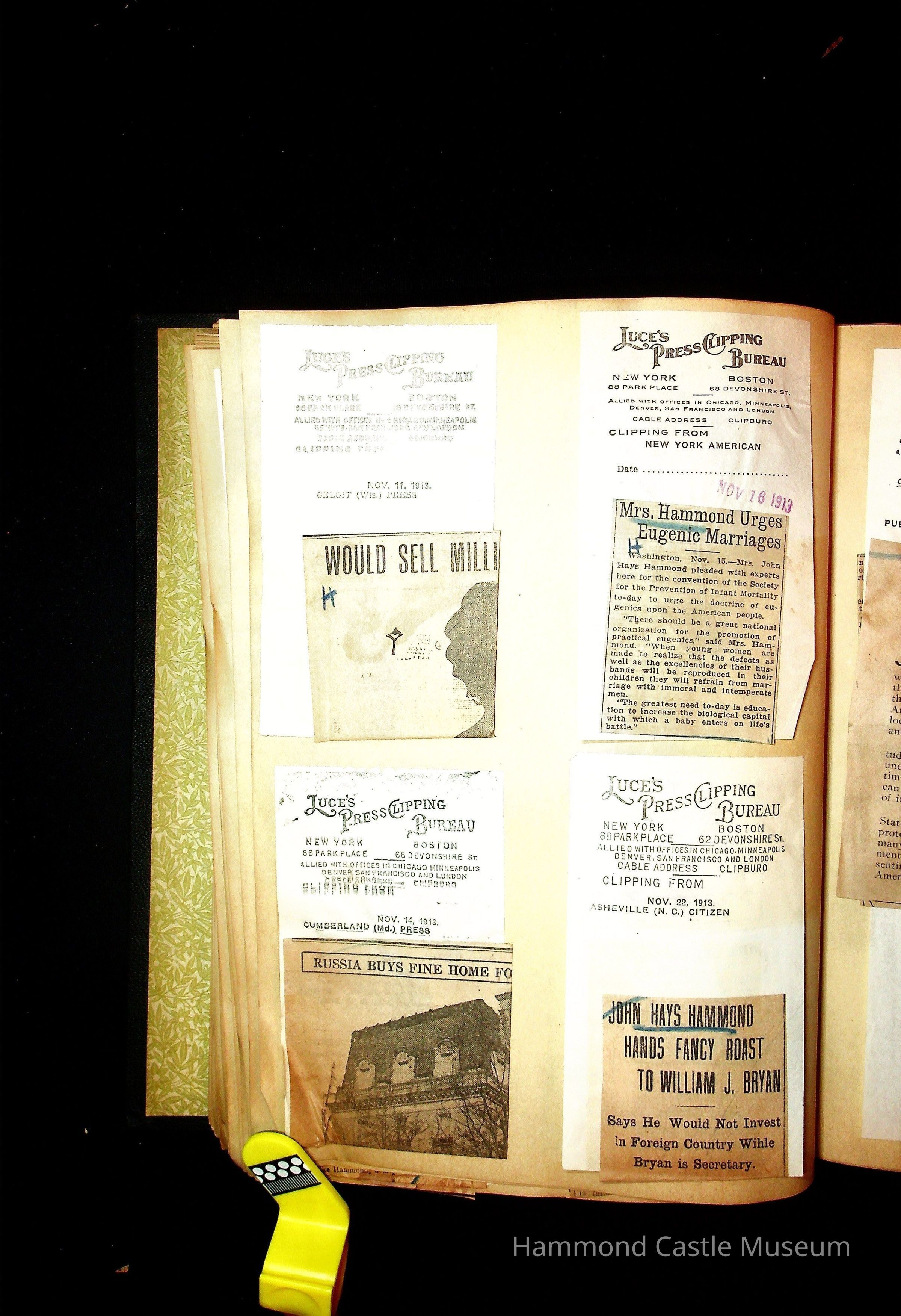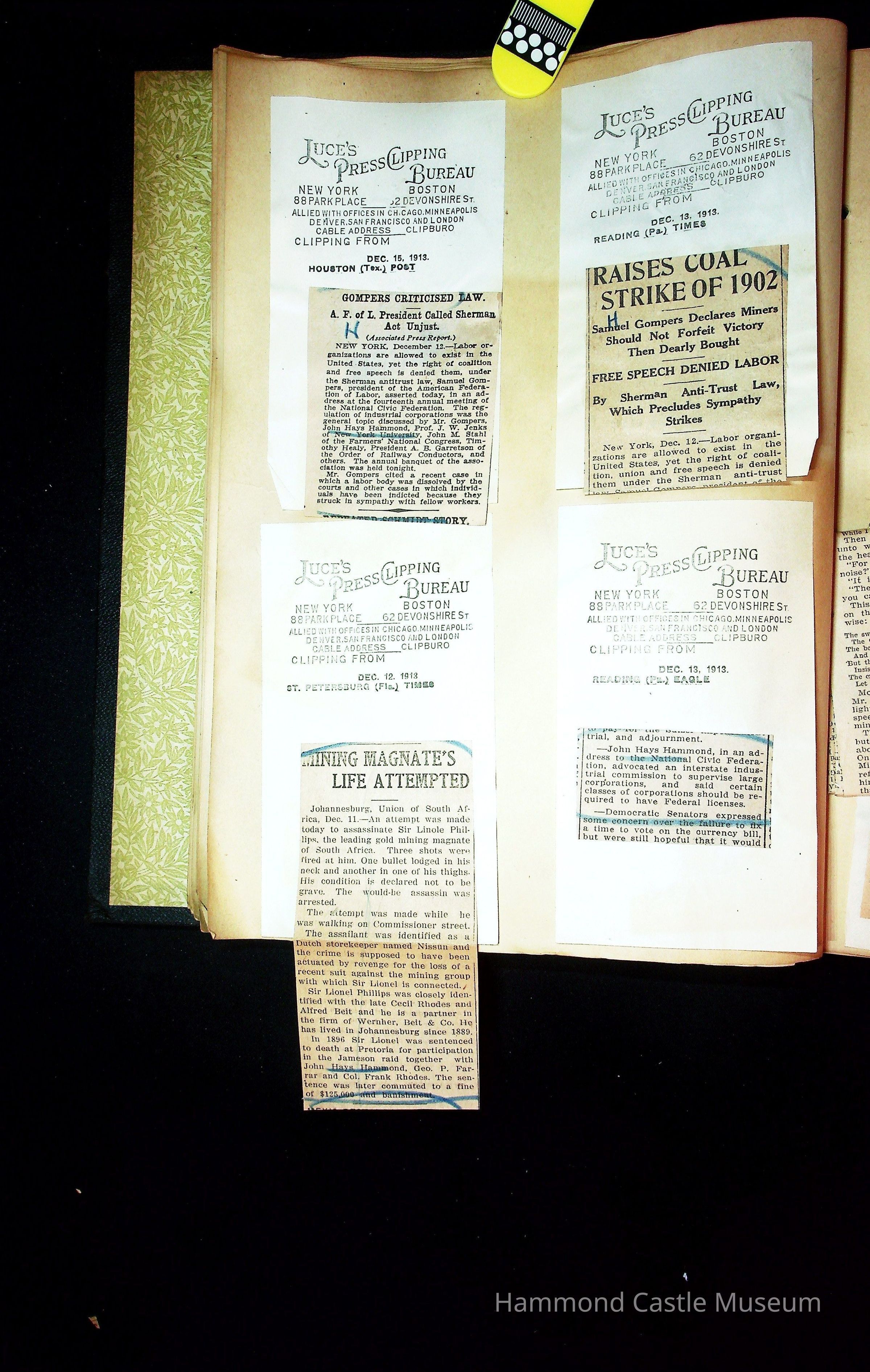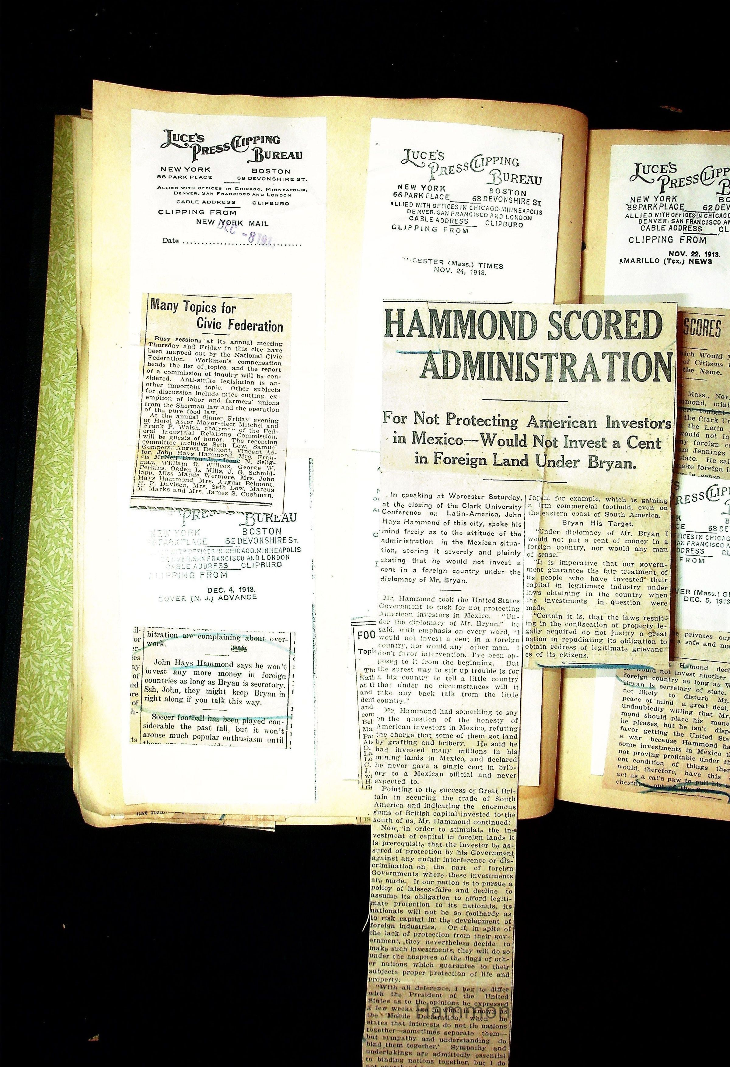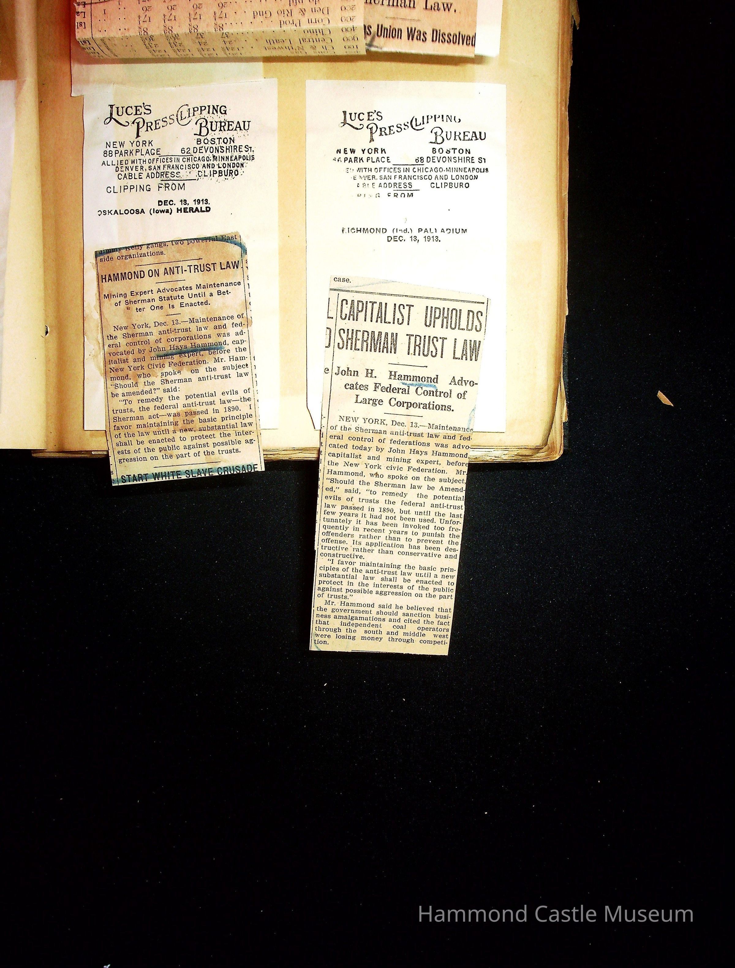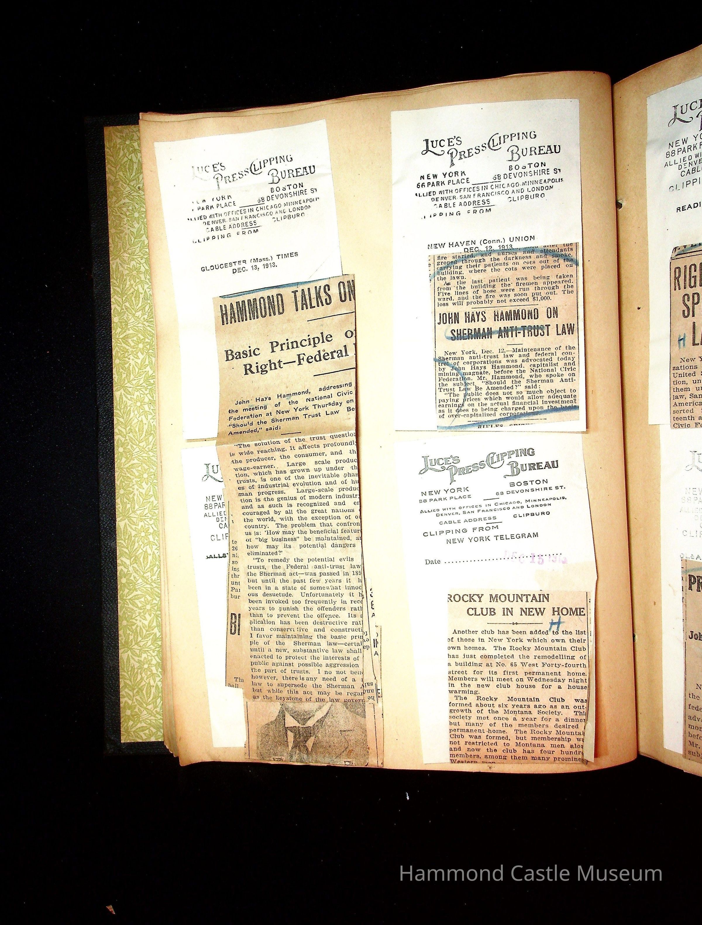 1913 scrapbook of newspaper articles about John Hays Hammond (Sr) and Mrs. Hammond covering governmental policies, Sherman Act, Eugenics & politics.