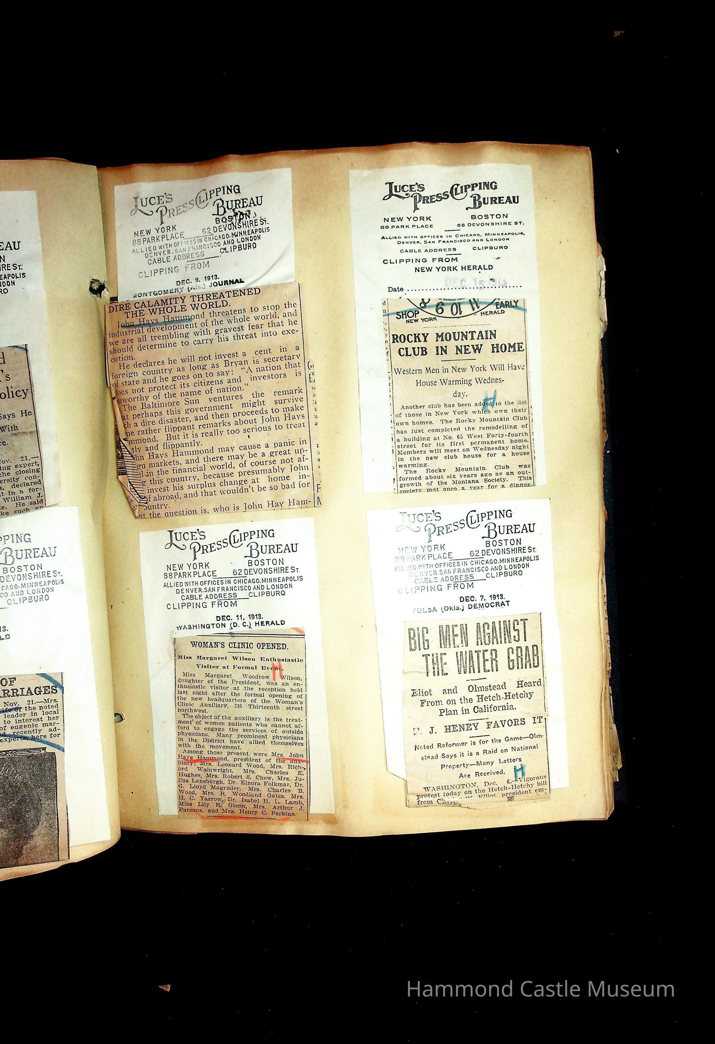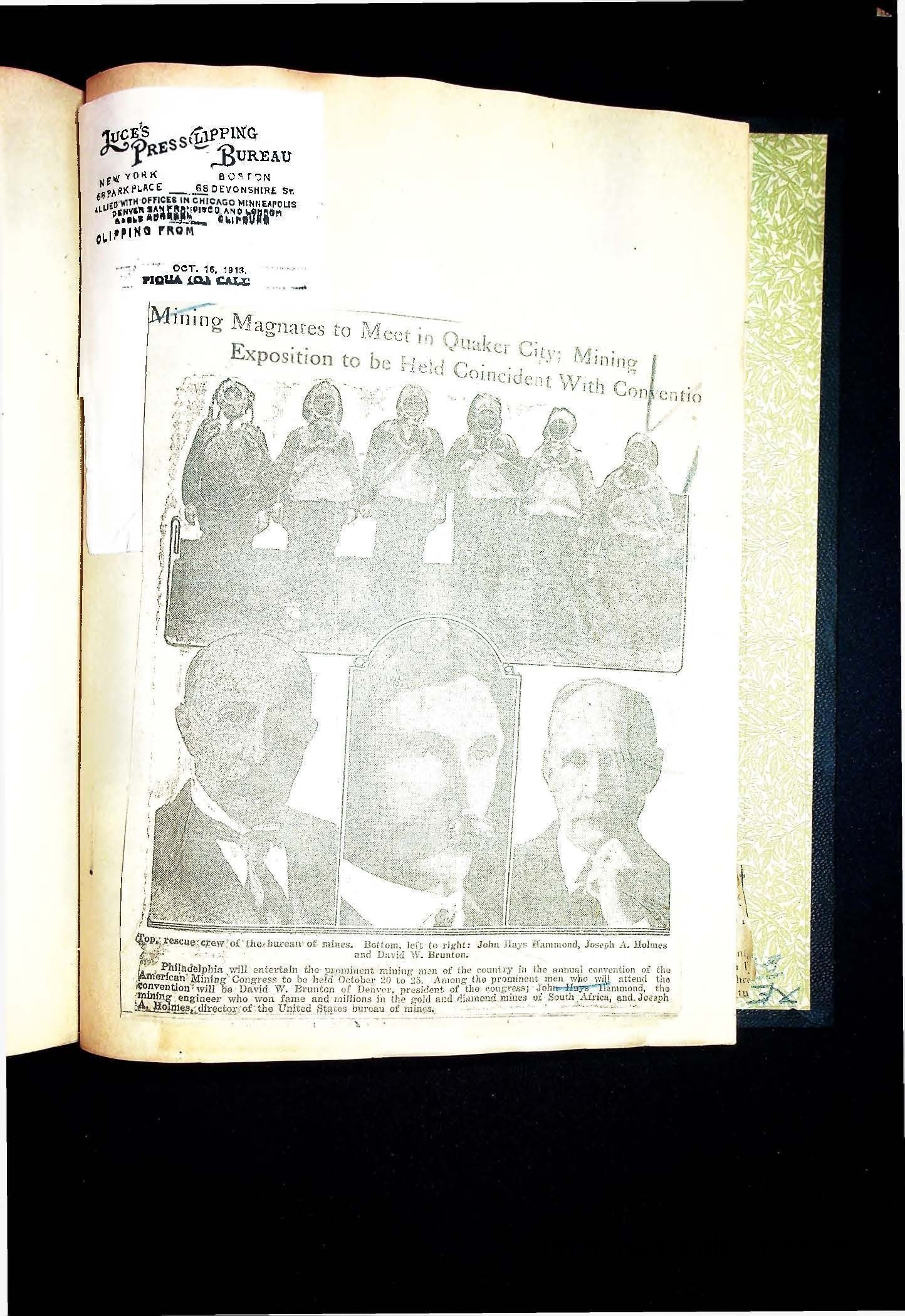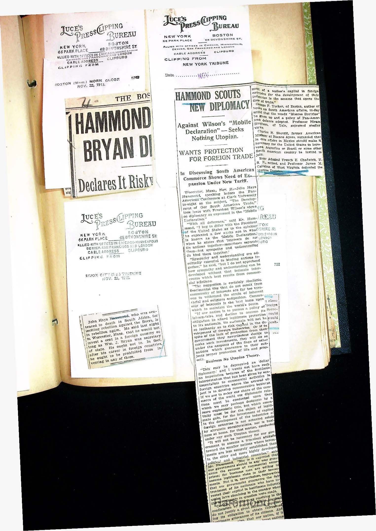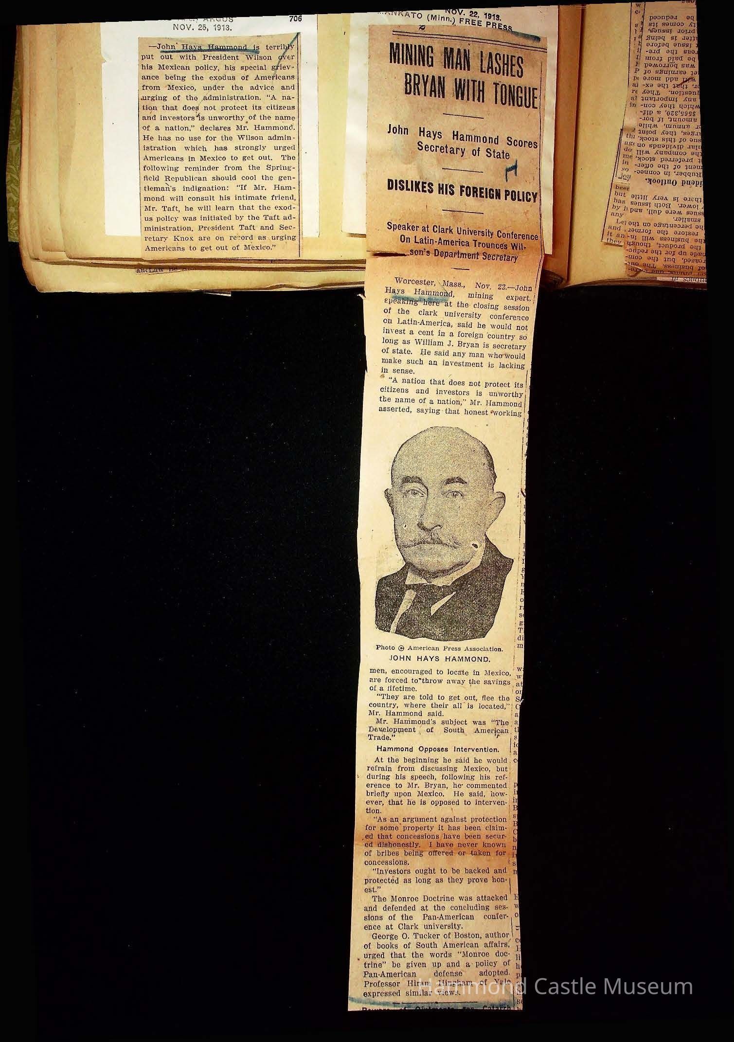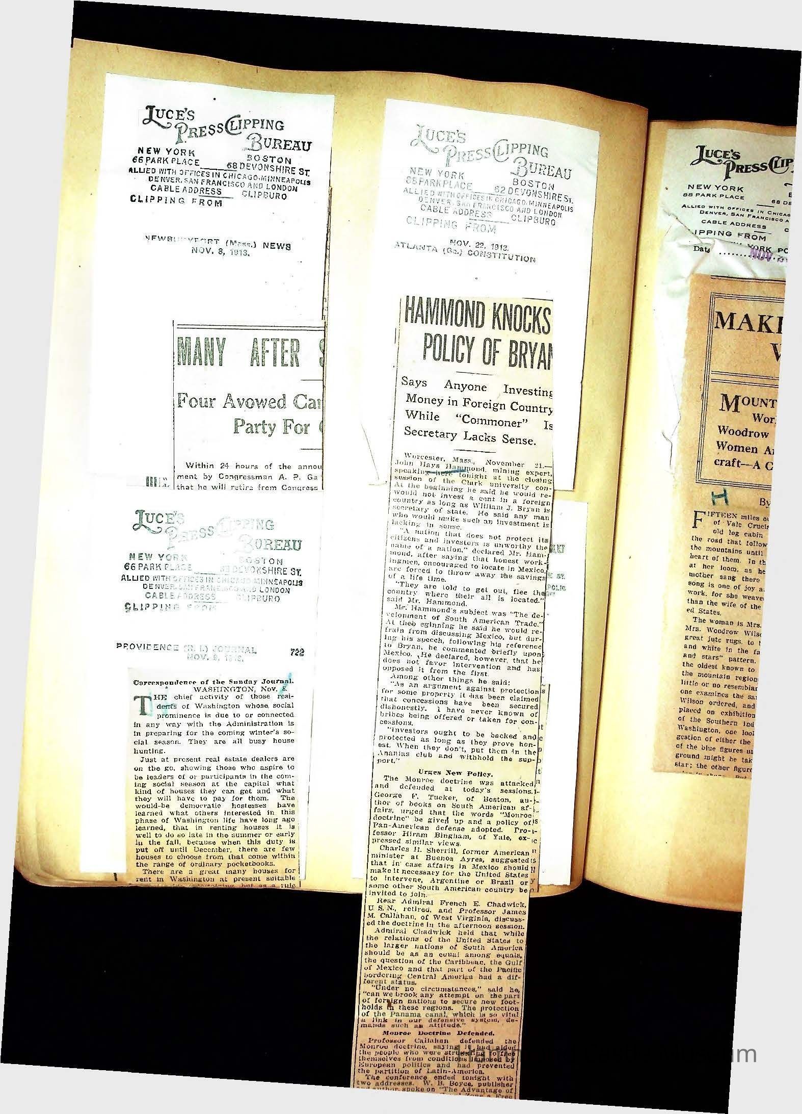 1913 scrapbook of newspaper articles about John Hays Hammond (Sr) and Mrs. Hammond covering governmental policies, Sherman Act, Eugenics & politics.