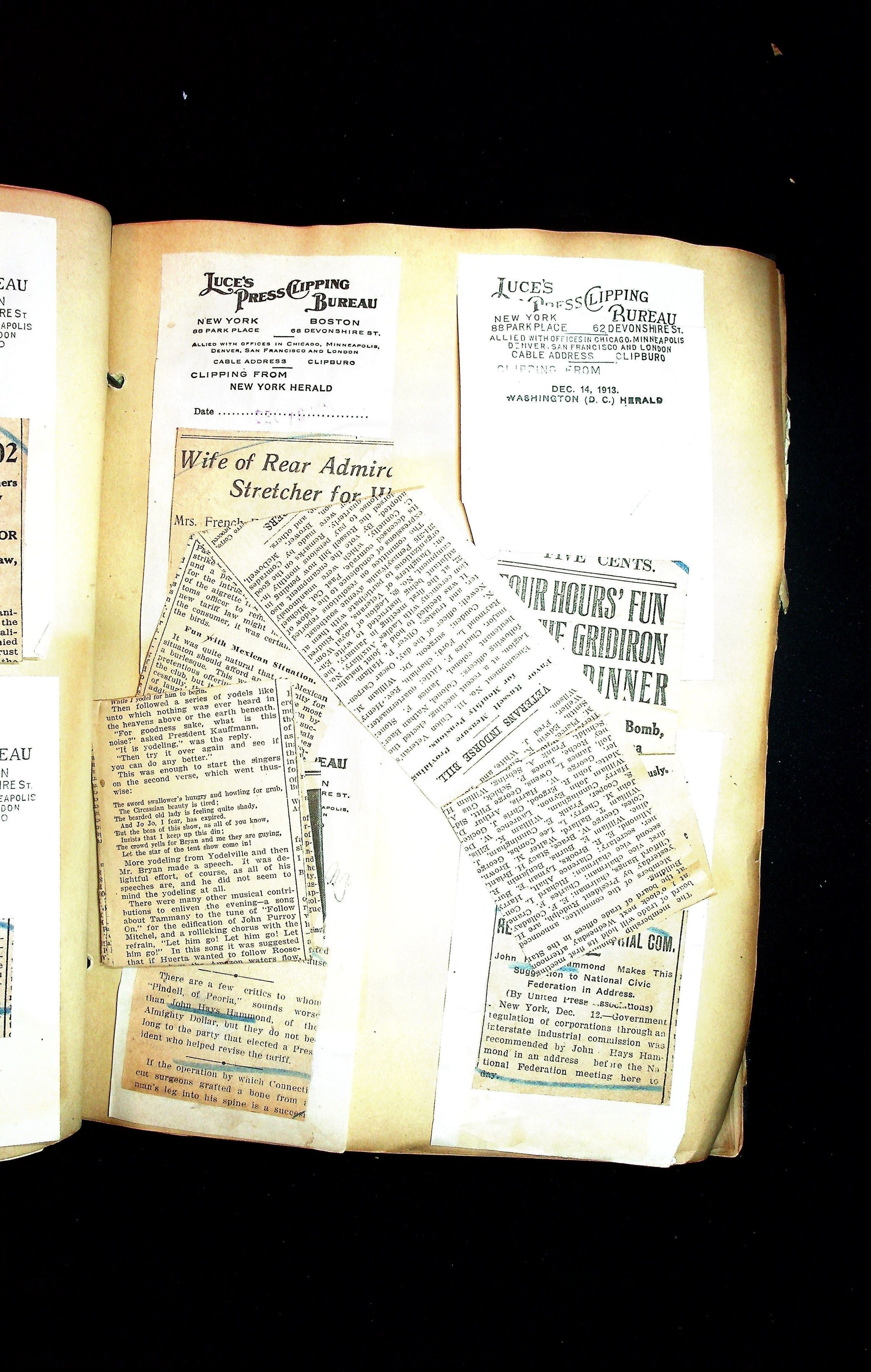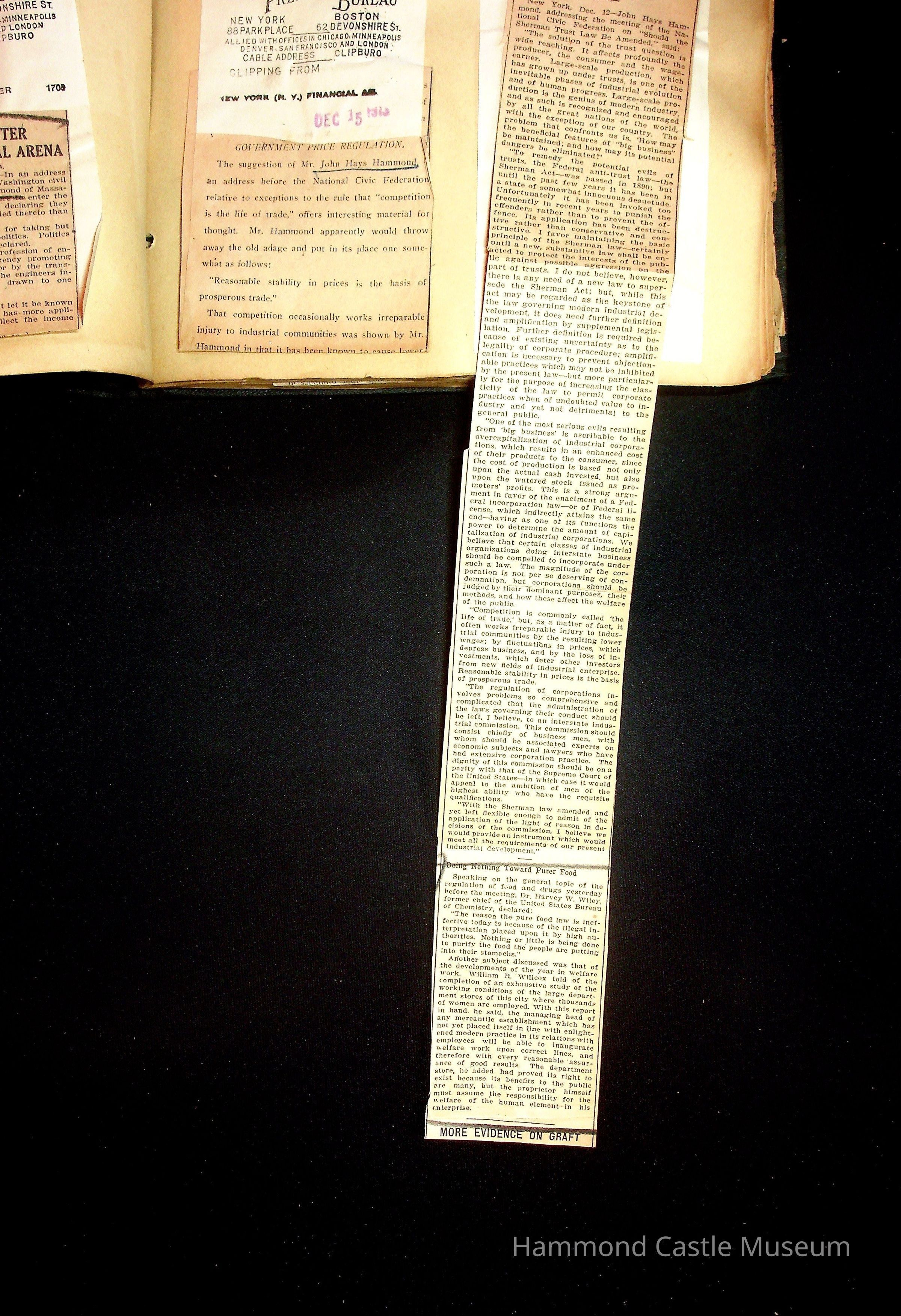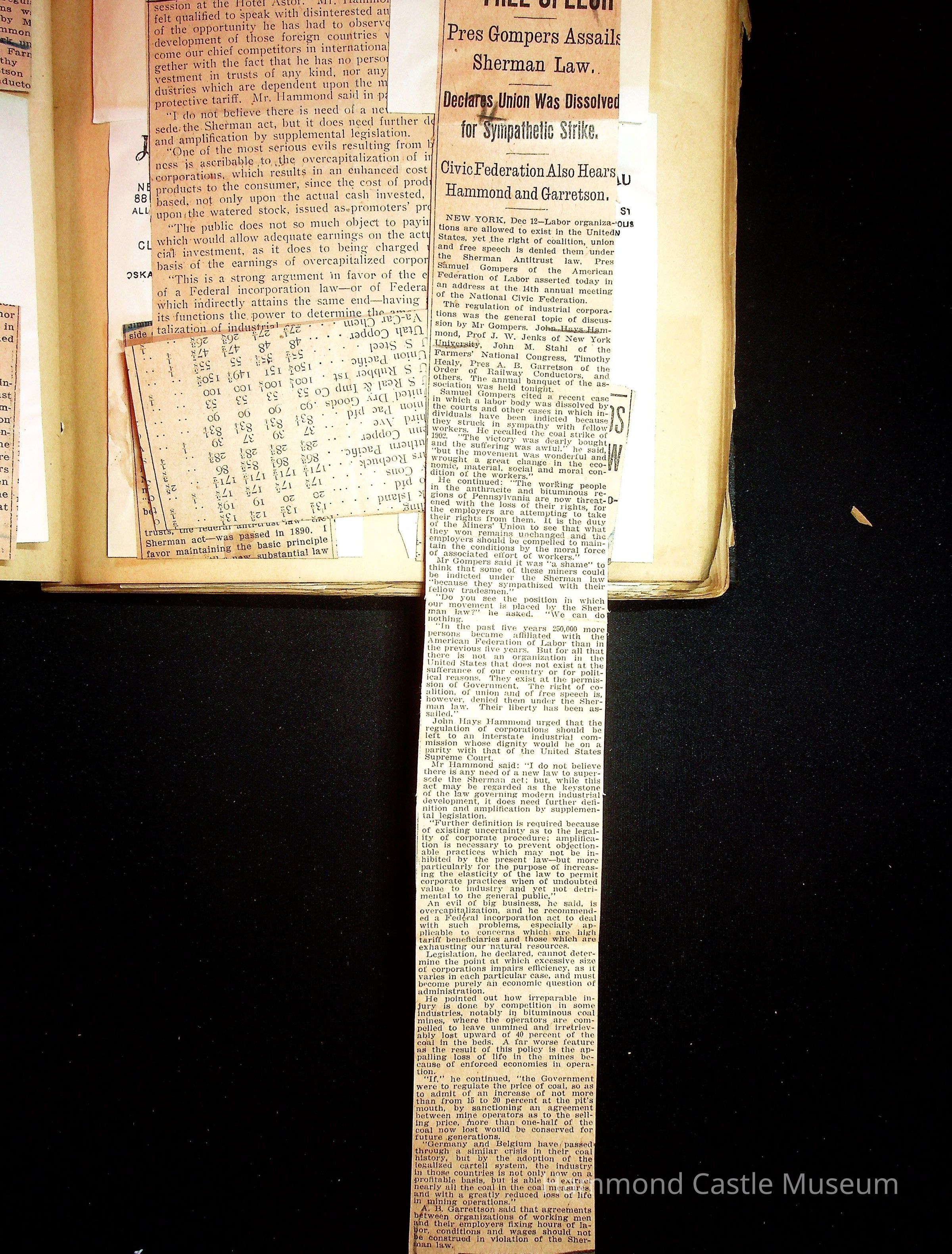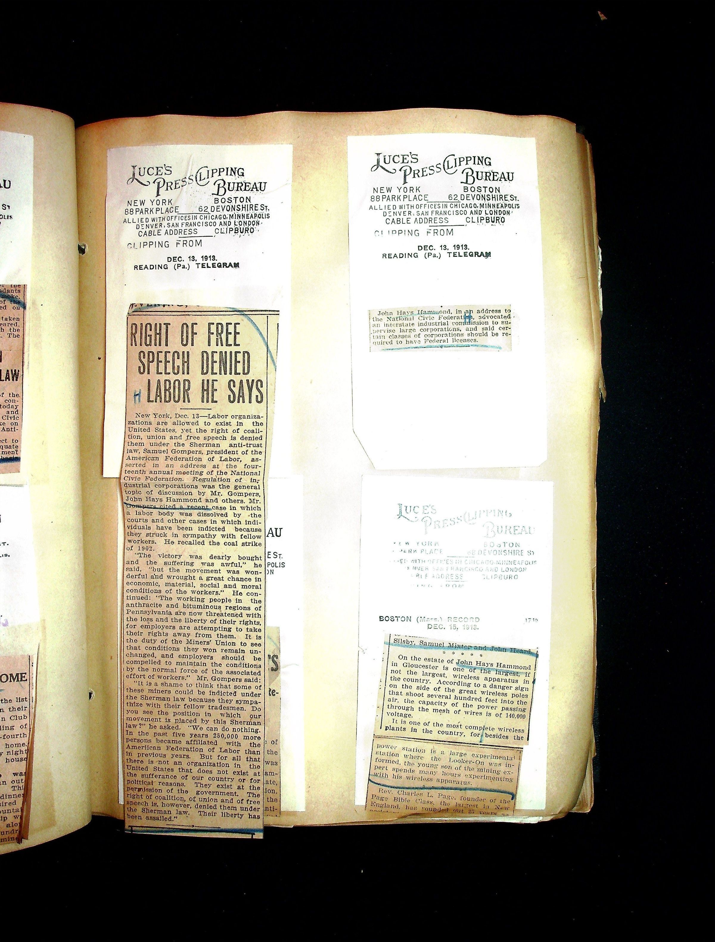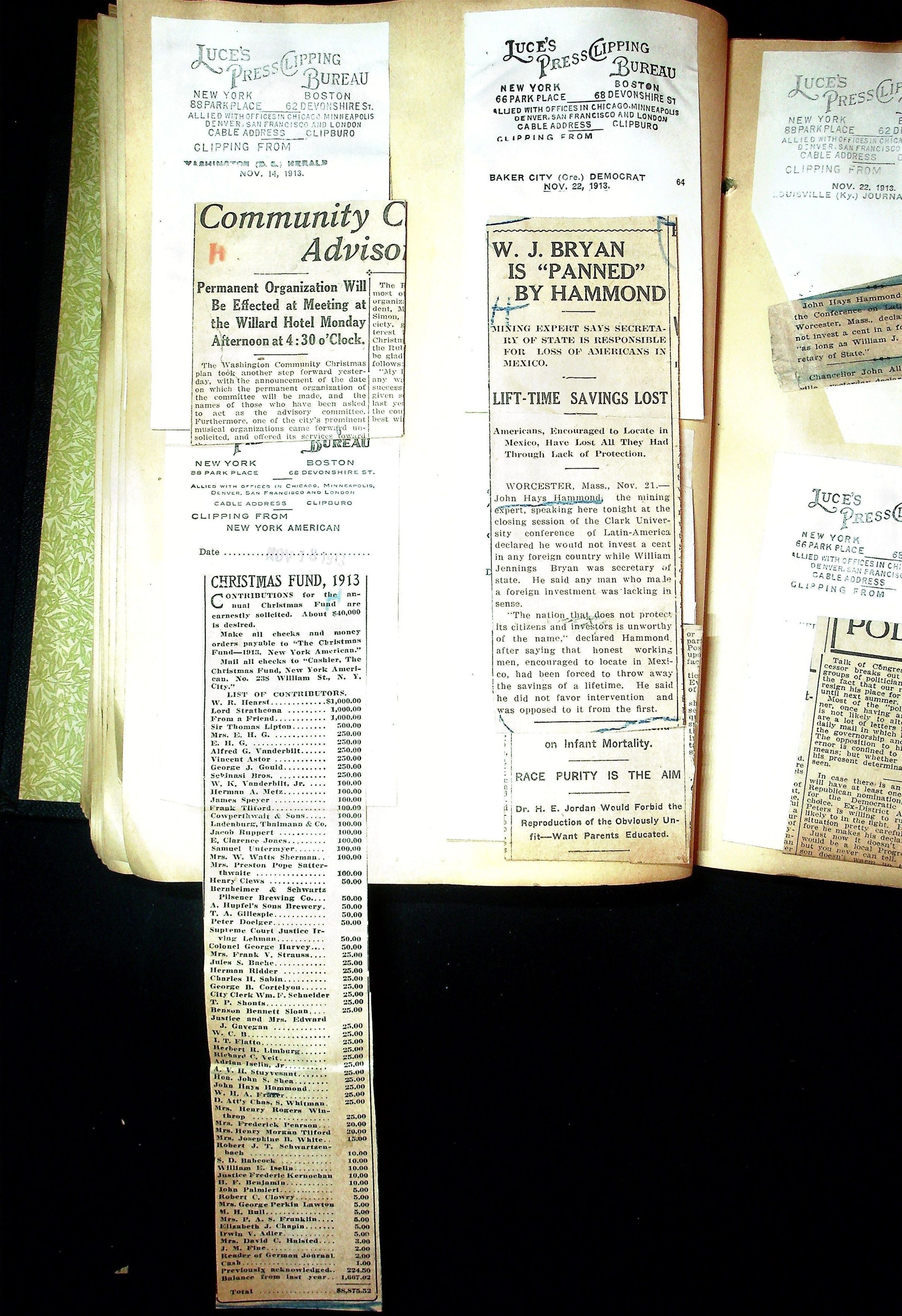 1913 scrapbook of newspaper articles about John Hays Hammond (Sr) and Mrs. Hammond covering governmental policies, Sherman Act, Eugenics & politics.