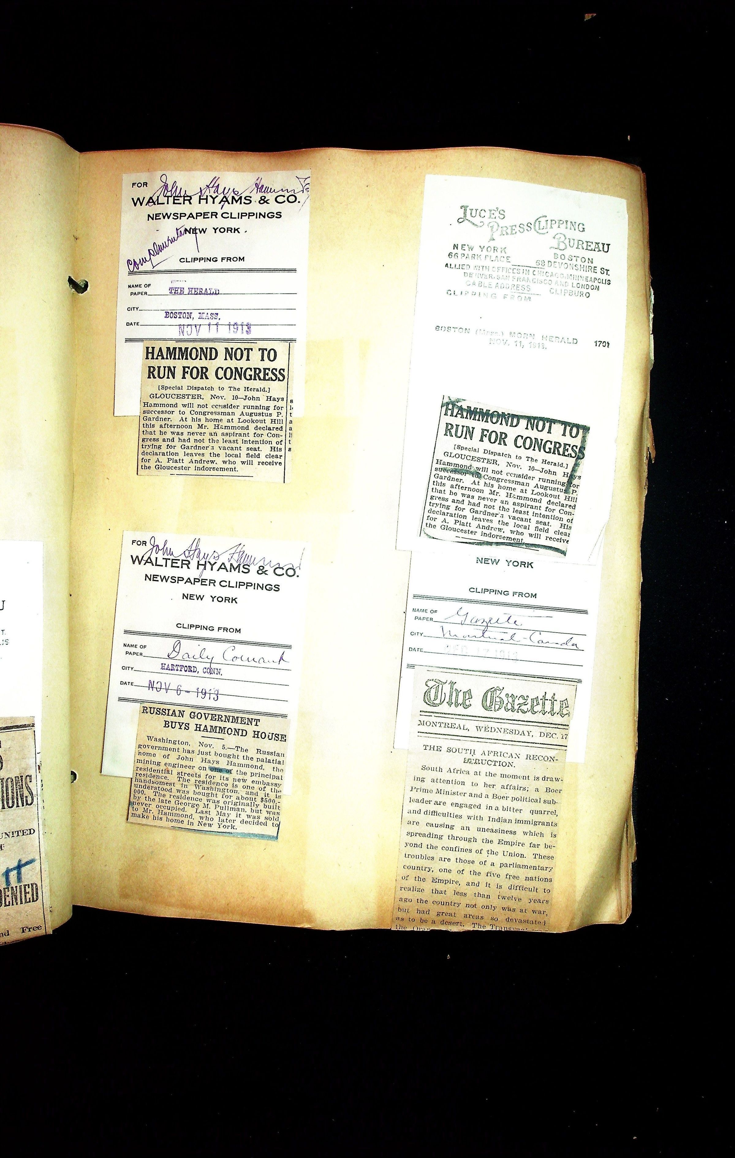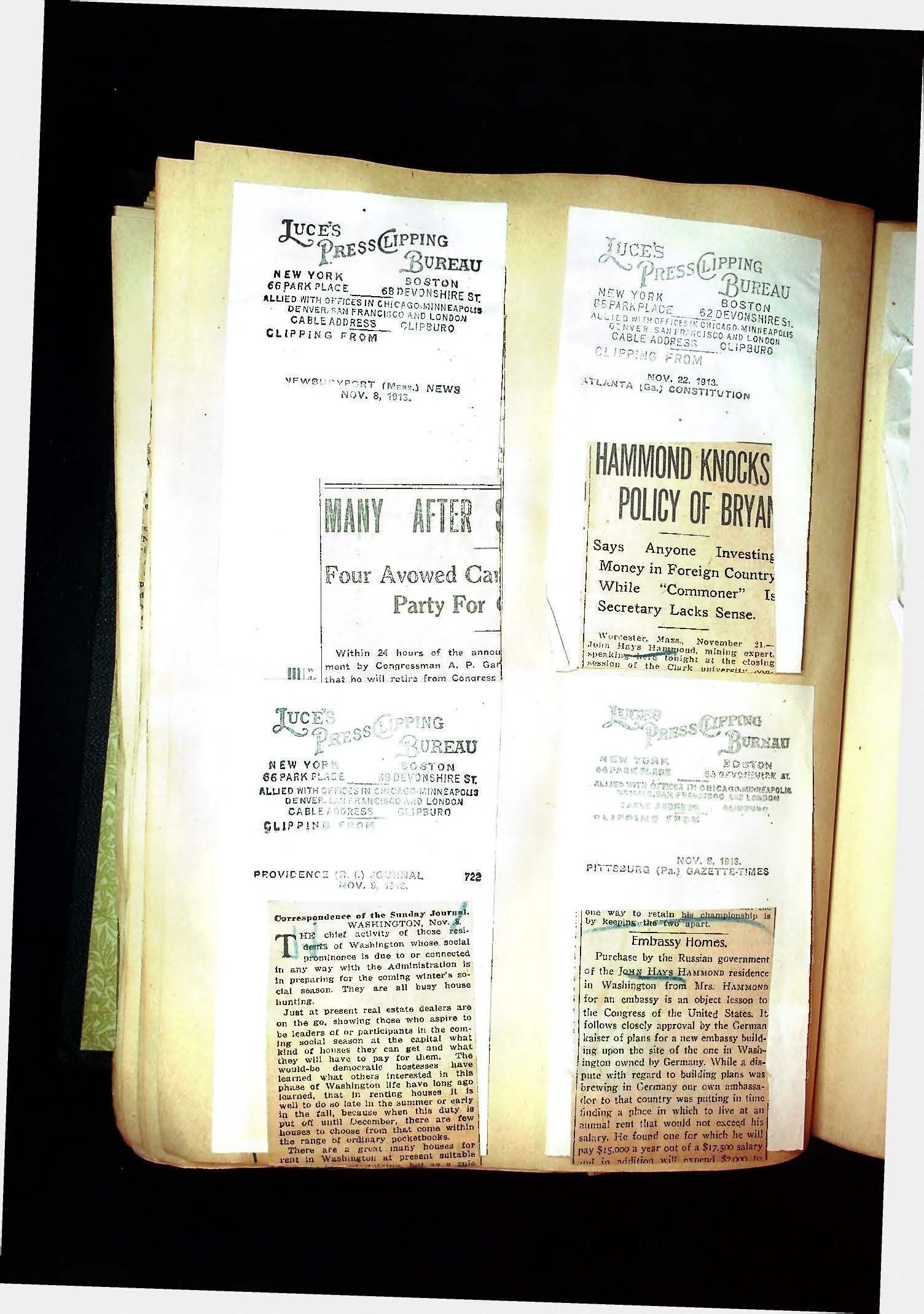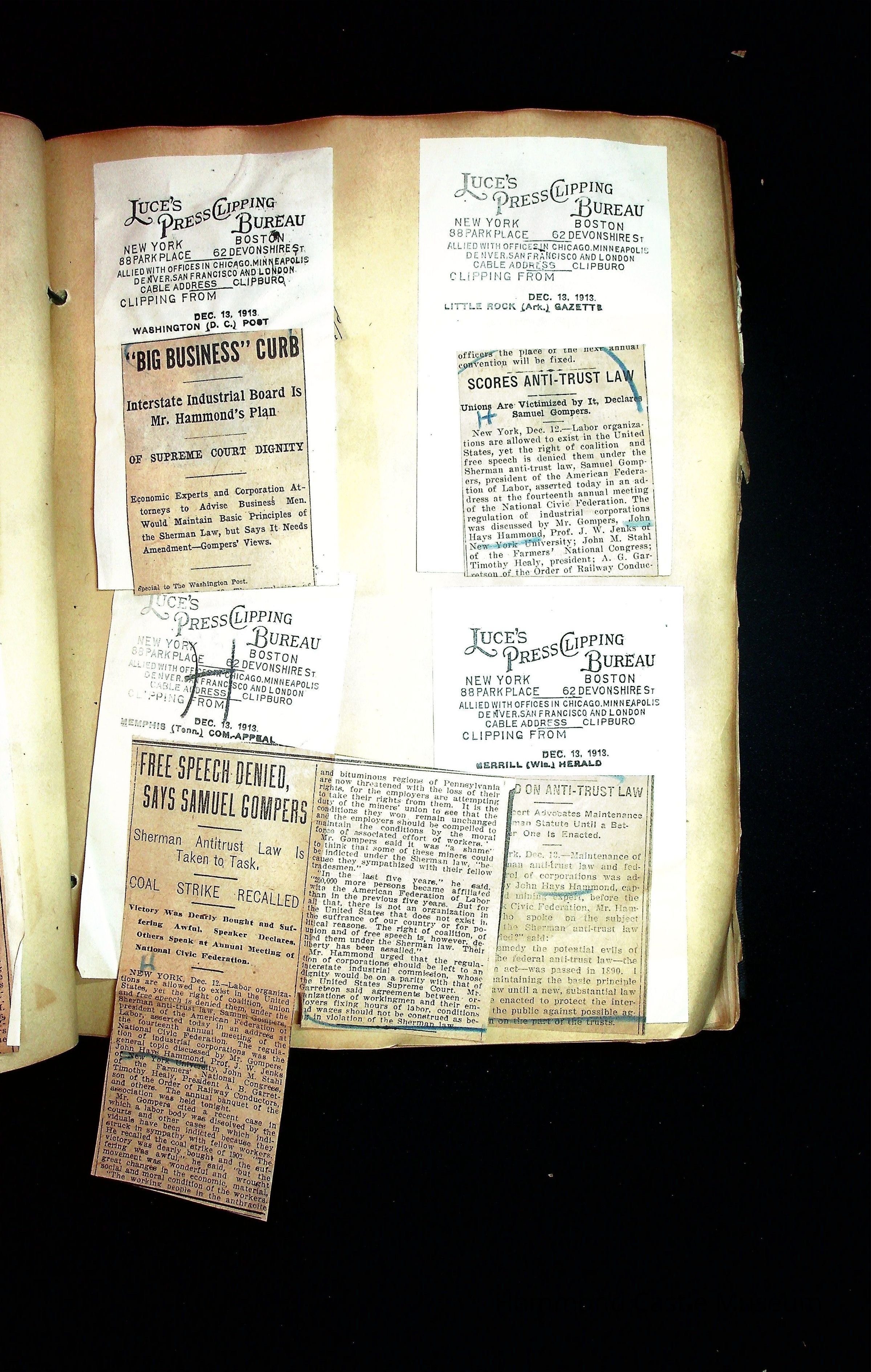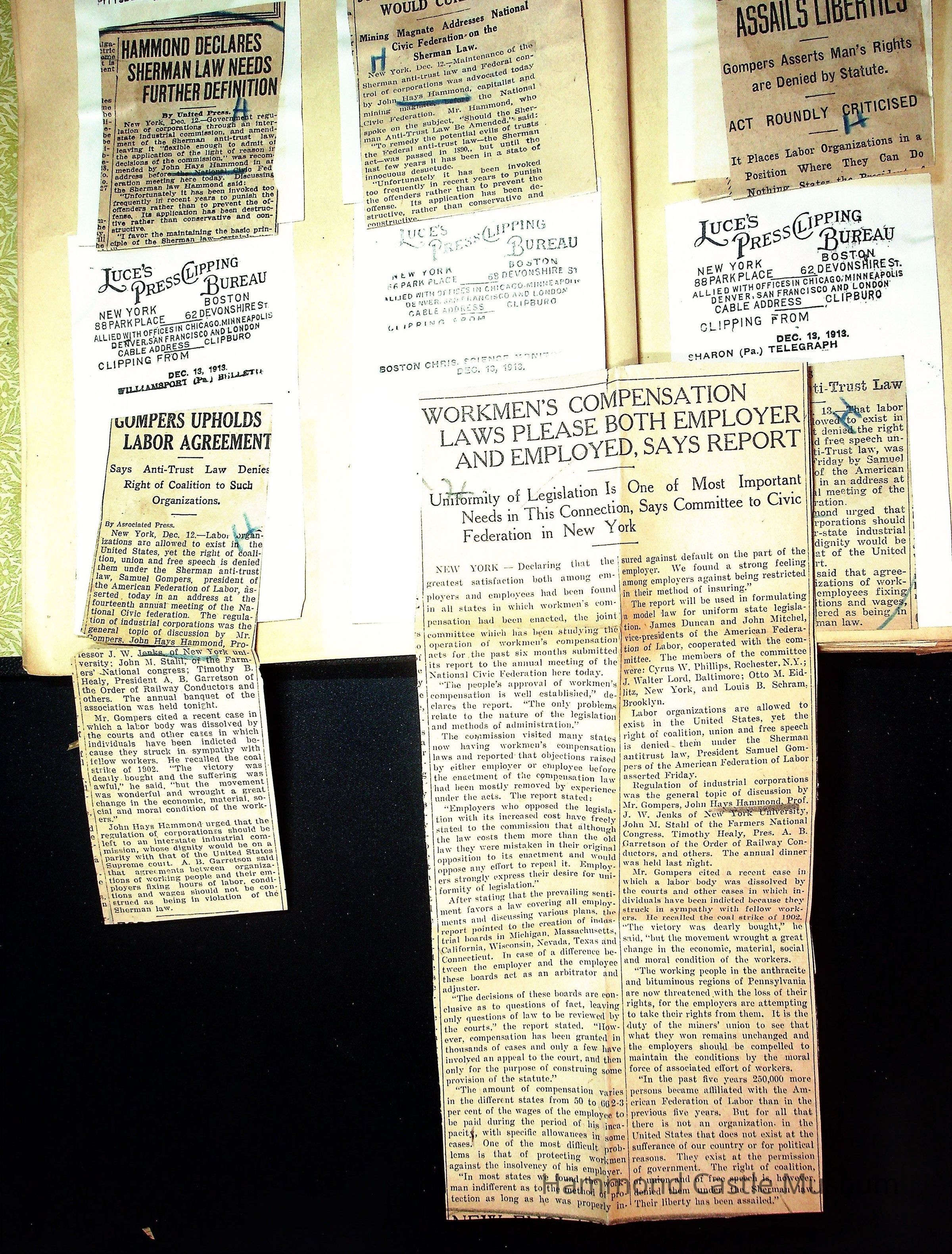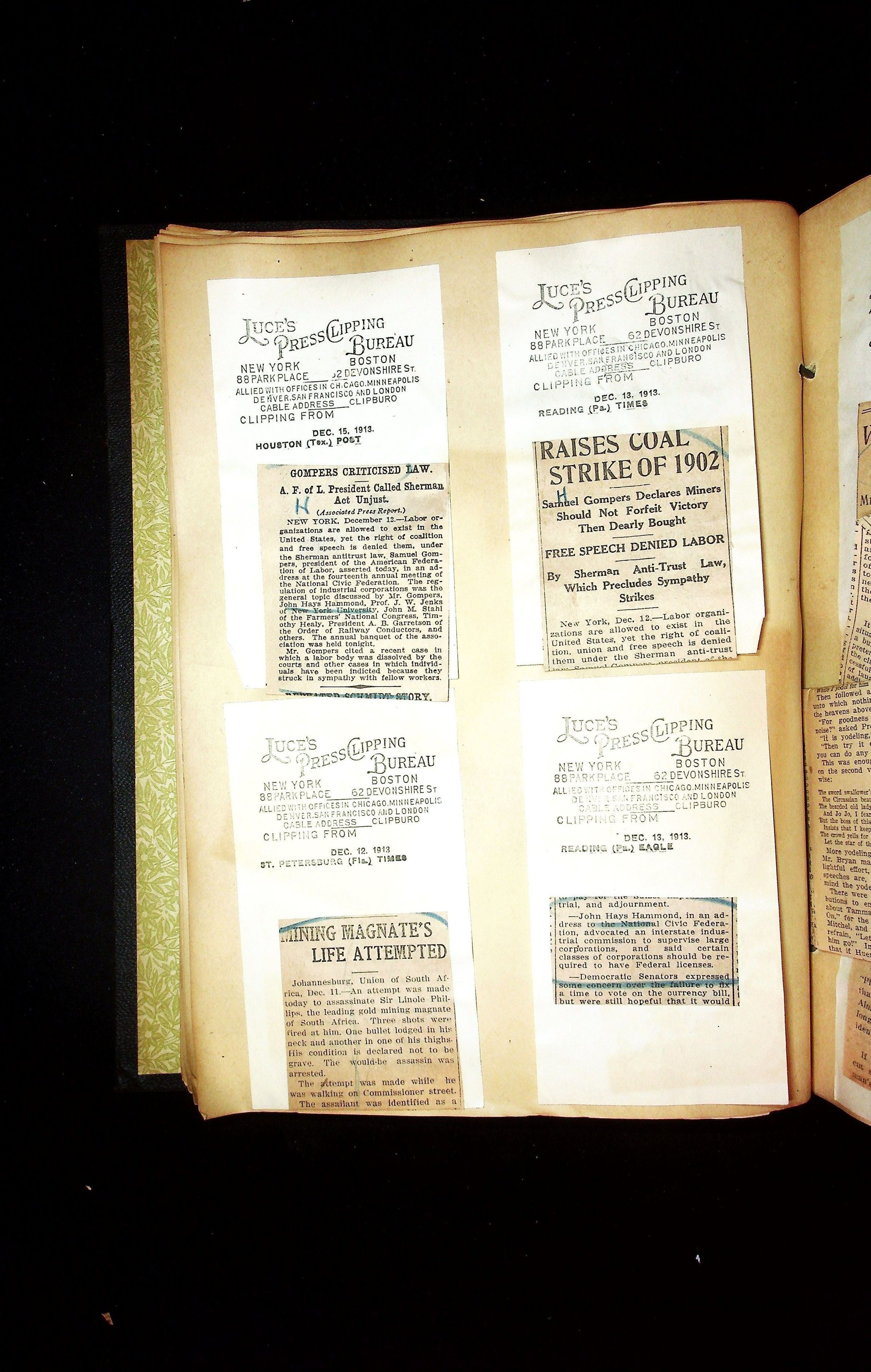 1913 scrapbook of newspaper articles about John Hays Hammond (Sr) and Mrs. Hammond covering governmental policies, Sherman Act, Eugenics & politics.