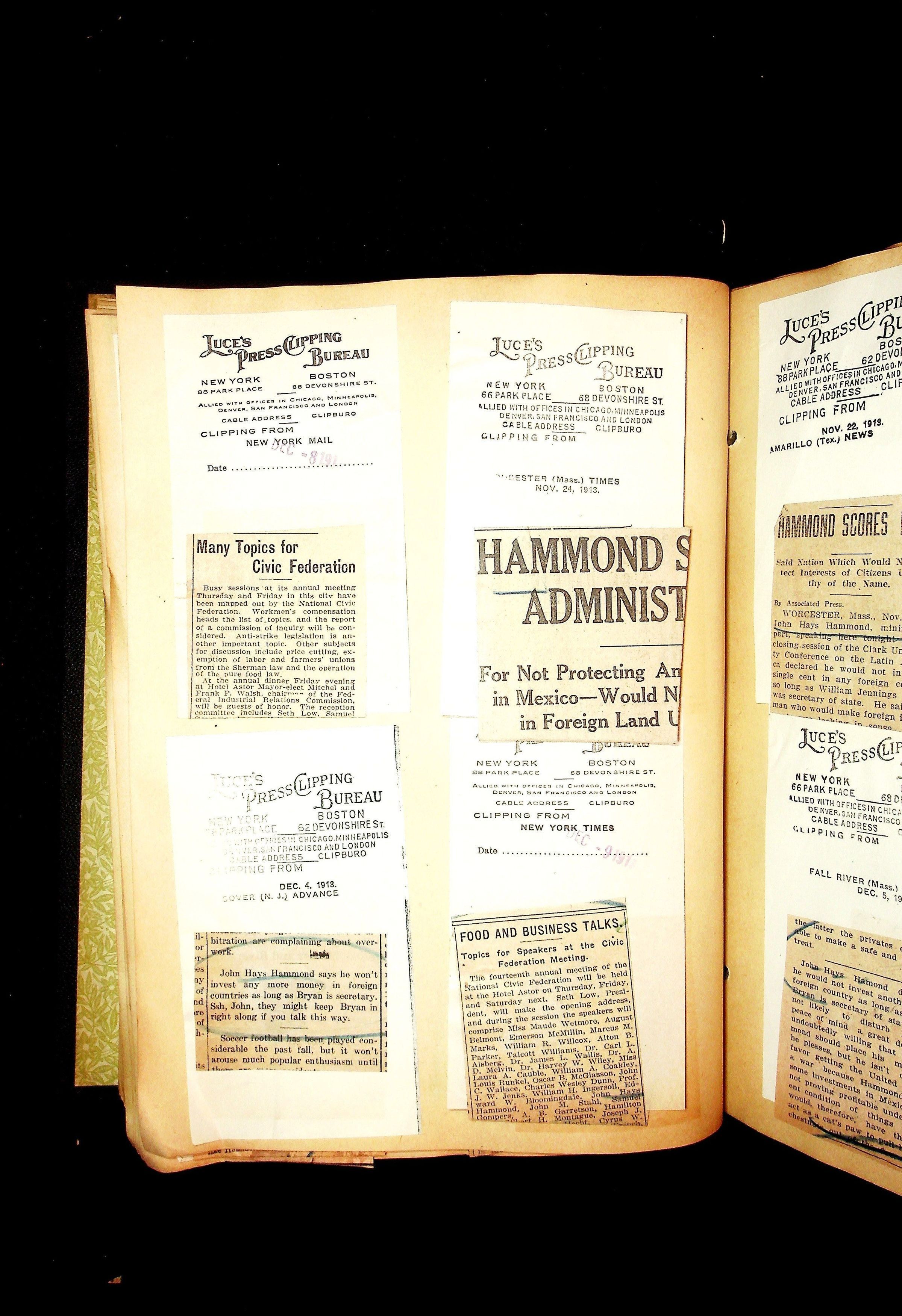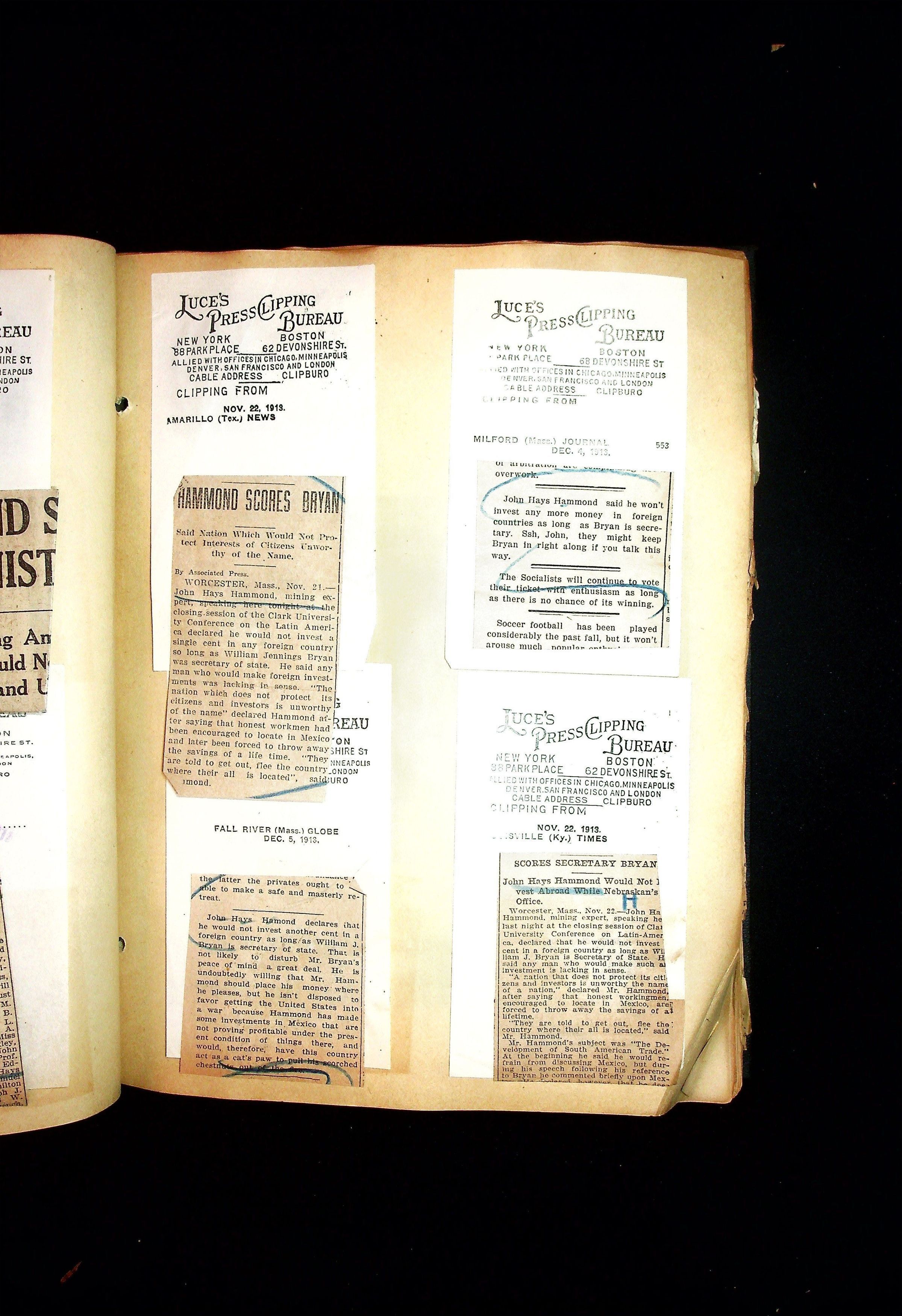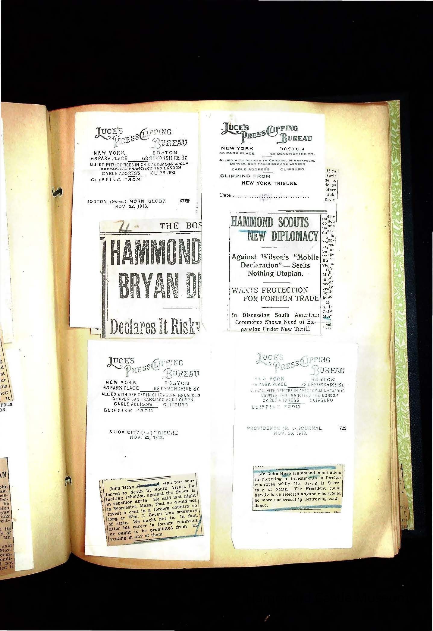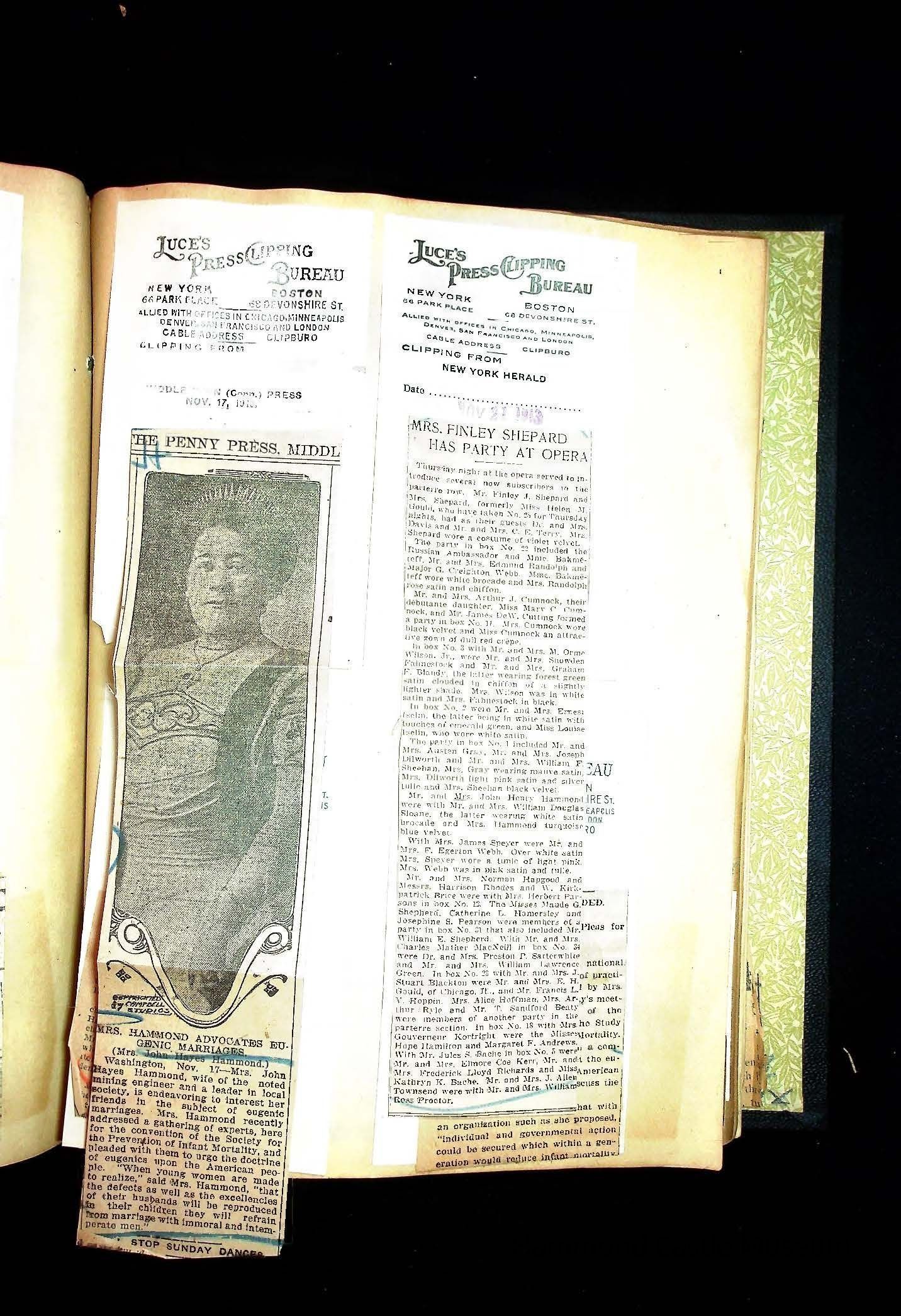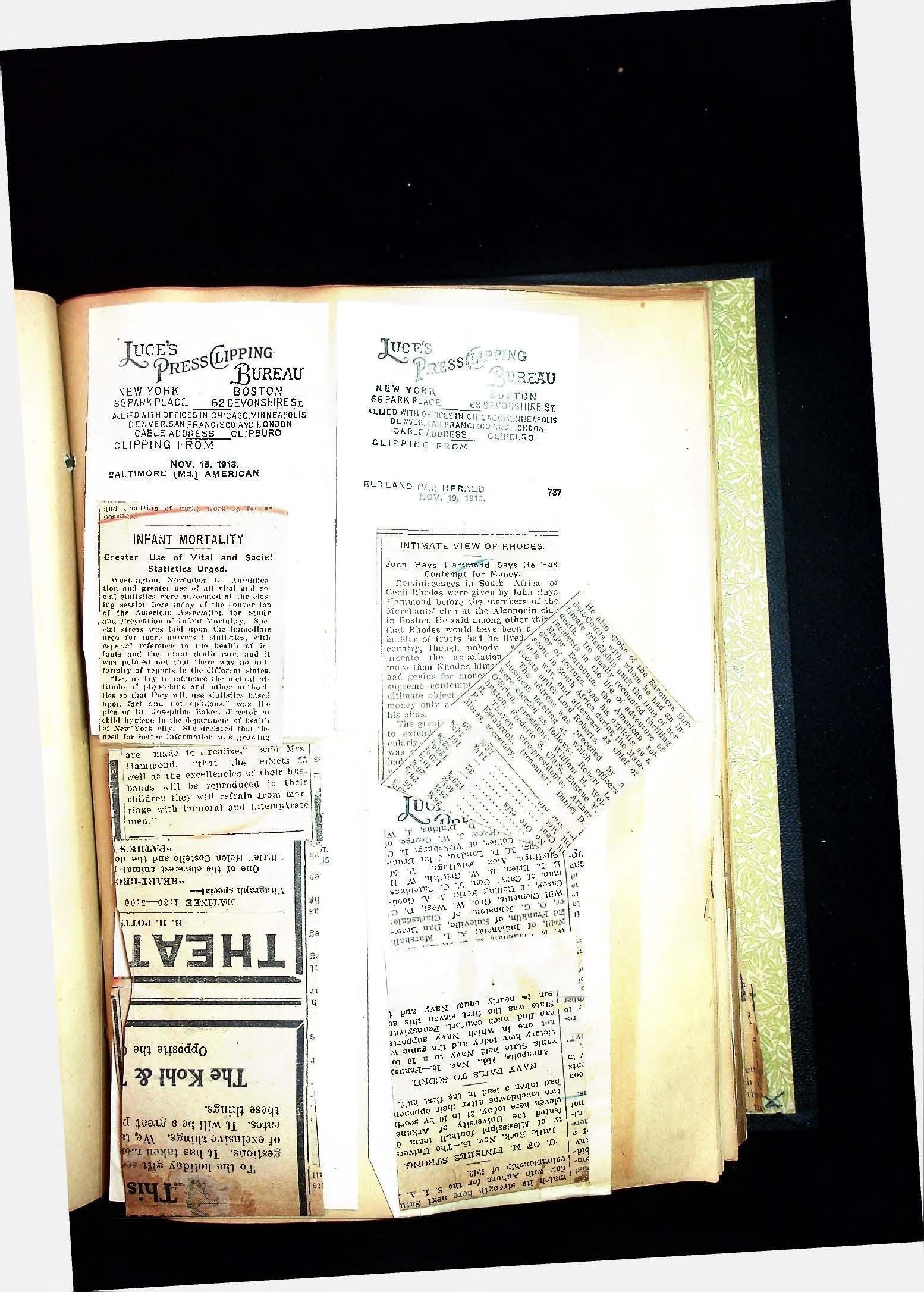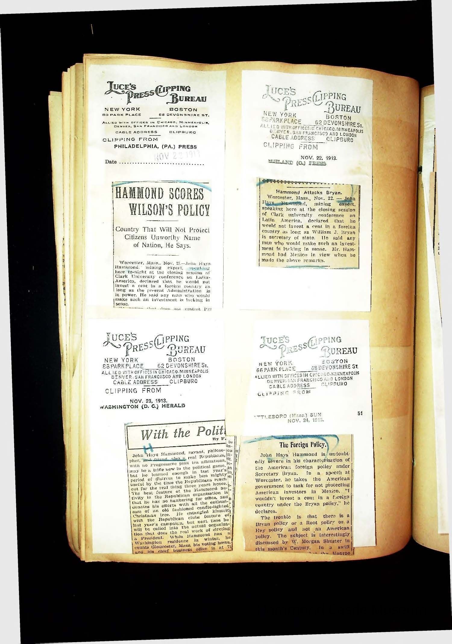 1913 scrapbook of newspaper articles about John Hays Hammond (Sr) and Mrs. Hammond covering governmental policies, Sherman Act, Eugenics & politics.
