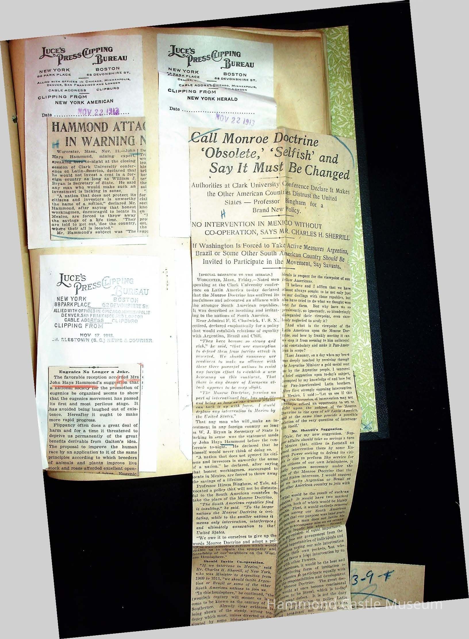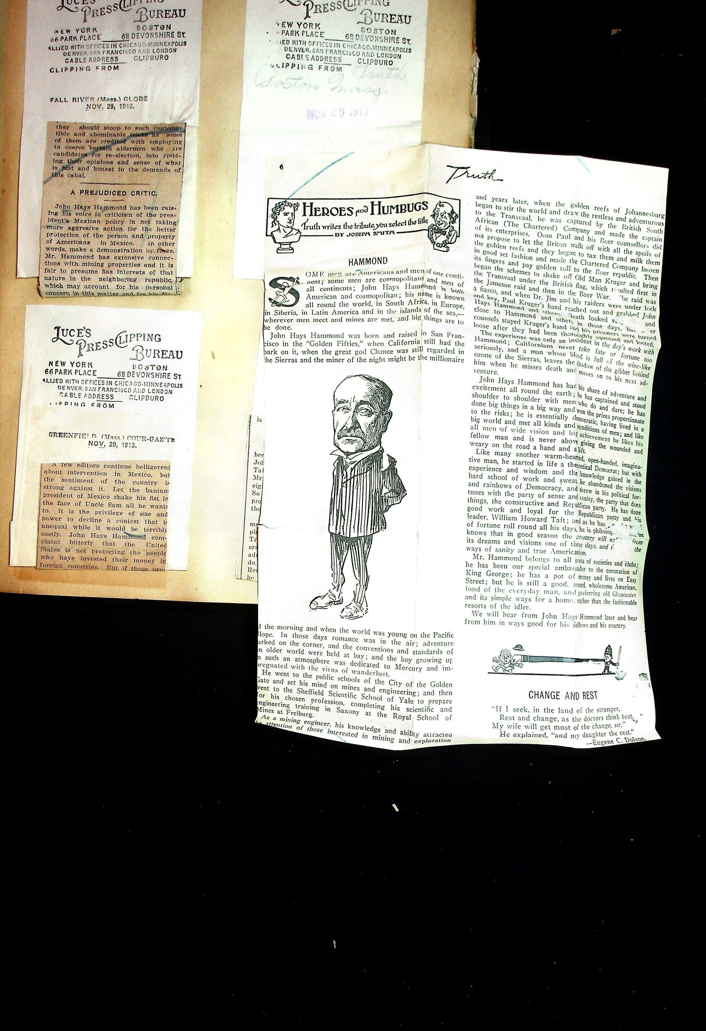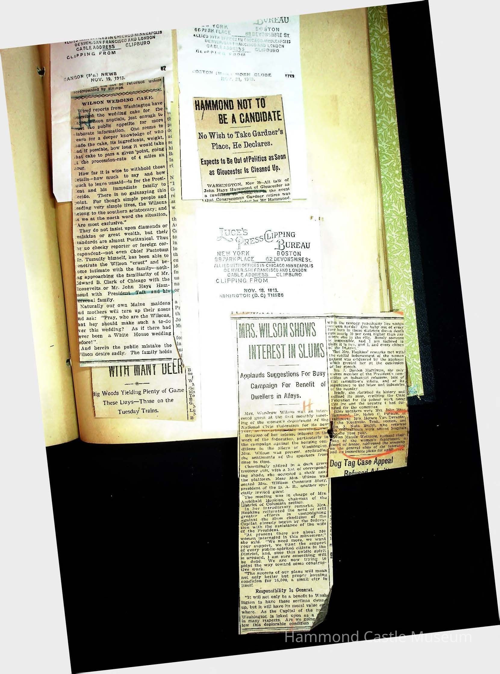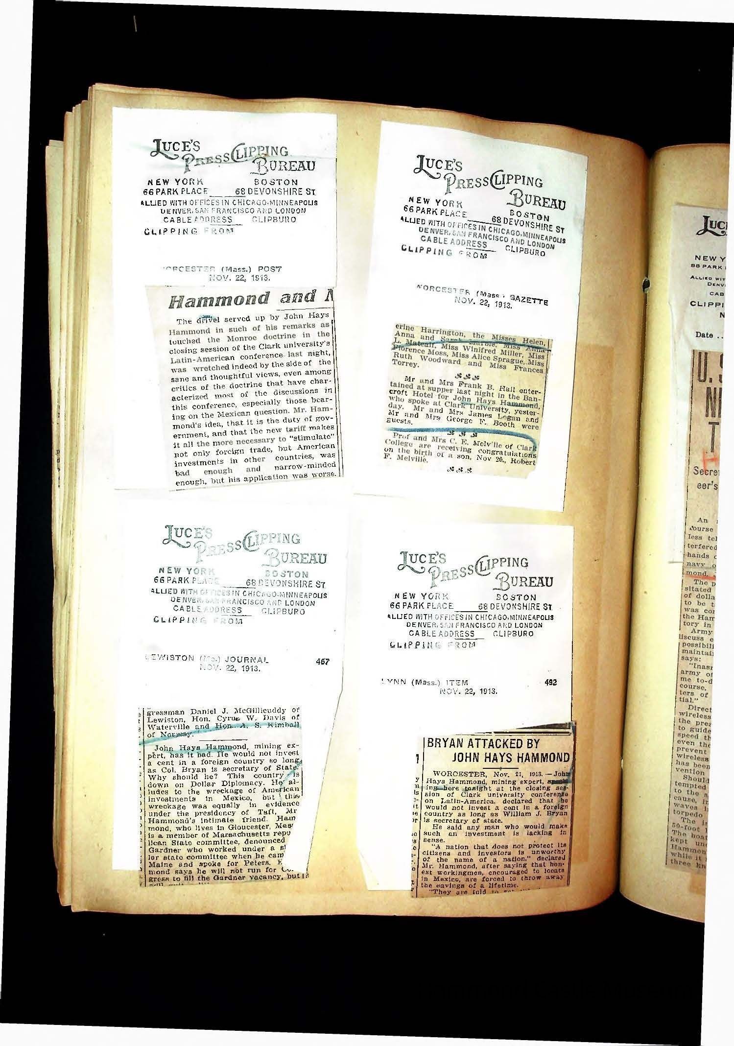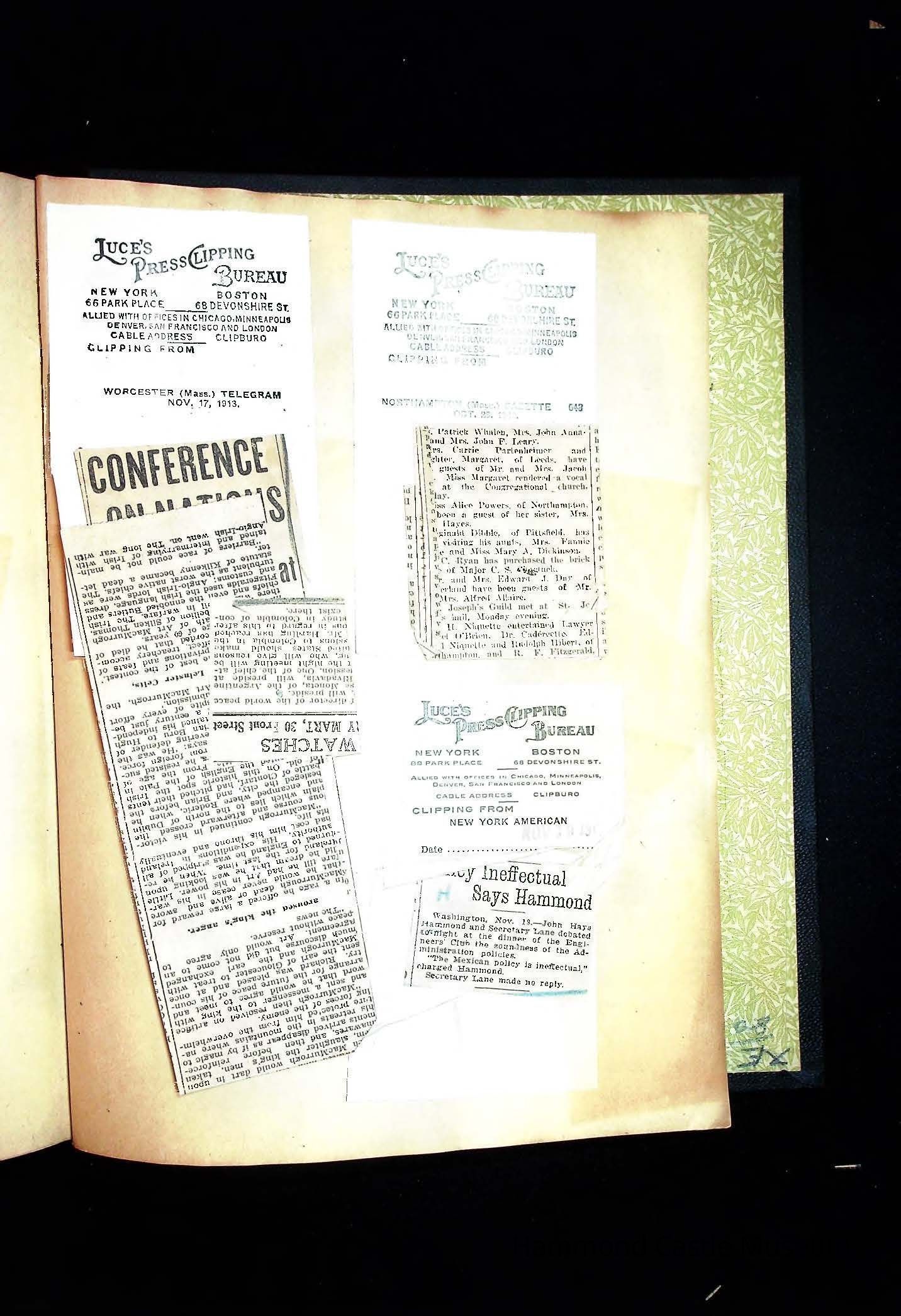 1913 scrapbook of newspaper articles about John Hays Hammond (Sr) and Mrs. Hammond covering governmental policies, Sherman Act, Eugenics & politics.