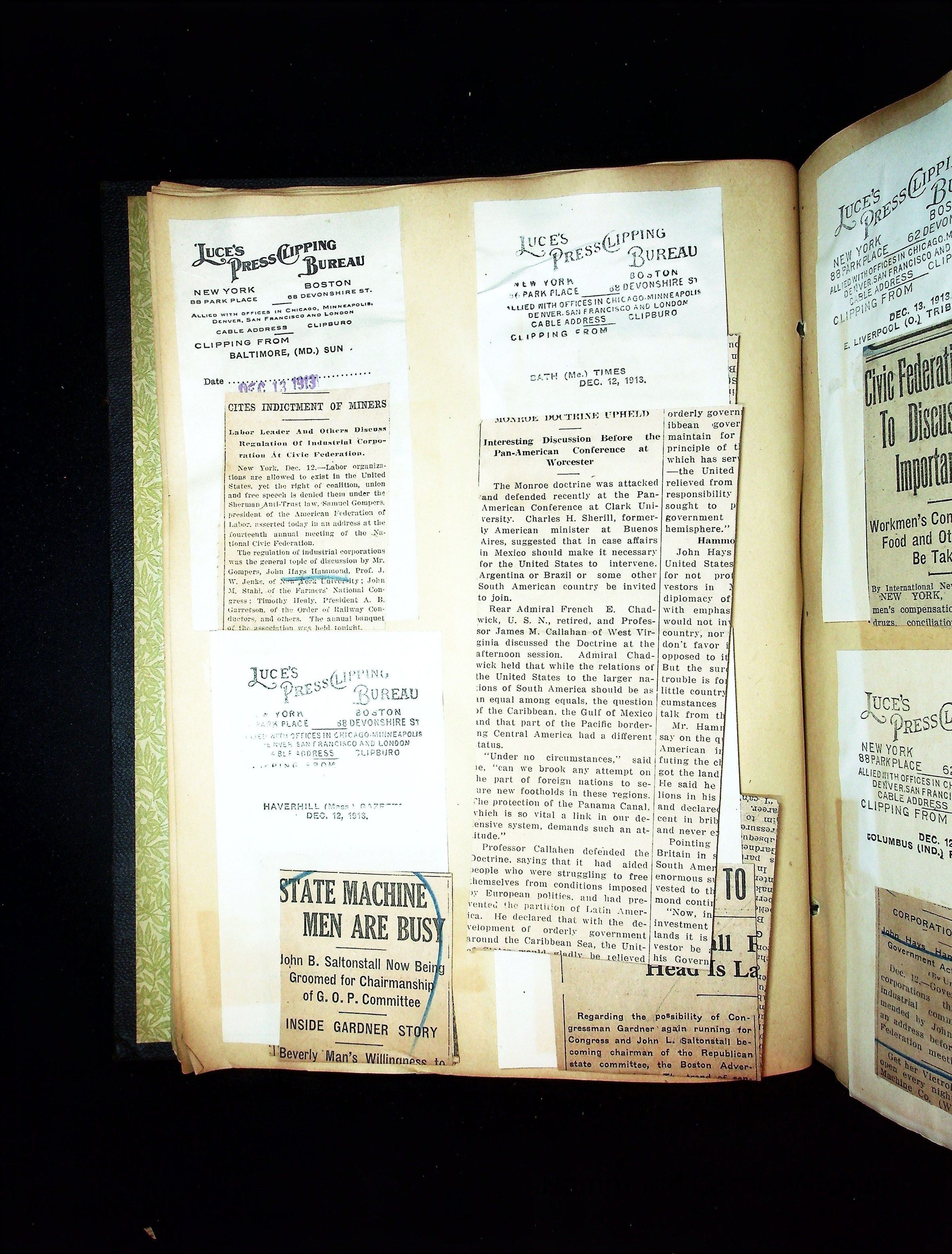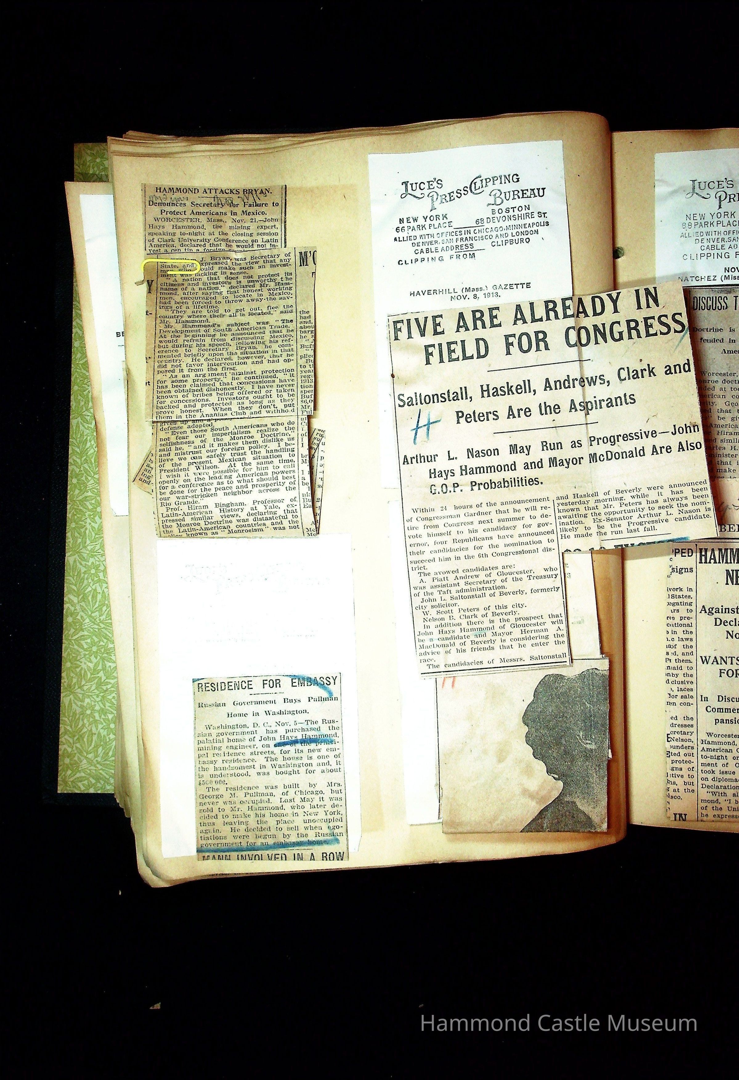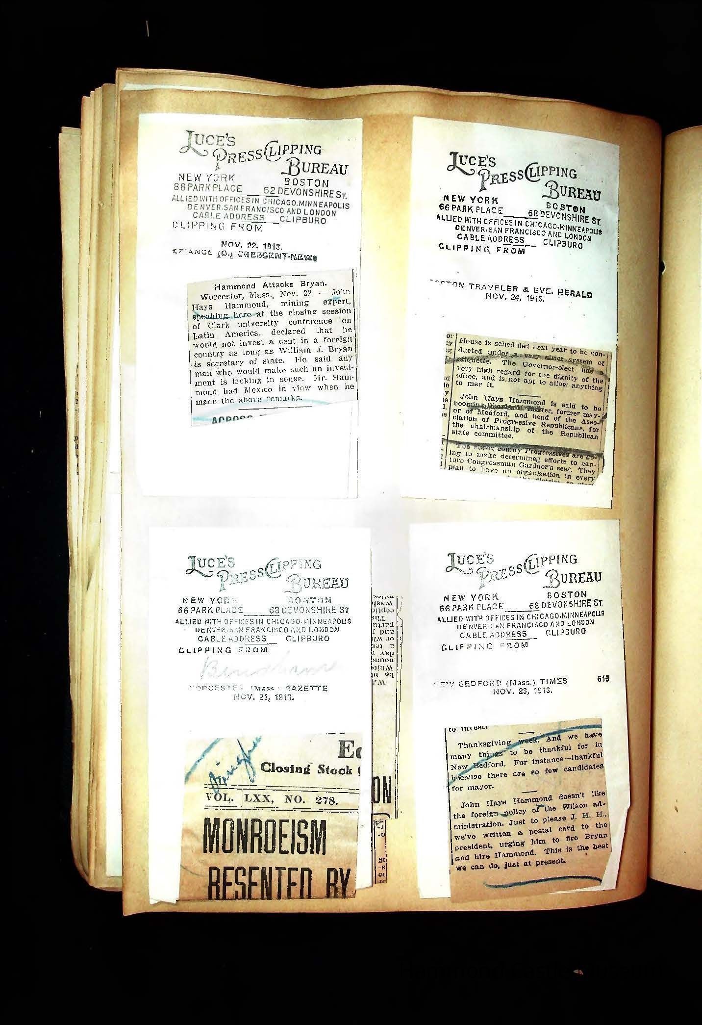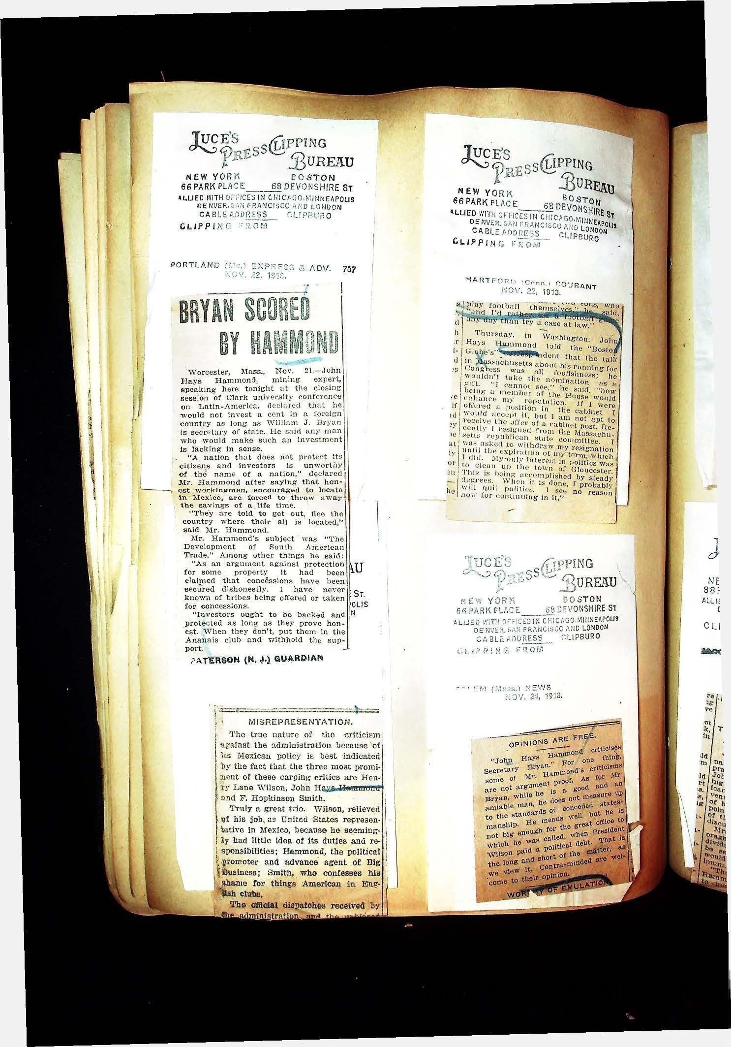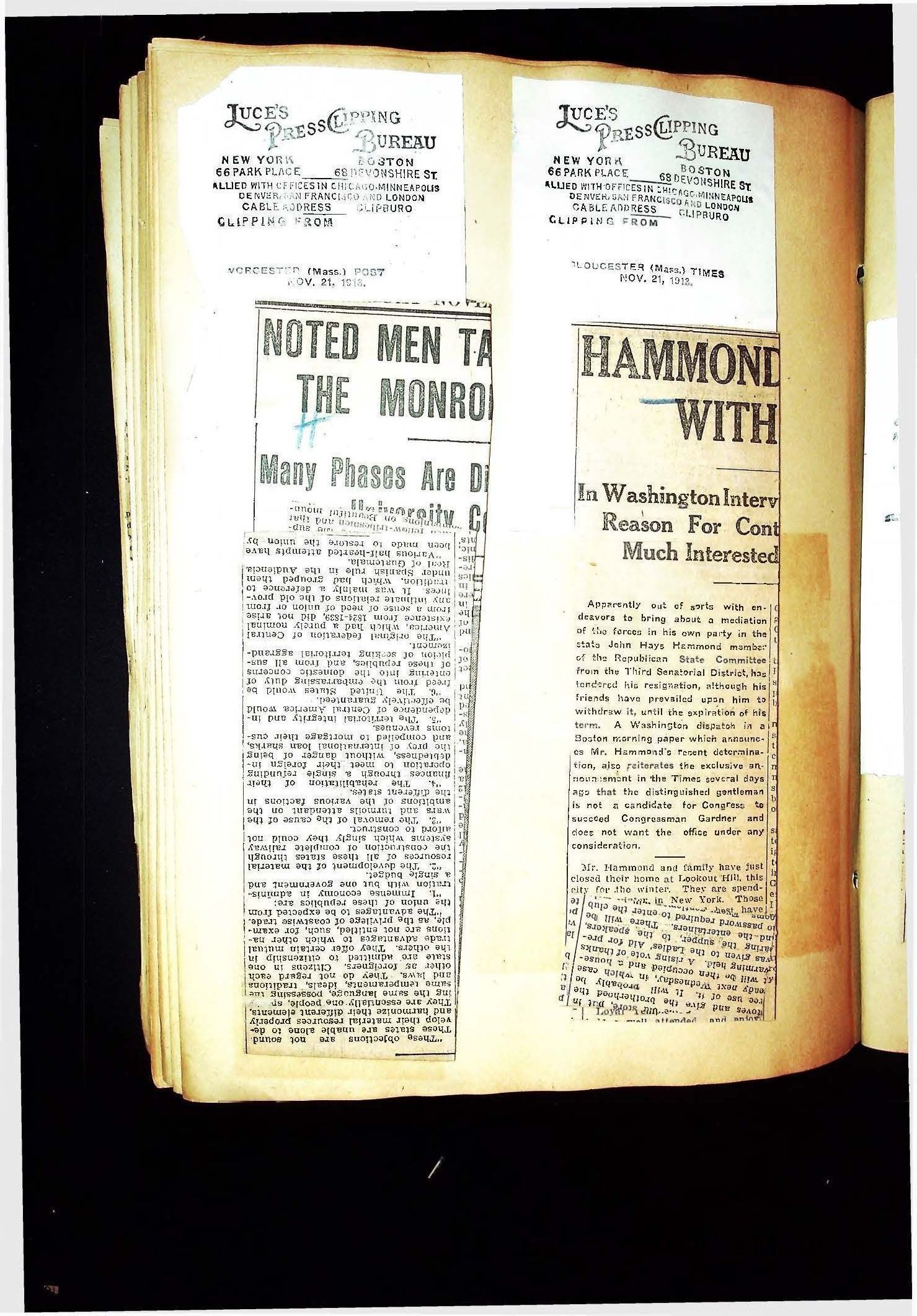 1913 scrapbook of newspaper articles about John Hays Hammond (Sr) and Mrs. Hammond covering governmental policies, Sherman Act, Eugenics & politics.