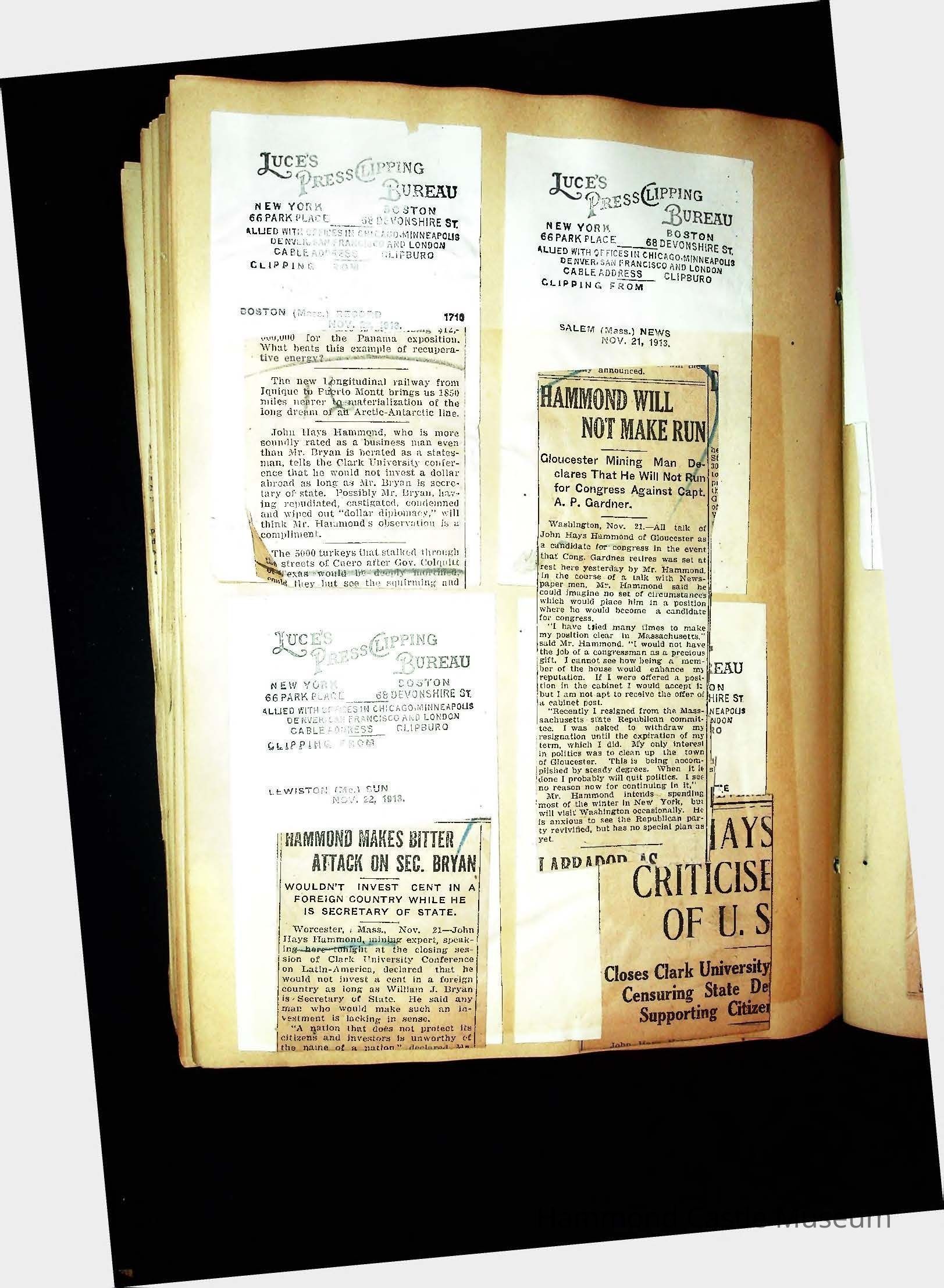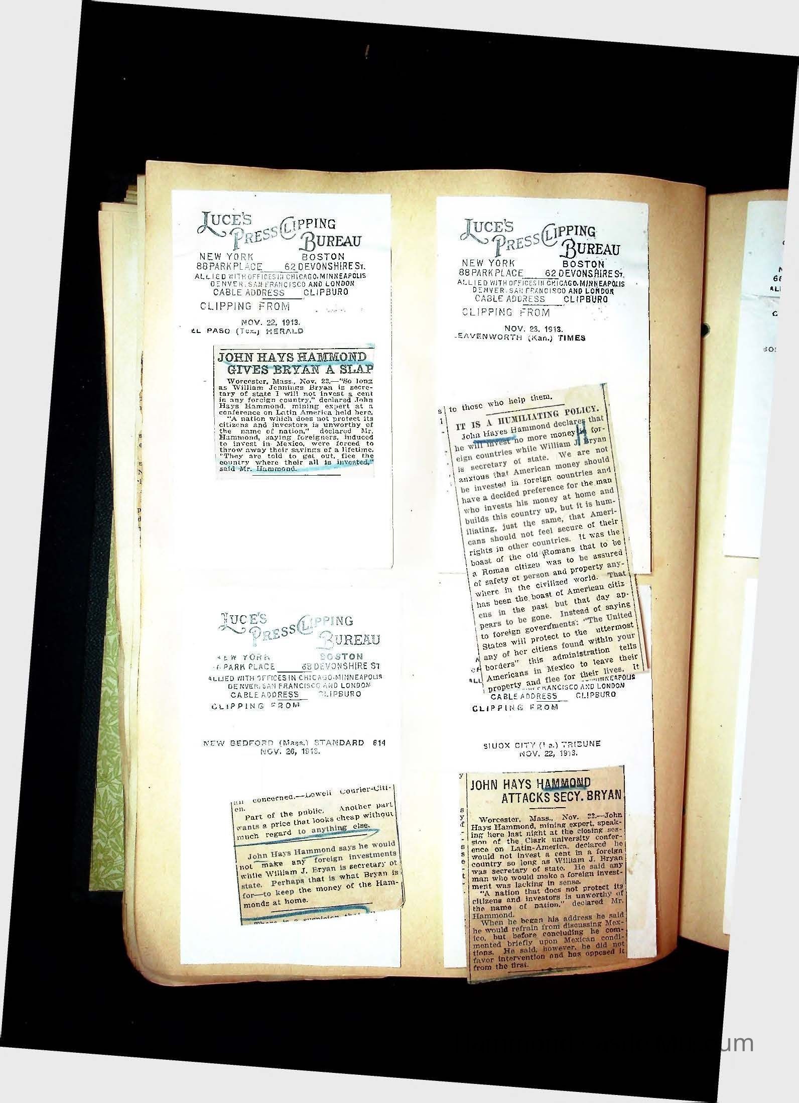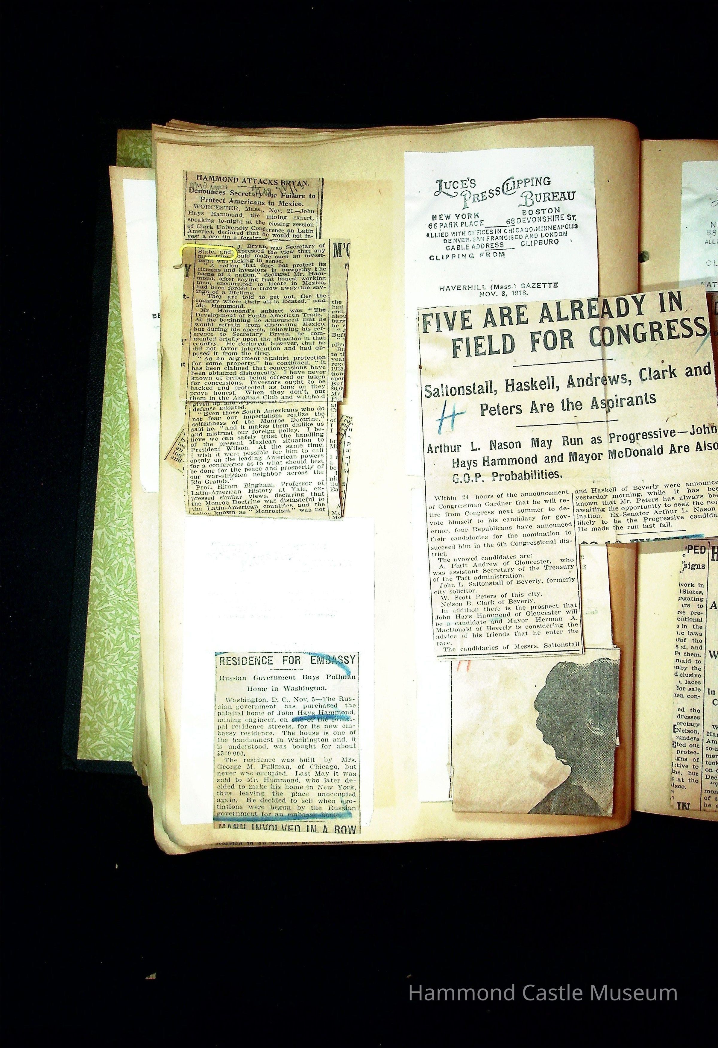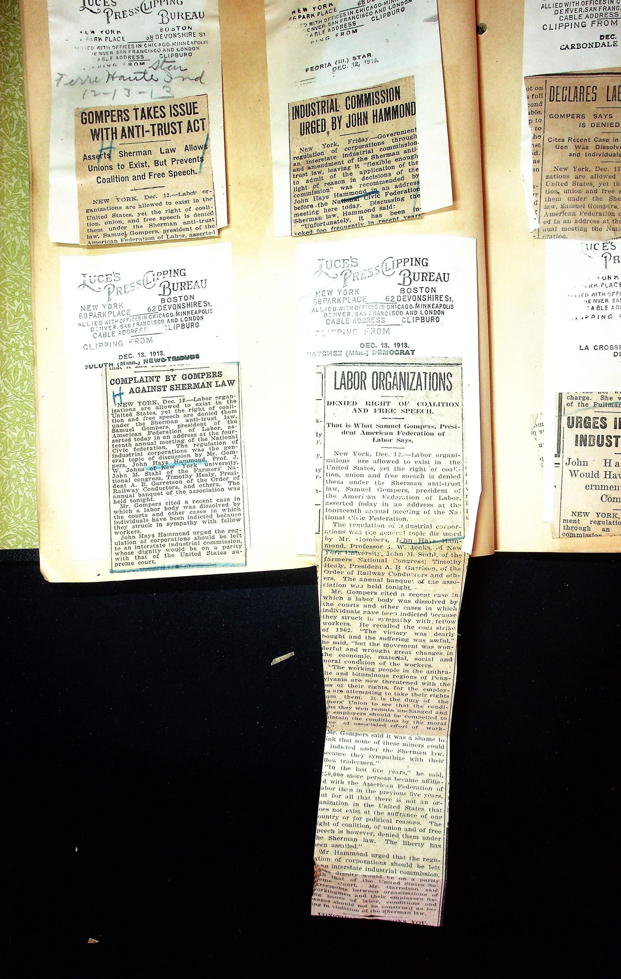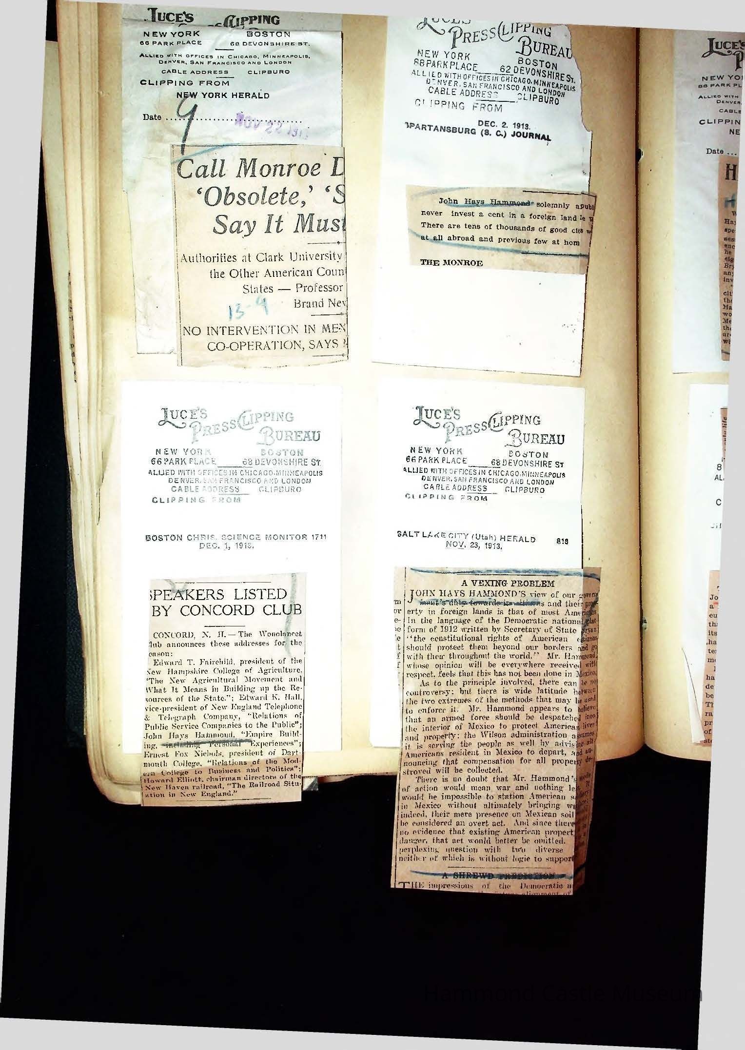 1913 scrapbook of newspaper articles about John Hays Hammond (Sr) and Mrs. Hammond covering governmental policies, Sherman Act, Eugenics & politics.