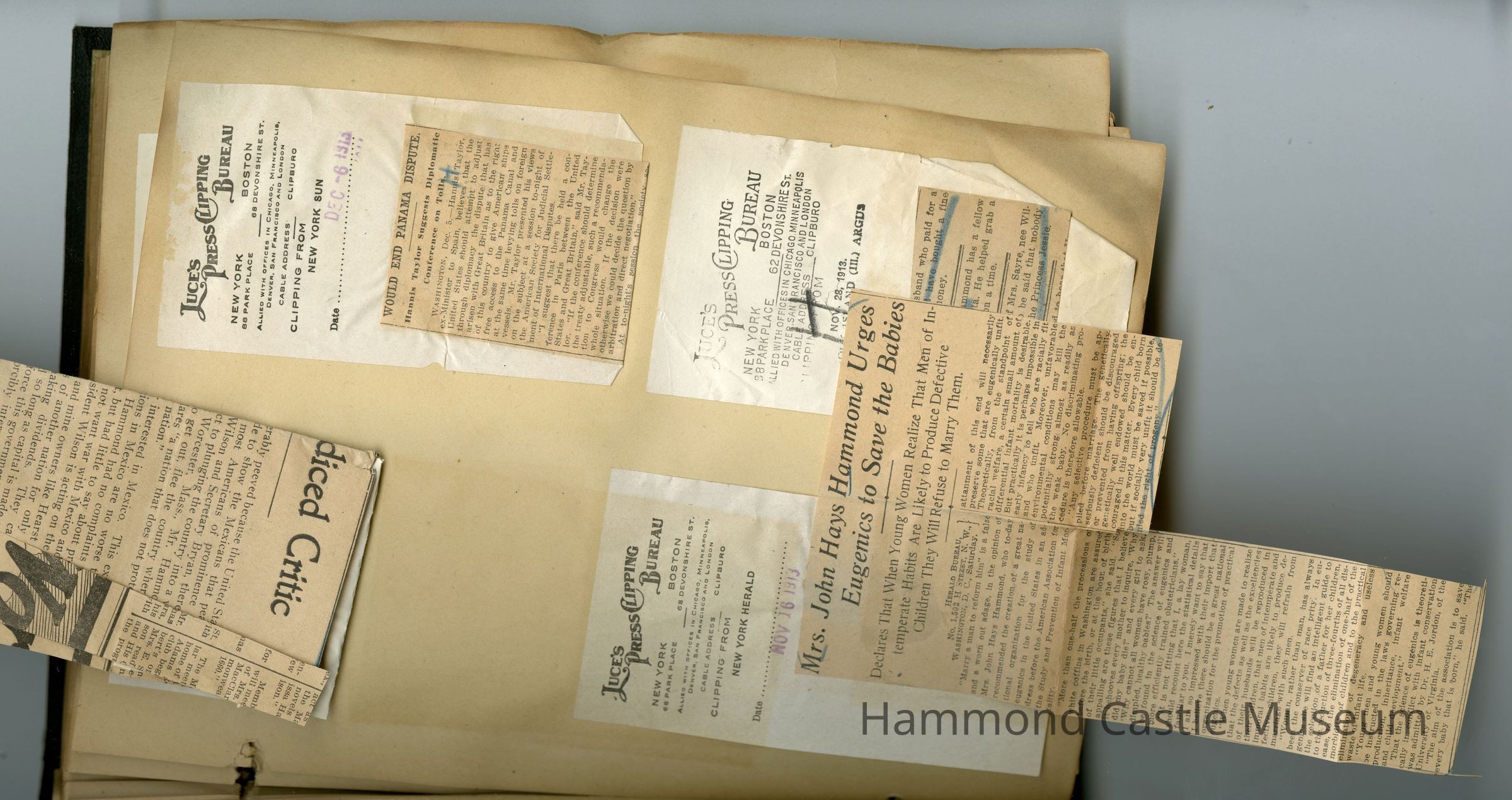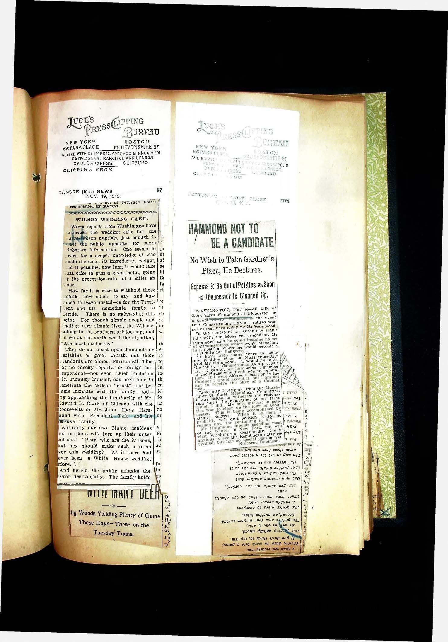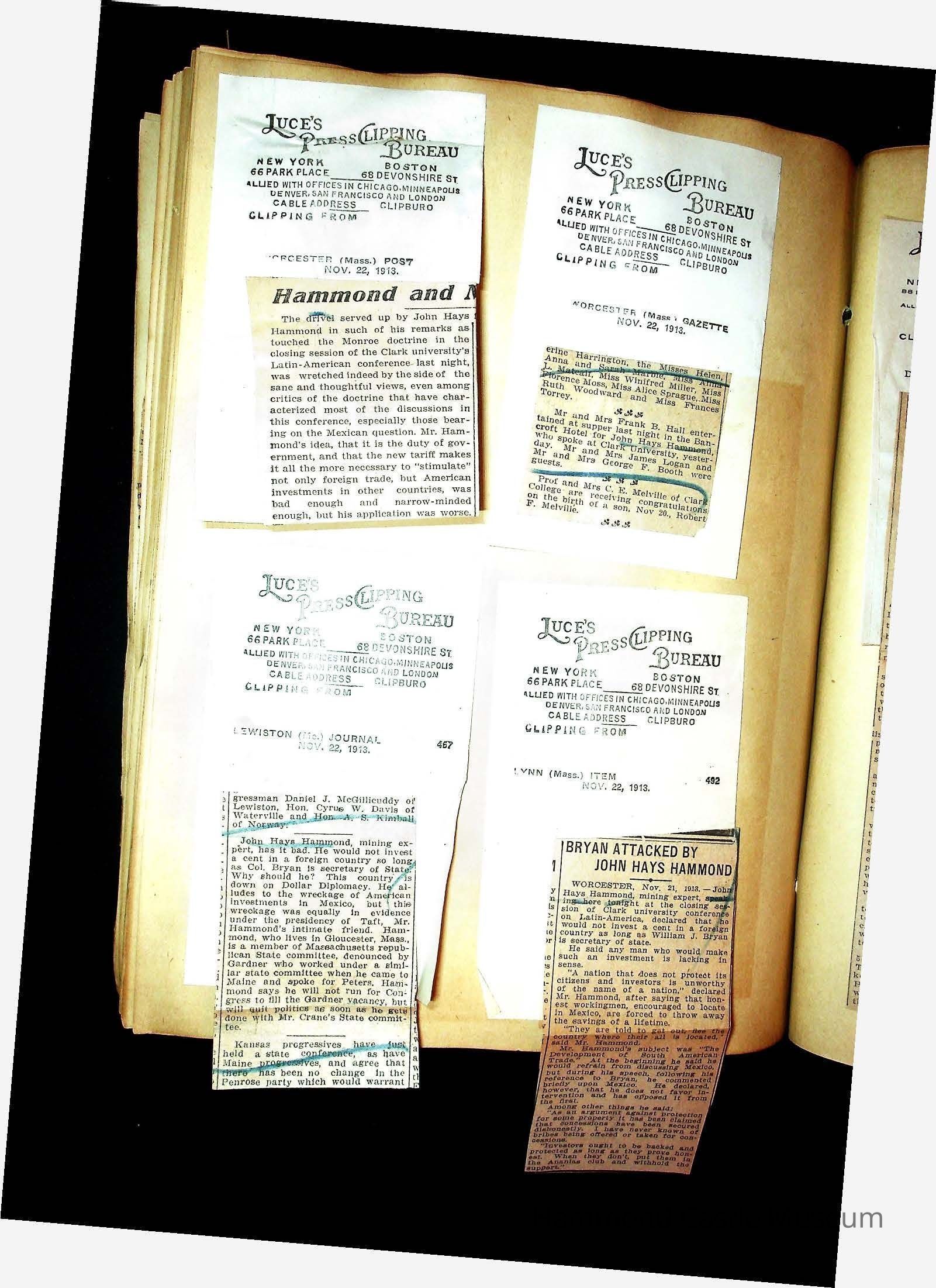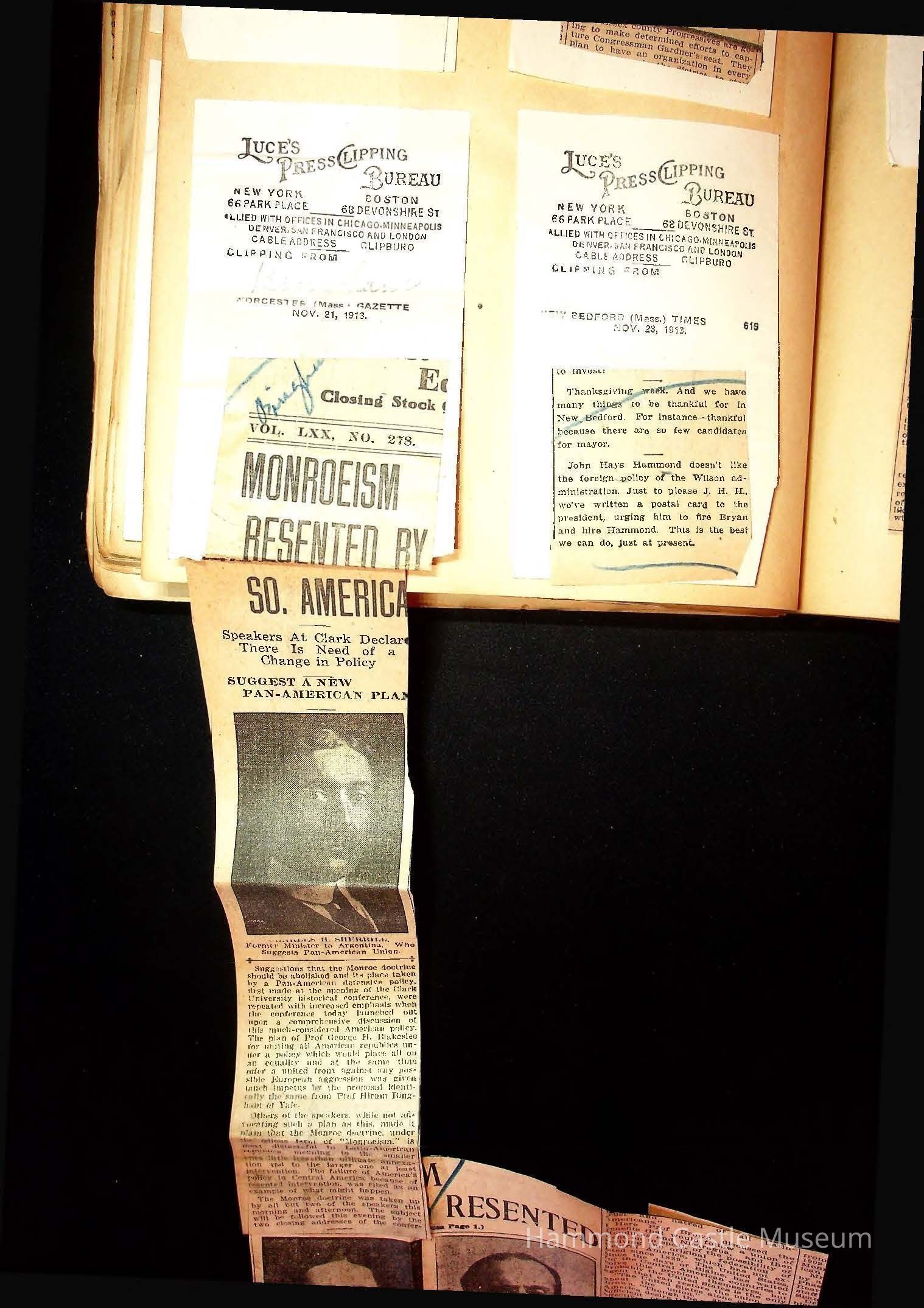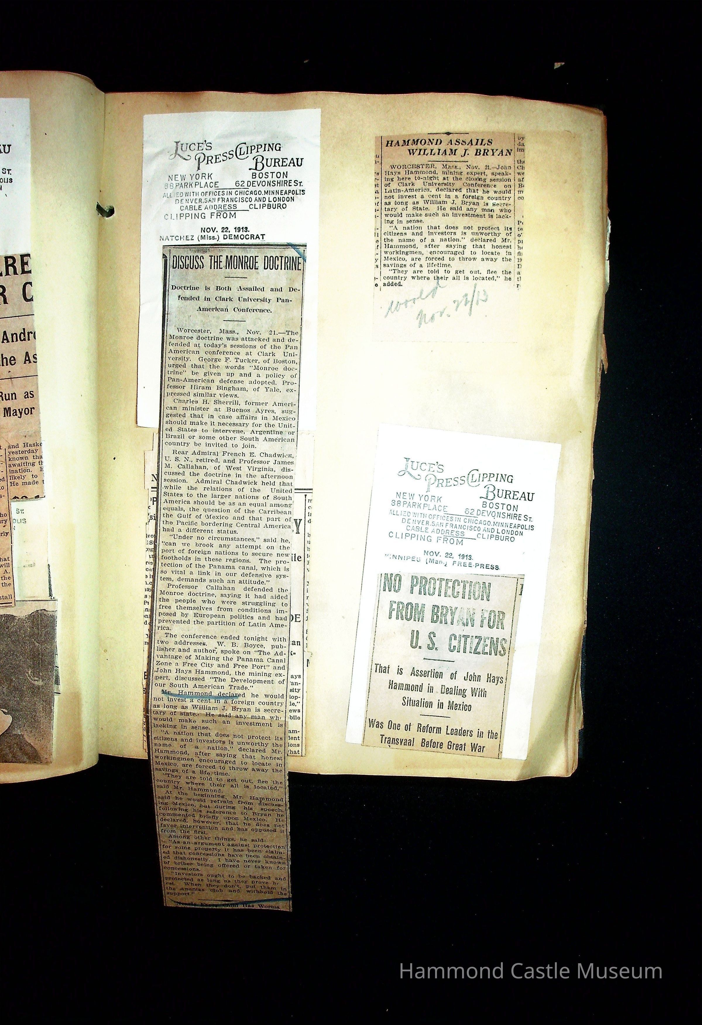 1913 scrapbook of newspaper articles about John Hays Hammond (Sr) and Mrs. Hammond covering governmental policies, Sherman Act, Eugenics & politics.