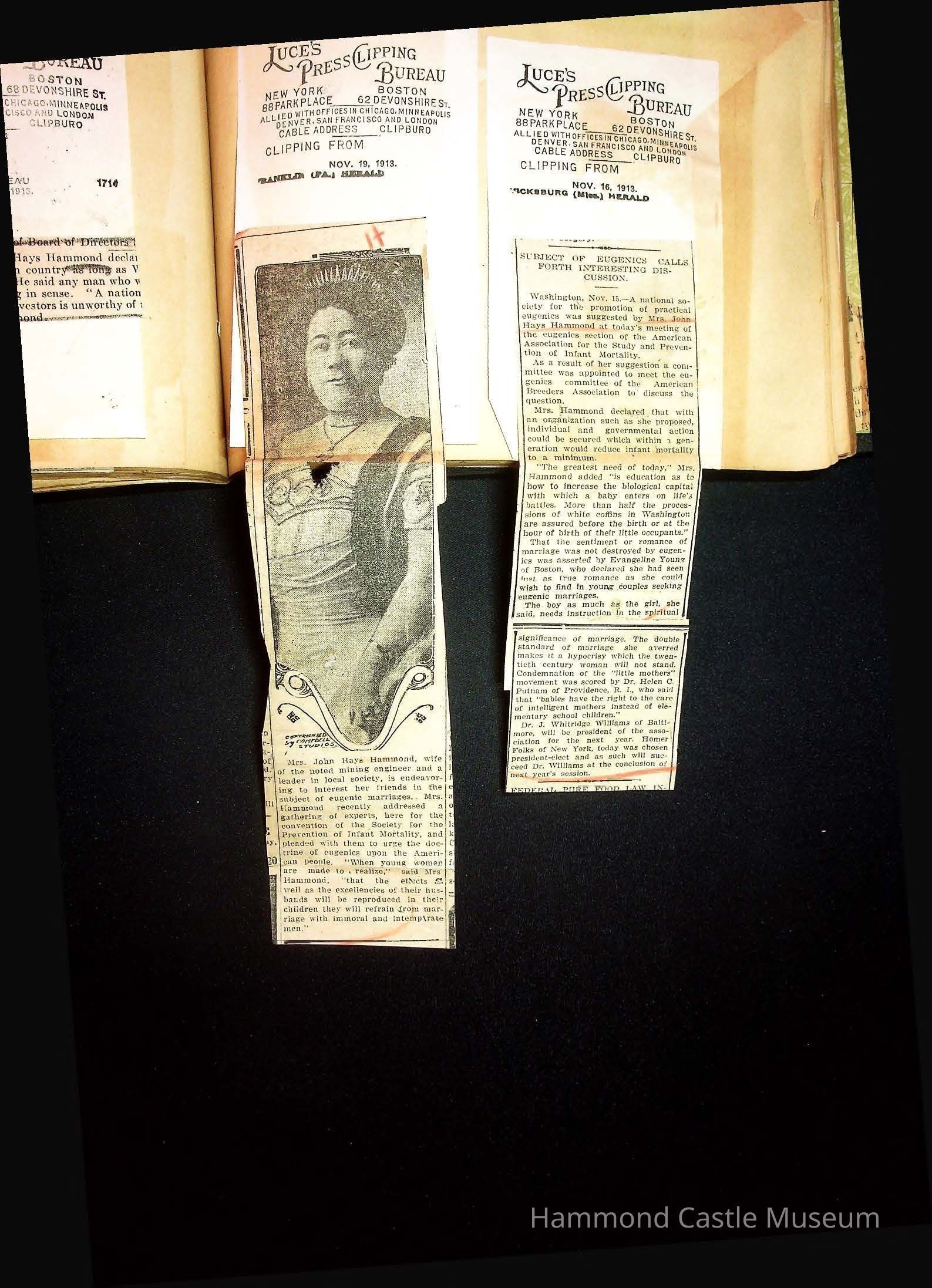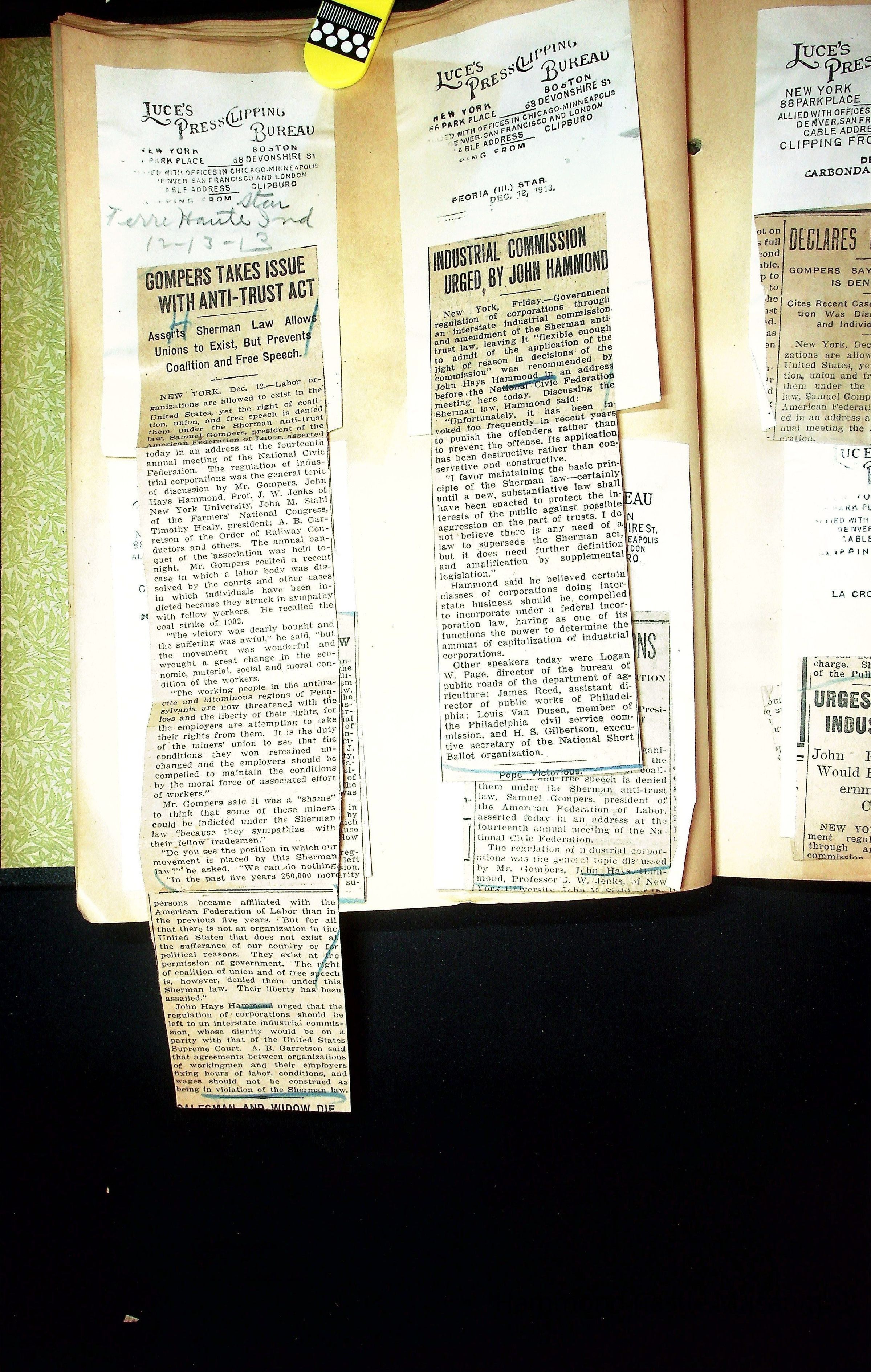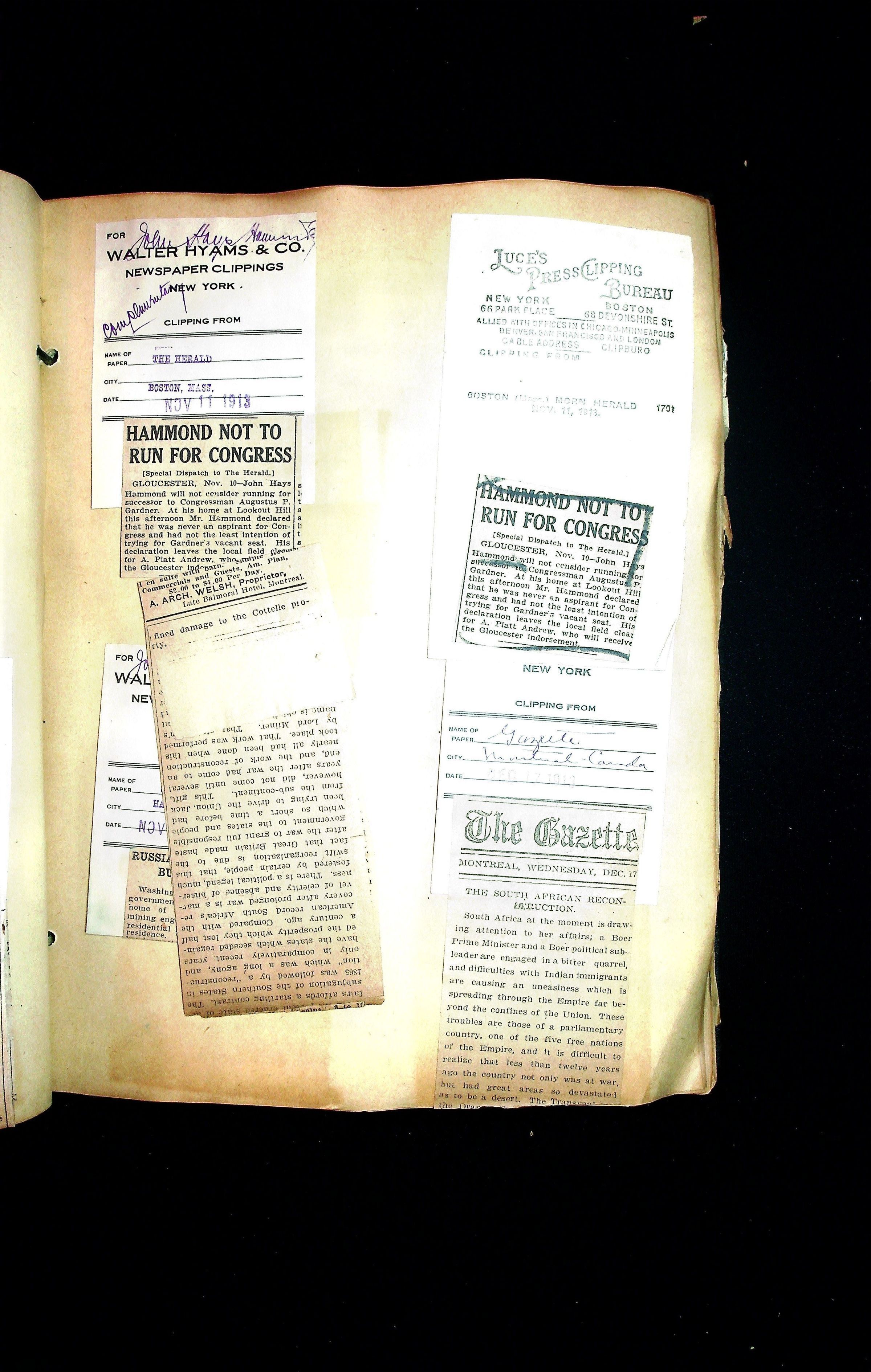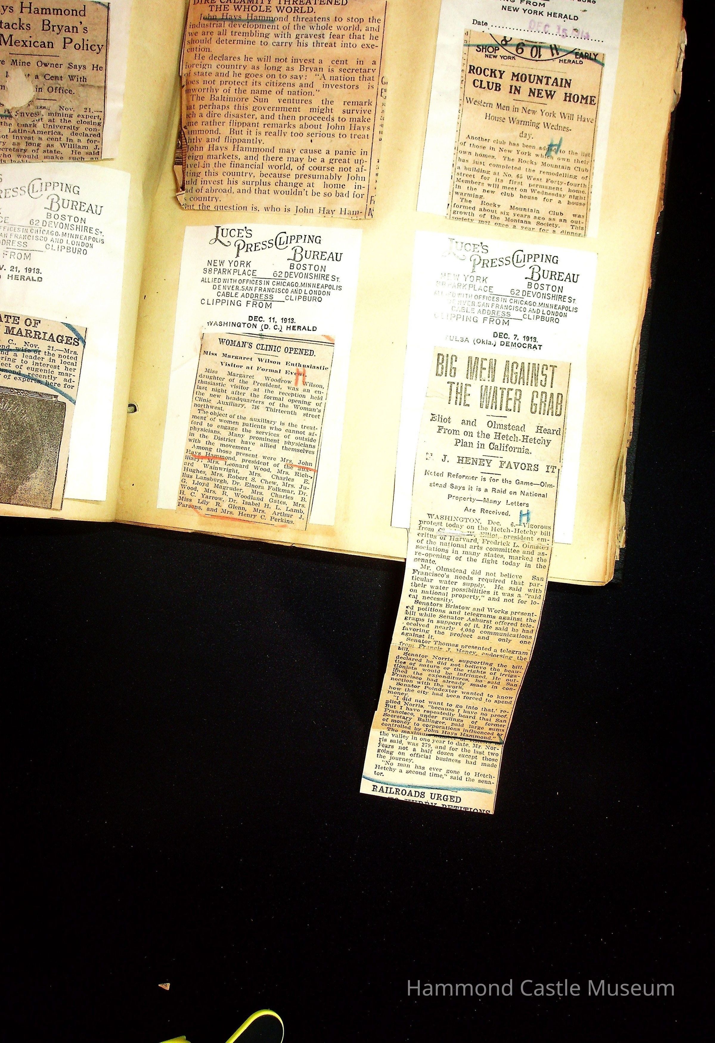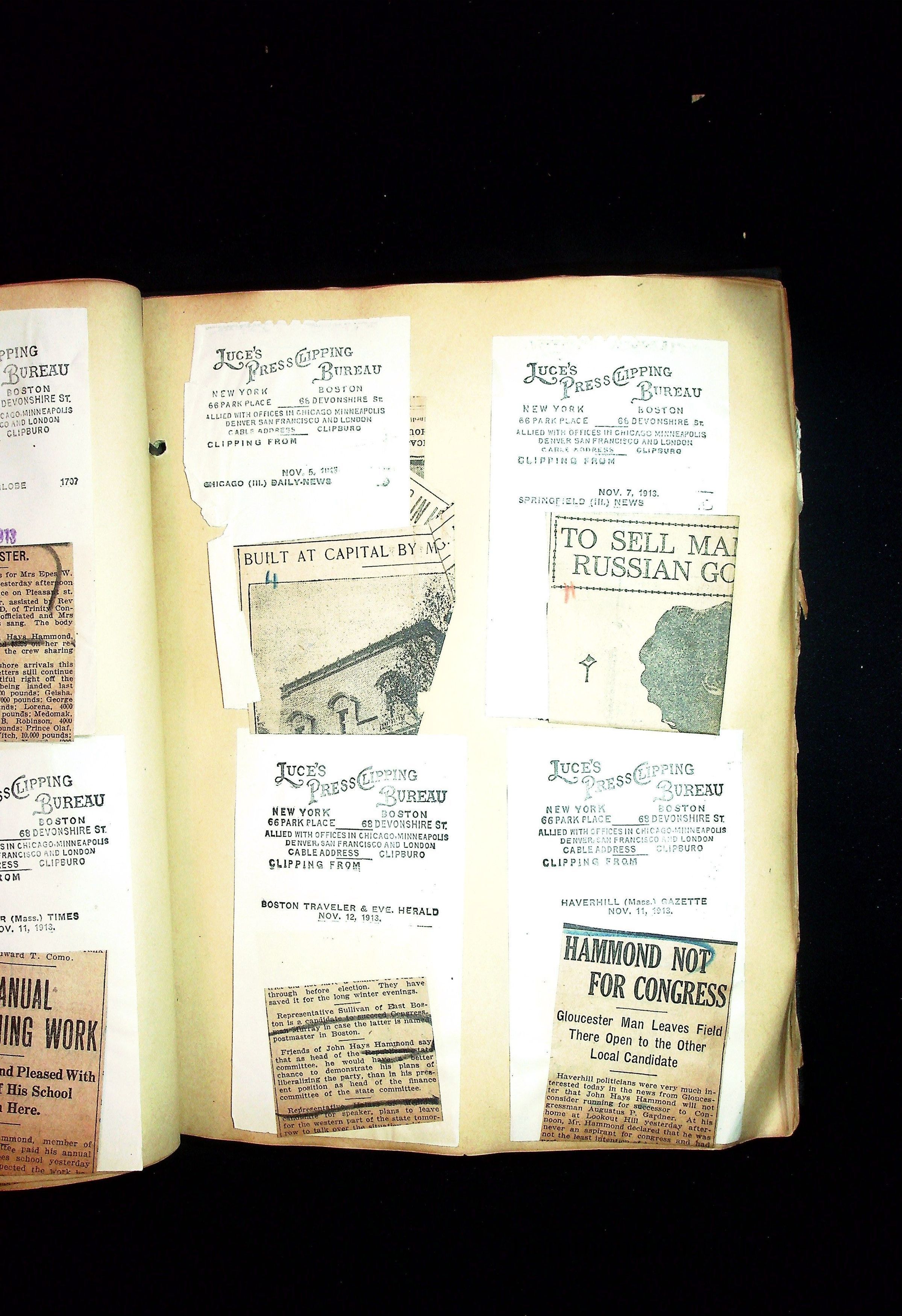 1913 scrapbook of newspaper articles about John Hays Hammond (Sr) and Mrs. Hammond covering governmental policies, Sherman Act, Eugenics & politics.