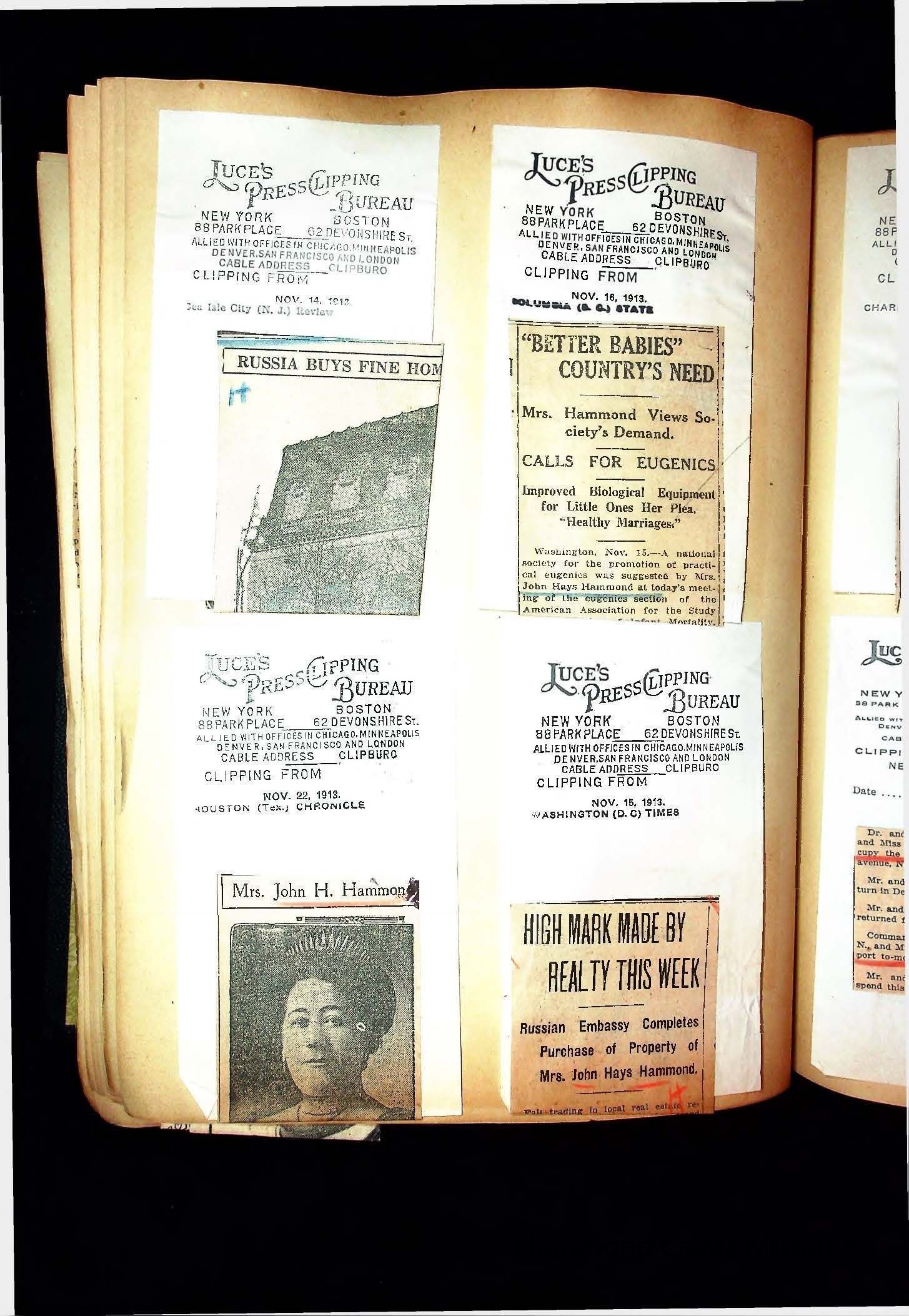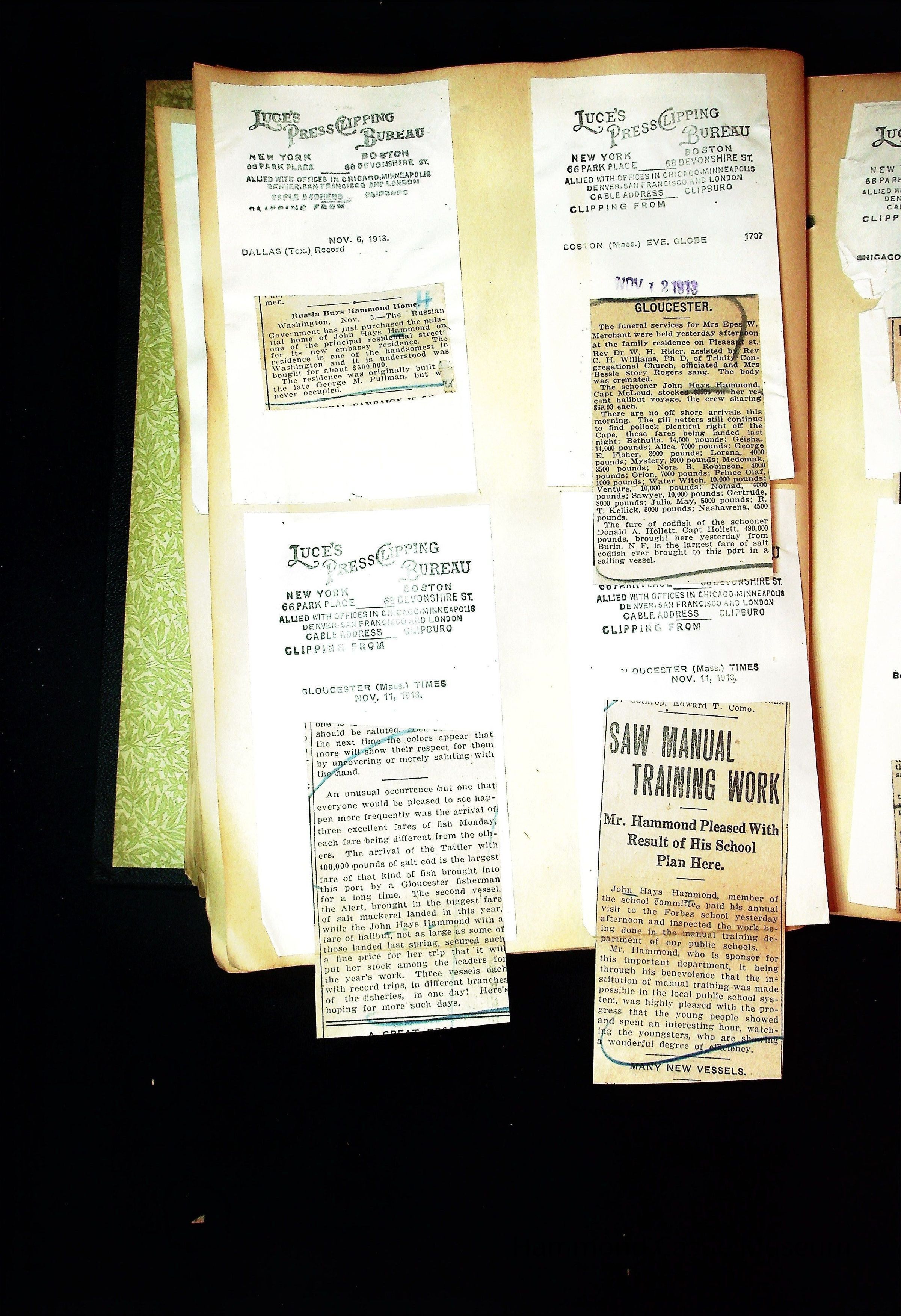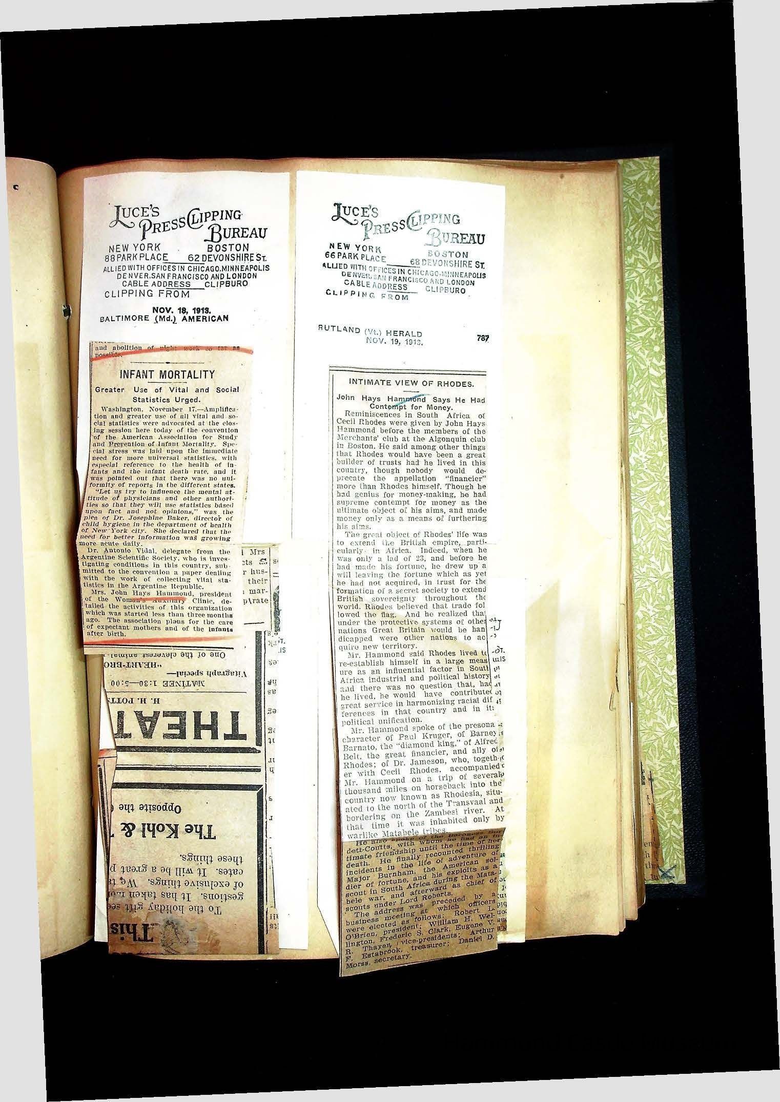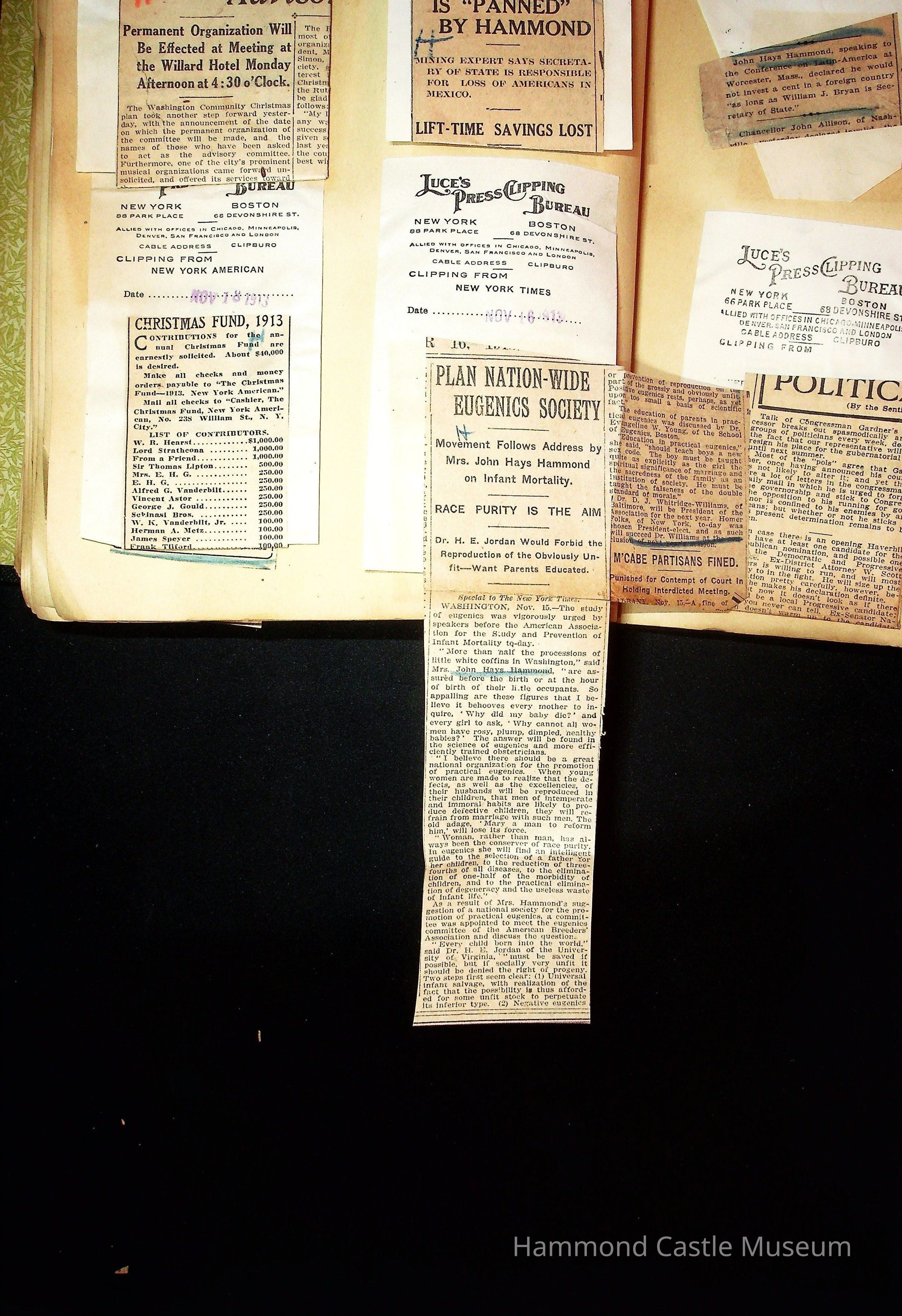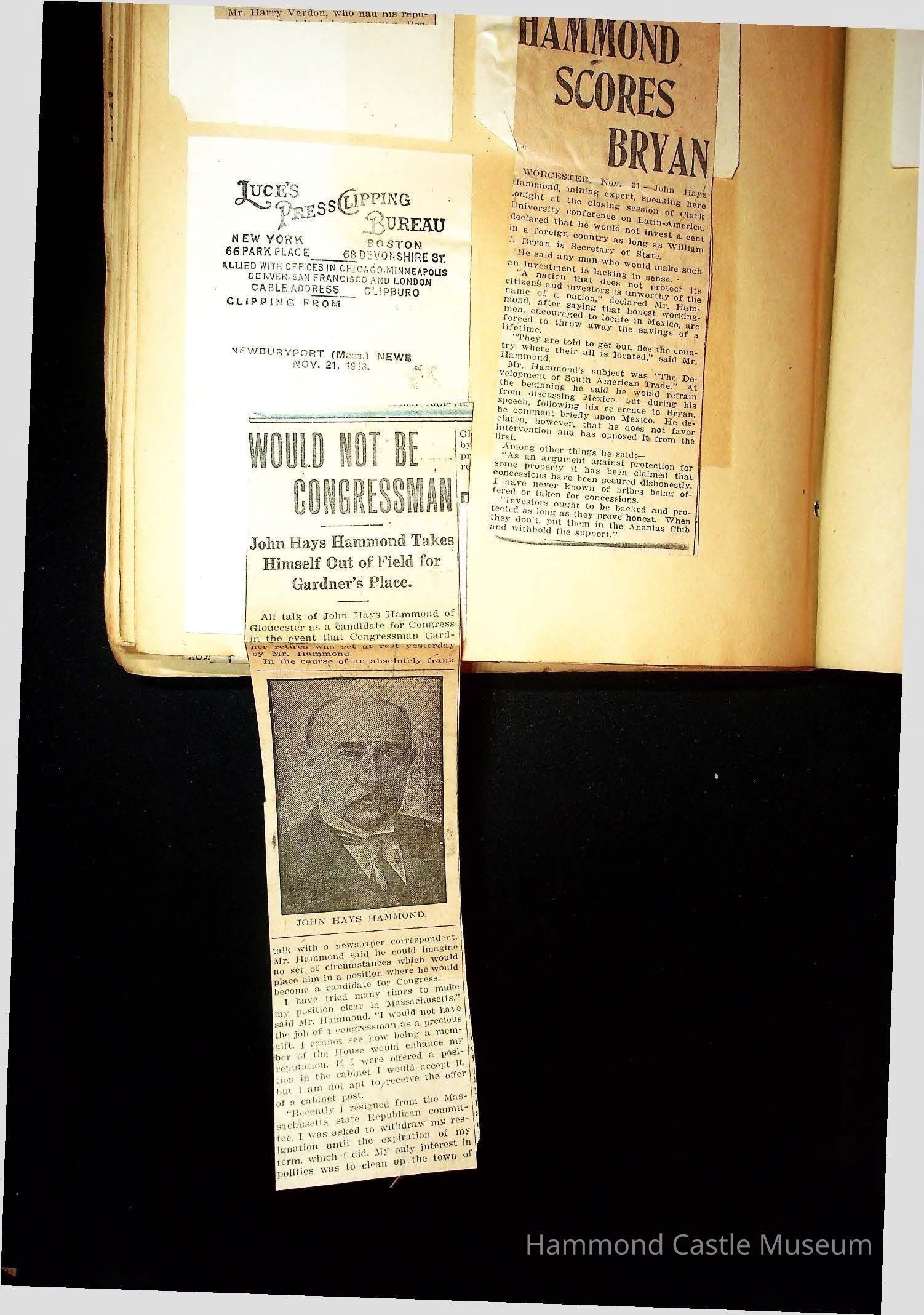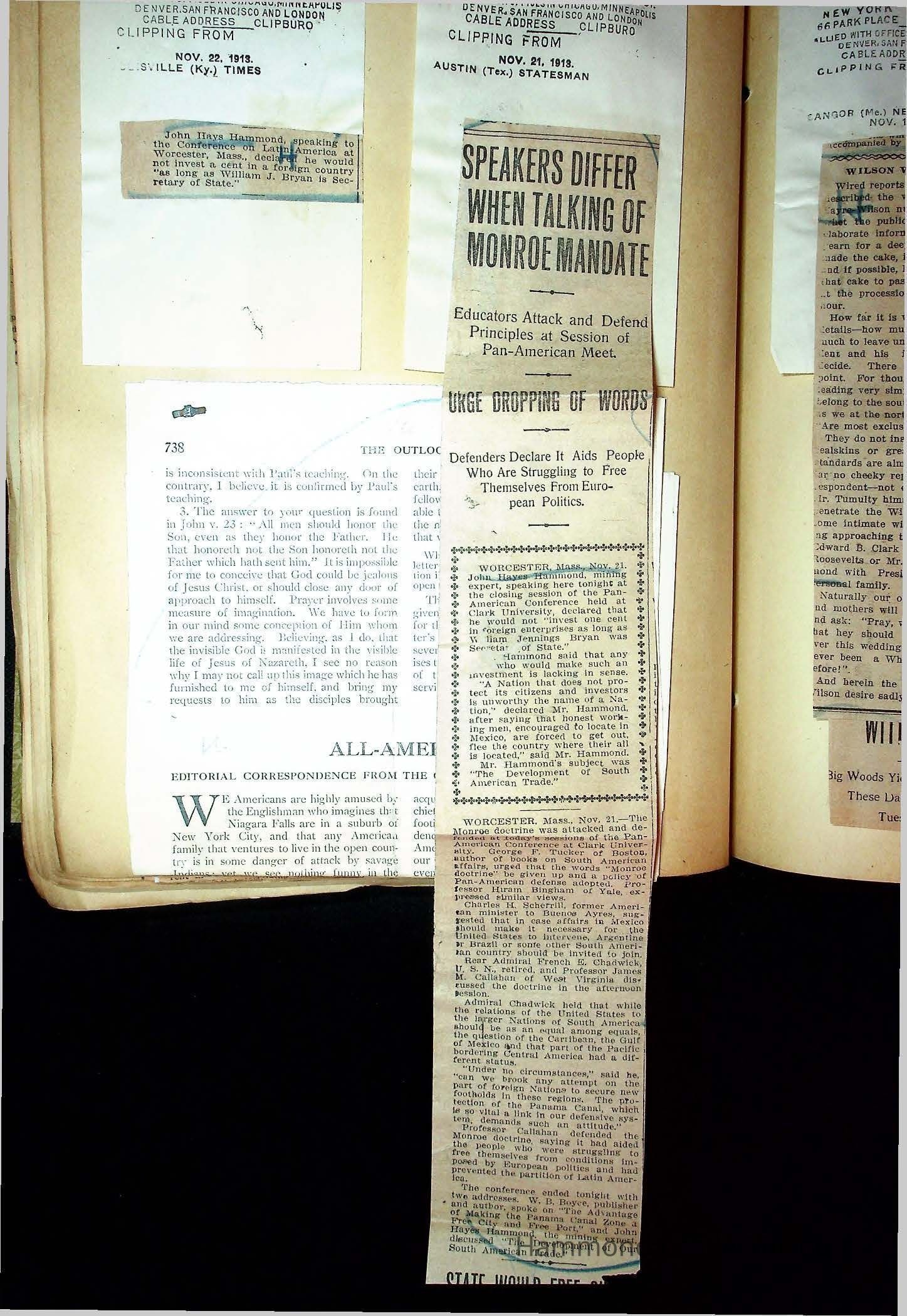 1913 scrapbook of newspaper articles about John Hays Hammond (Sr) and Mrs. Hammond covering governmental policies, Sherman Act, Eugenics & politics.