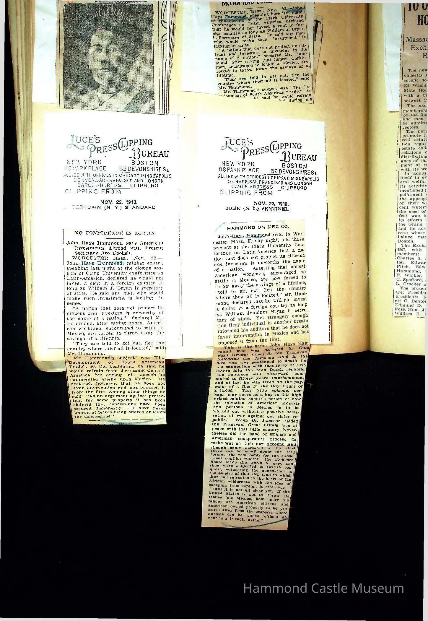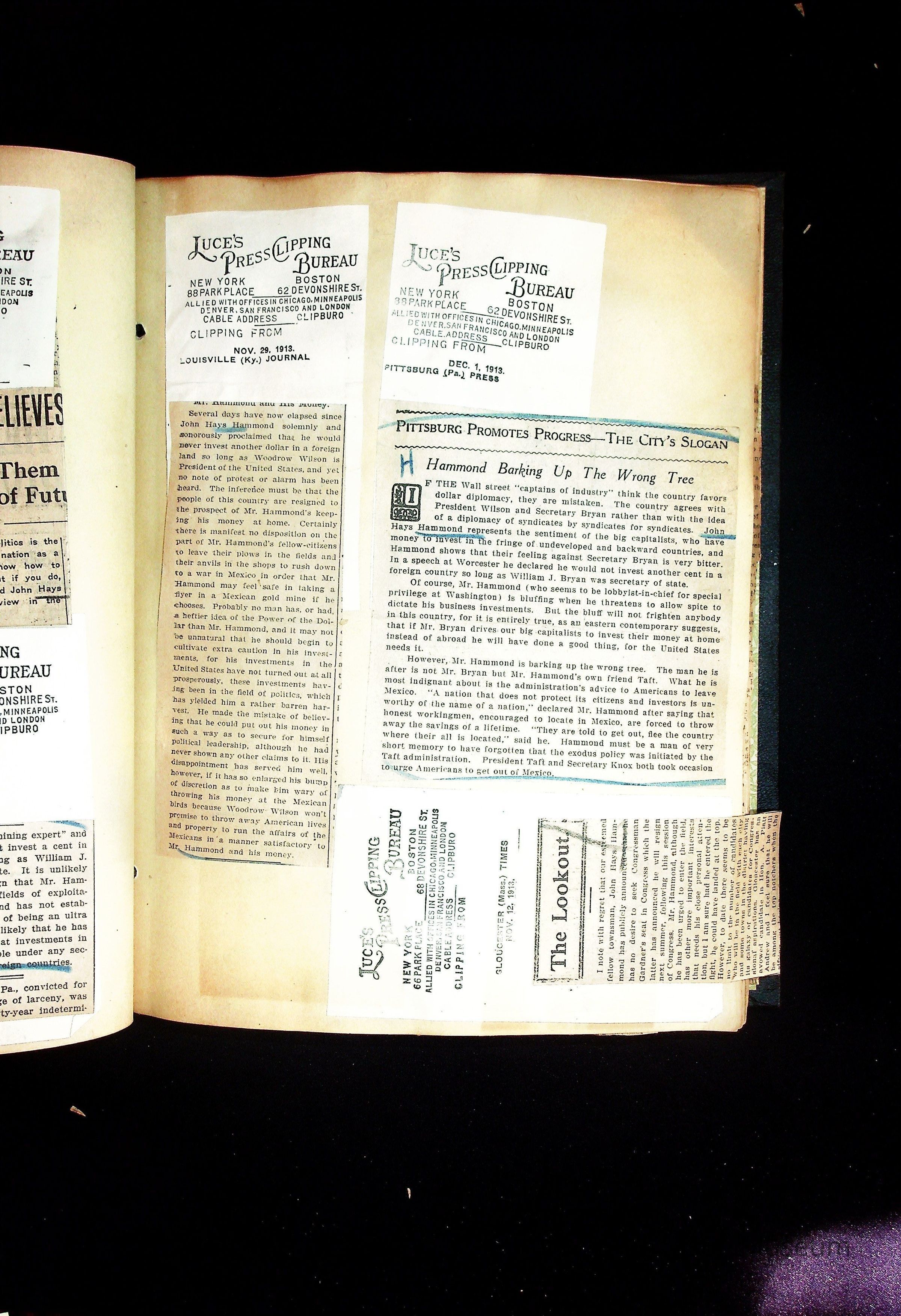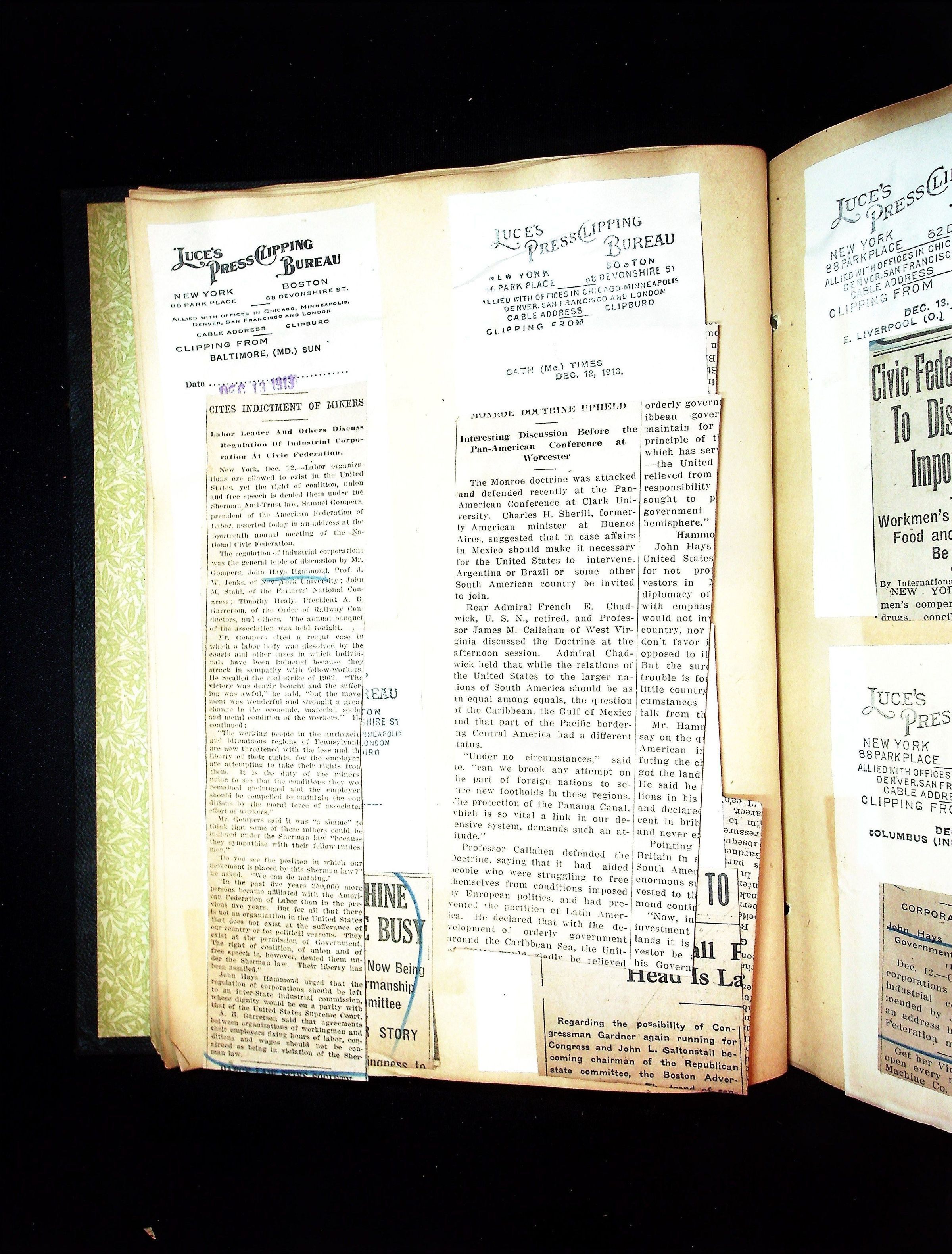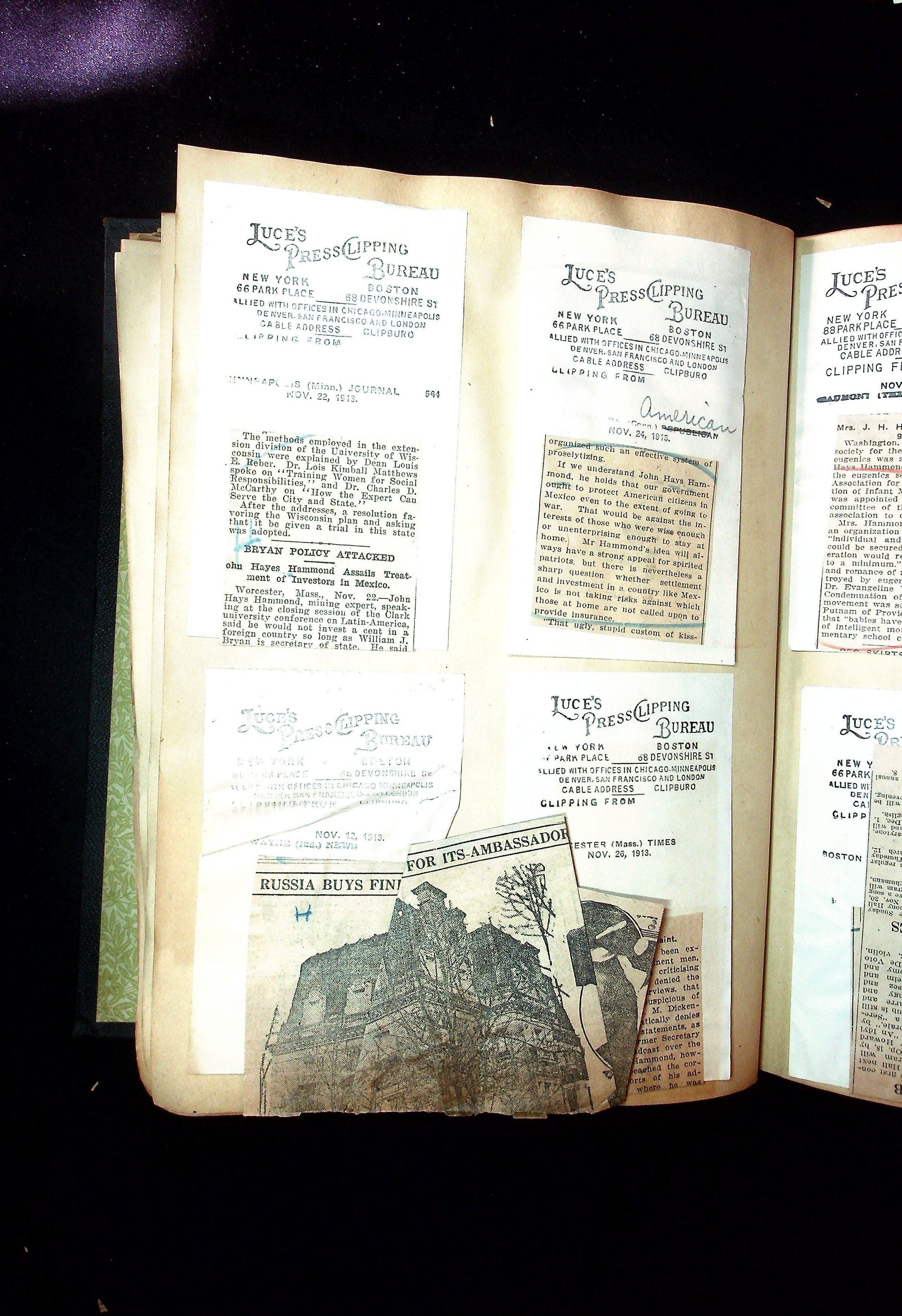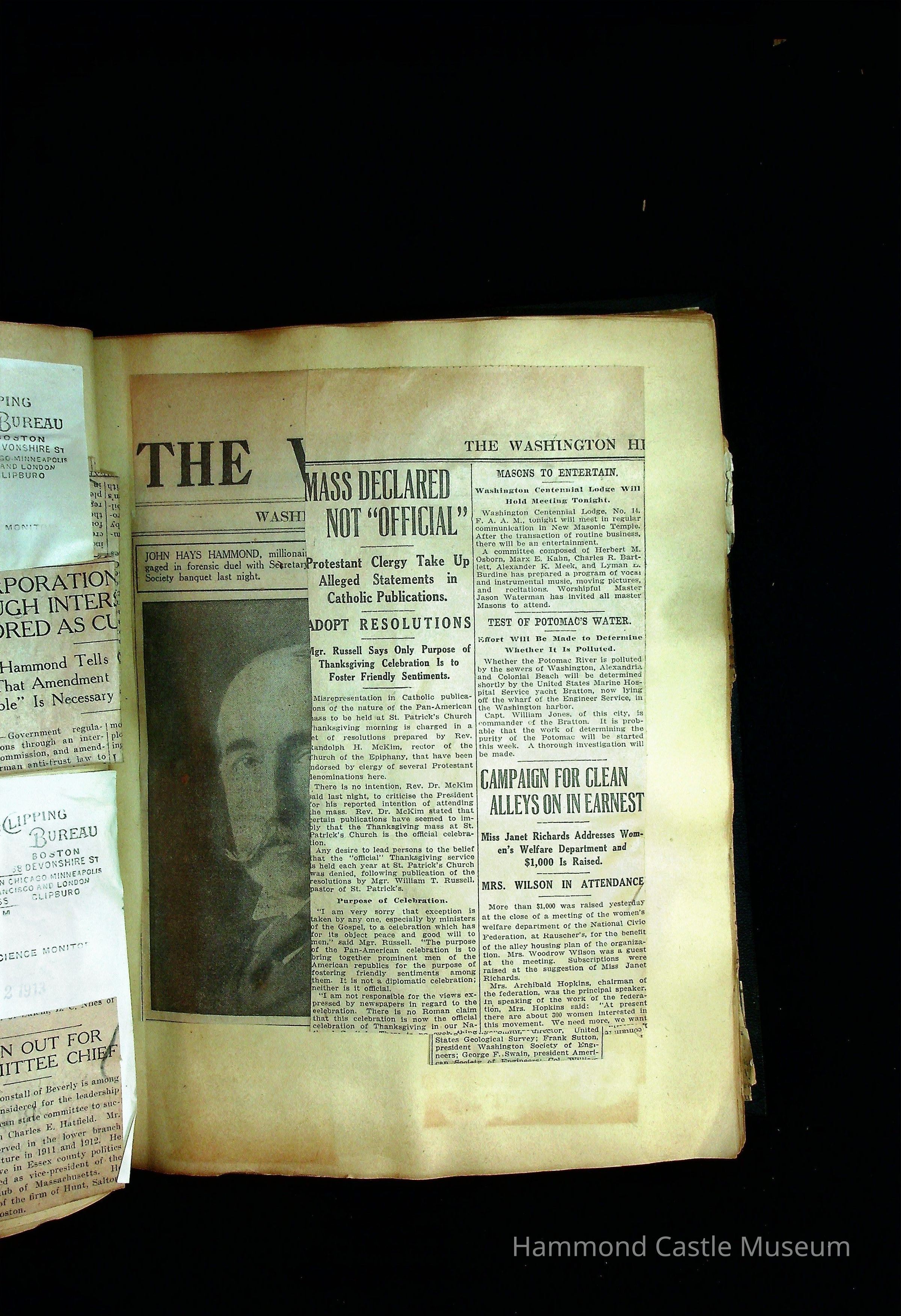 1913 scrapbook of newspaper articles about John Hays Hammond (Sr) and Mrs. Hammond covering governmental policies, Sherman Act, Eugenics & politics.