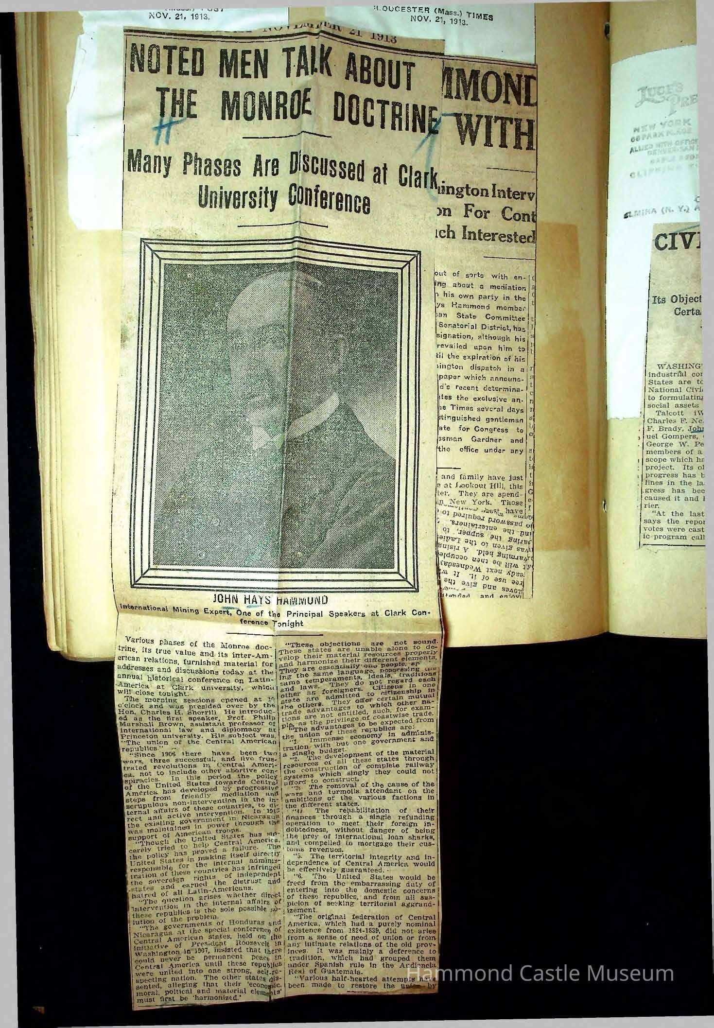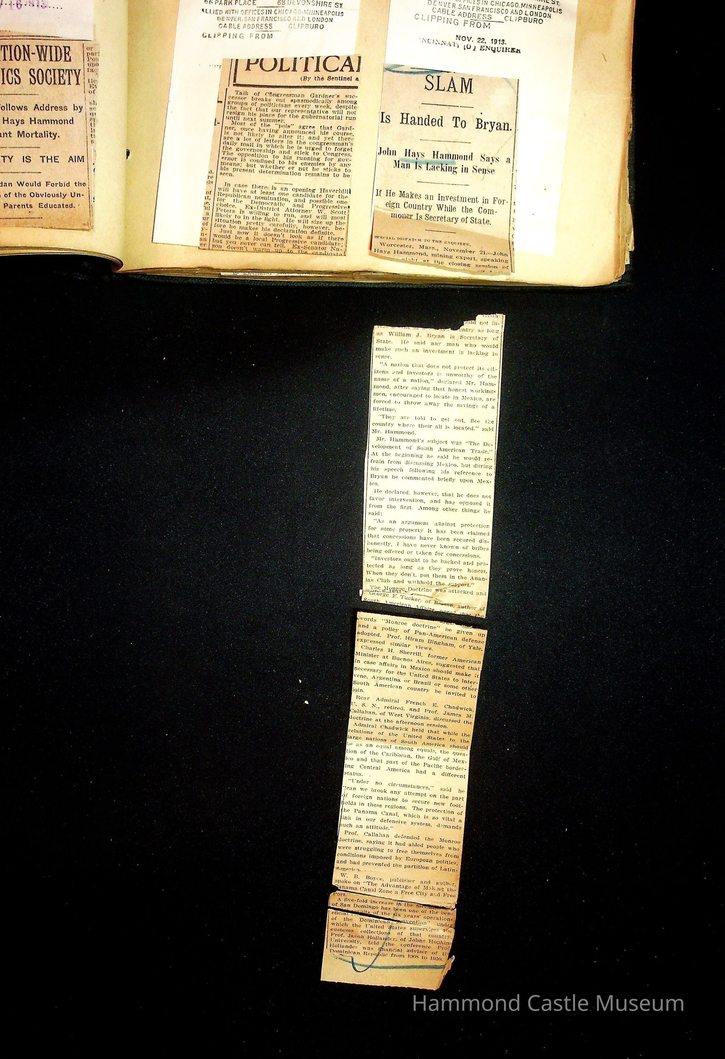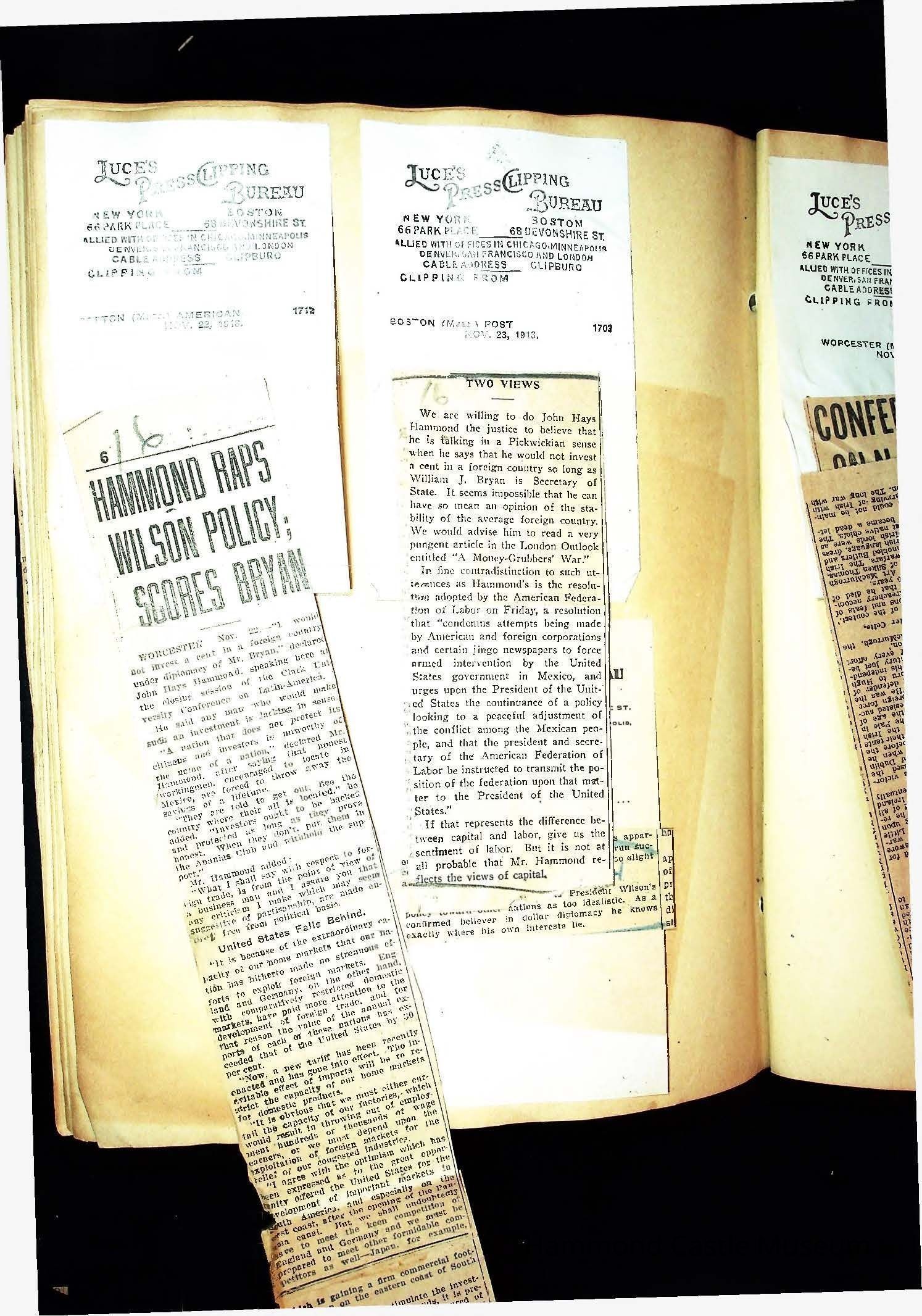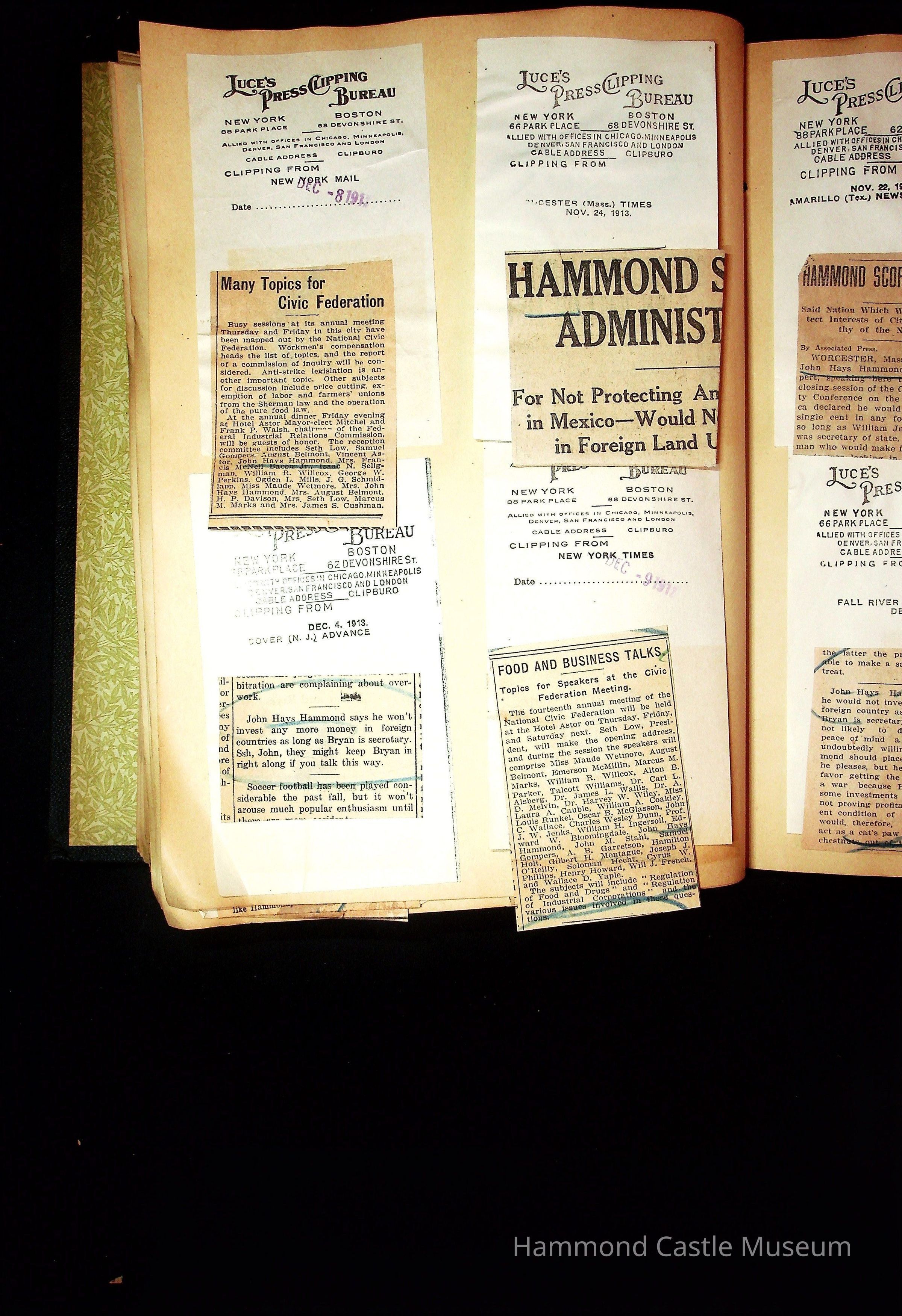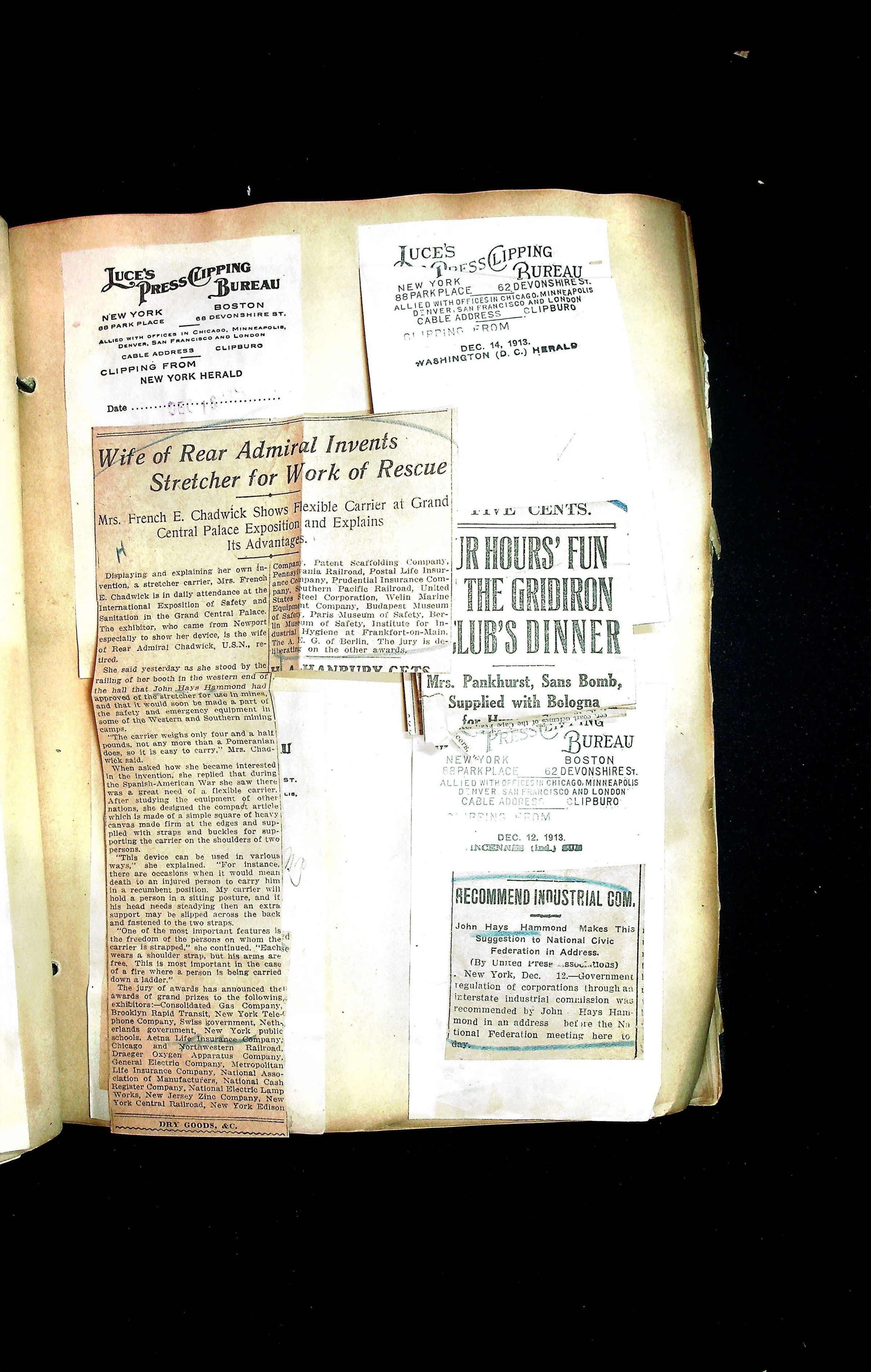 1913 scrapbook of newspaper articles about John Hays Hammond (Sr) and Mrs. Hammond covering governmental policies, Sherman Act, Eugenics & politics.