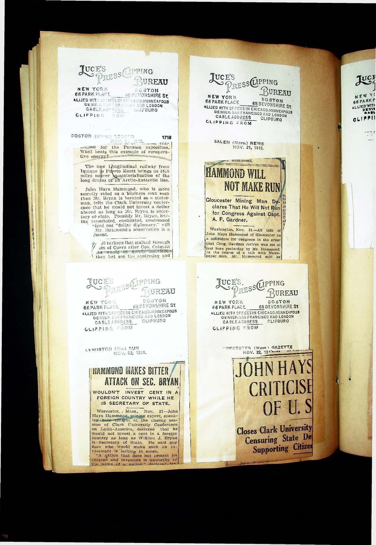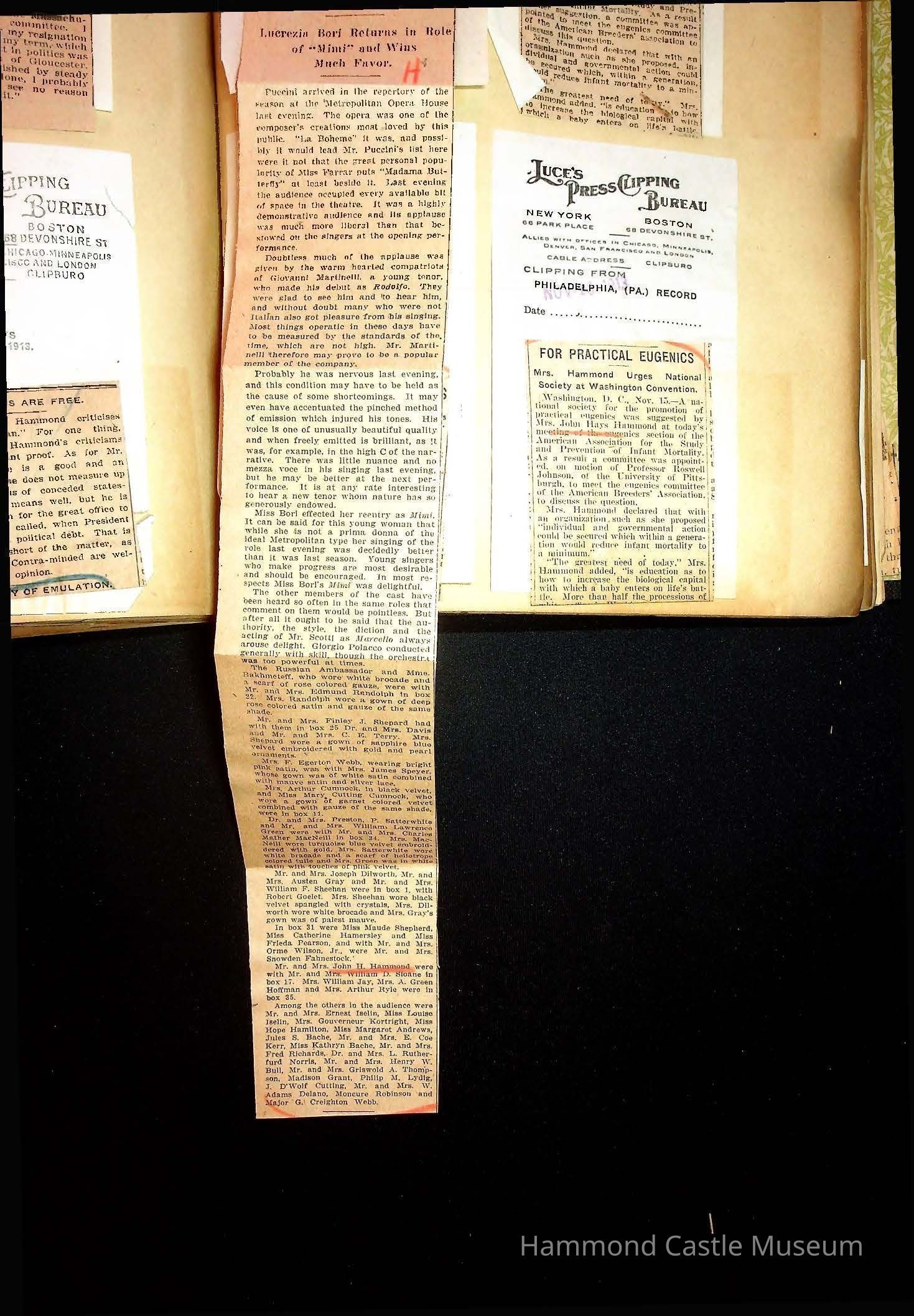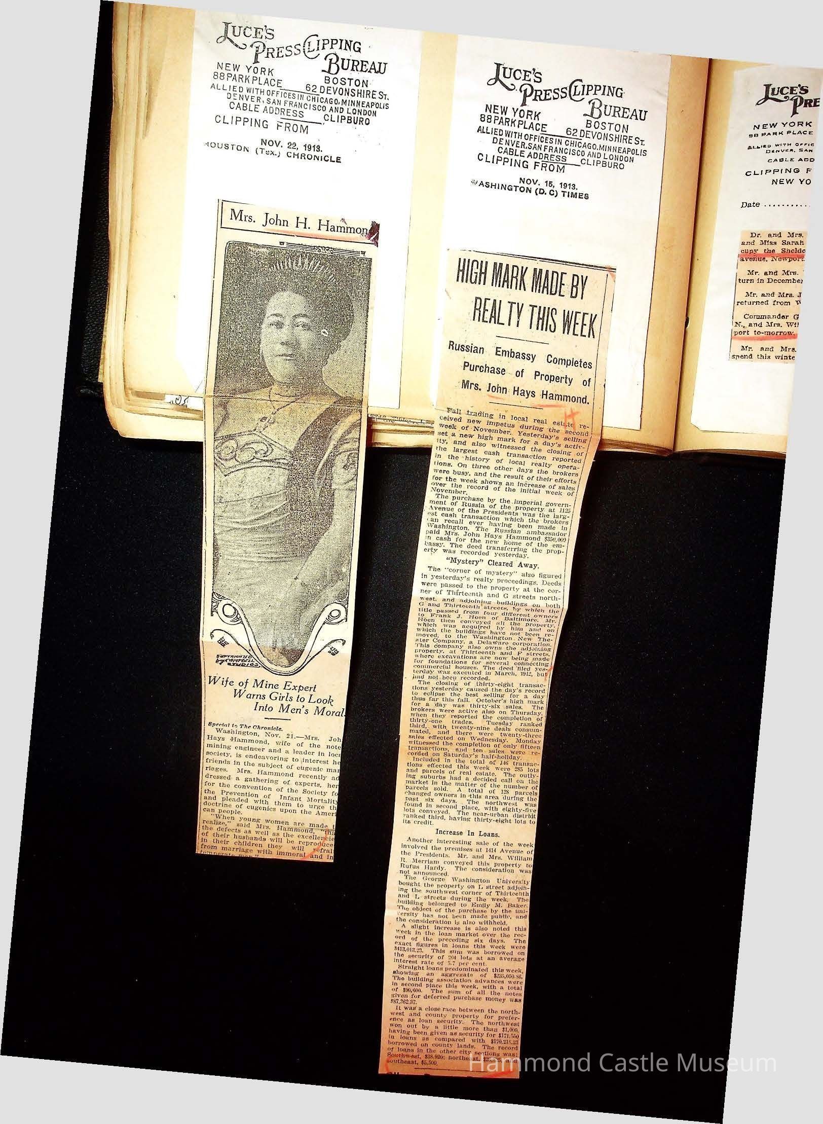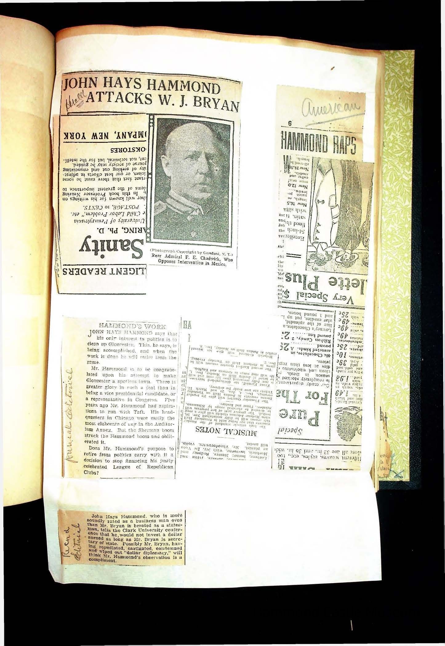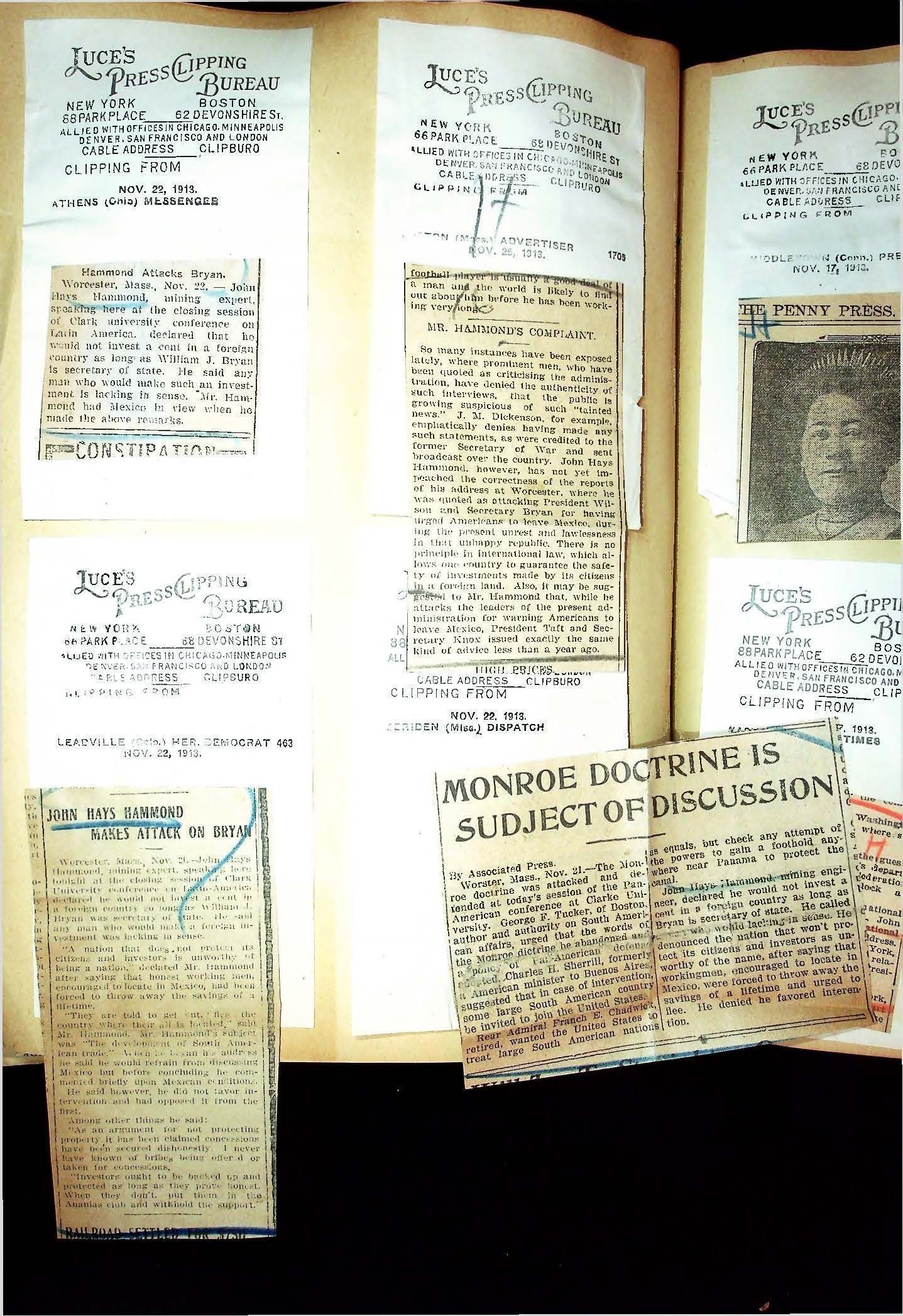 1913 scrapbook of newspaper articles about John Hays Hammond (Sr) and Mrs. Hammond covering governmental policies, Sherman Act, Eugenics & politics.