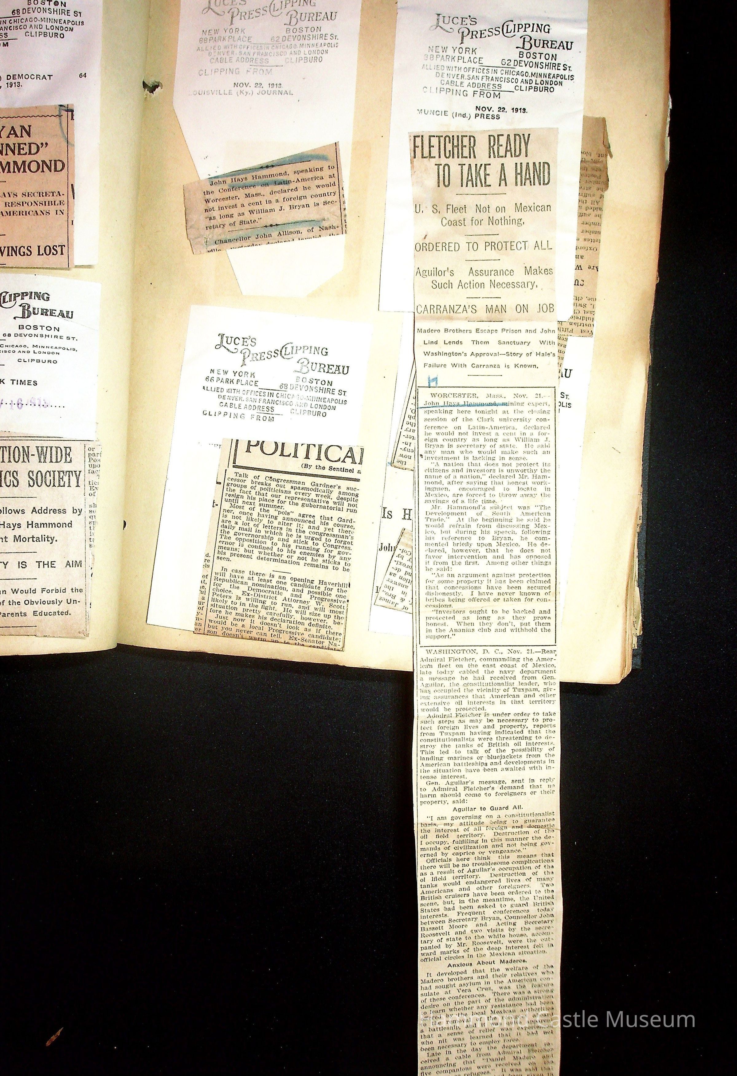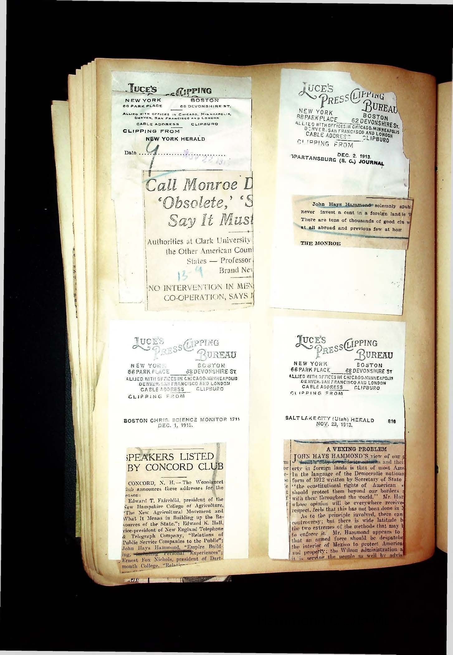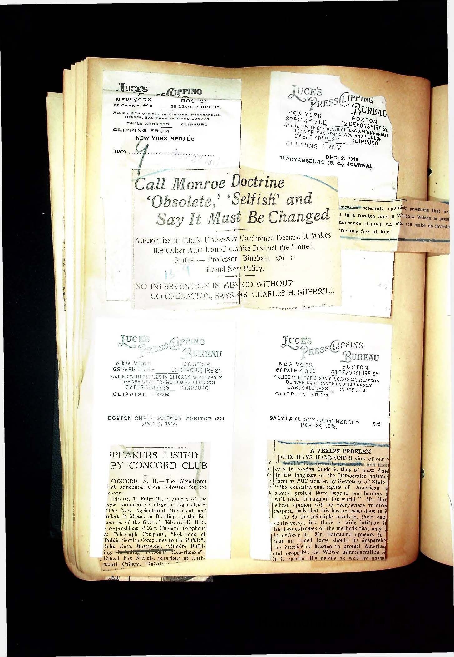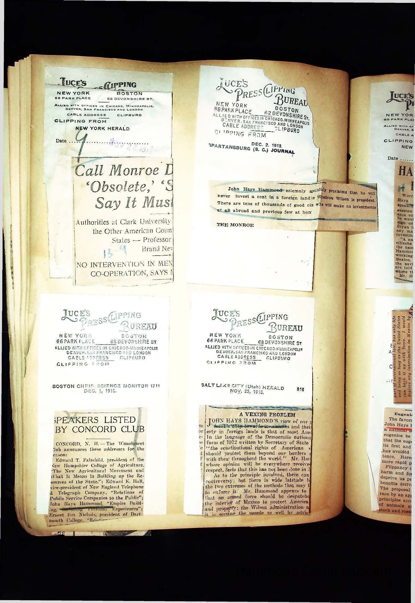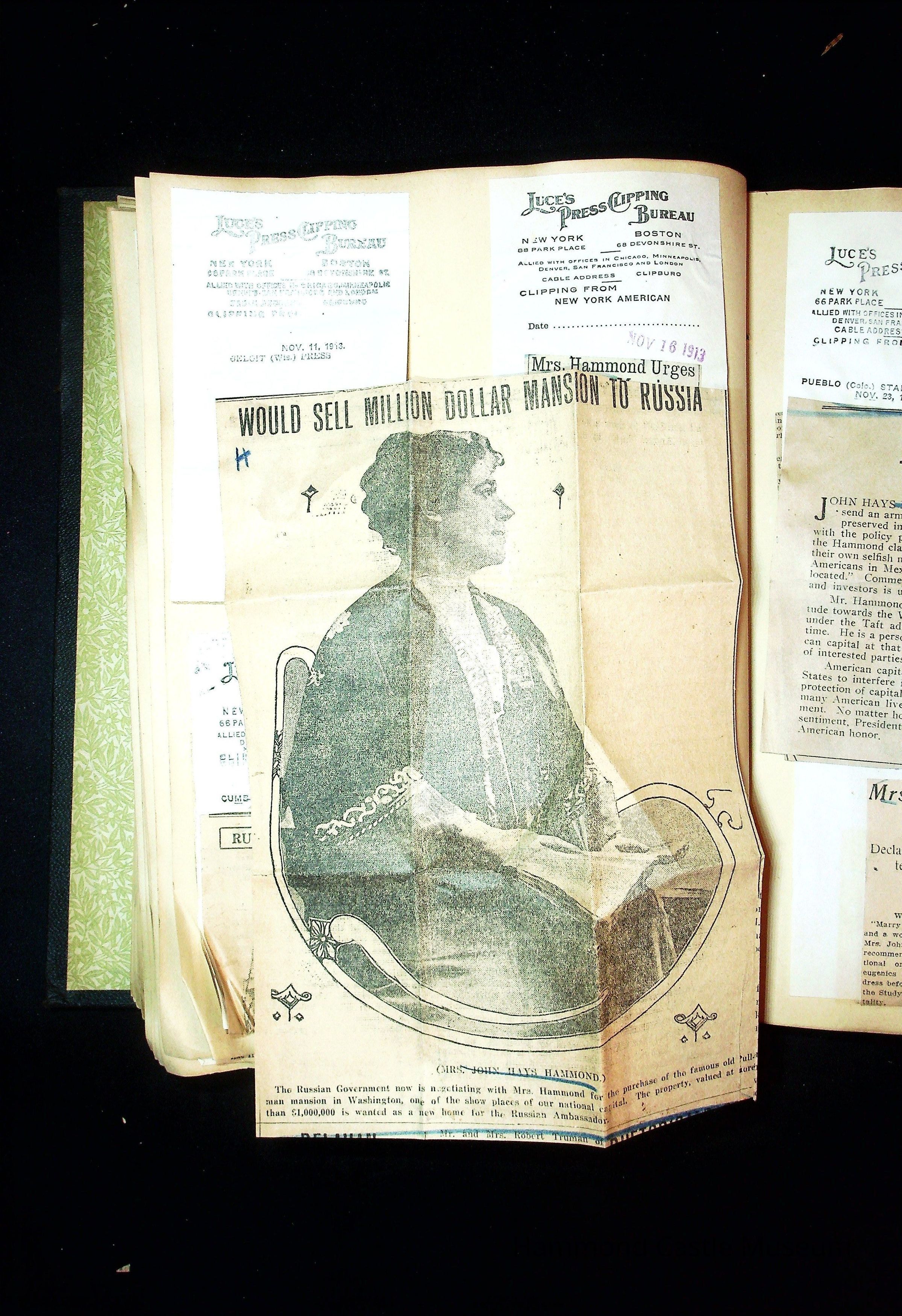 1913 scrapbook of newspaper articles about John Hays Hammond (Sr) and Mrs. Hammond covering governmental policies, Sherman Act, Eugenics & politics.