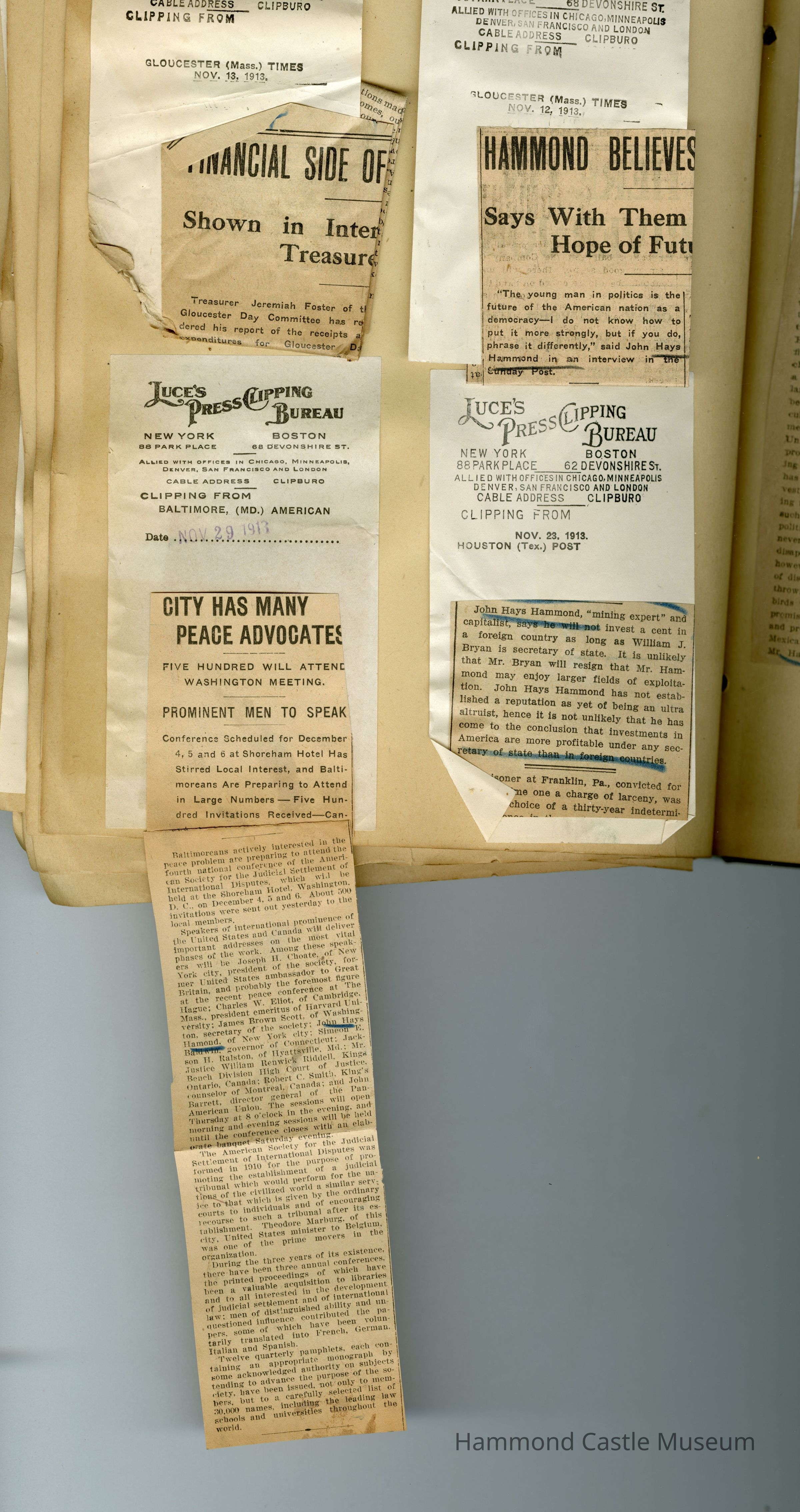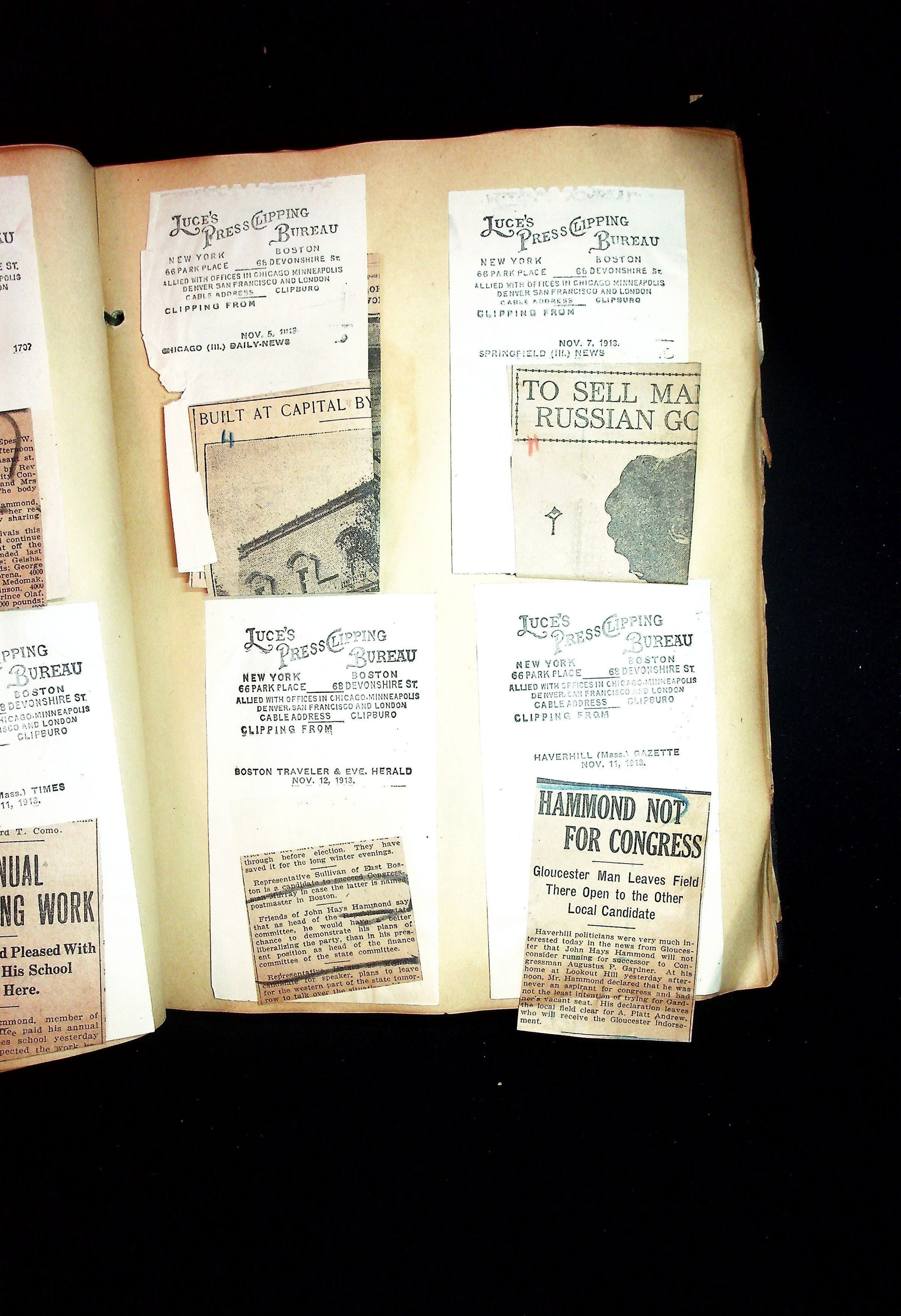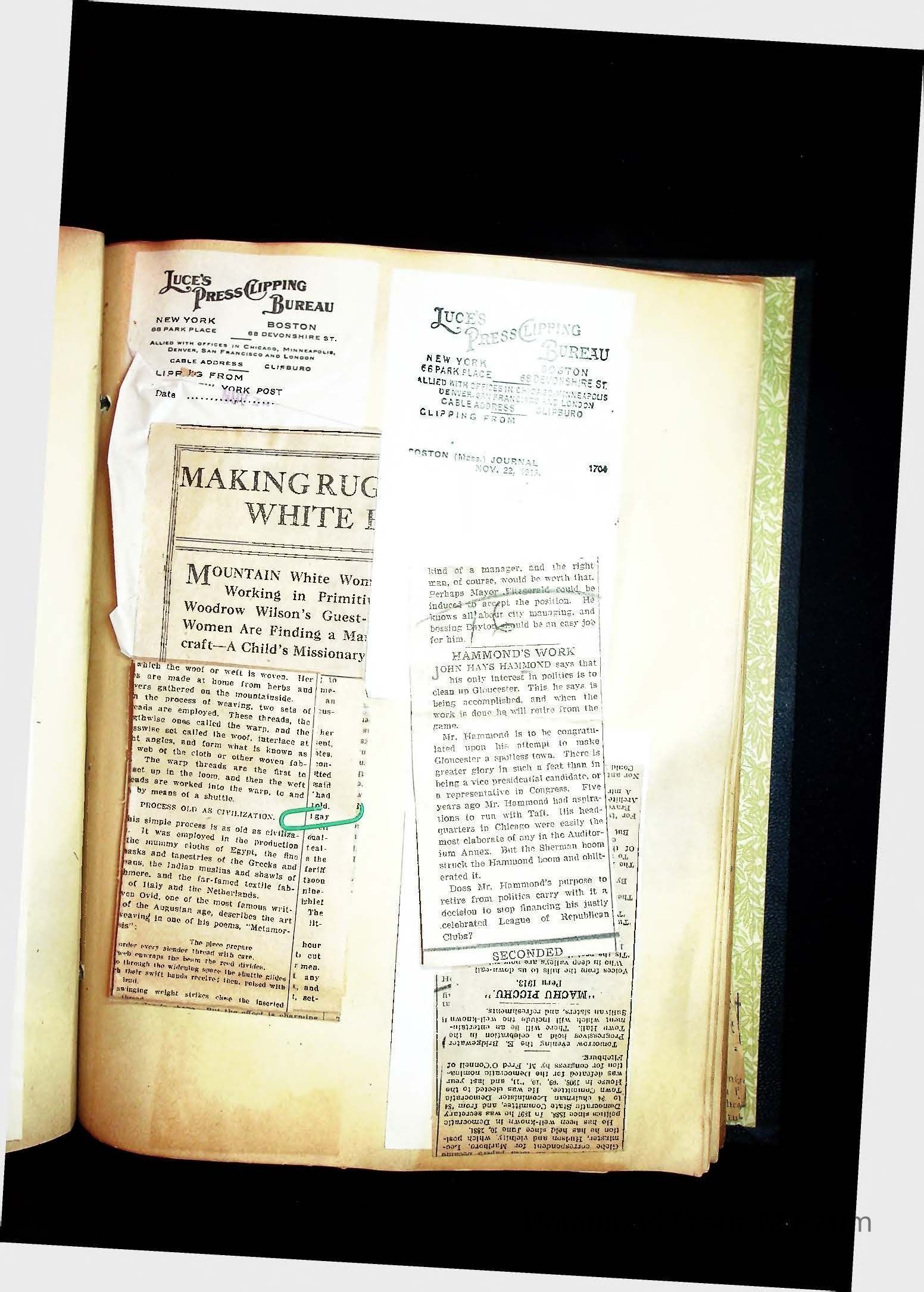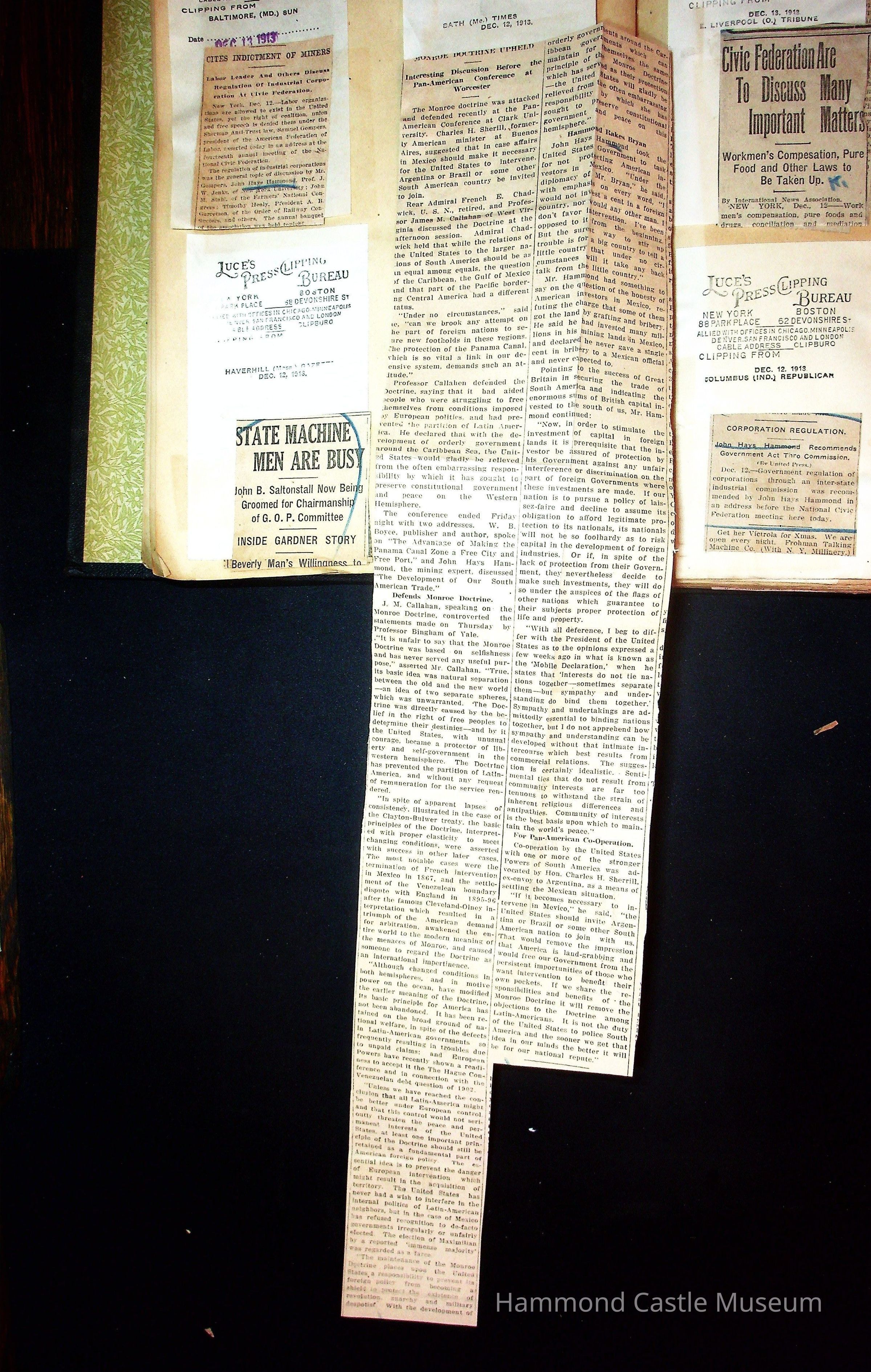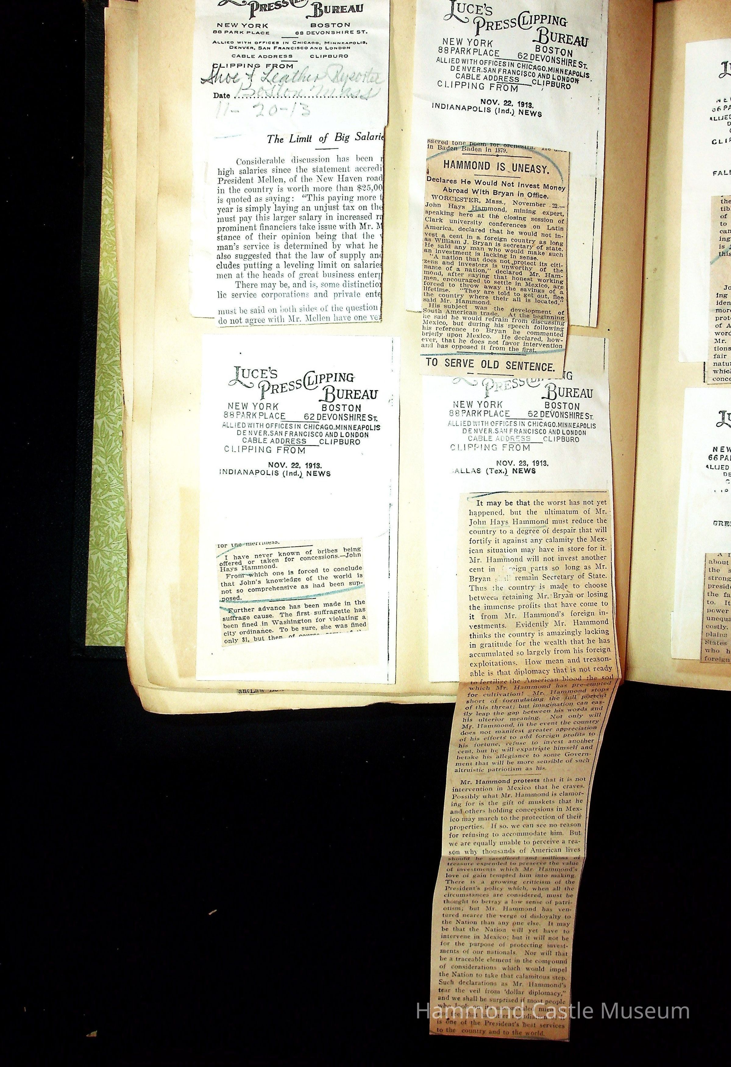 1913 scrapbook of newspaper articles about John Hays Hammond (Sr) and Mrs. Hammond covering governmental policies, Sherman Act, Eugenics & politics.