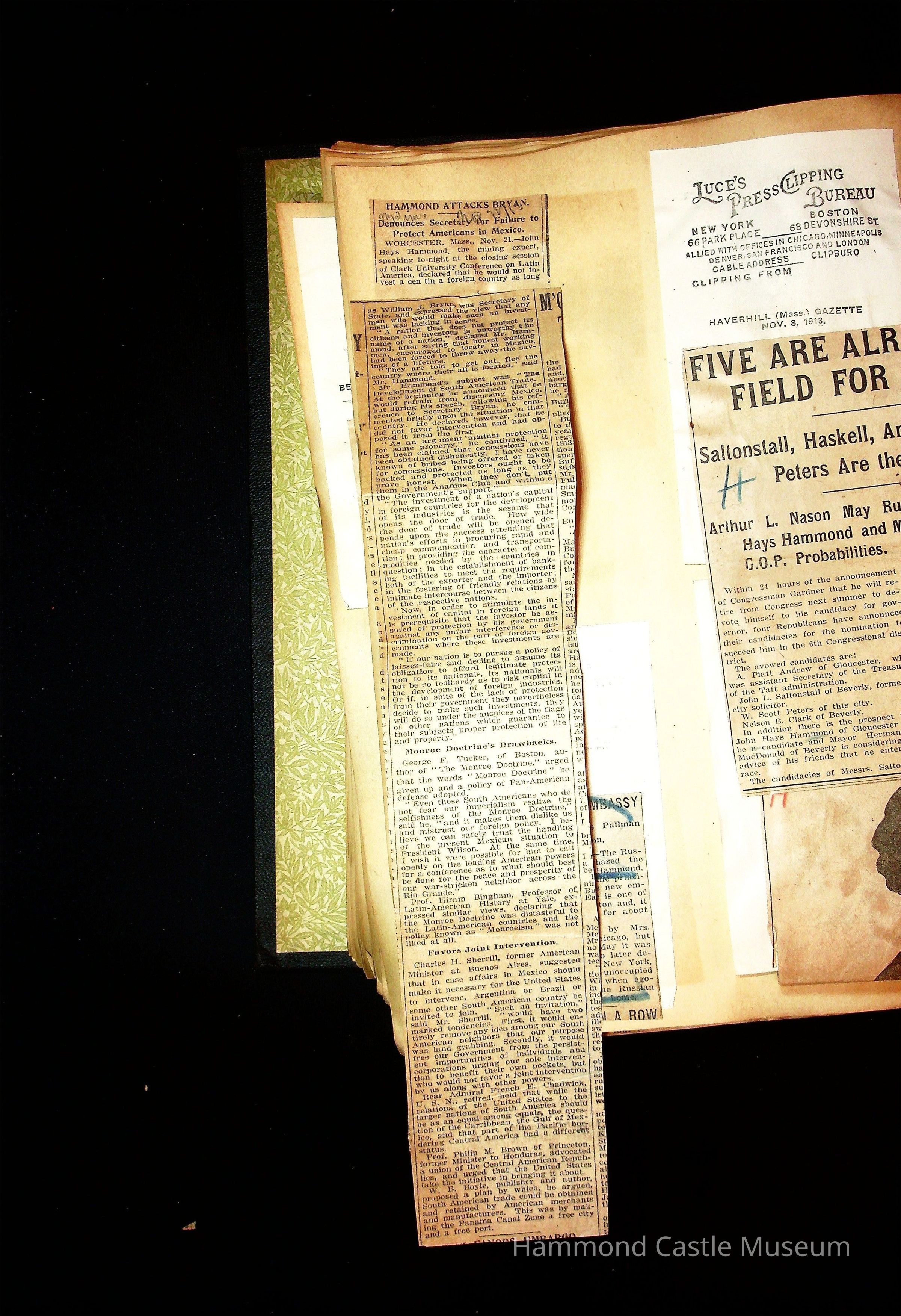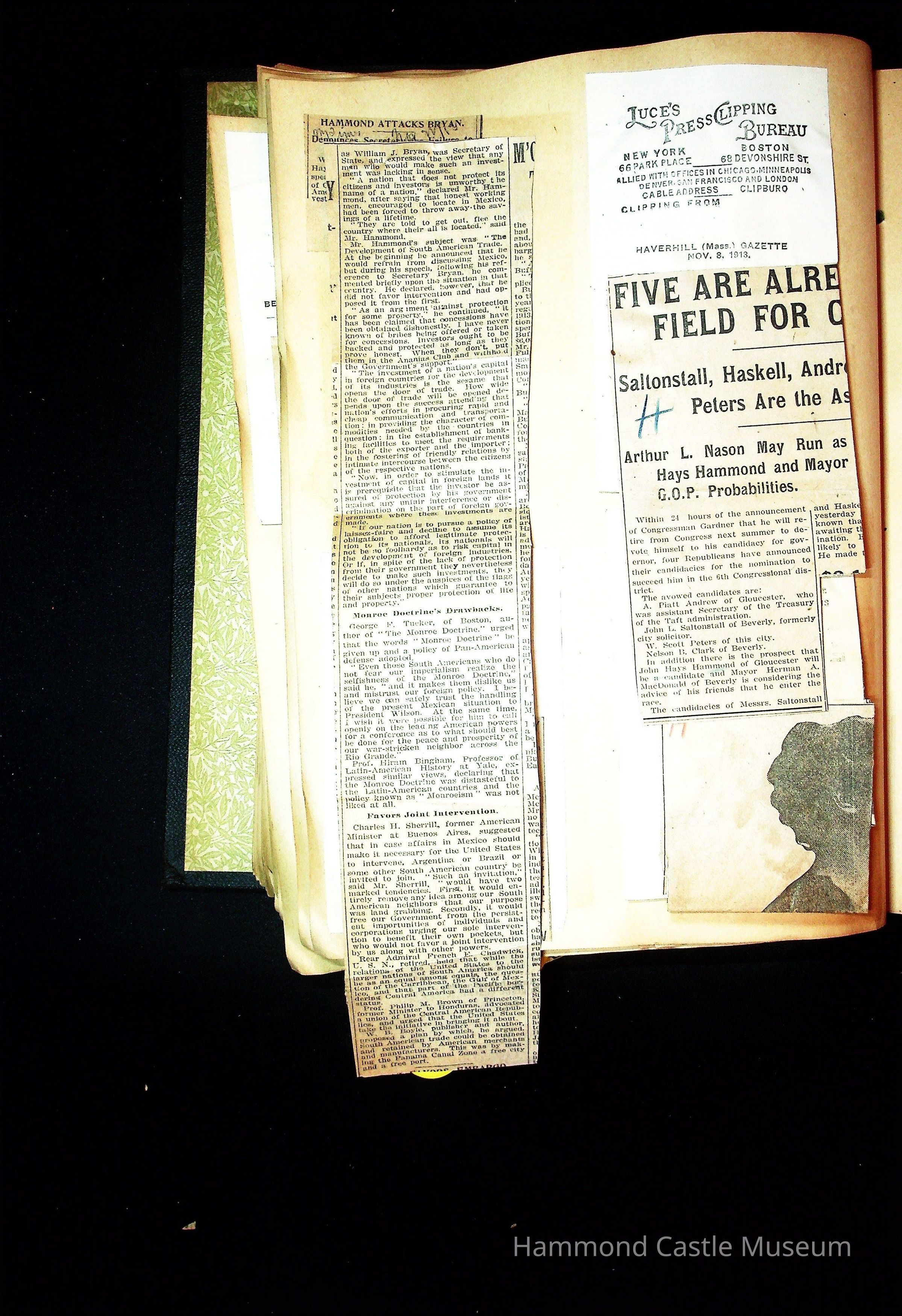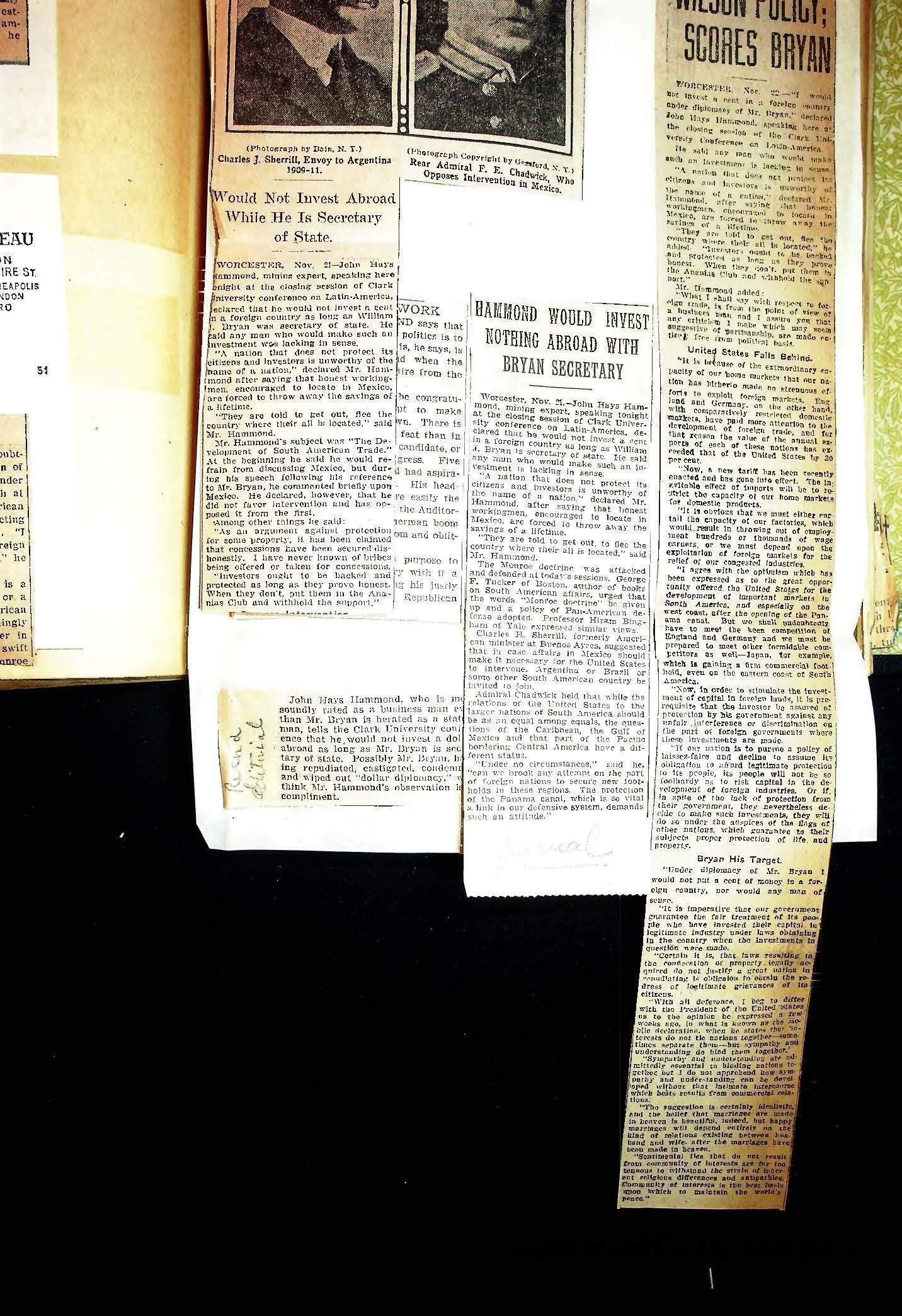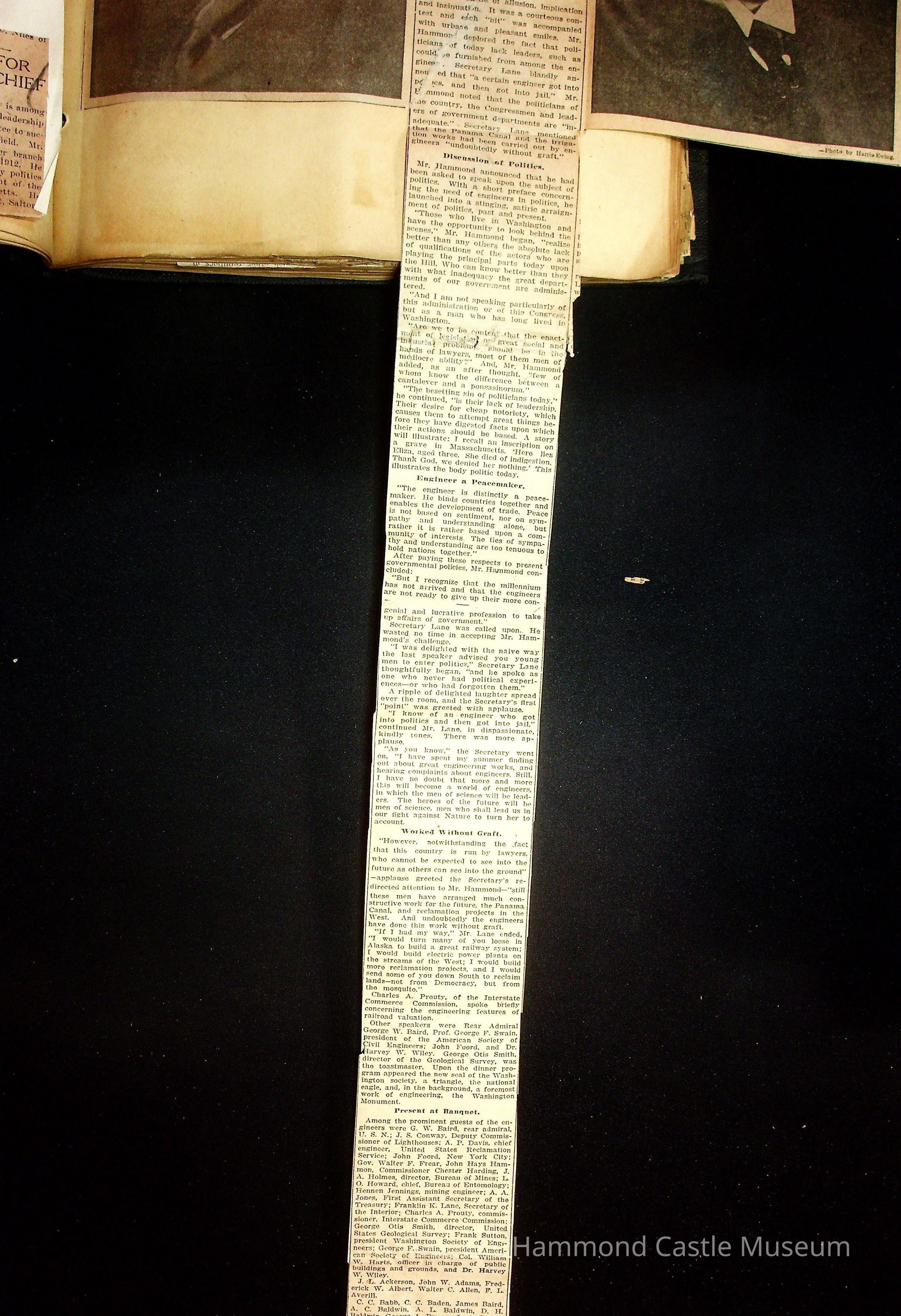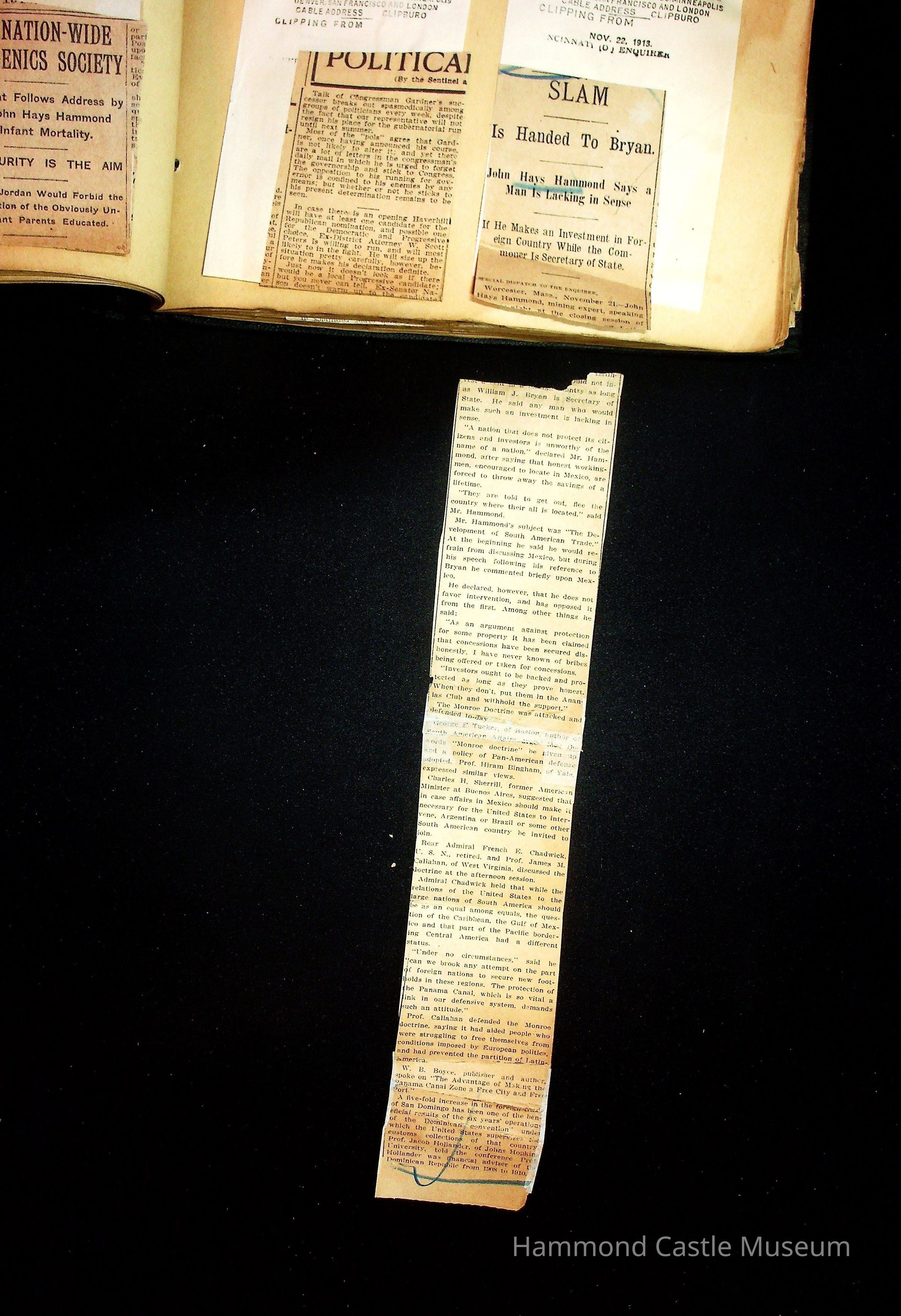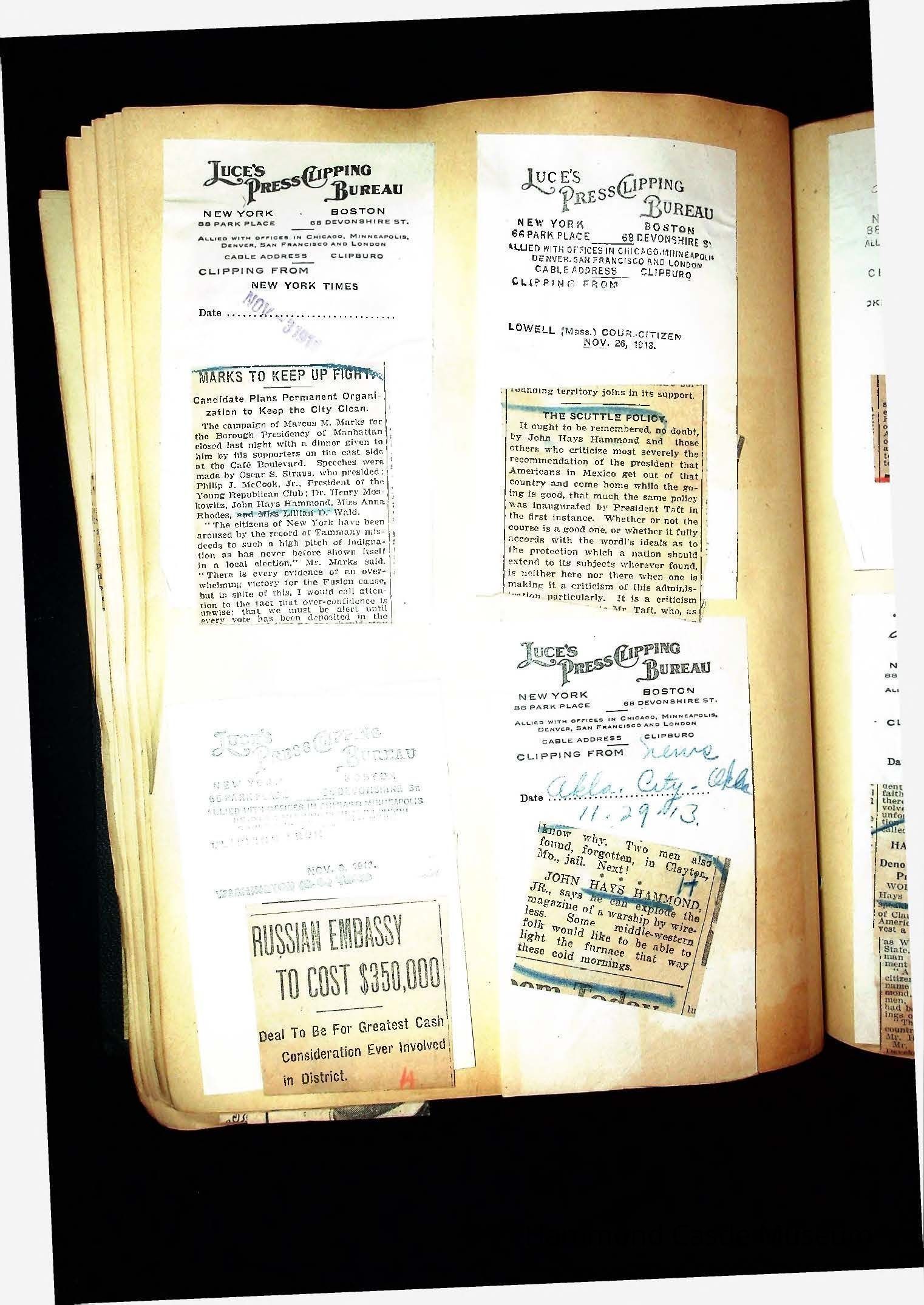 1913 scrapbook of newspaper articles about John Hays Hammond (Sr) and Mrs. Hammond covering governmental policies, Sherman Act, Eugenics & politics.