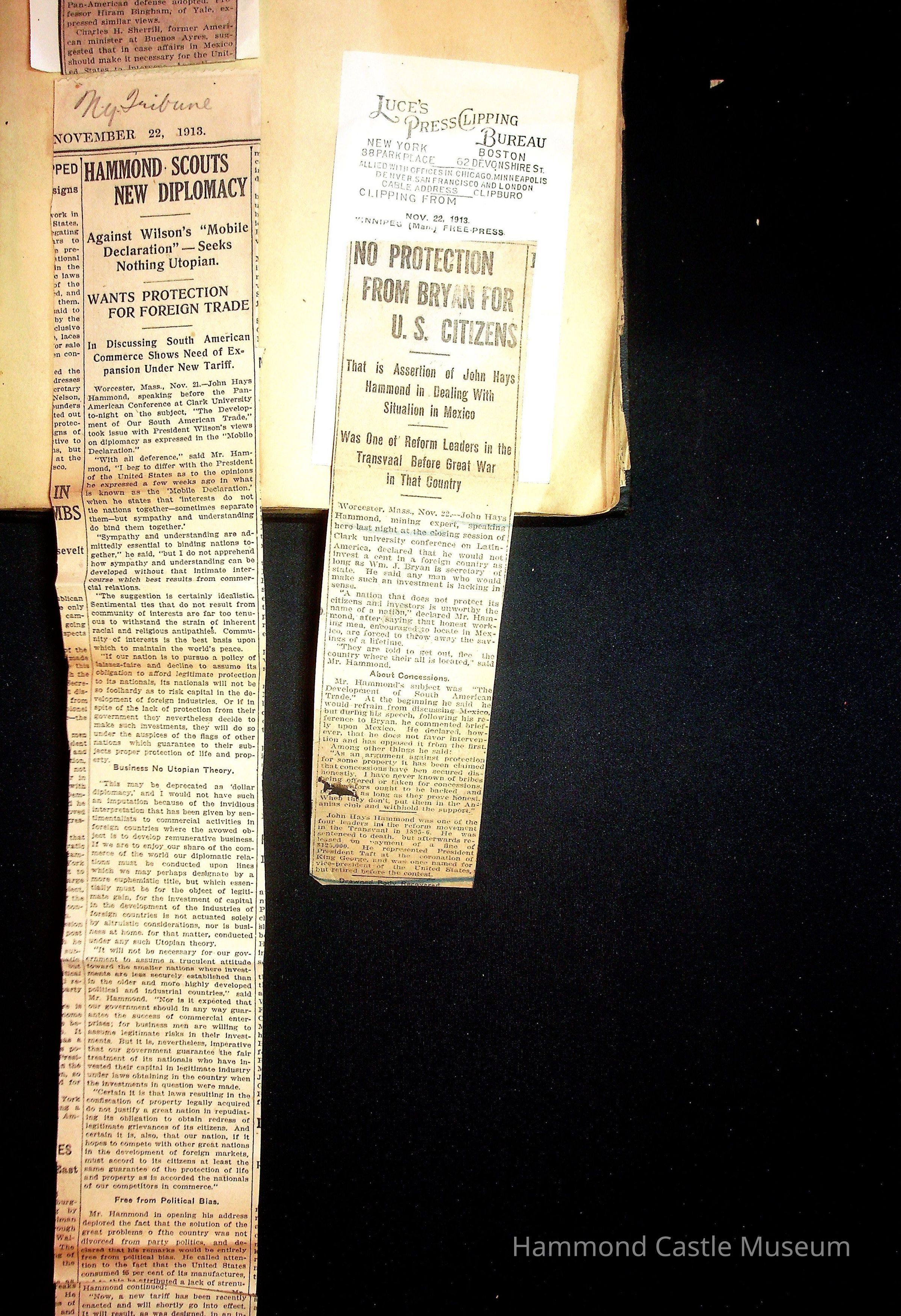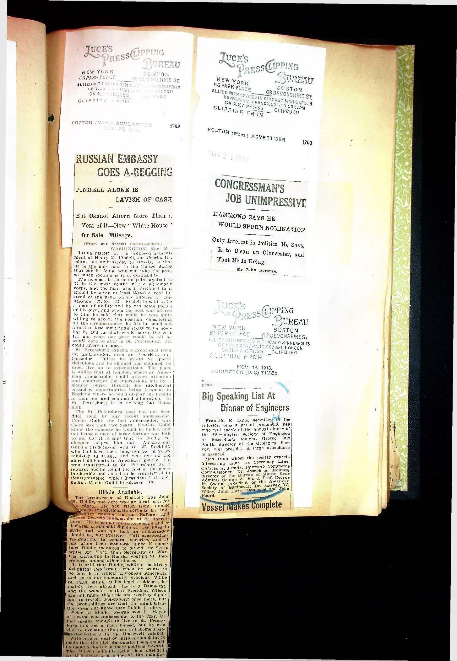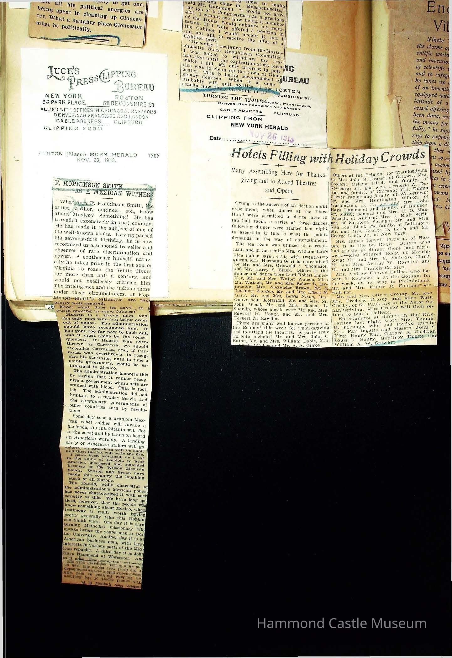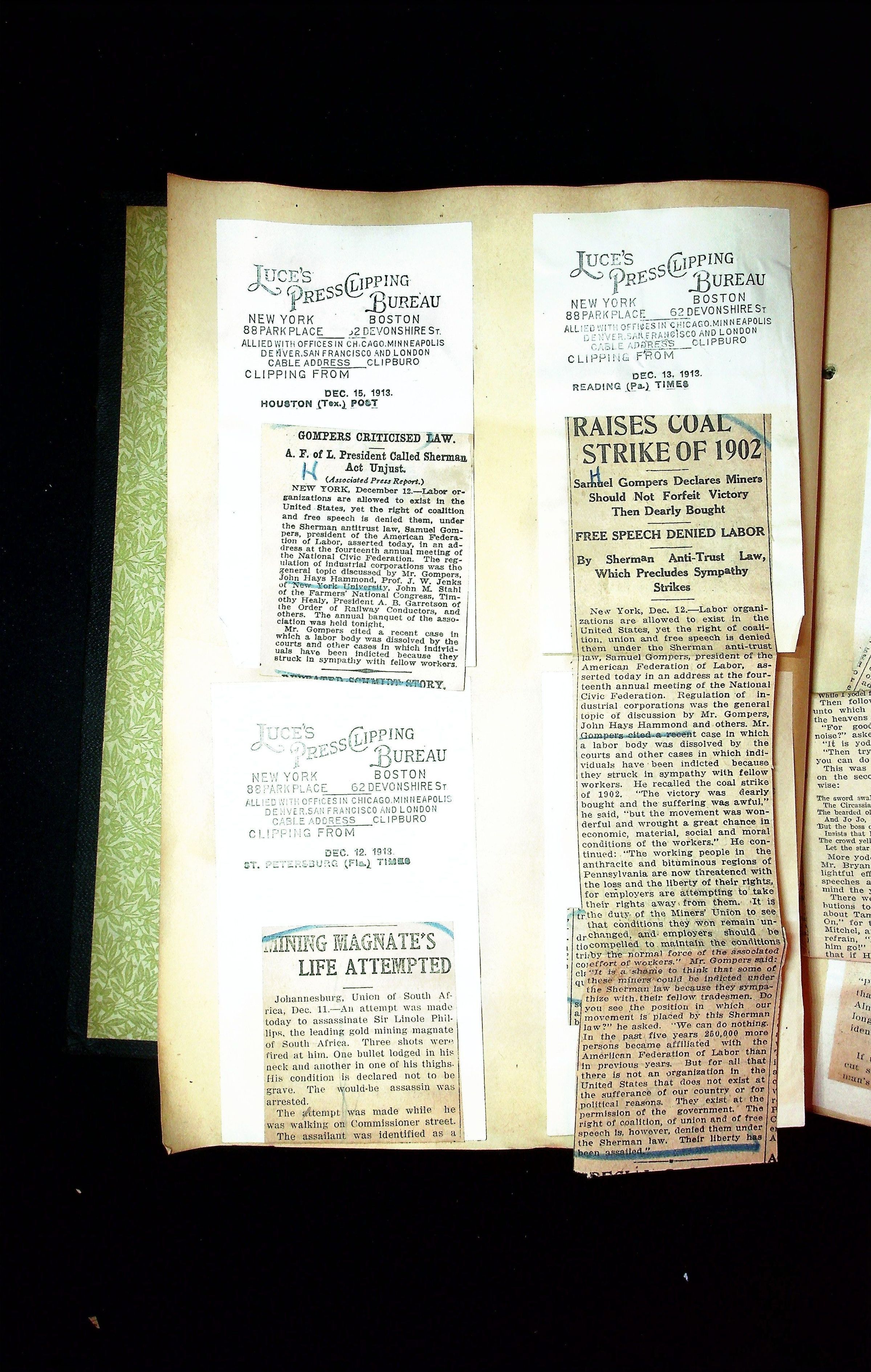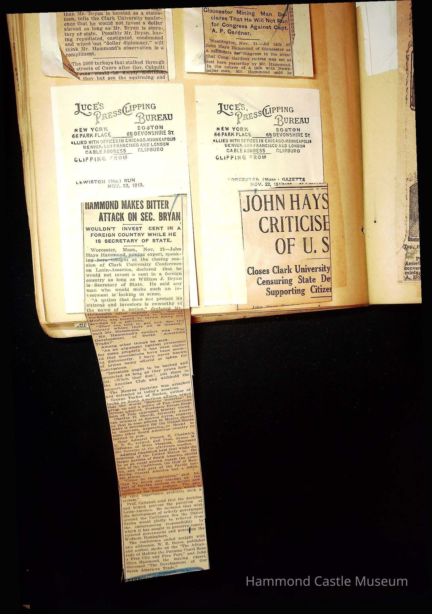 1913 scrapbook of newspaper articles about John Hays Hammond (Sr) and Mrs. Hammond covering governmental policies, Sherman Act, Eugenics & politics.