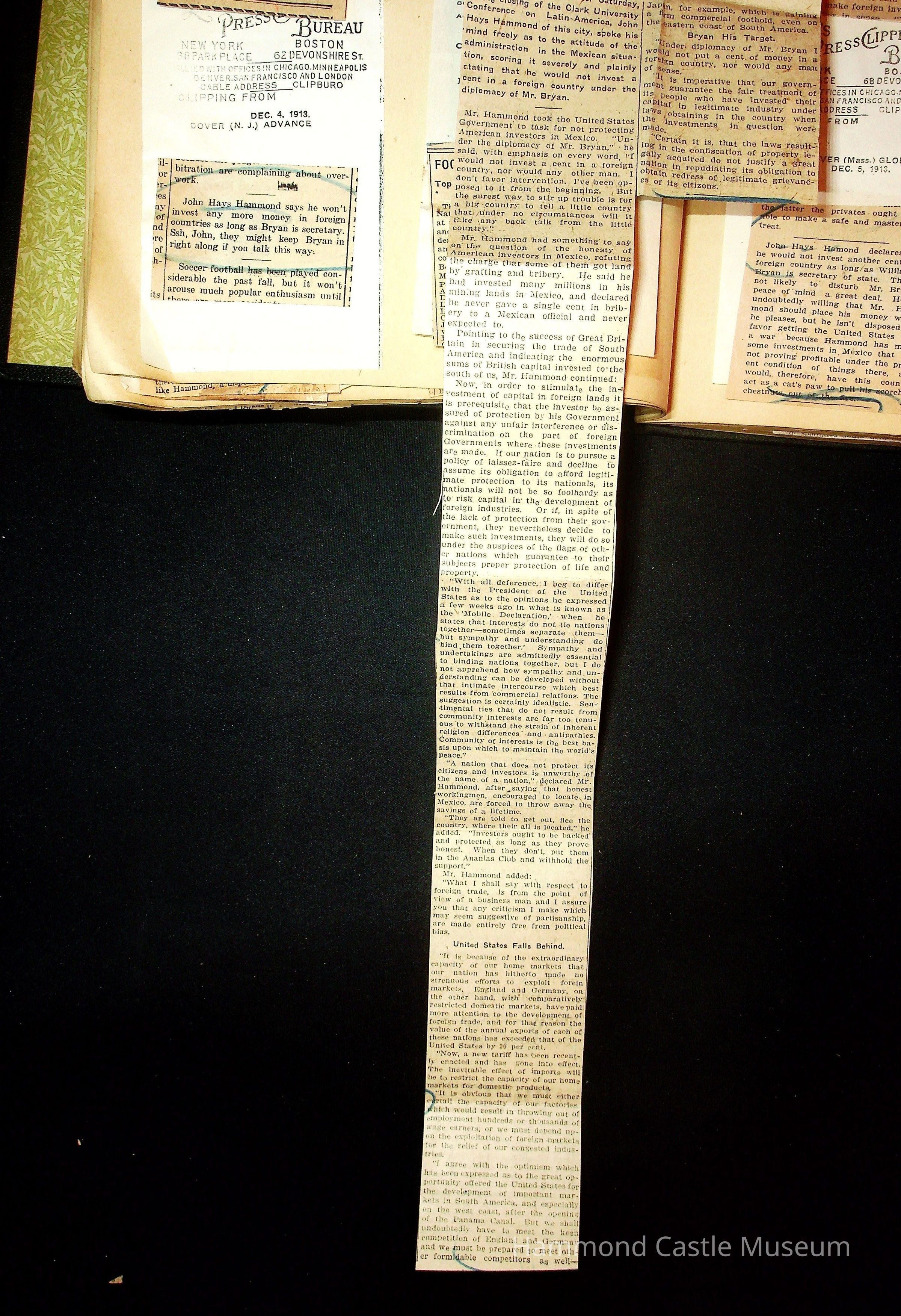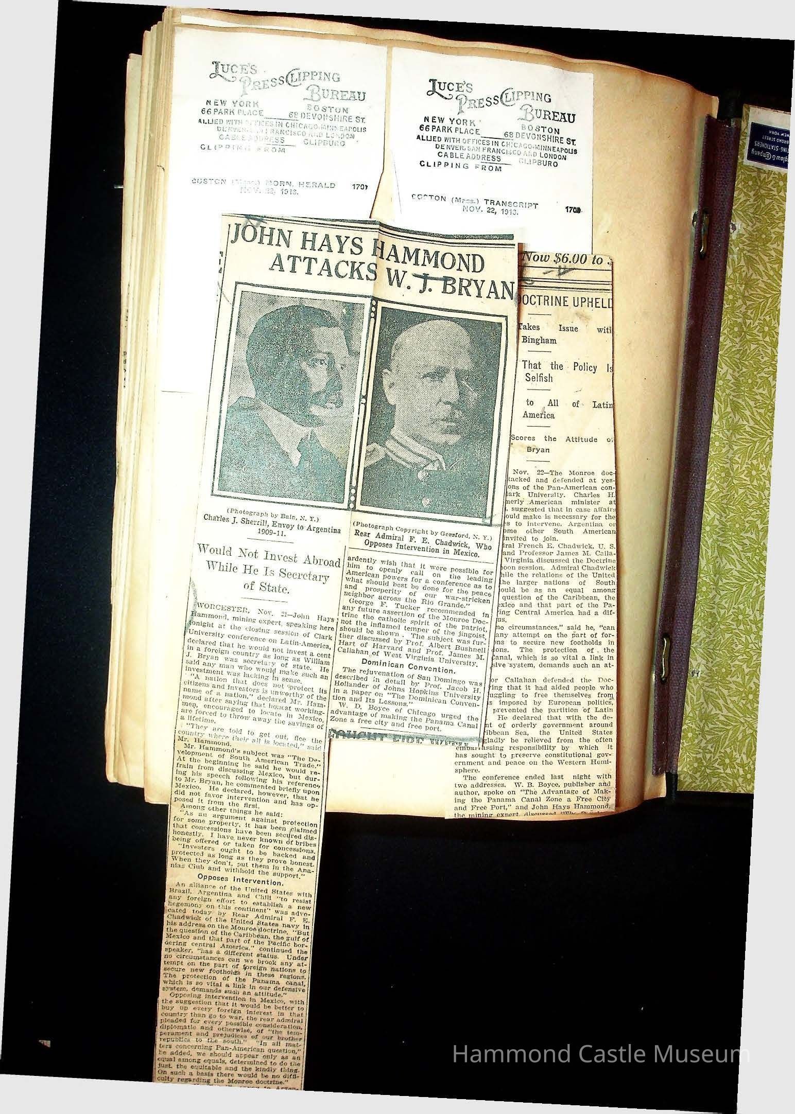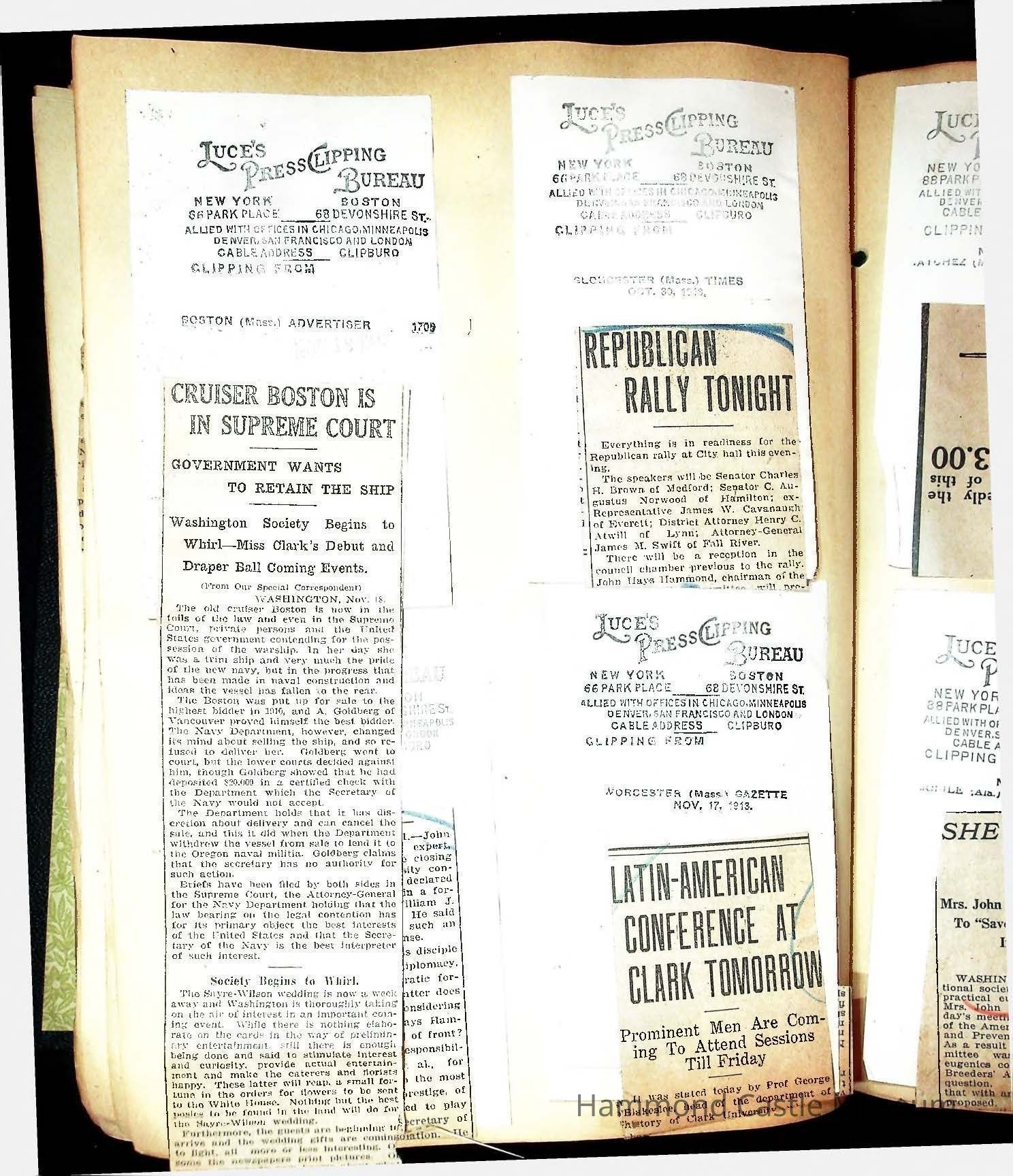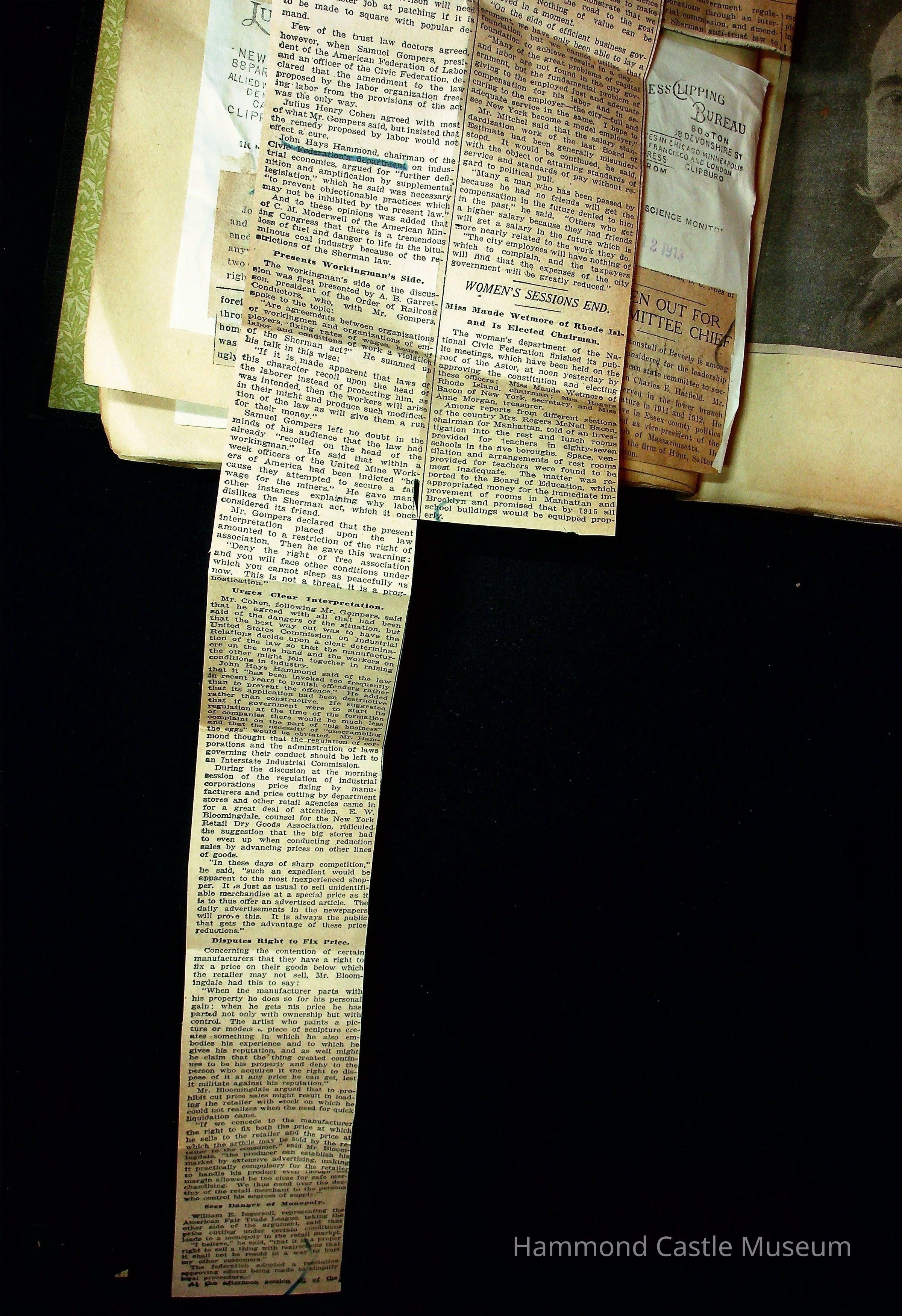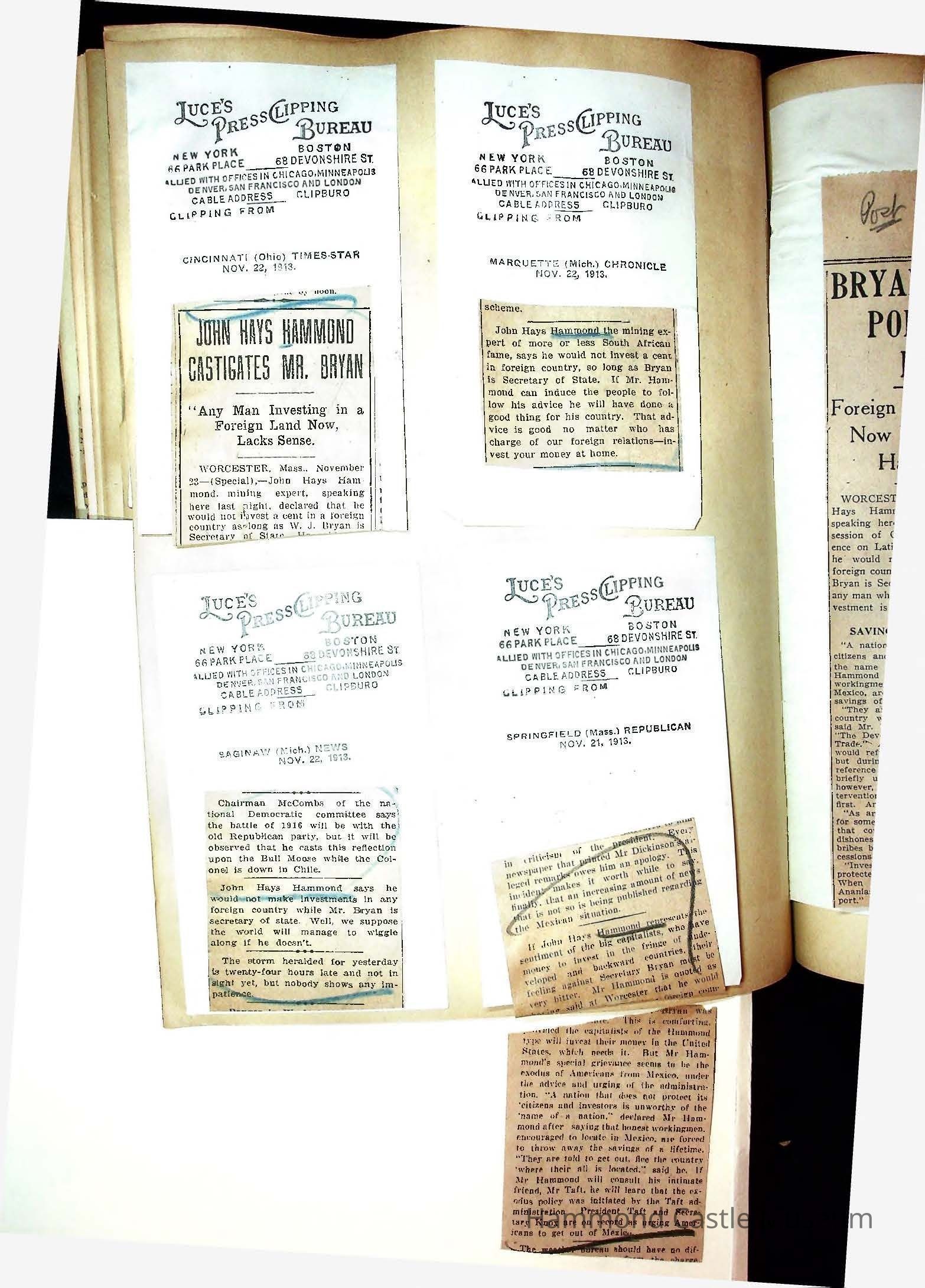 1913 scrapbook of newspaper articles about John Hays Hammond (Sr) and Mrs. Hammond covering governmental policies, Sherman Act, Eugenics & politics.