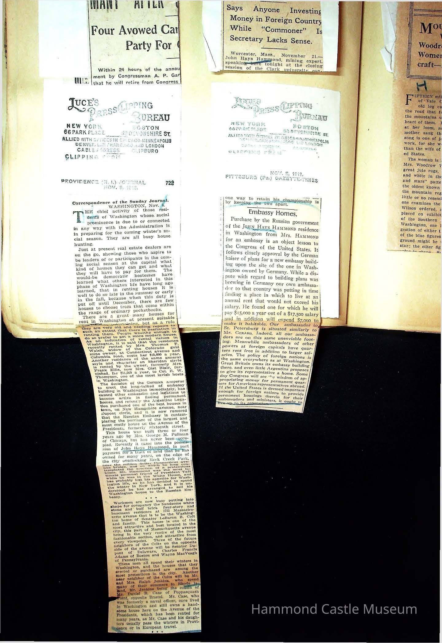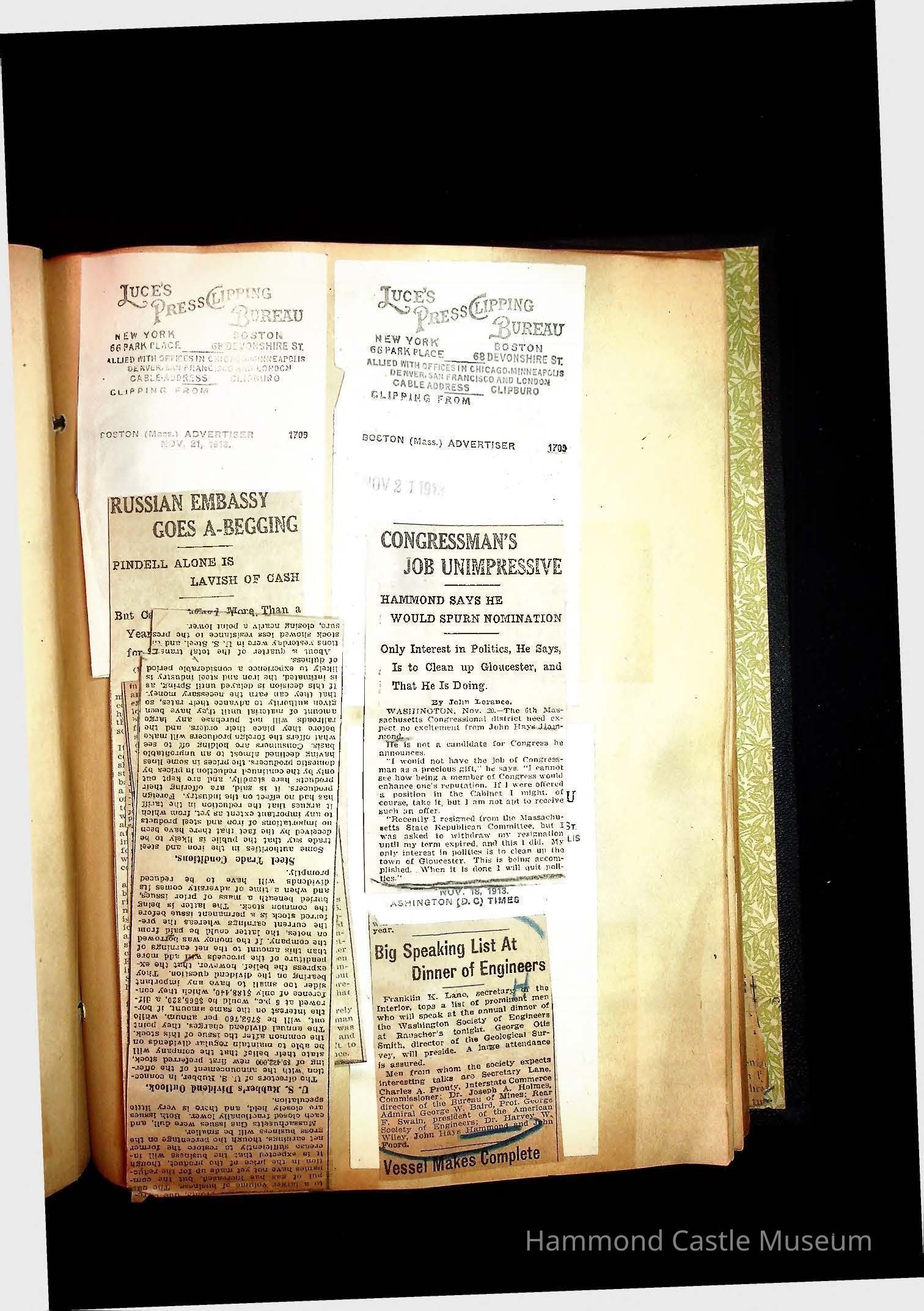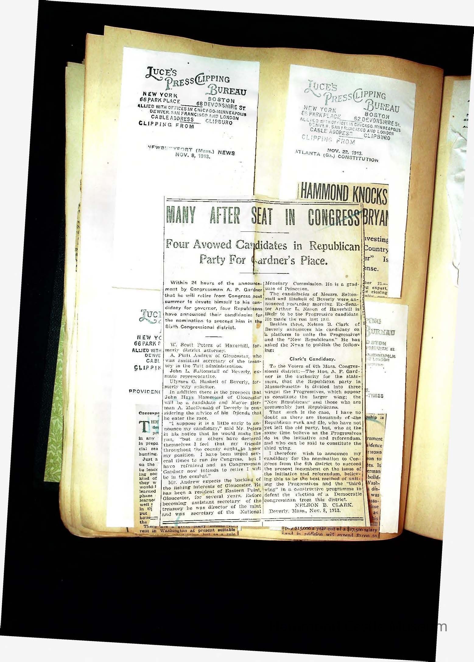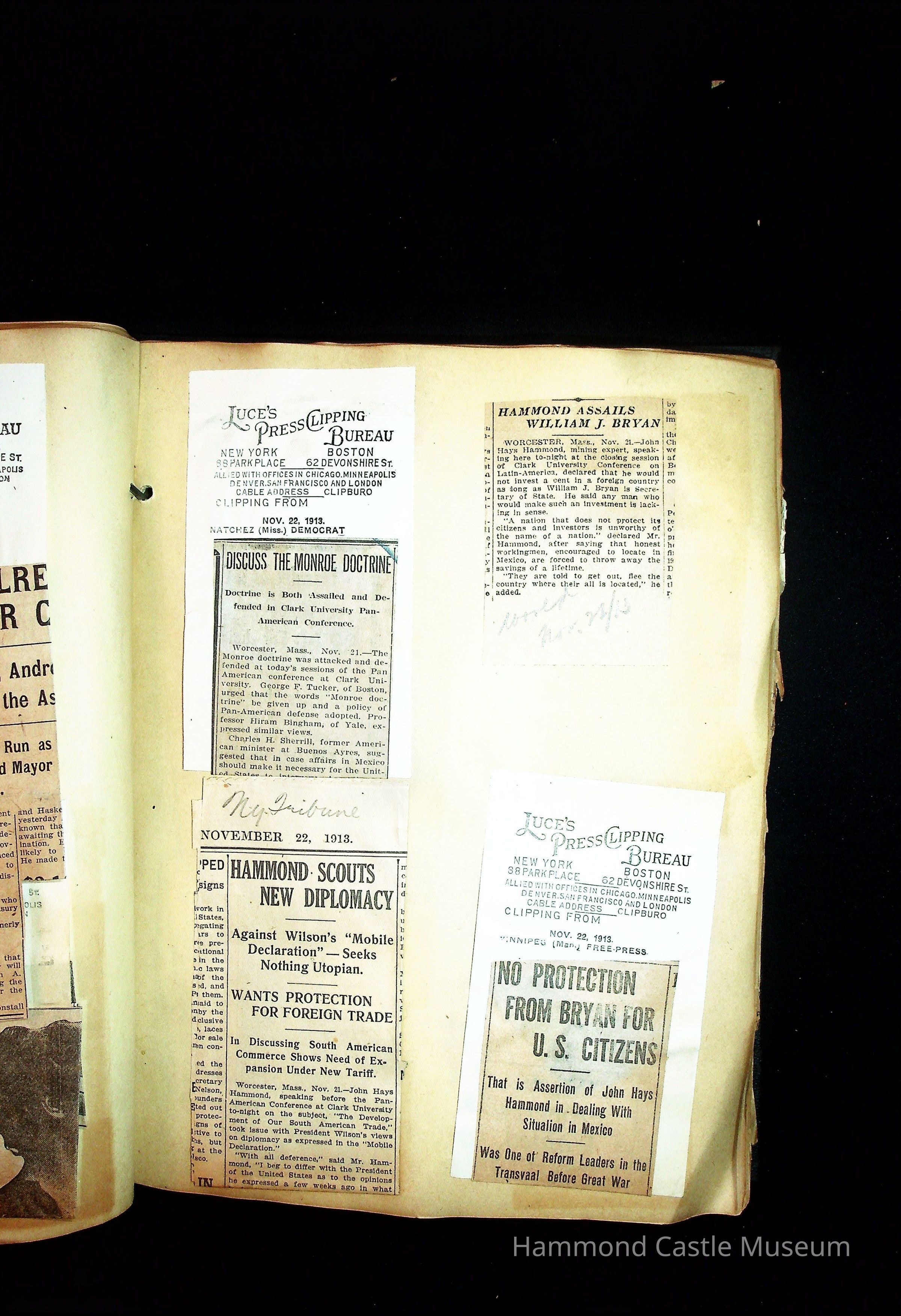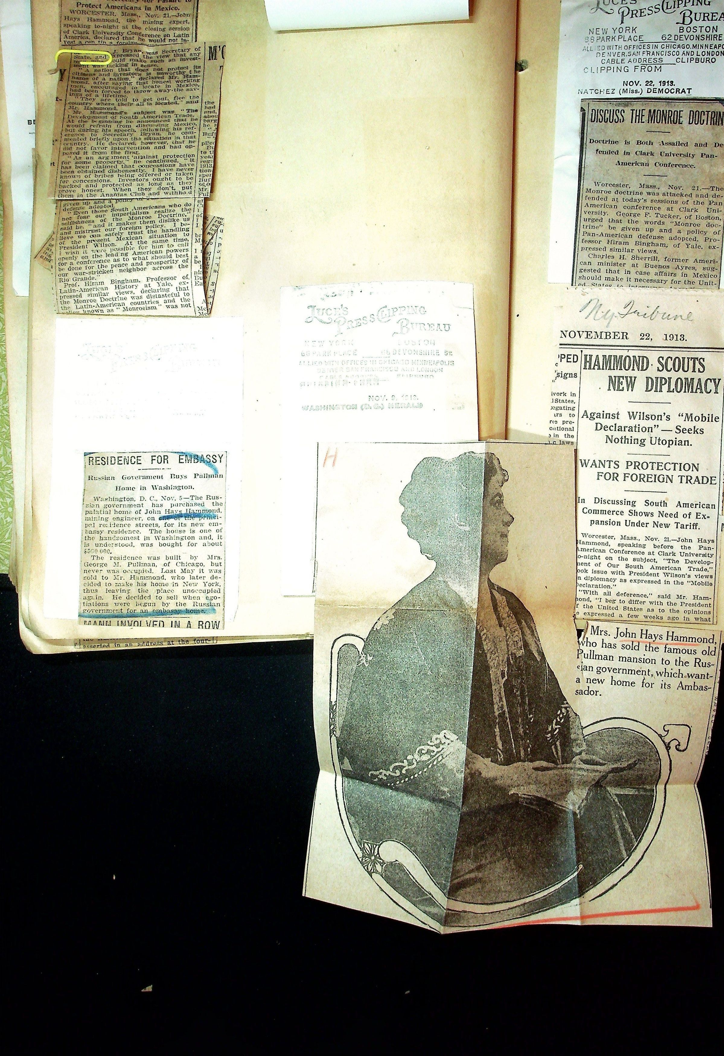 1913 scrapbook of newspaper articles about John Hays Hammond (Sr) and Mrs. Hammond covering governmental policies, Sherman Act, Eugenics & politics.