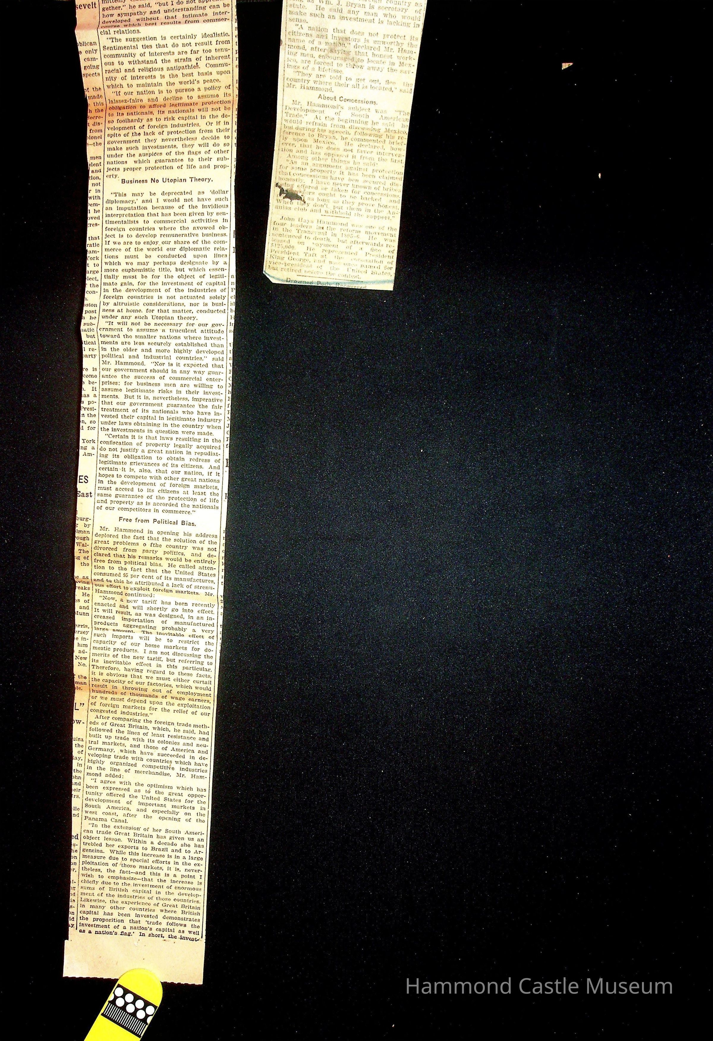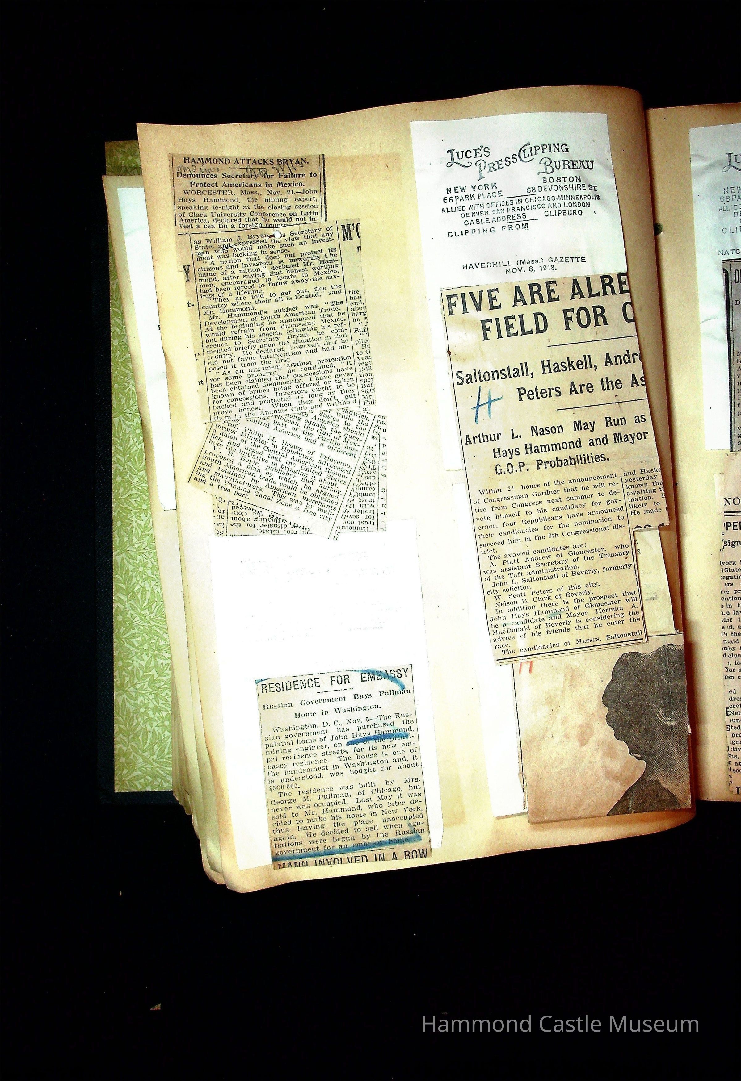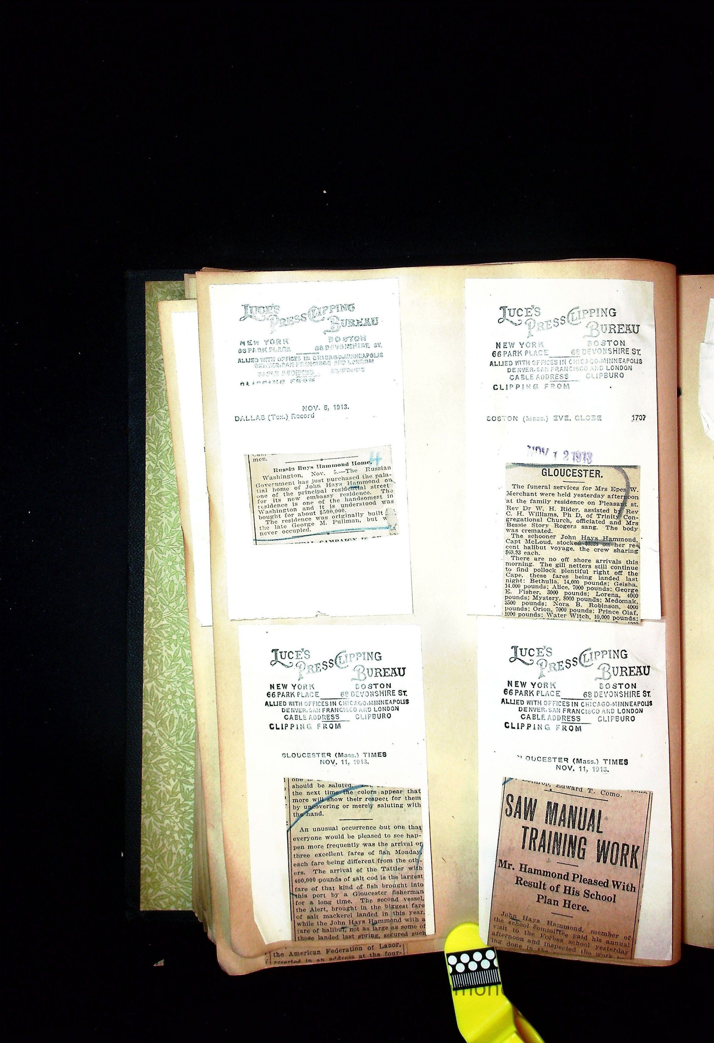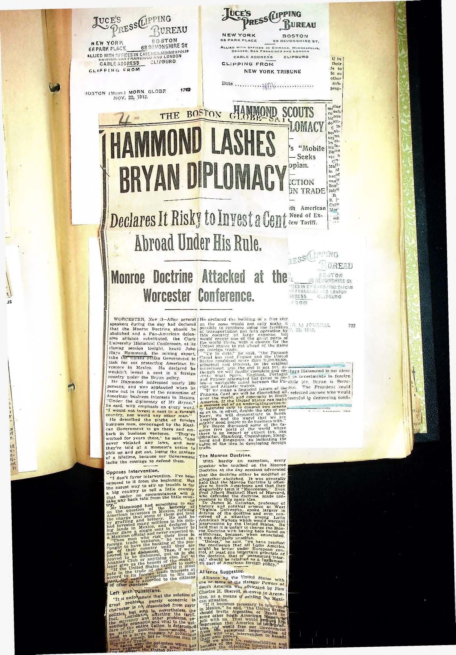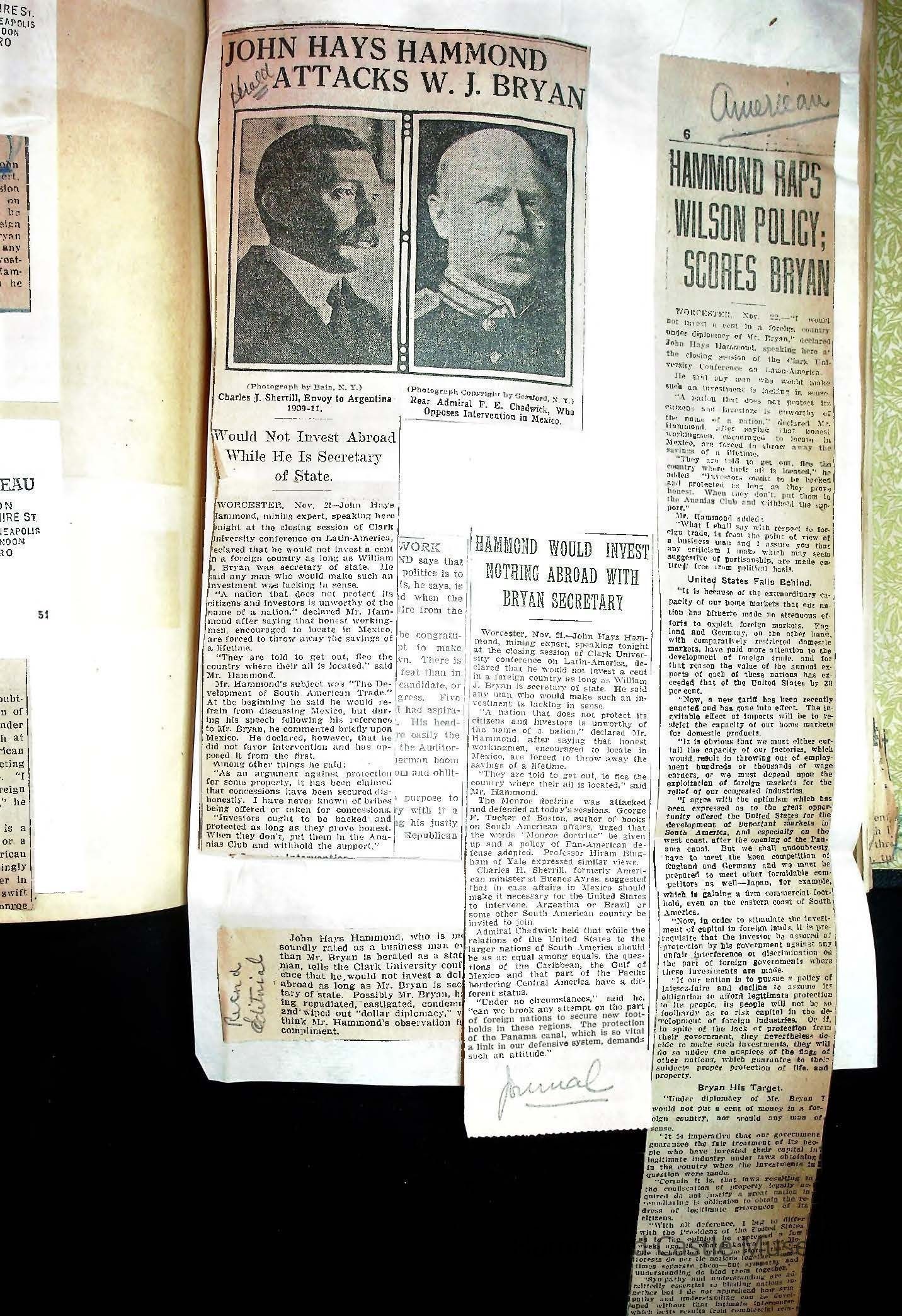1913 scrapbook of newspaper articles about John Hays Hammond (Sr) and Mrs. Hammond covering governmental policies, Sherman Act, Eugenics & politics.