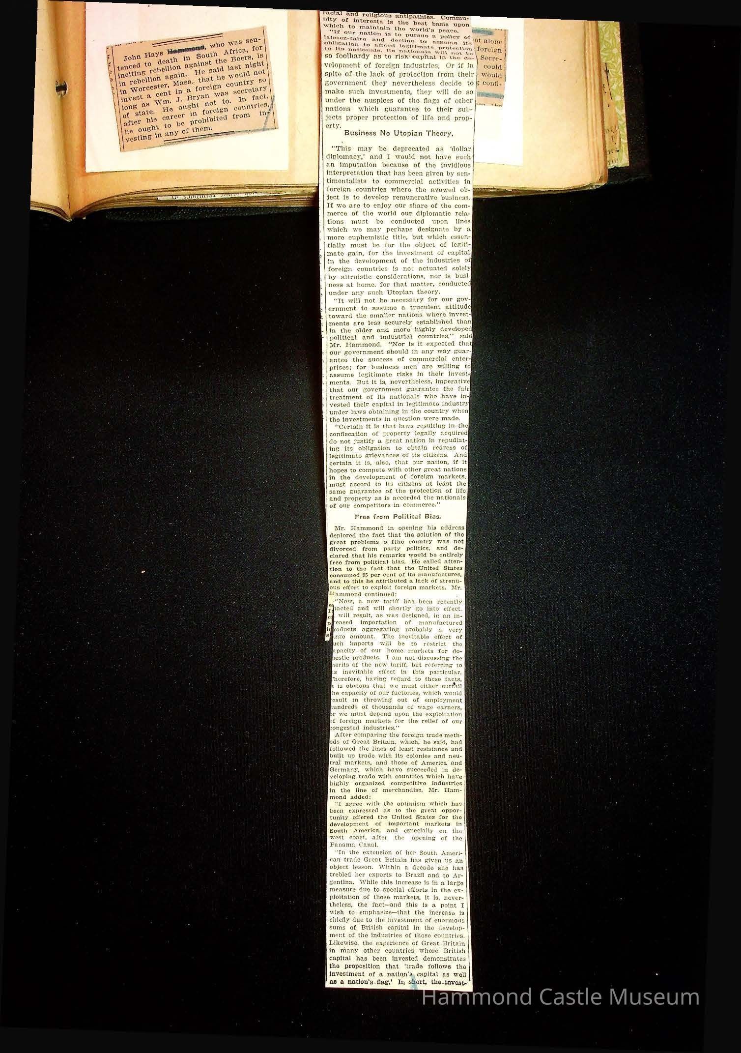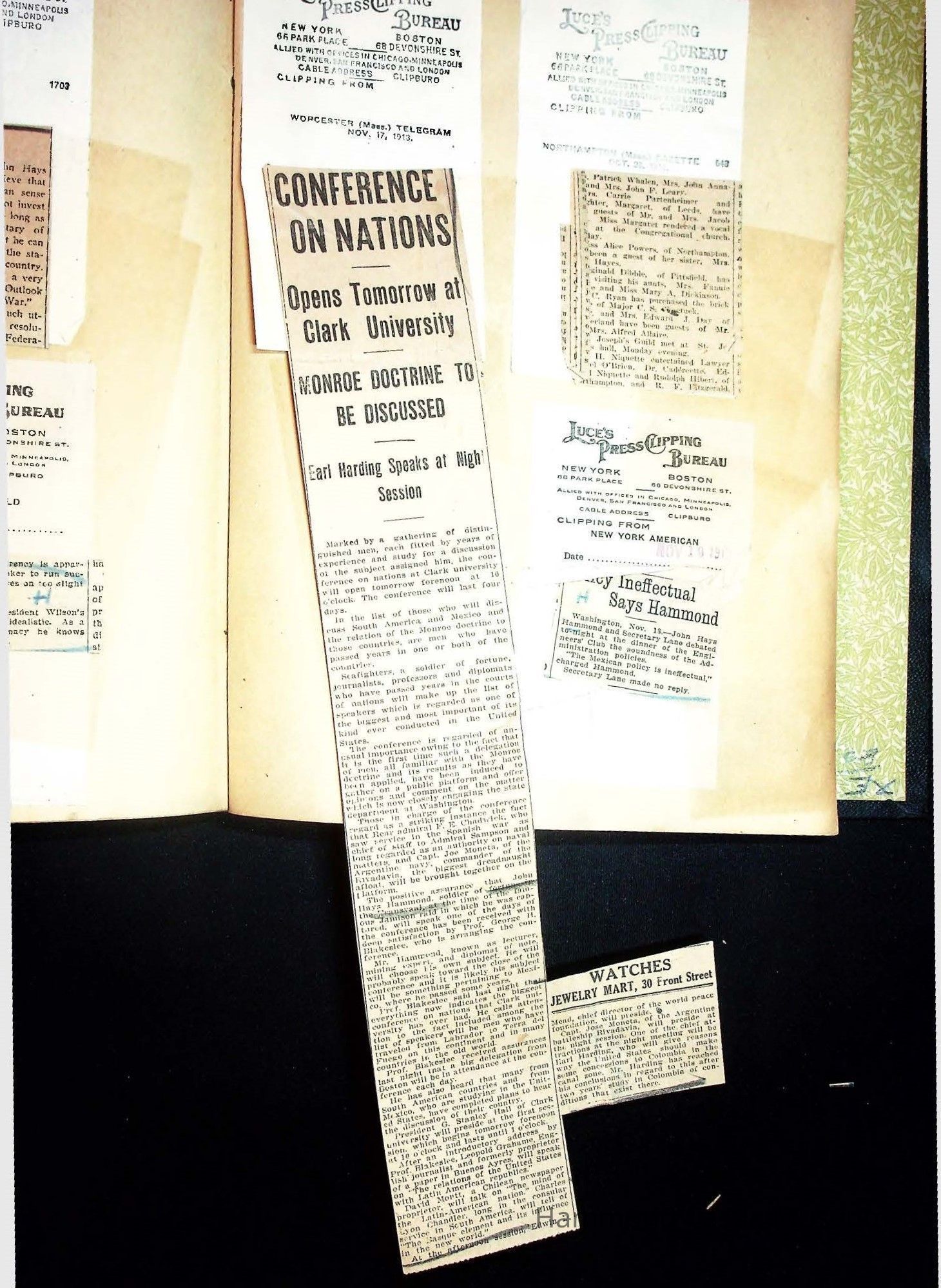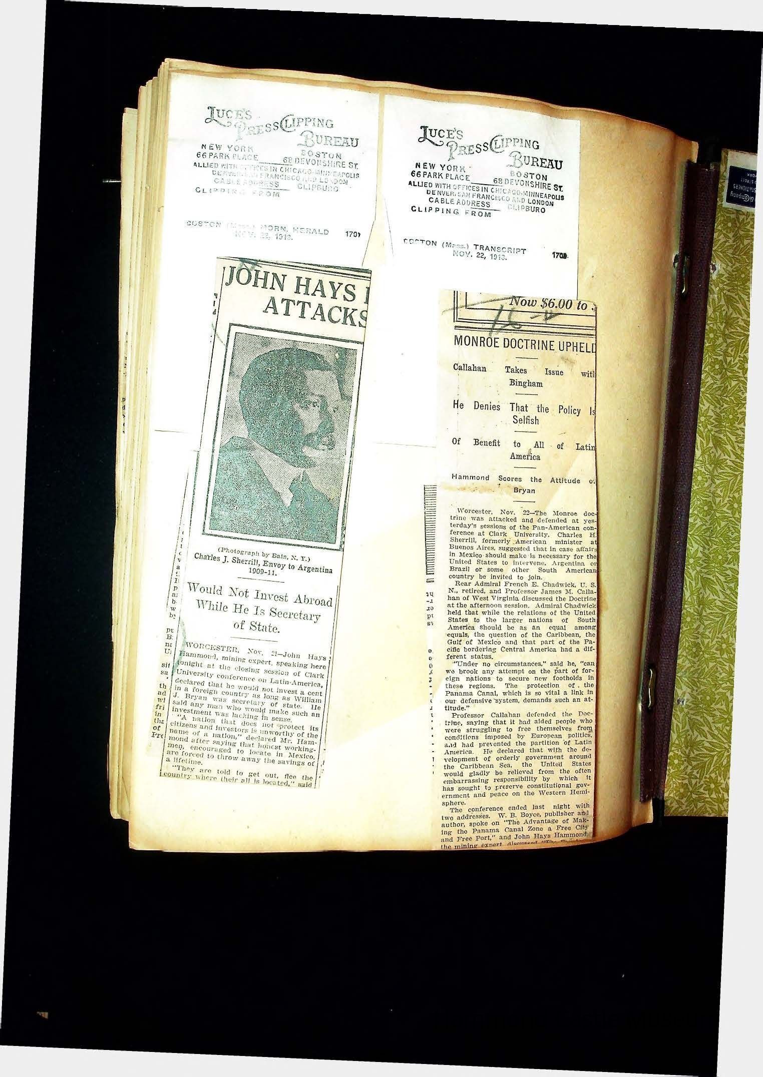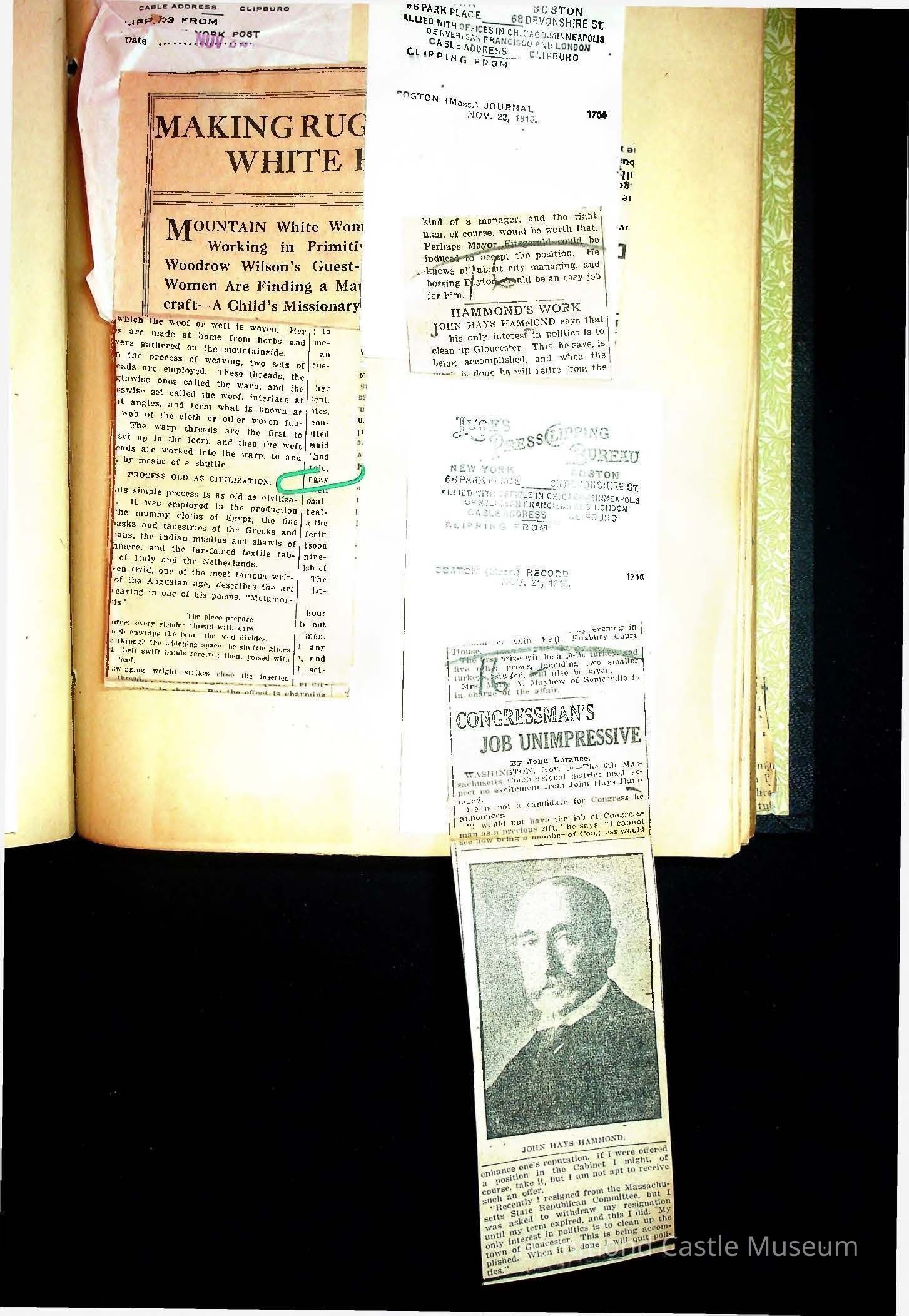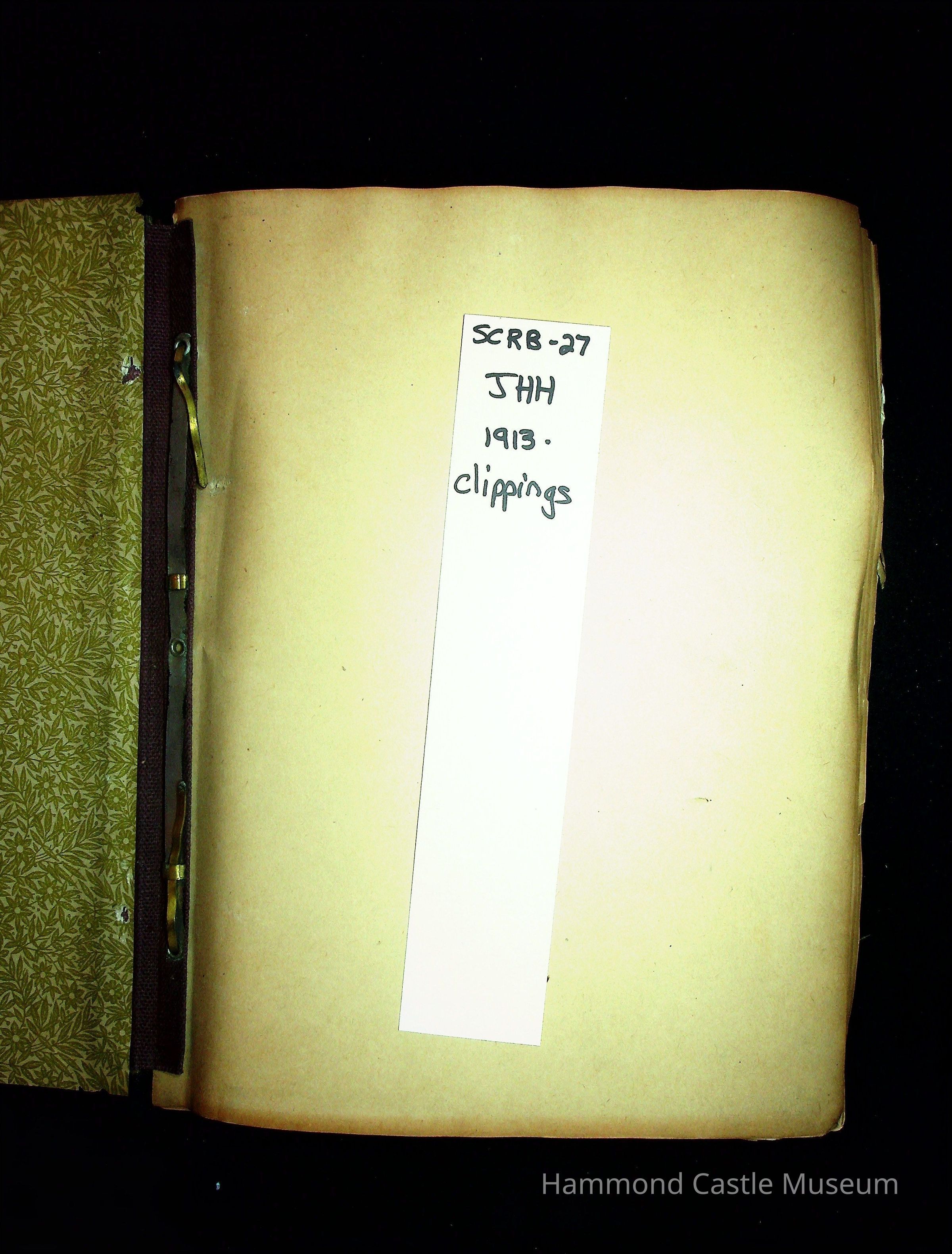 1913 scrapbook of newspaper articles about John Hays Hammond (Sr) and Mrs. Hammond covering governmental policies, Sherman Act, Eugenics & politics.