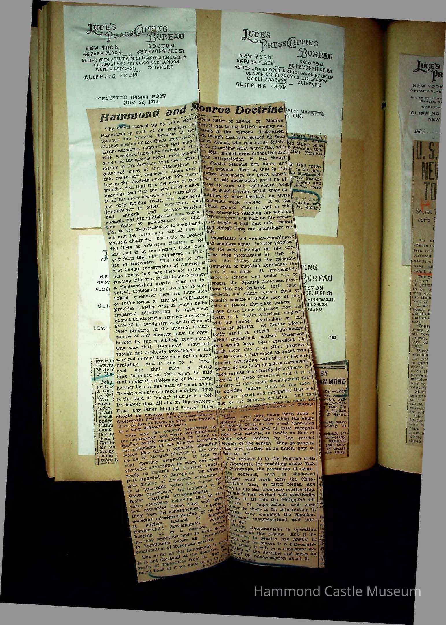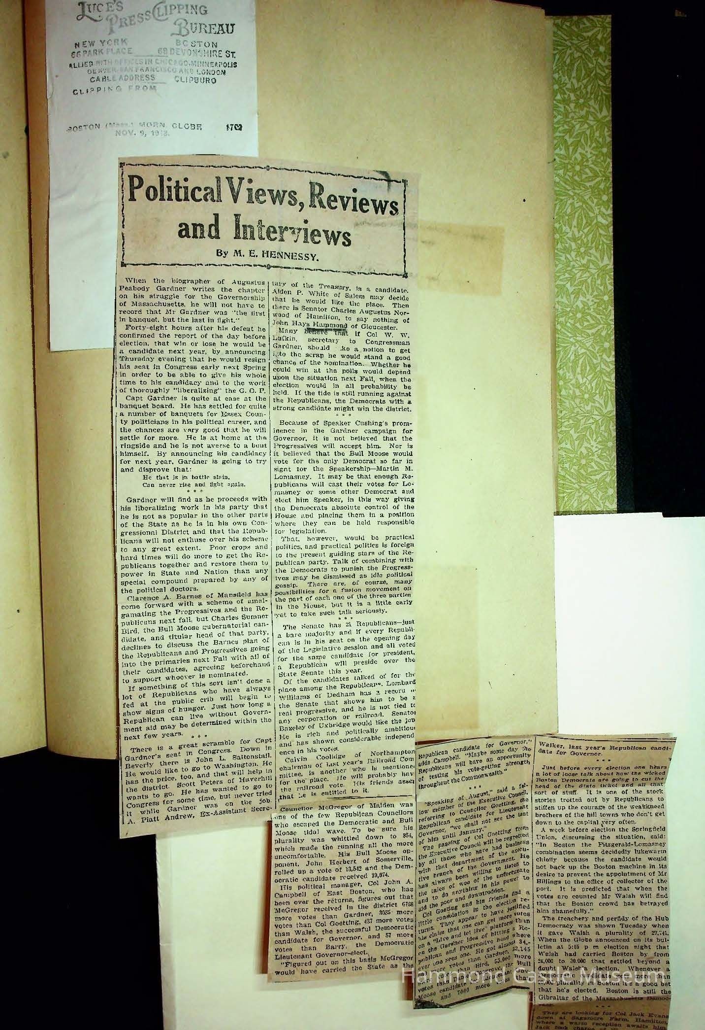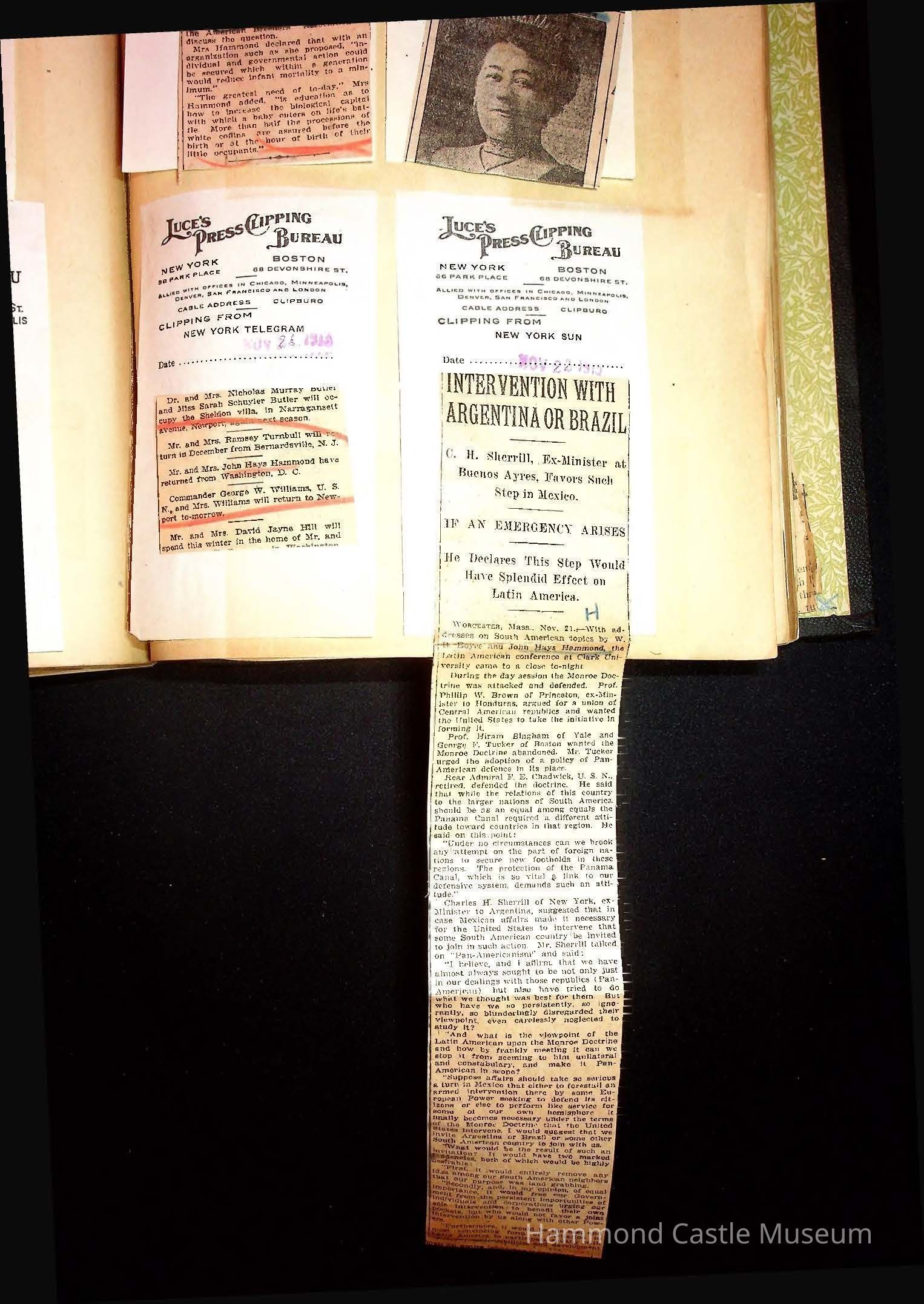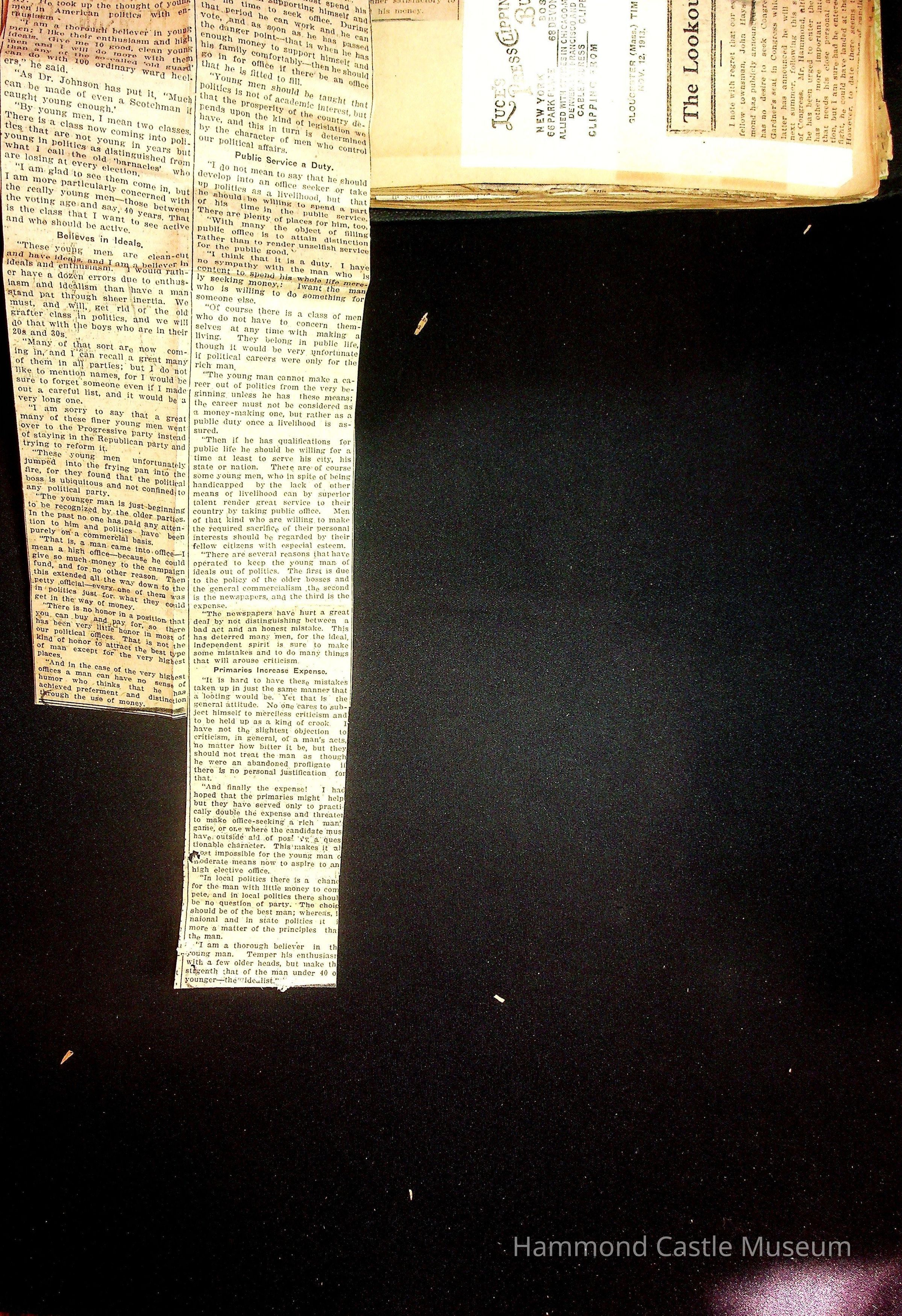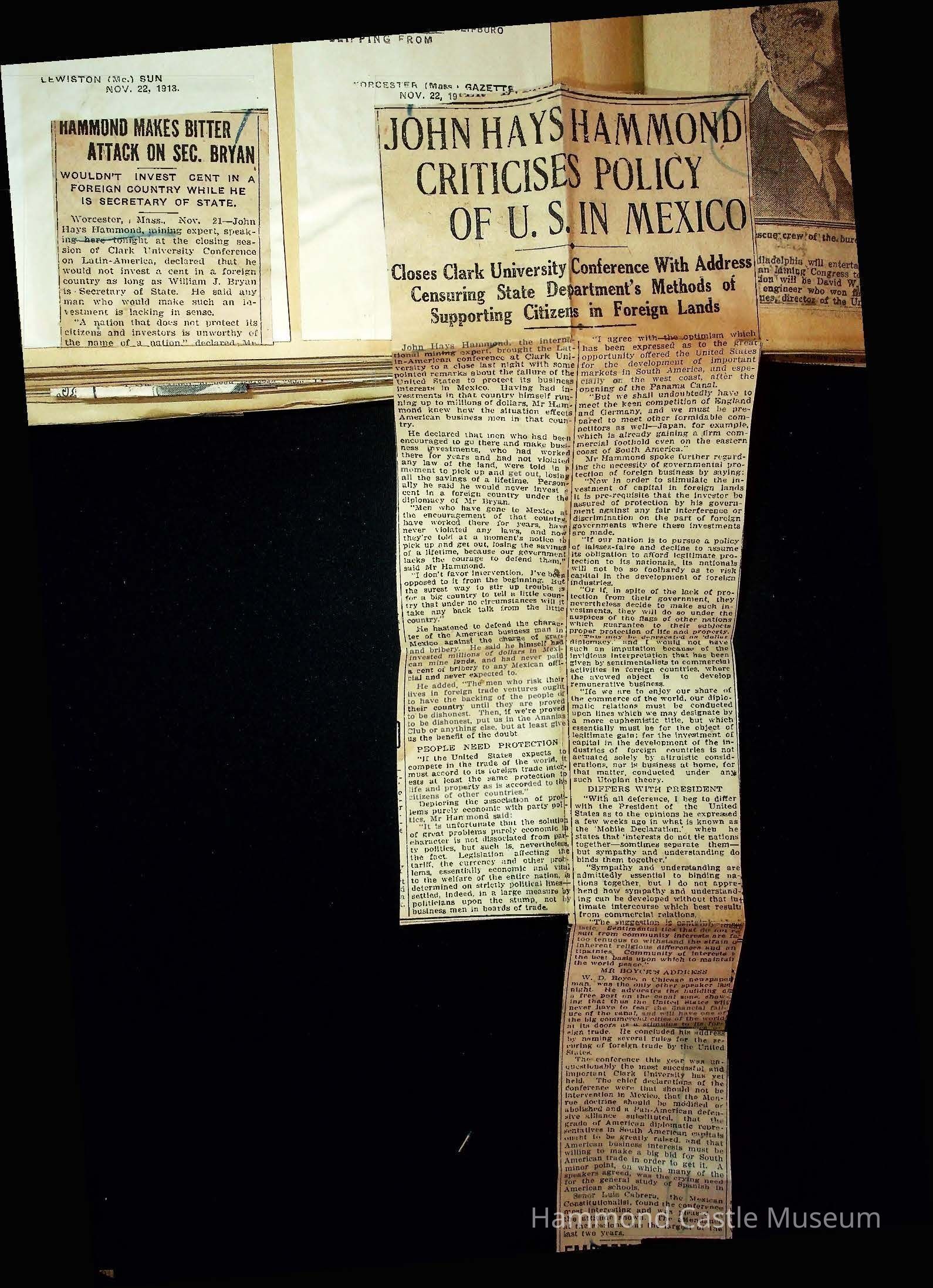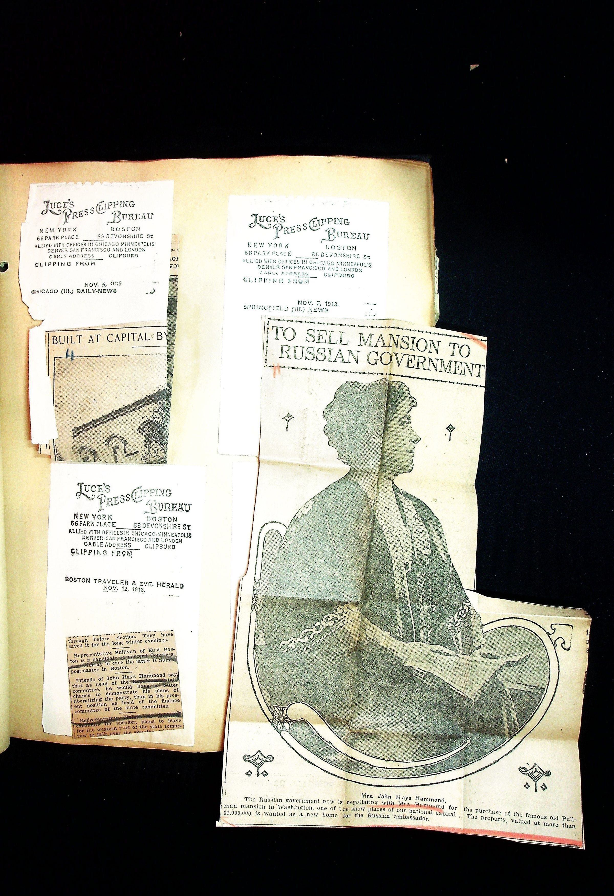 1913 scrapbook of newspaper articles about John Hays Hammond (Sr) and Mrs. Hammond covering governmental policies, Sherman Act, Eugenics & politics.