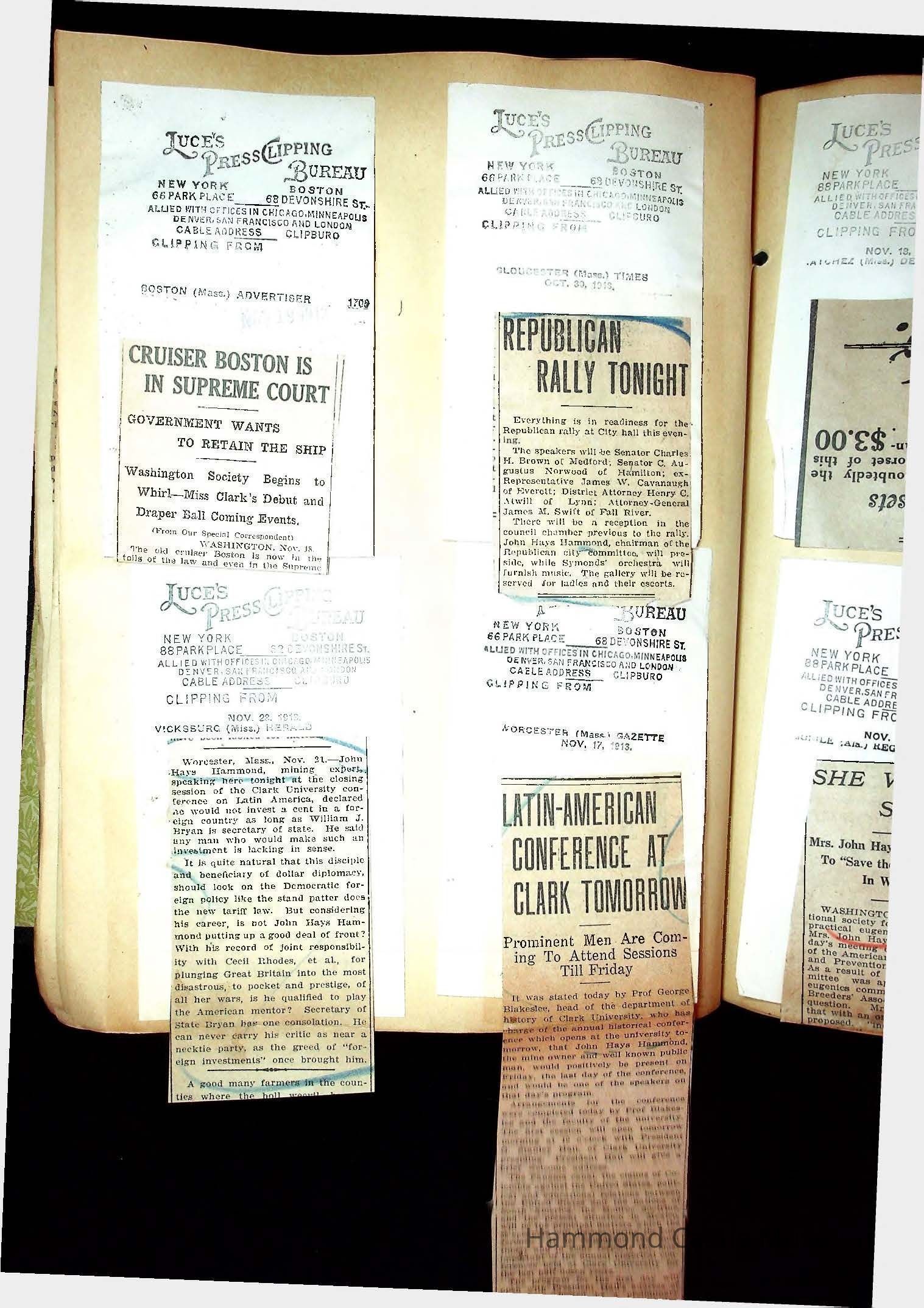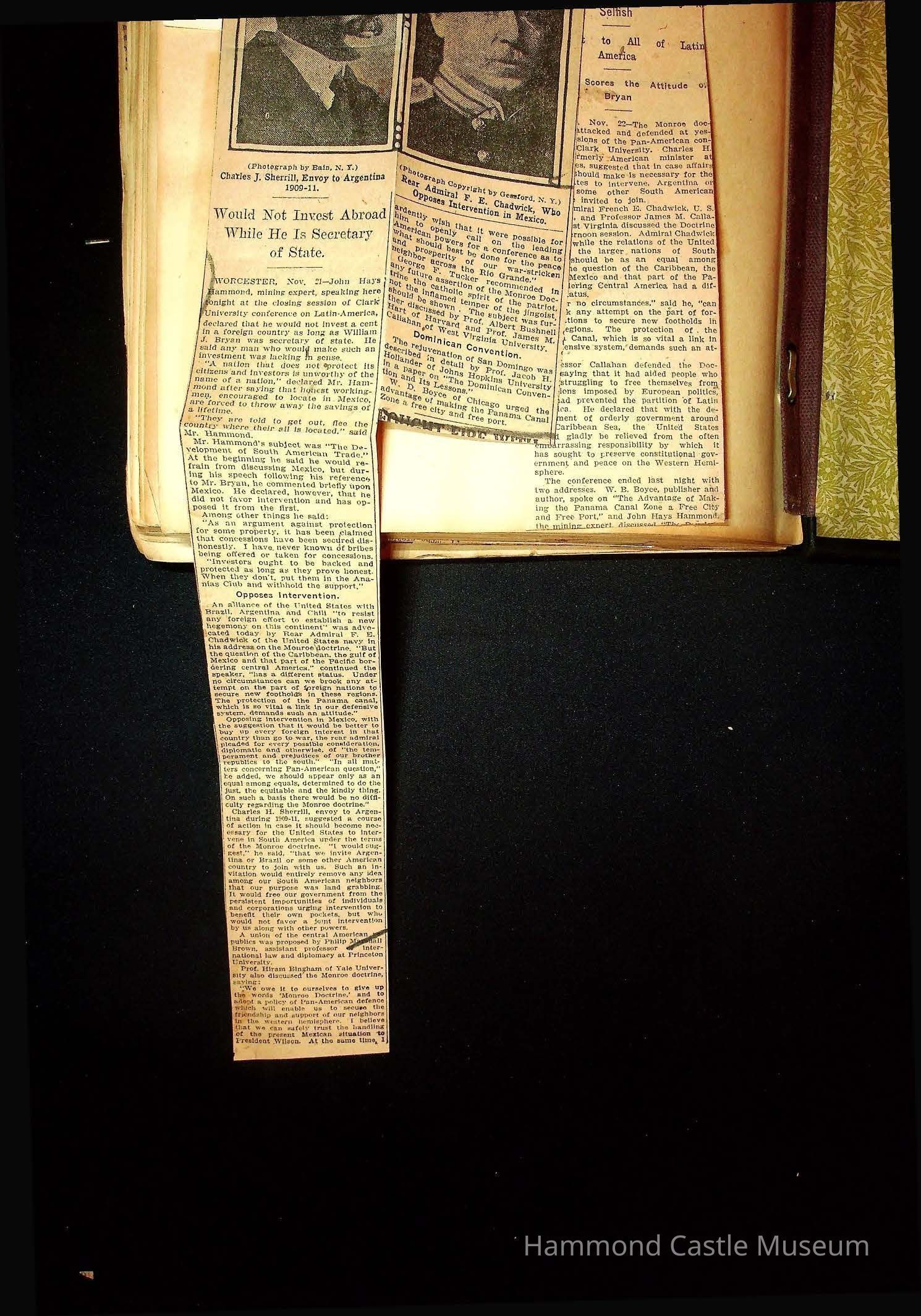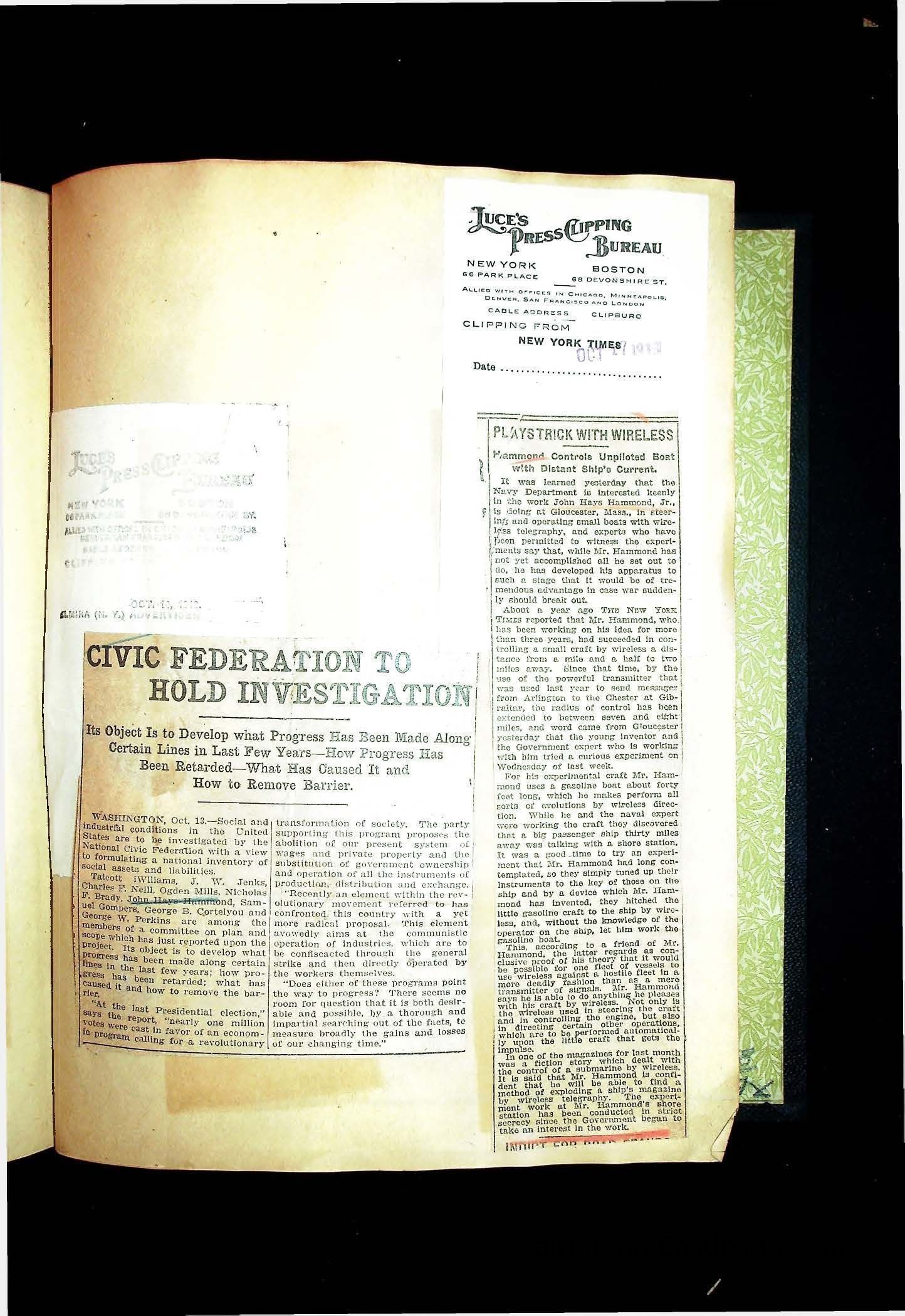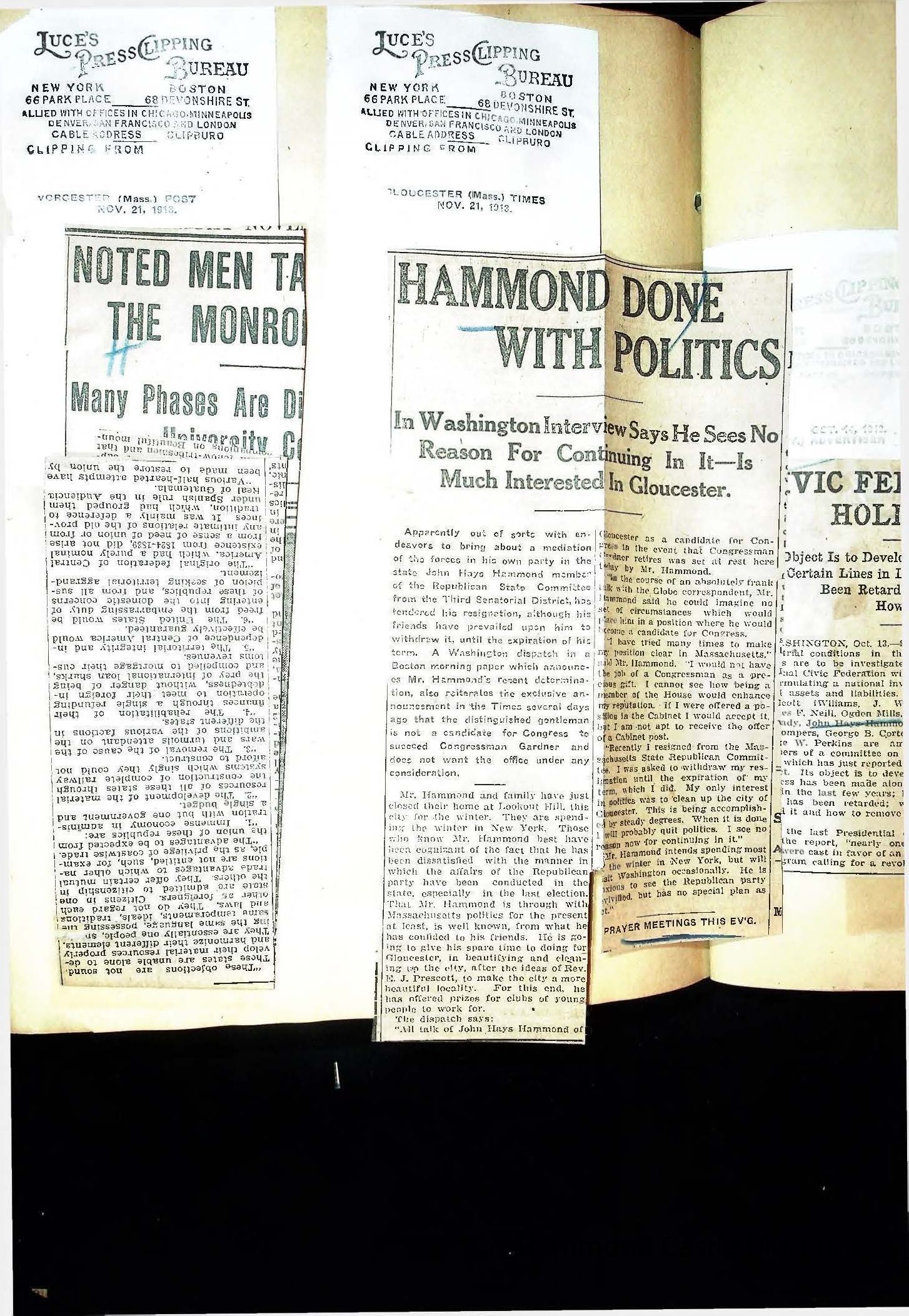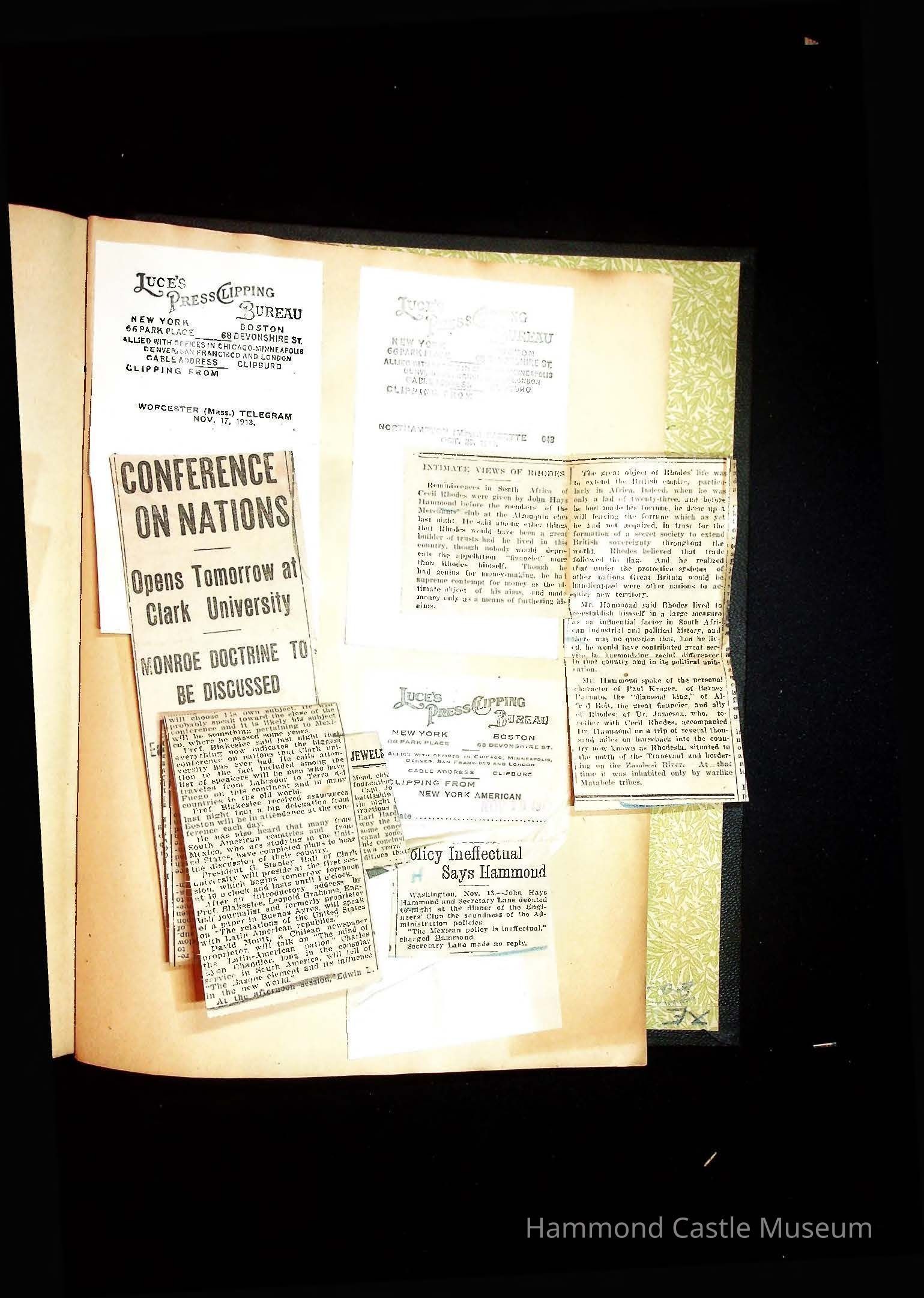 1913 scrapbook of newspaper articles about John Hays Hammond (Sr) and Mrs. Hammond covering governmental policies, Sherman Act, Eugenics & politics.