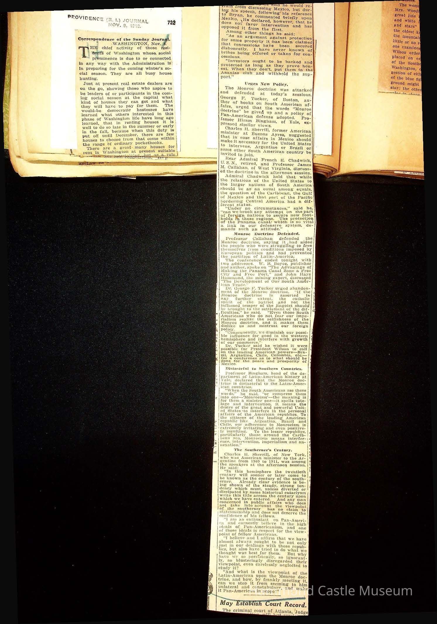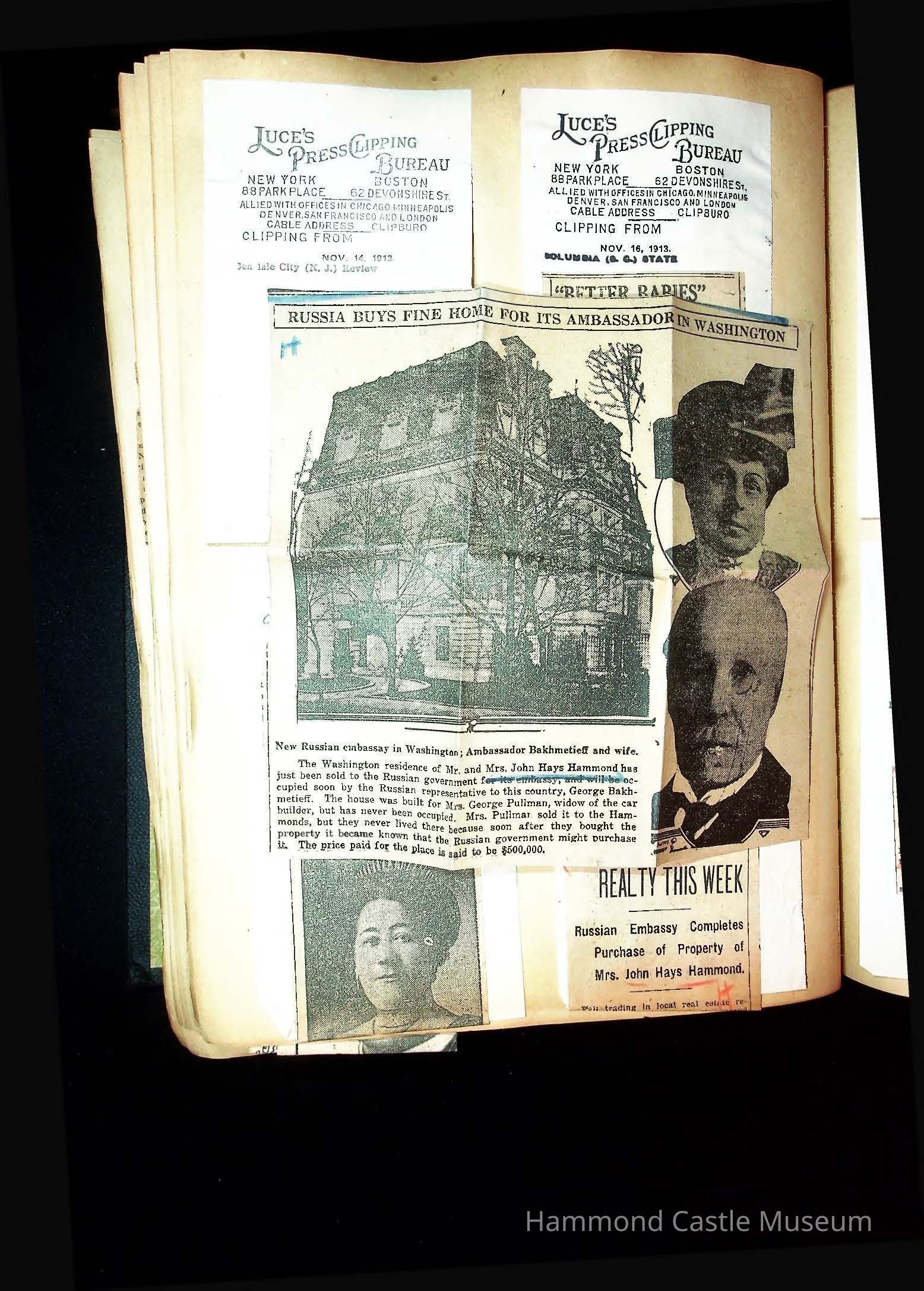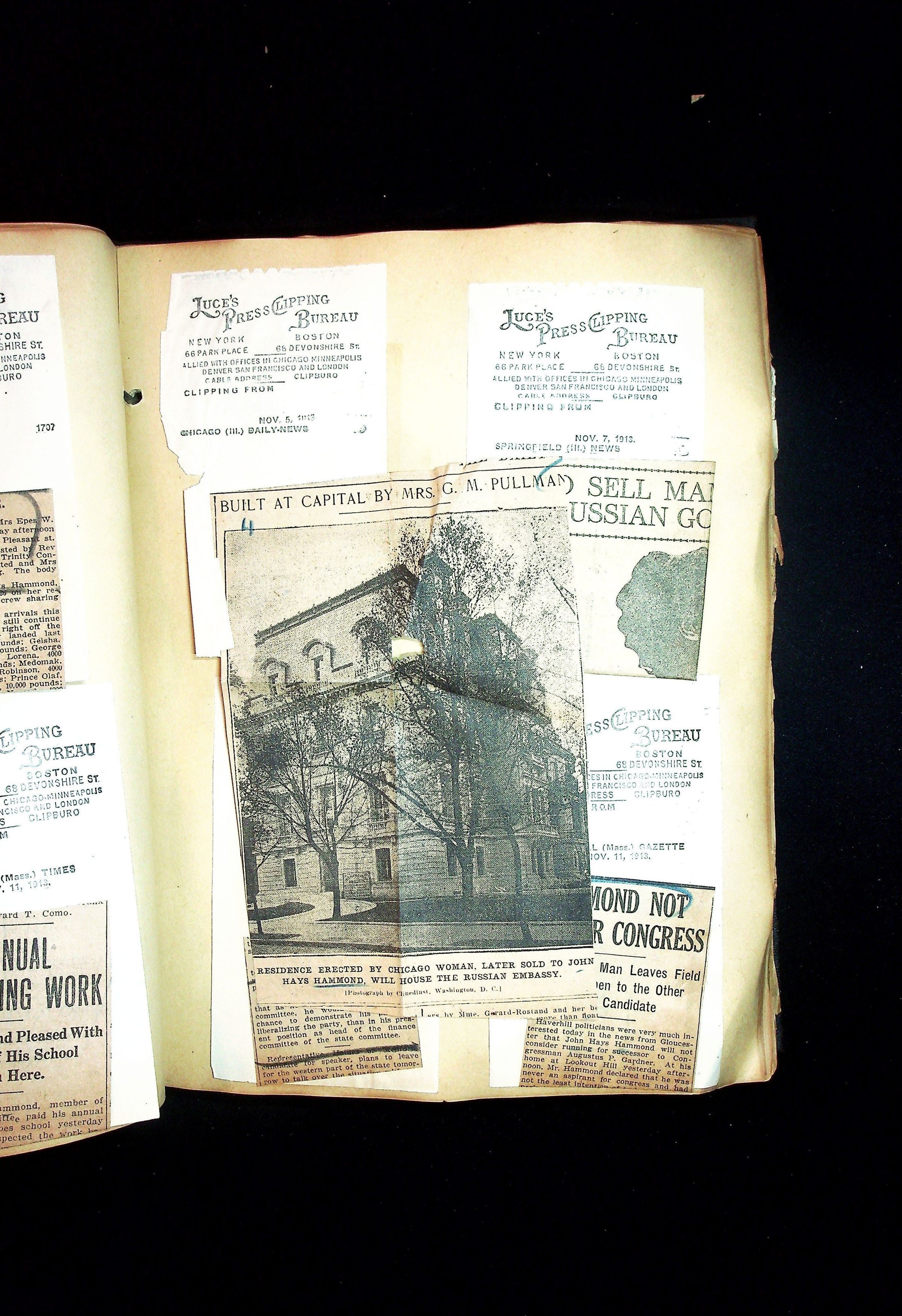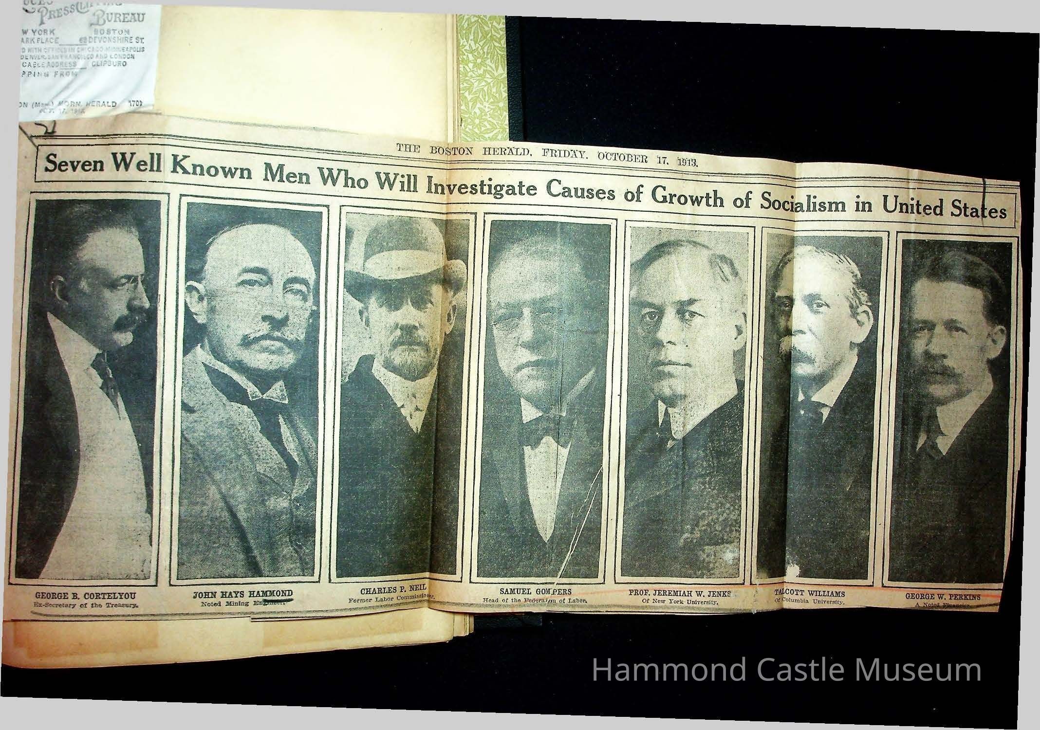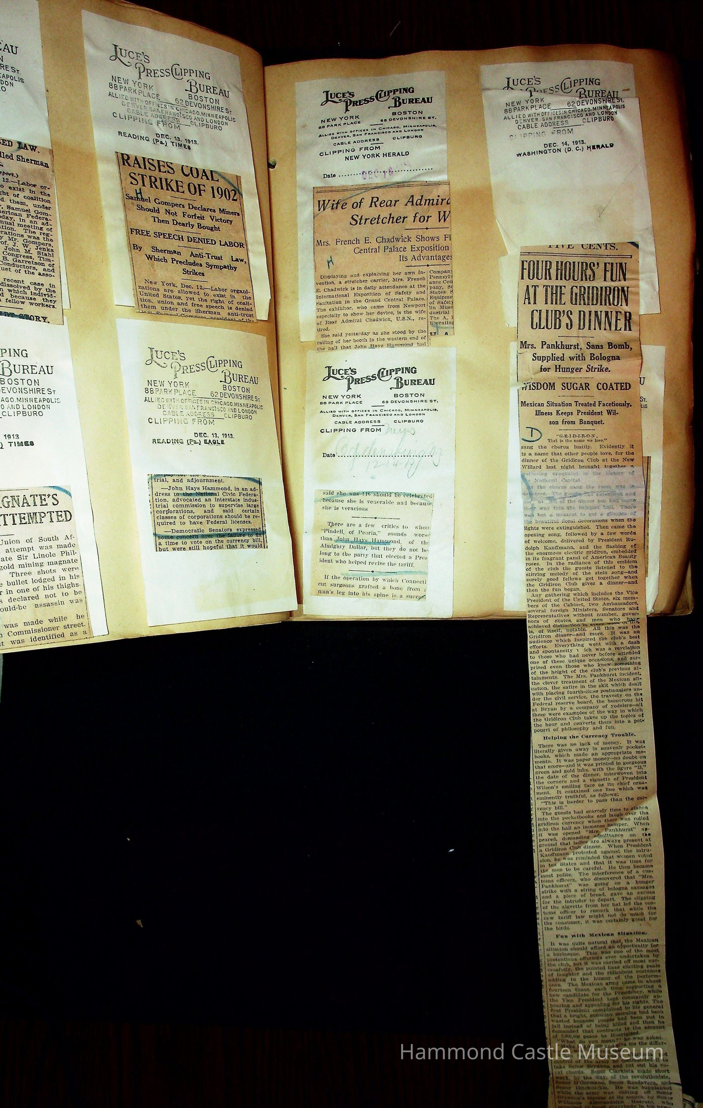 1913 scrapbook of newspaper articles about John Hays Hammond (Sr) and Mrs. Hammond covering governmental policies, Sherman Act, Eugenics & politics.