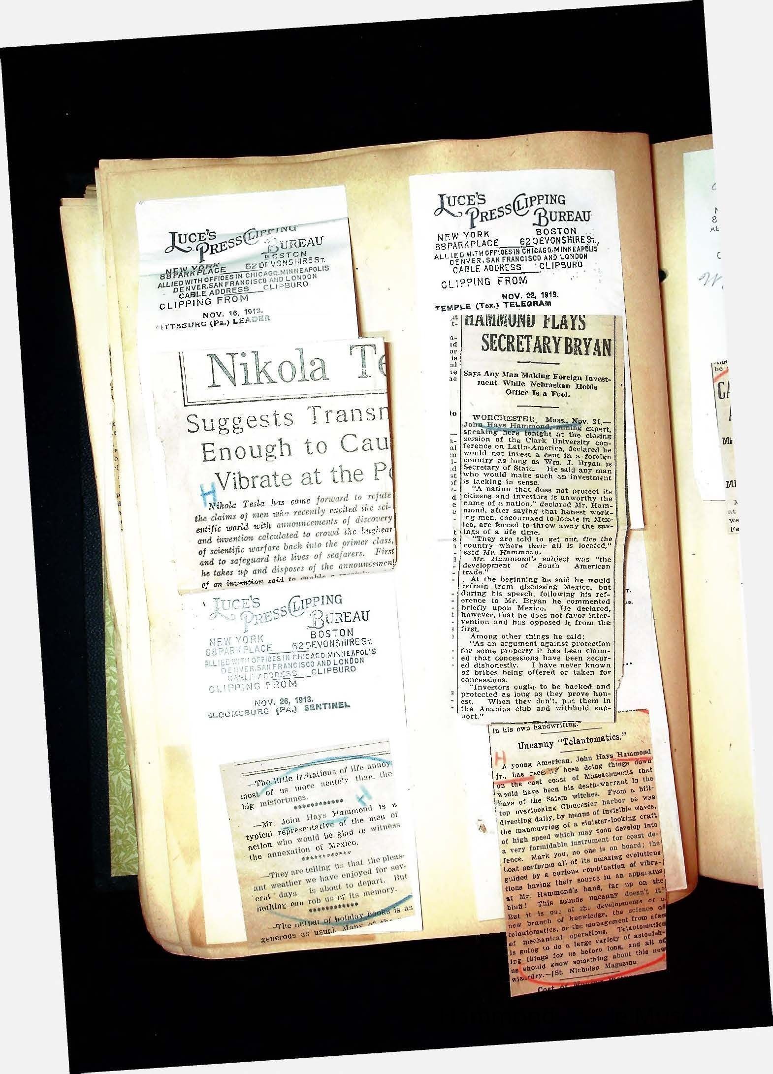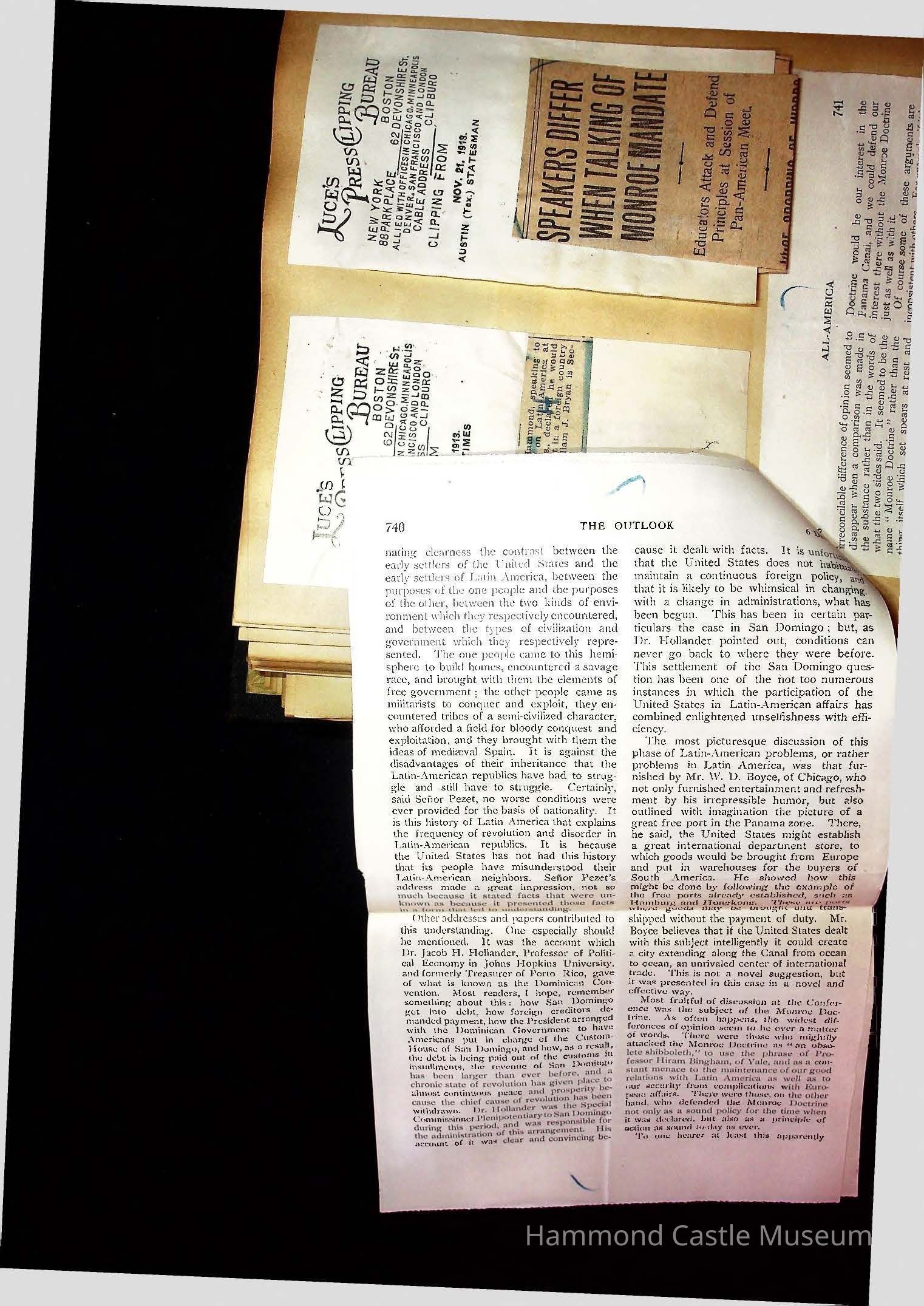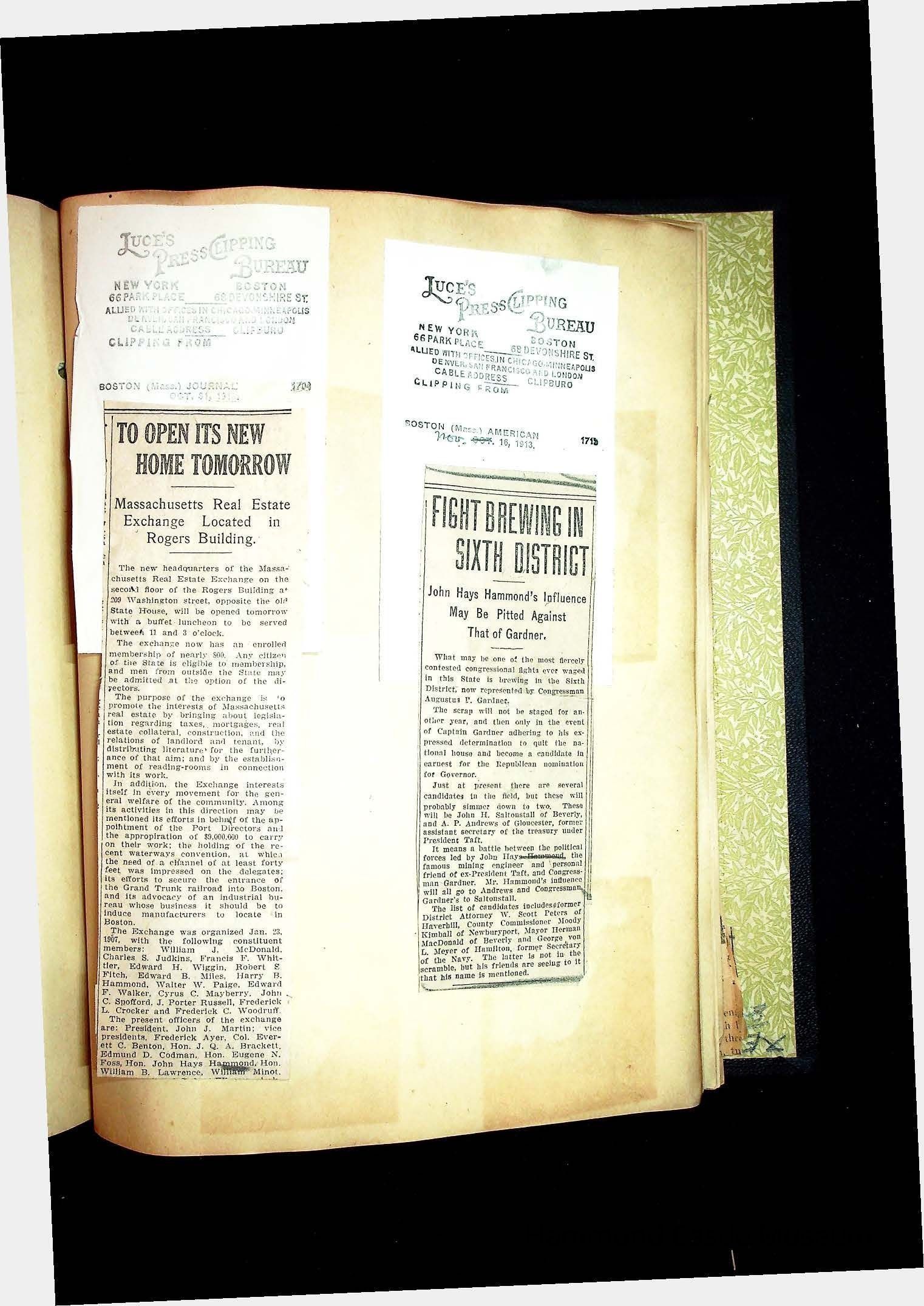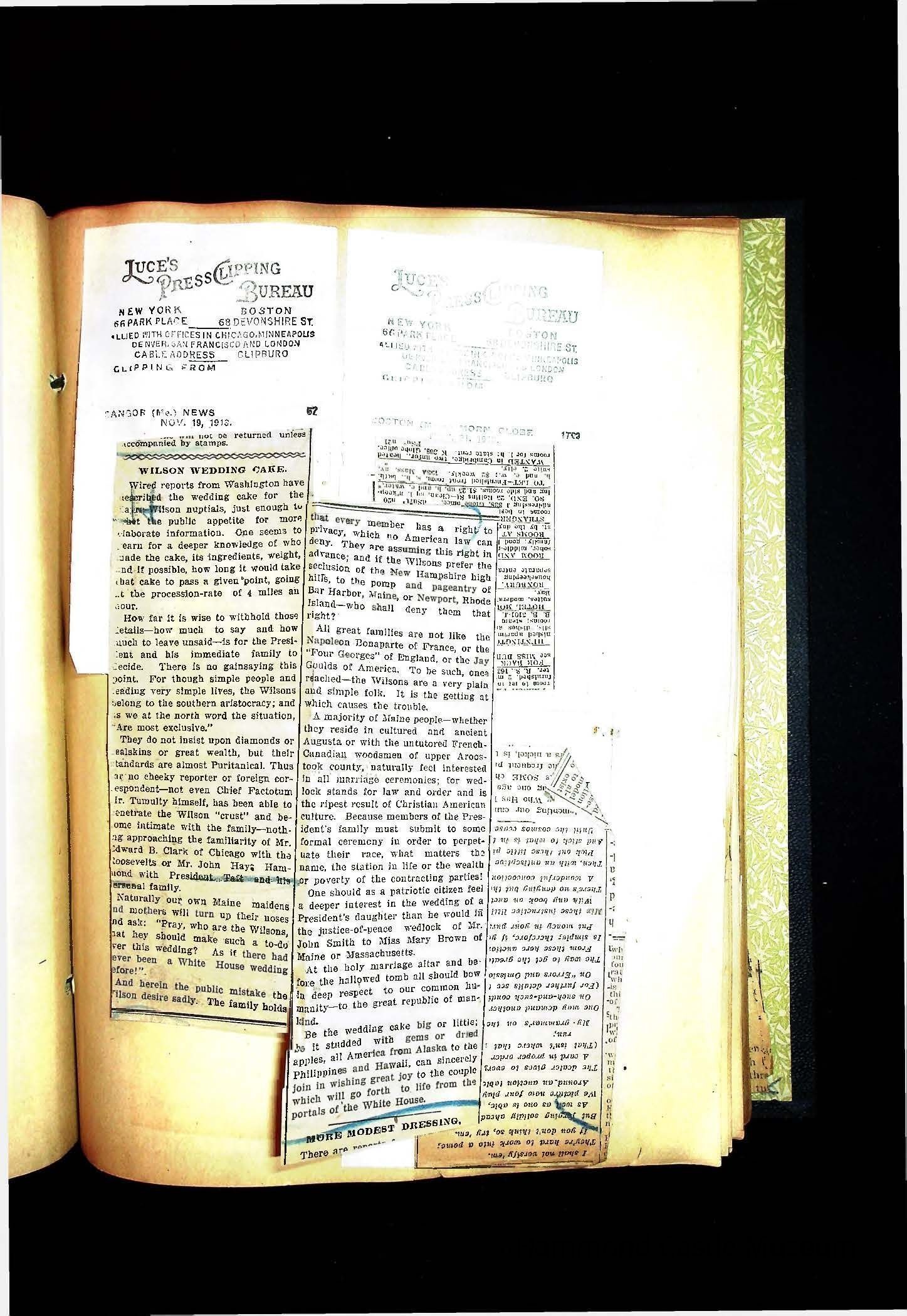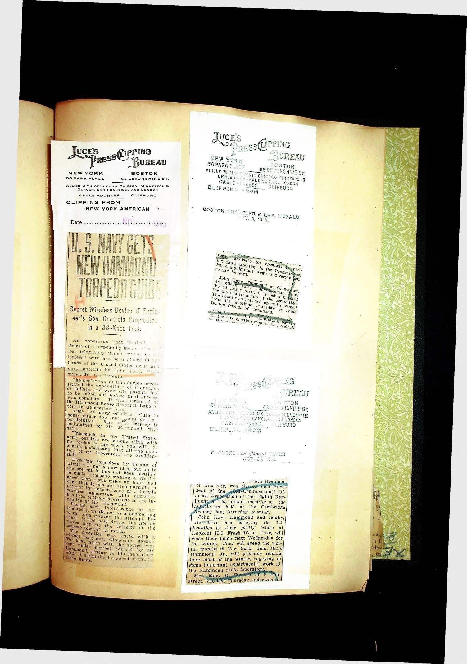 1913 scrapbook of newspaper articles about John Hays Hammond (Sr) and Mrs. Hammond covering governmental policies, Sherman Act, Eugenics & politics.