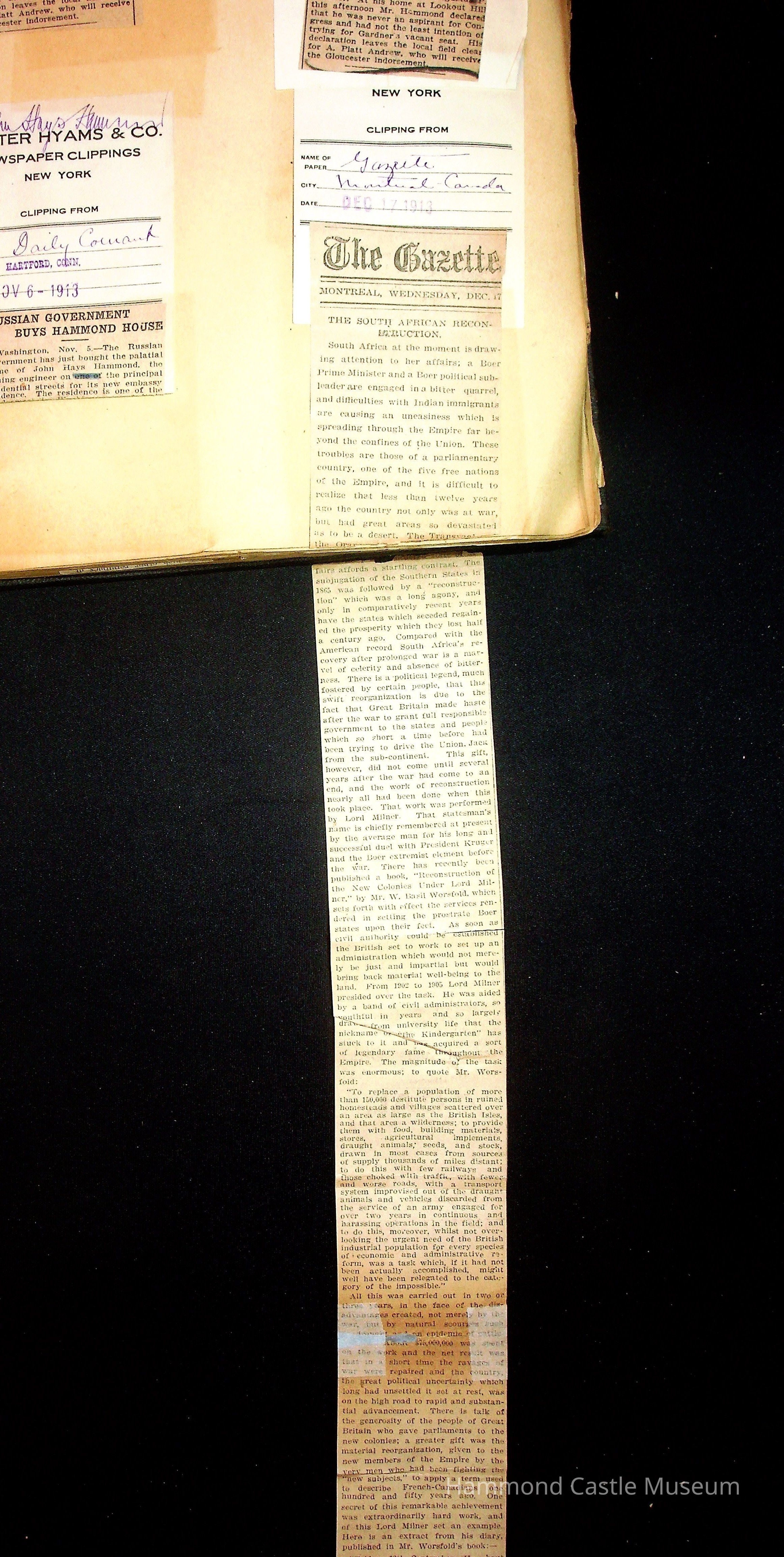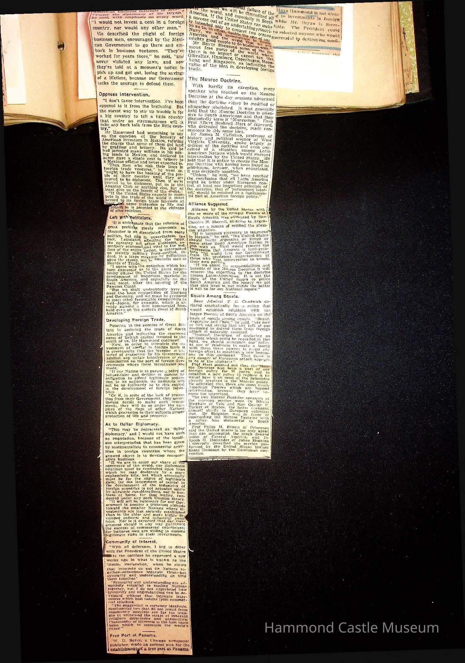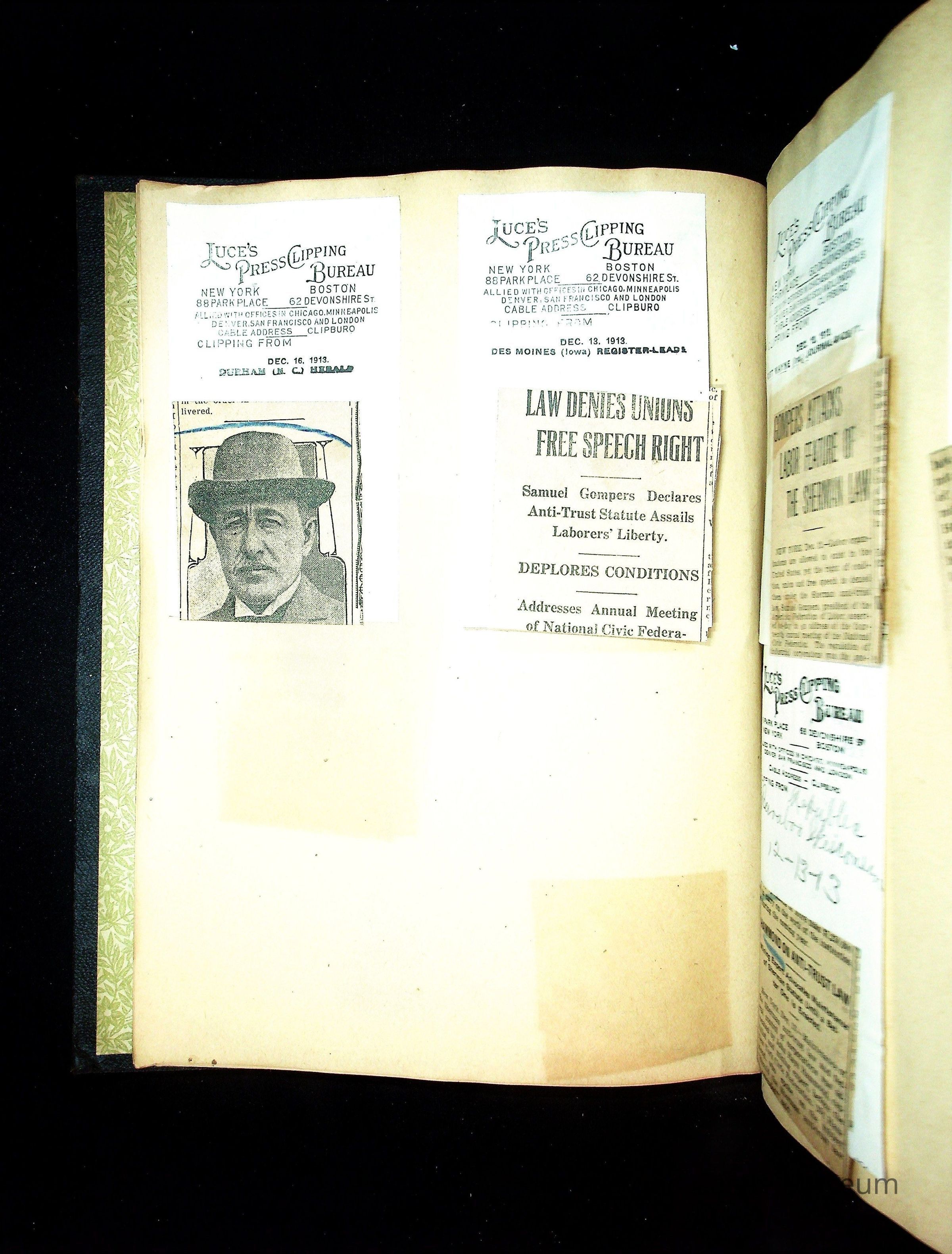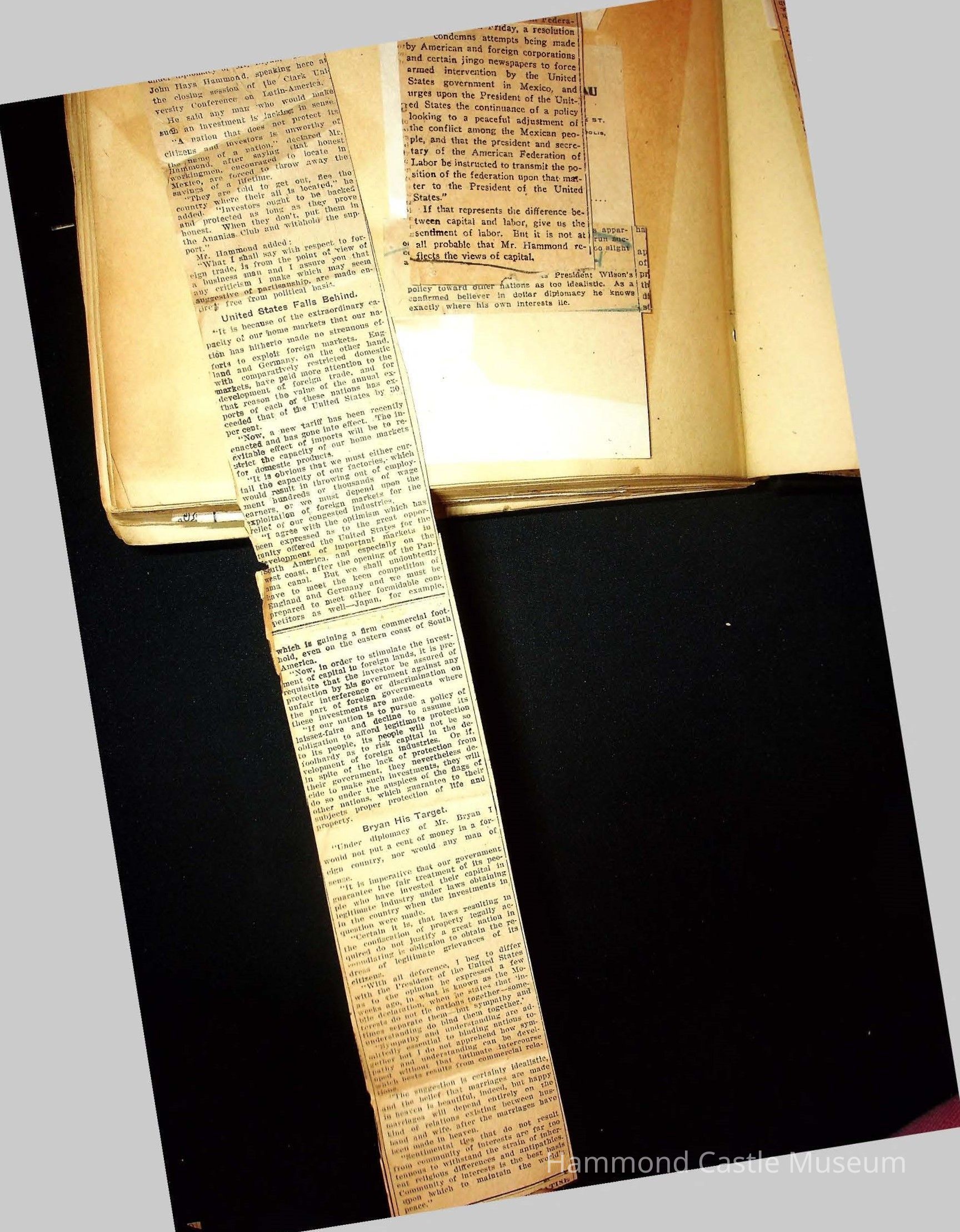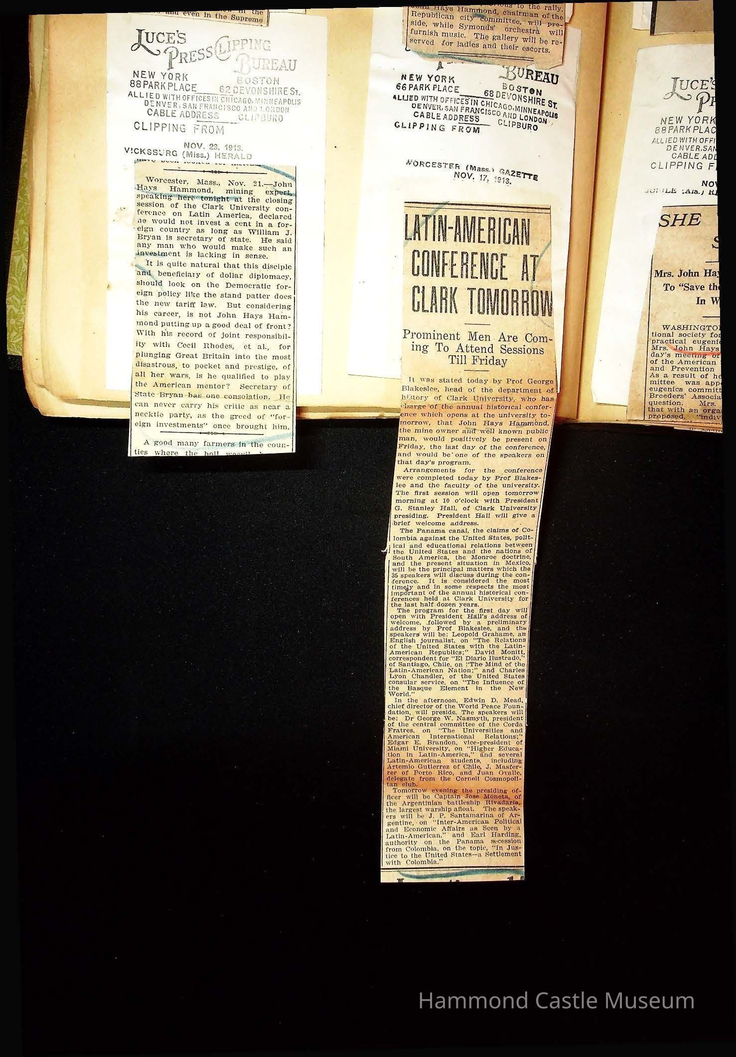 1913 scrapbook of newspaper articles about John Hays Hammond (Sr) and Mrs. Hammond covering governmental policies, Sherman Act, Eugenics & politics.
