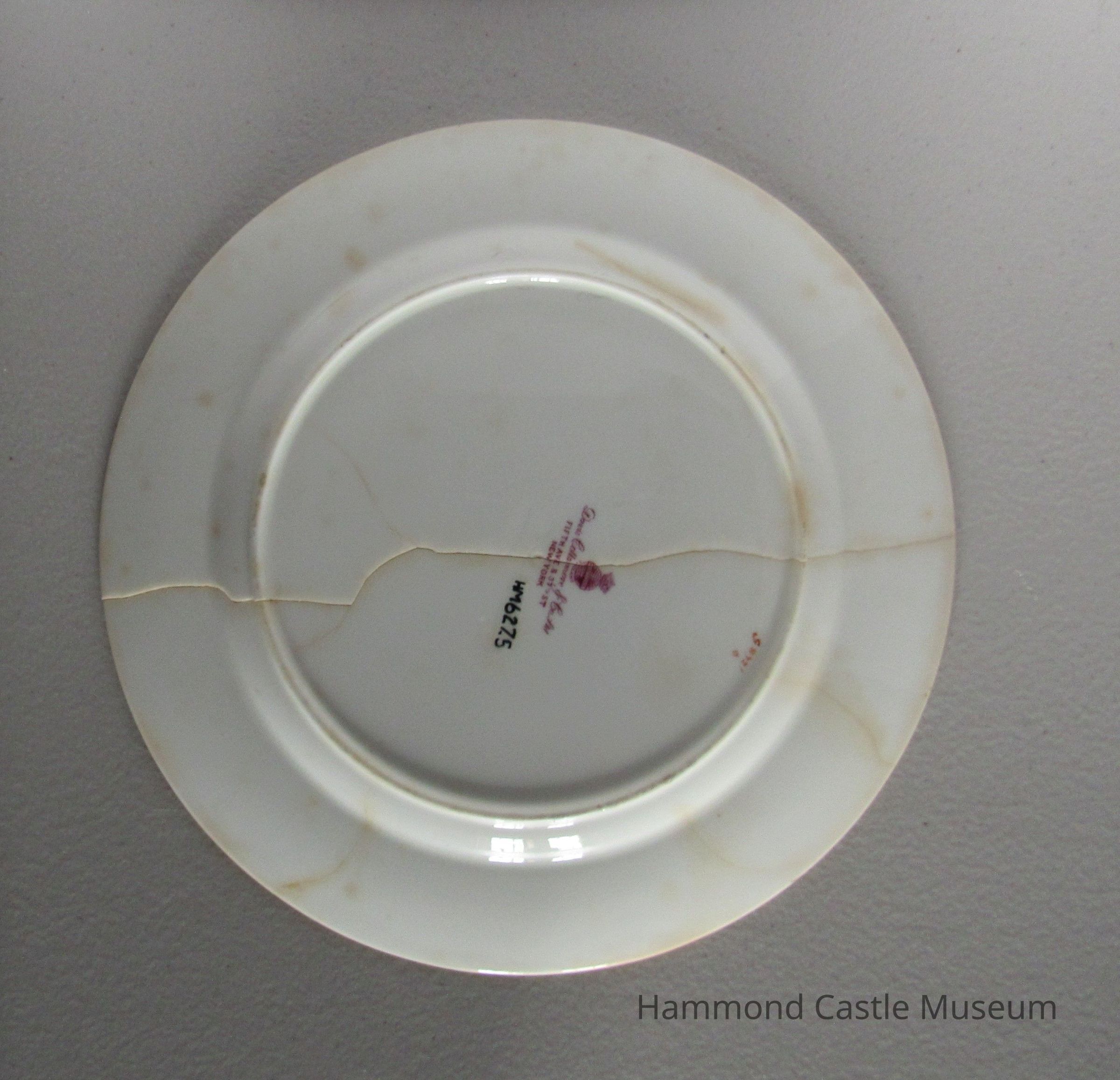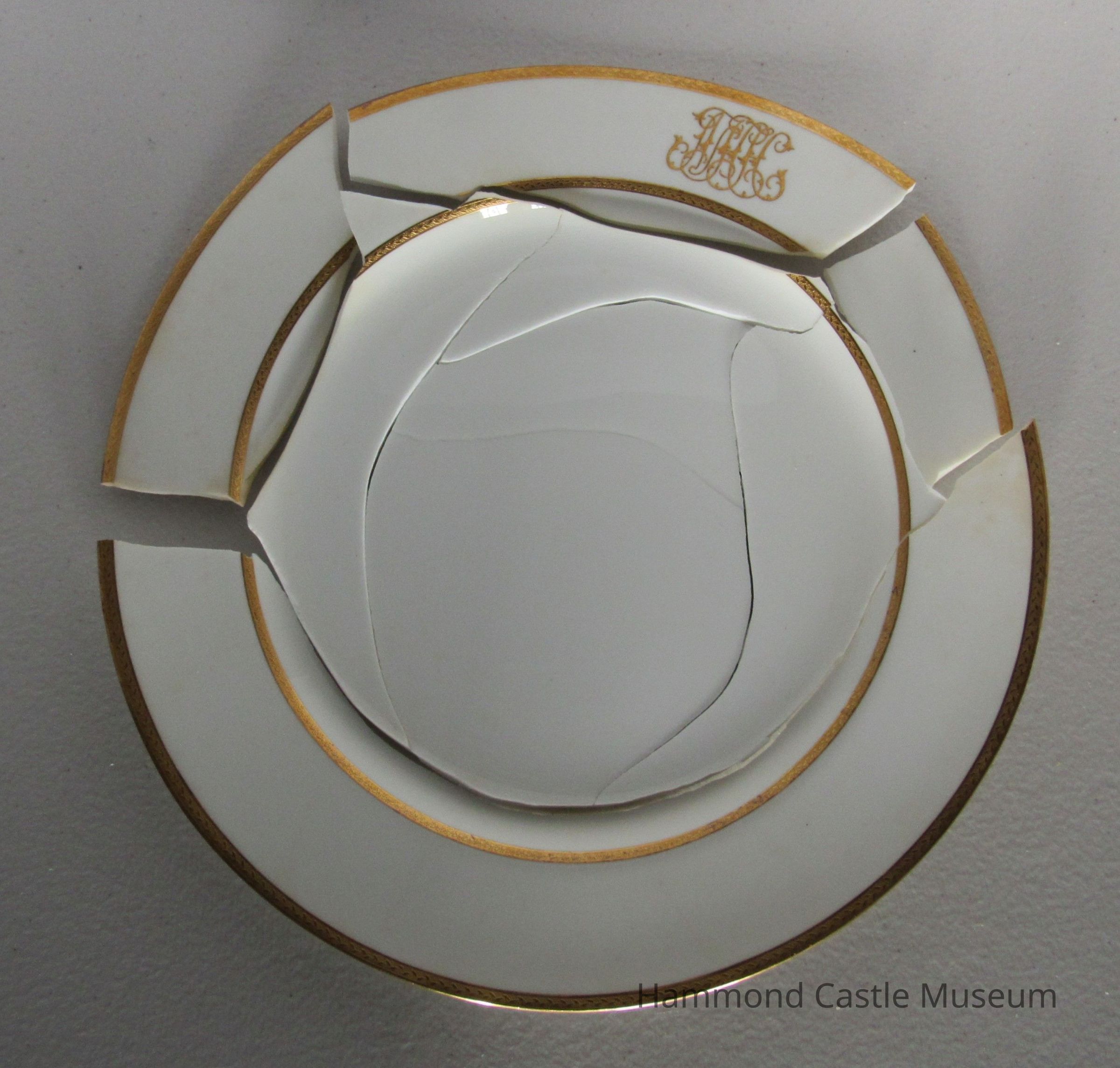 English ceramic luncheon plate with gilt rim and monogram: JHH. Markings on bottom: G8721 (diamond) (split circle) (upside down horseshoe) (upside down T) (half circle) ' (starburst) MINTONS Some broken