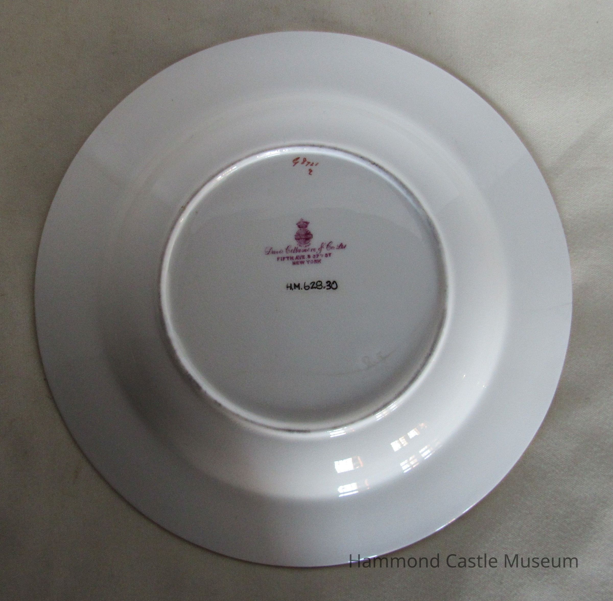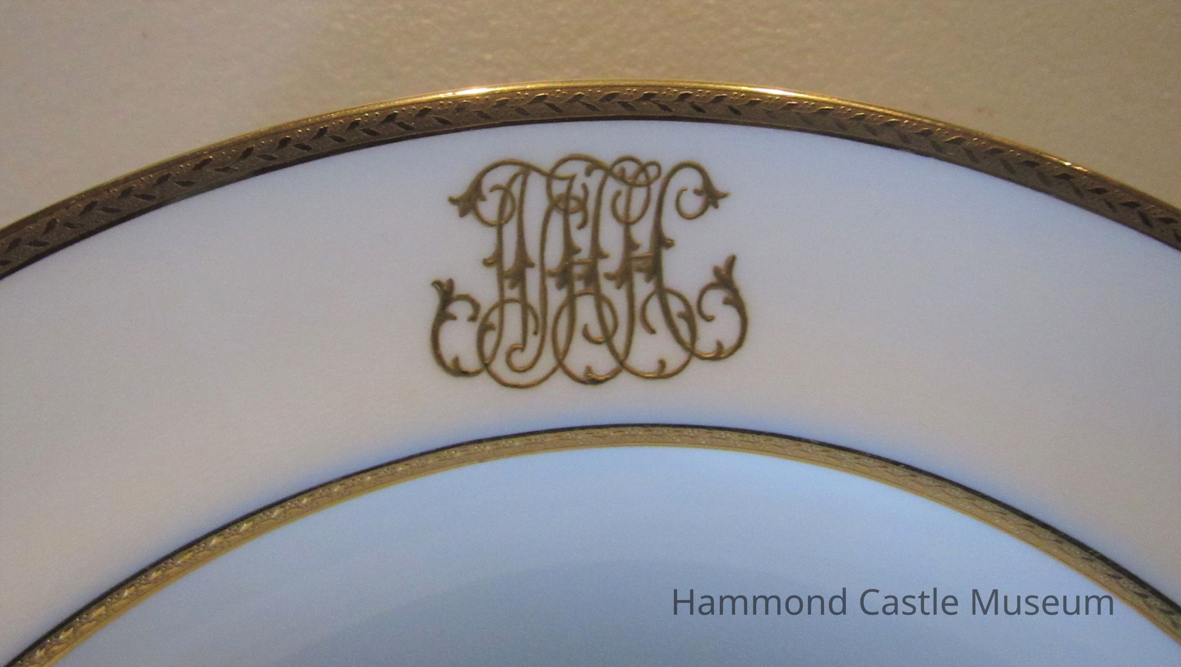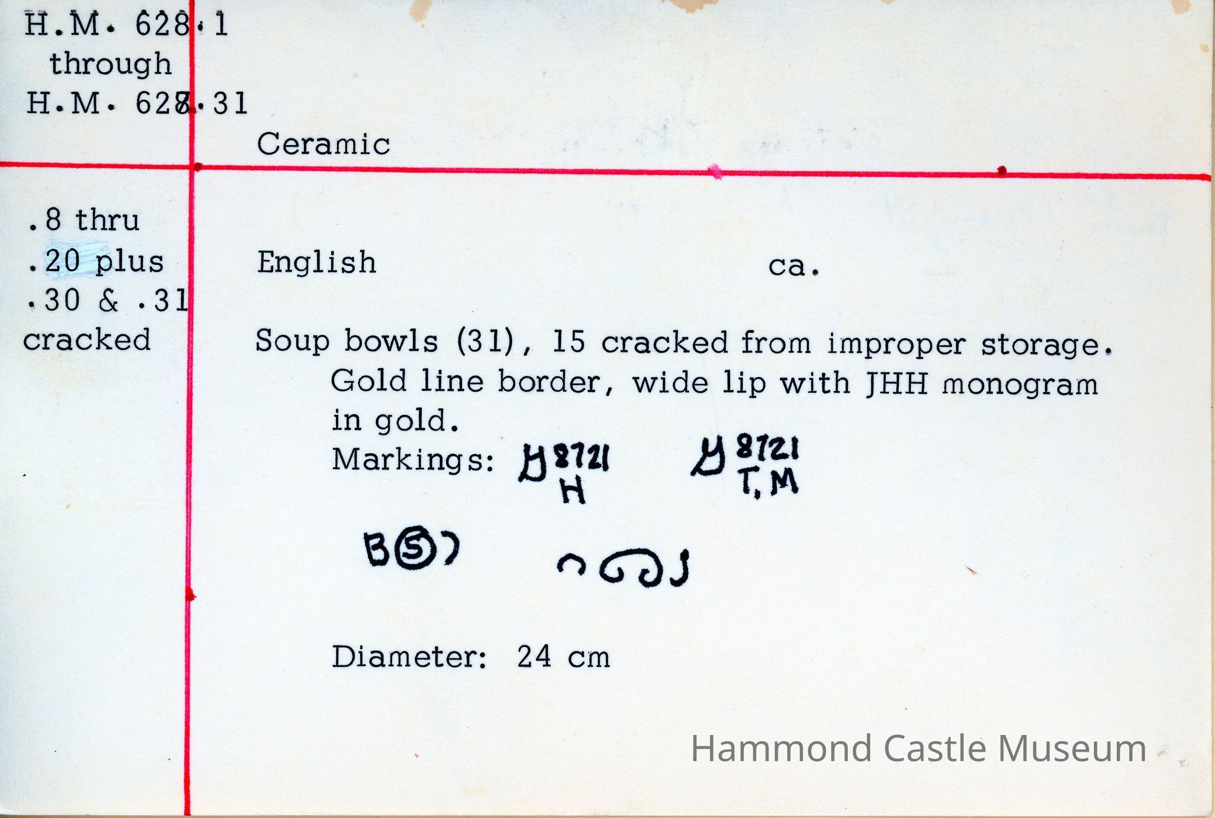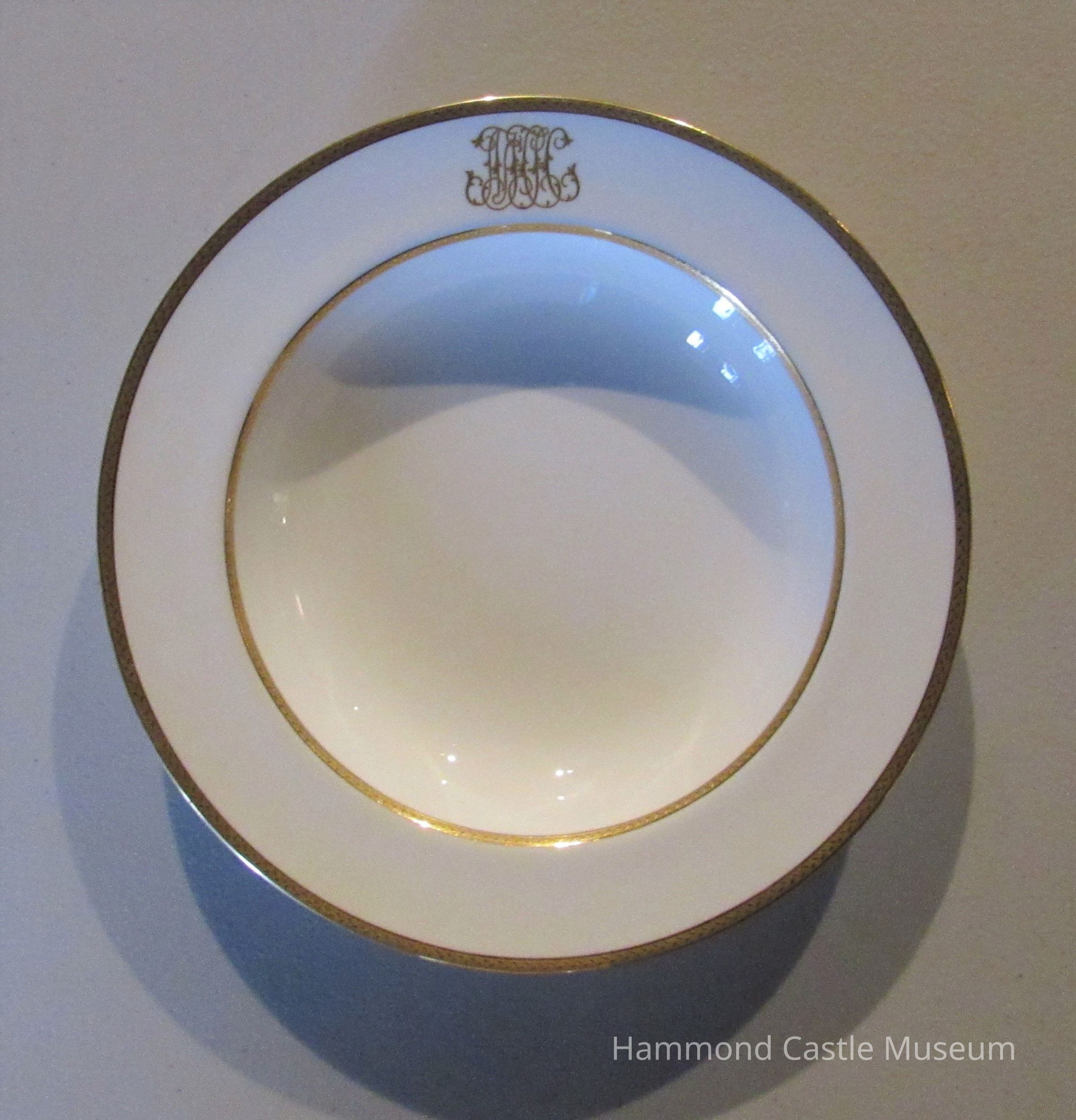 English ceramic soup bowls. Gold line border, wide lip with JHH monogram in gold.