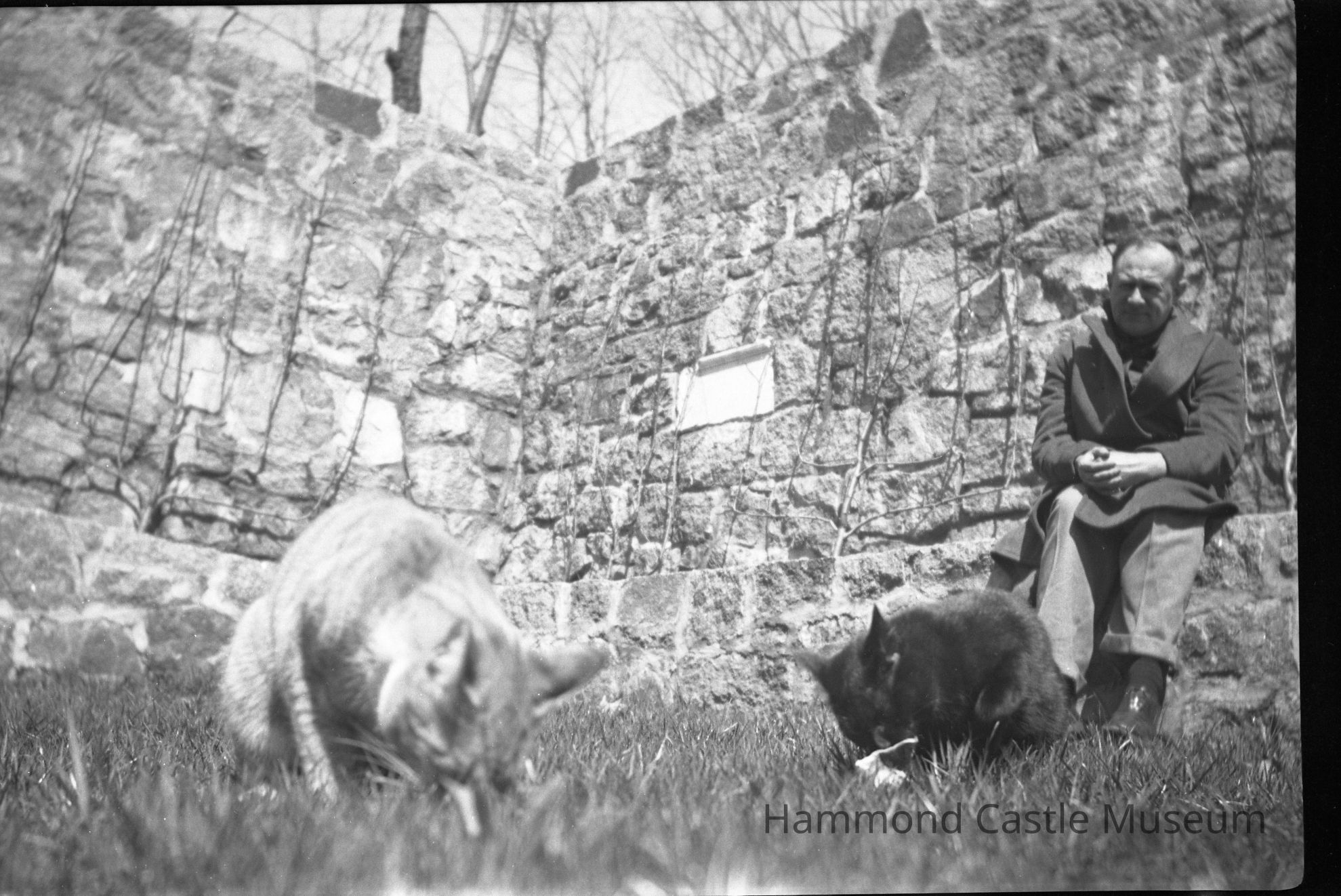 Negative of Hammond in cat garden w 2 cats