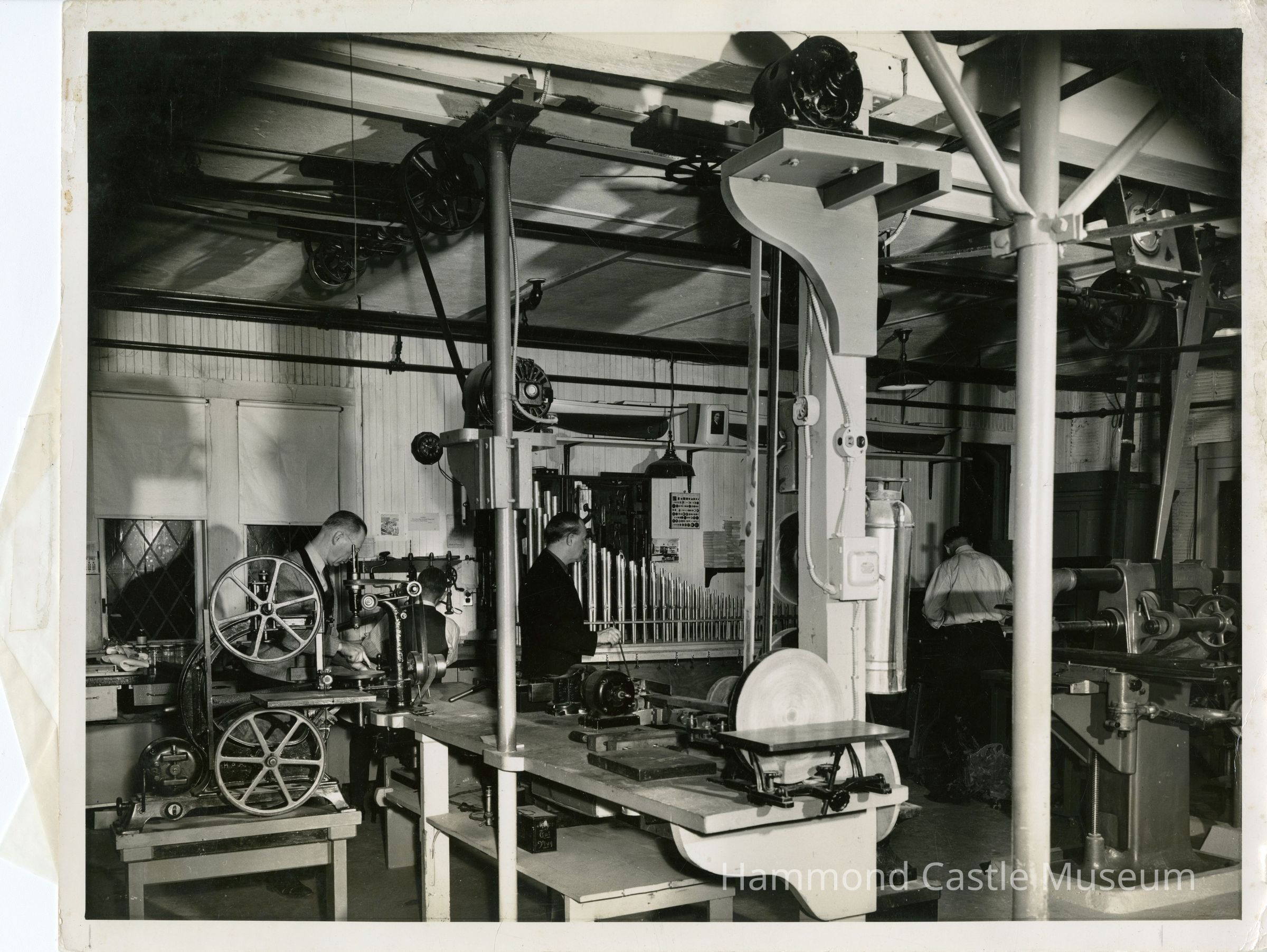 Photo of JHHJr & staff in lower castle lab with organ pipes and tools
