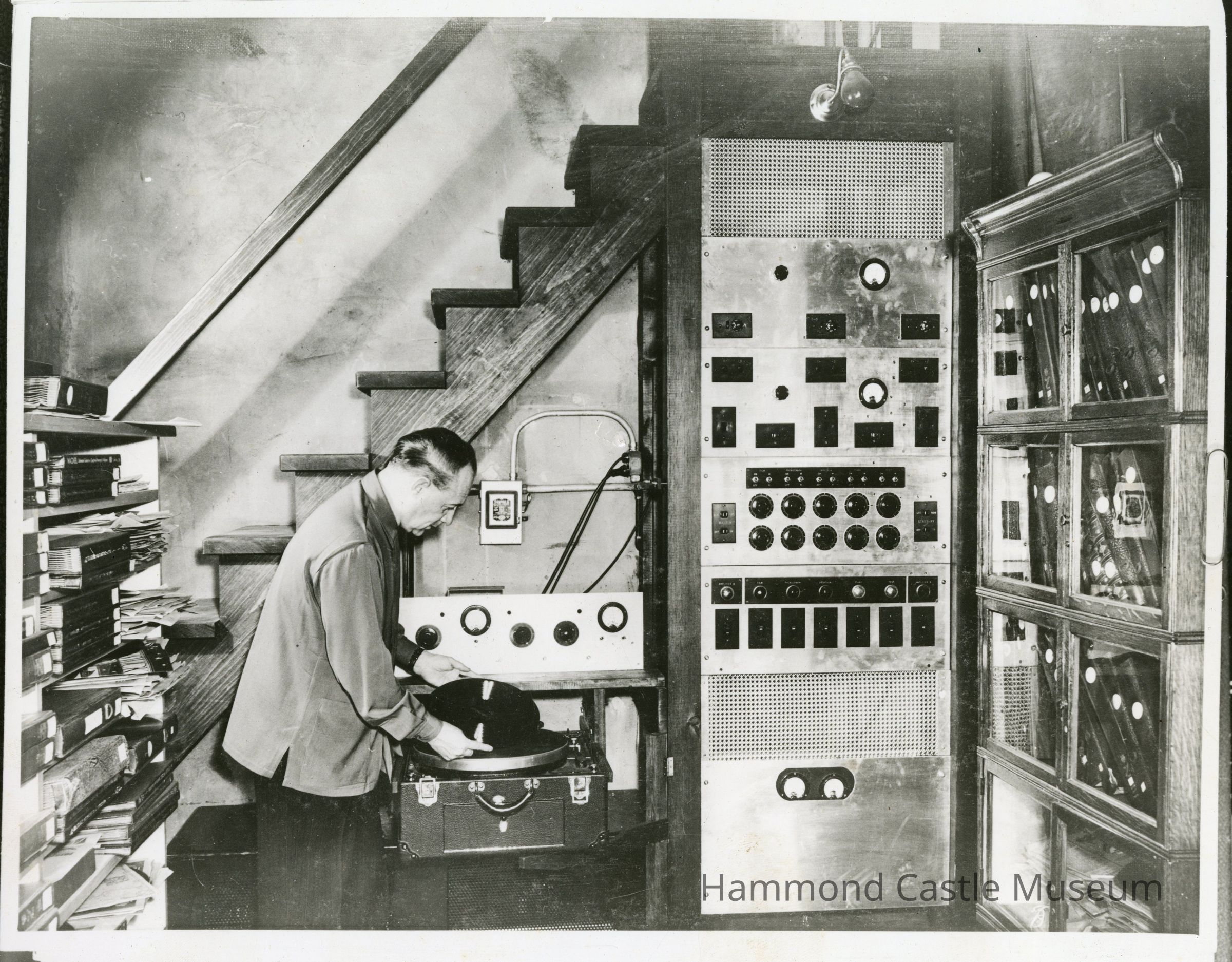 Reprint of photo of Hammond with the Dynamic Multiplier & record collection